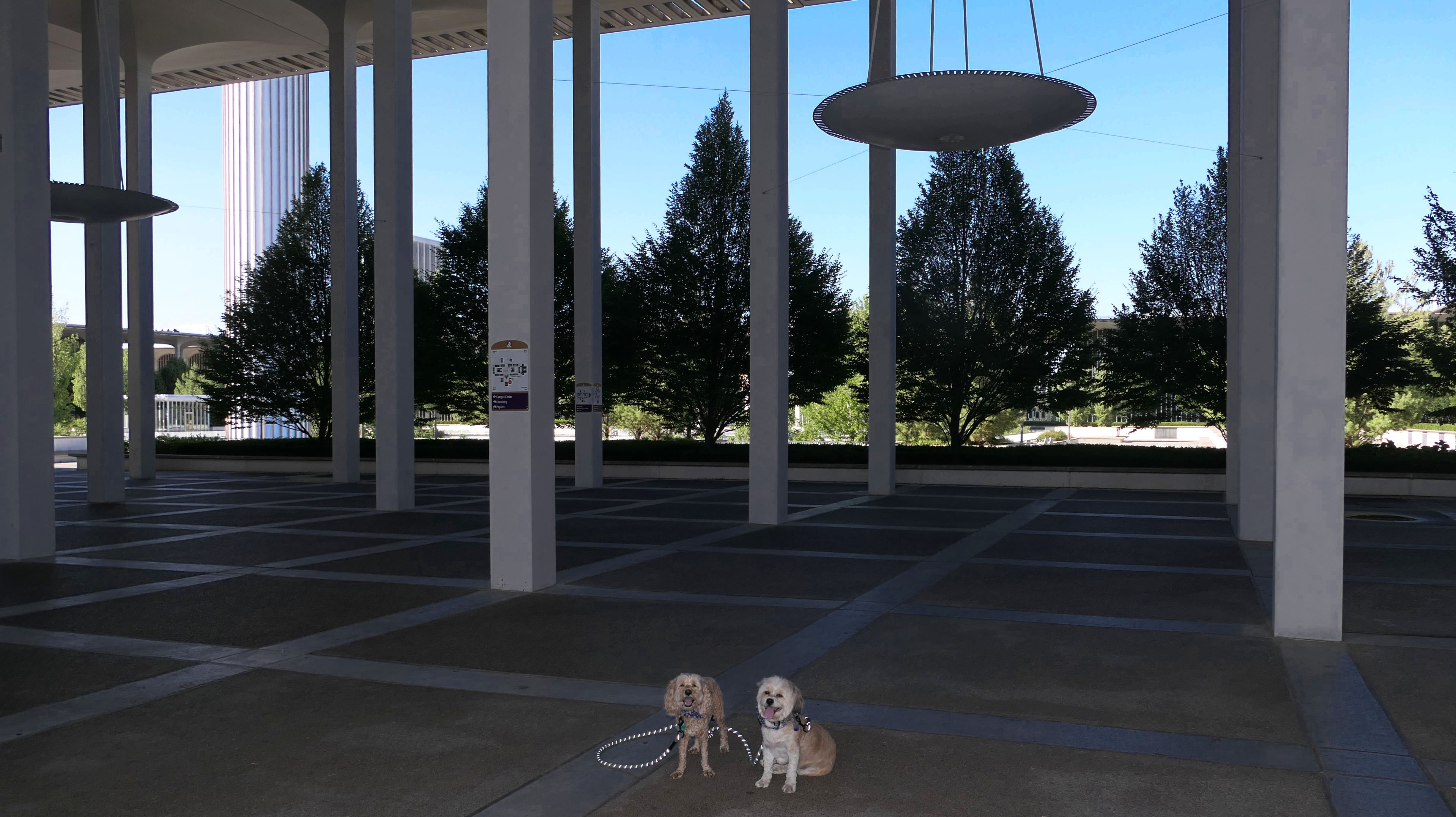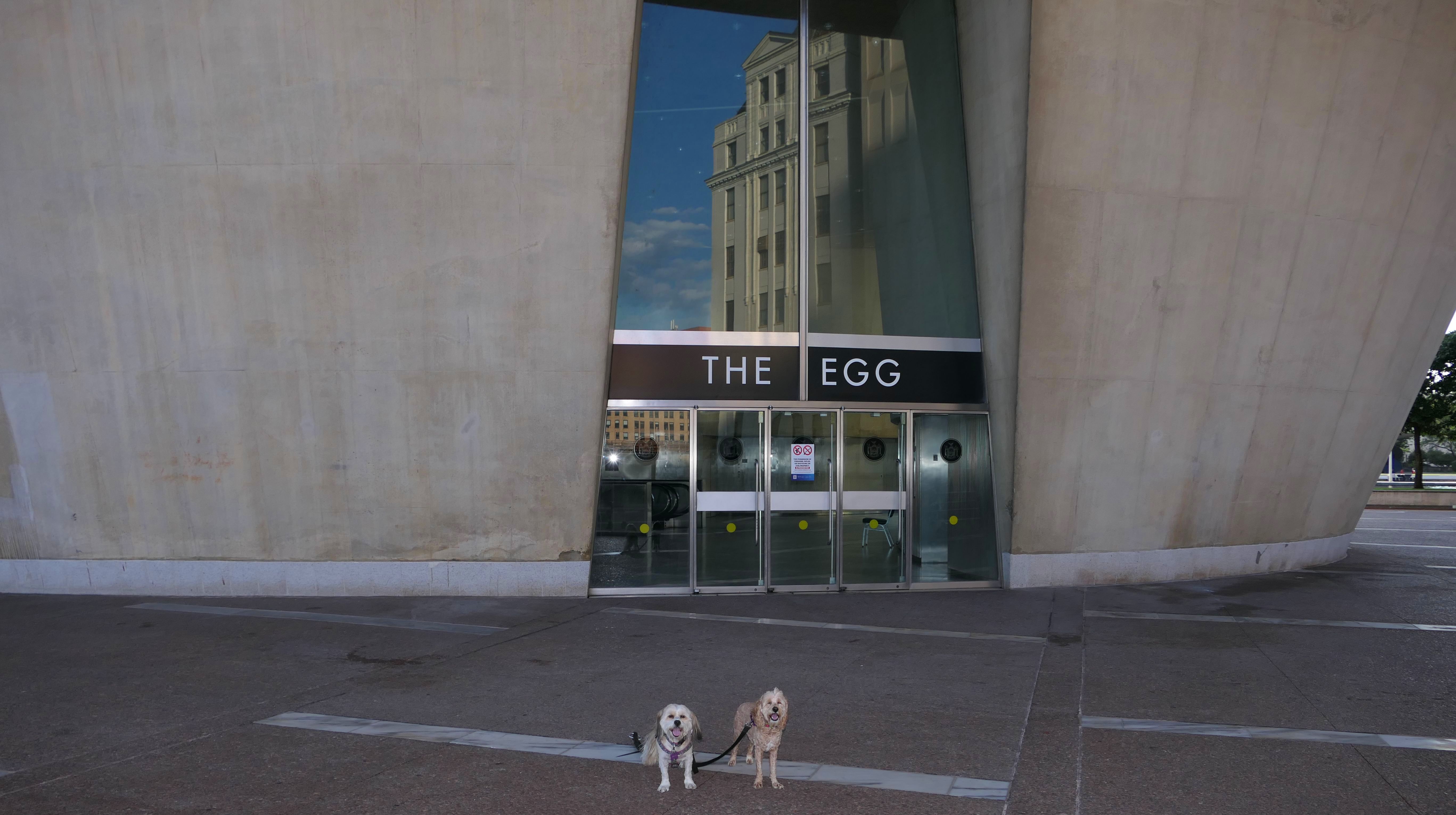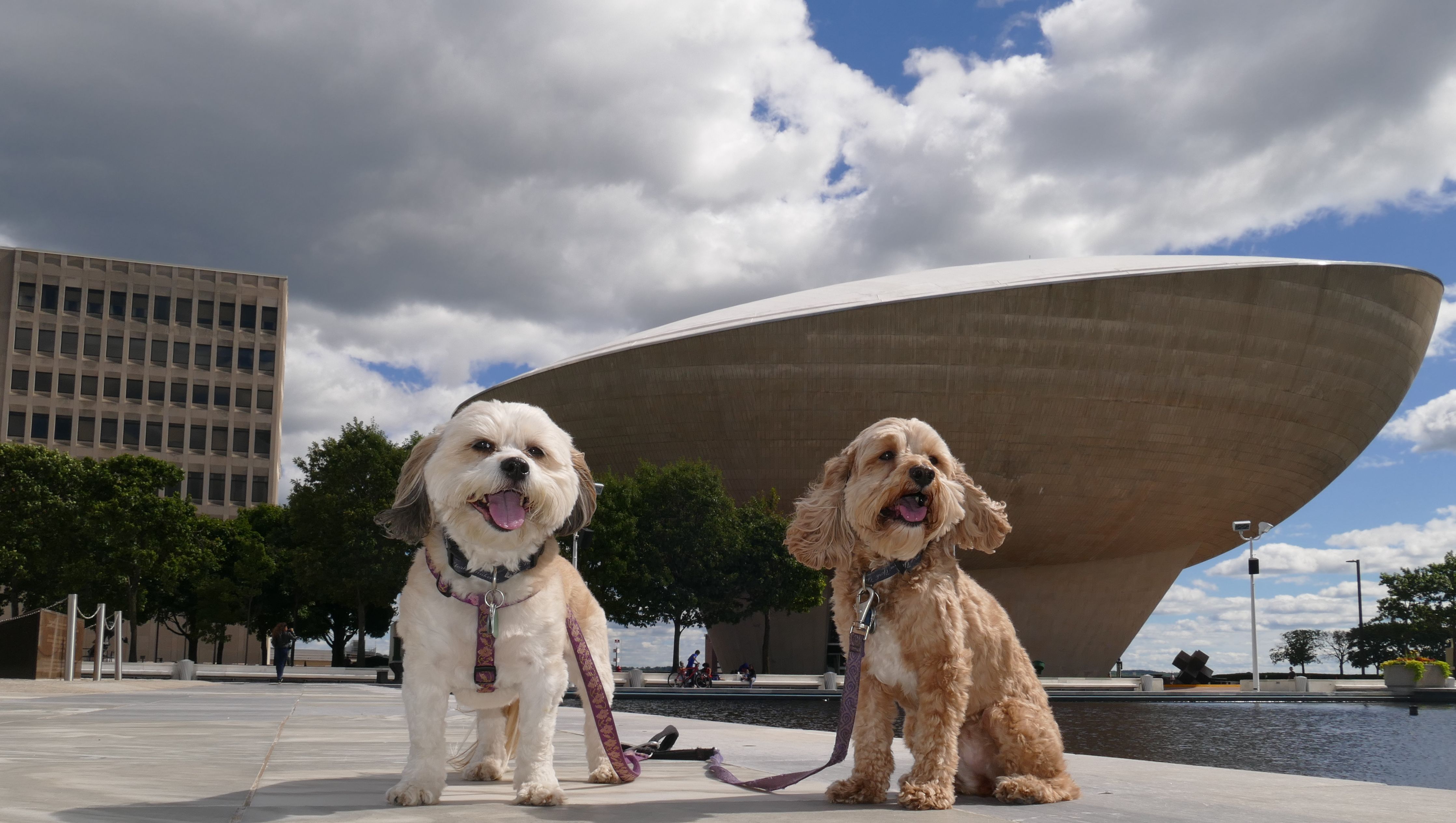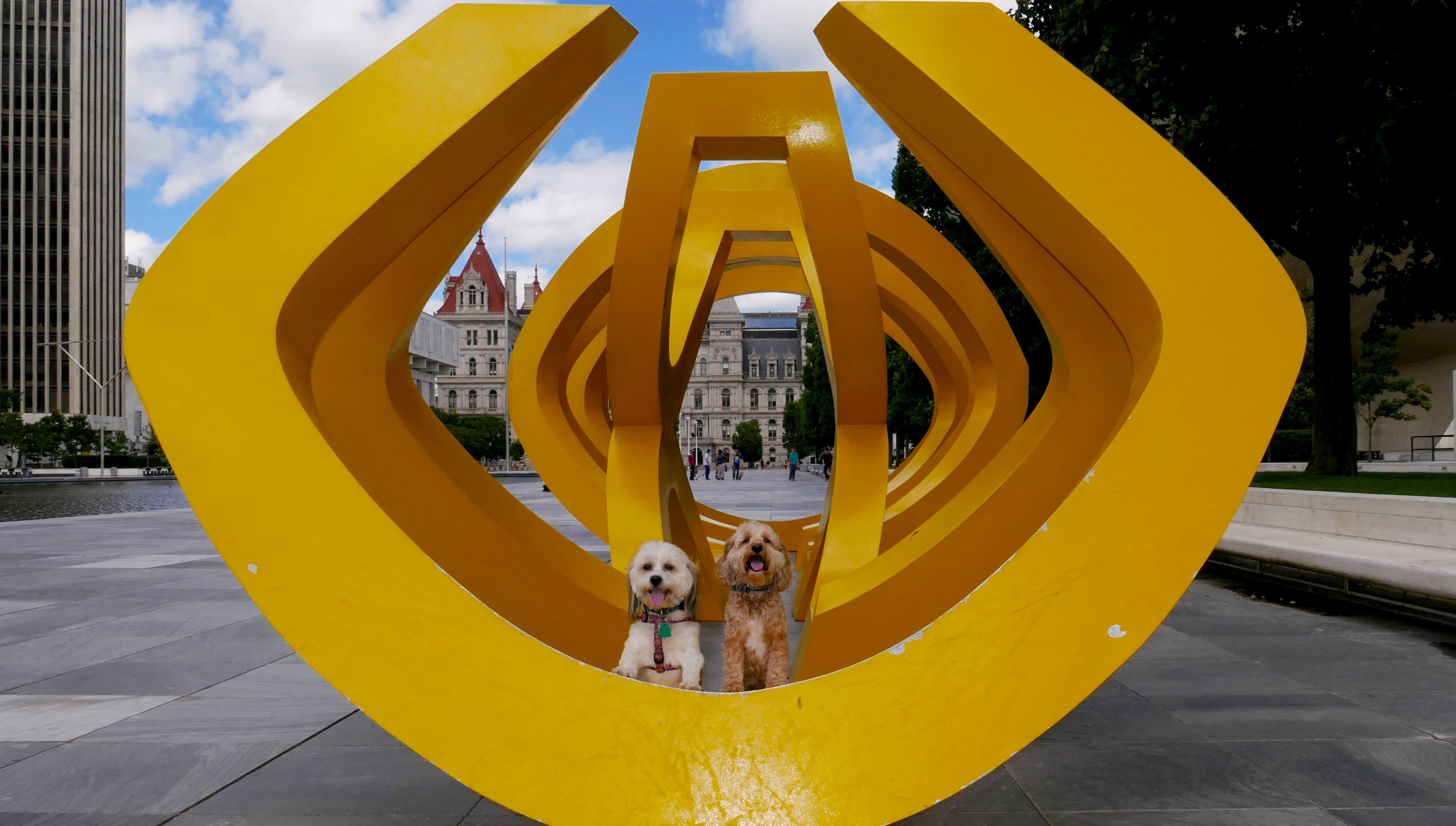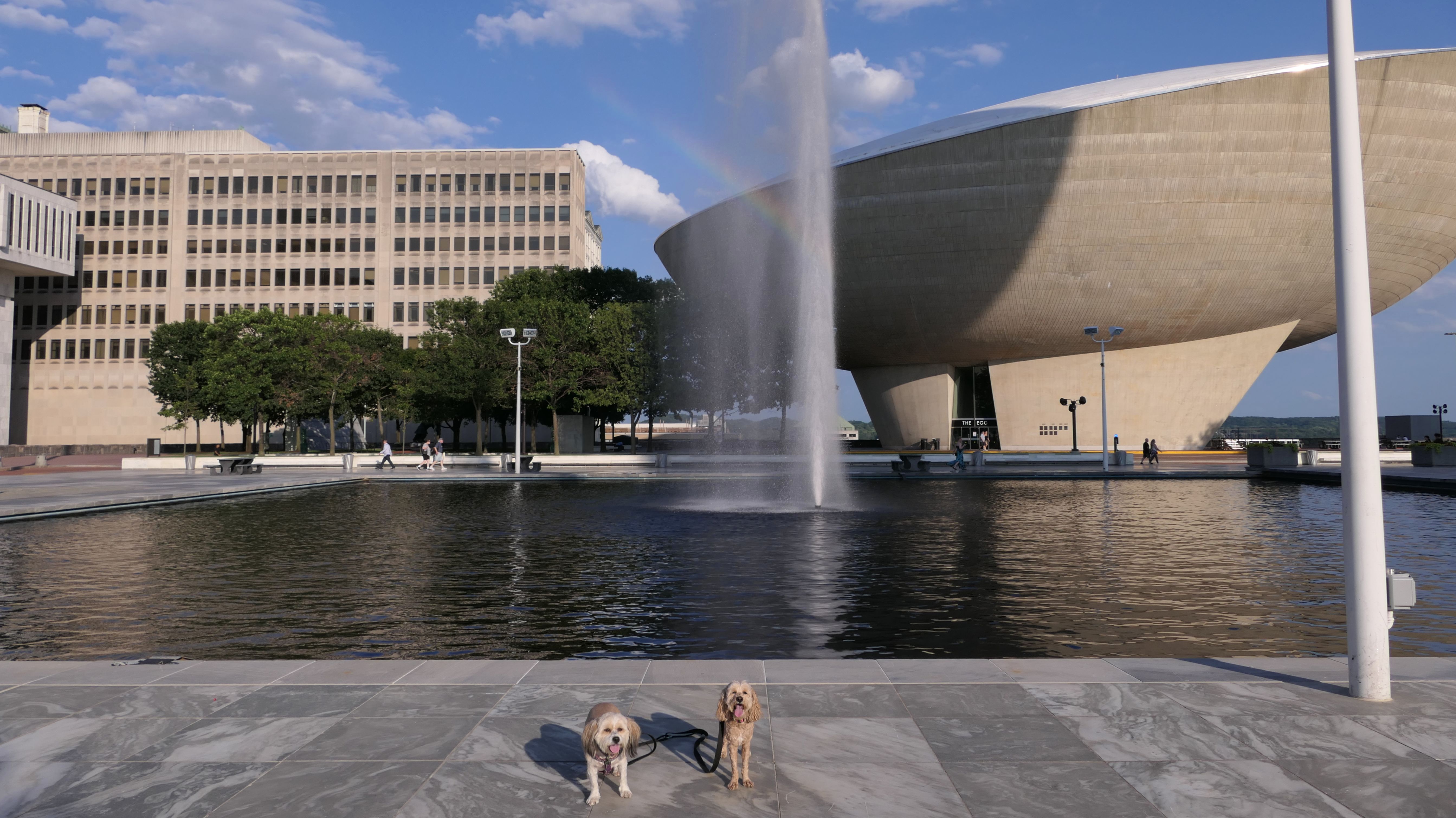 This was one of my favorite trips! I love The Egg! It is my favorite concert venue. I think I miss concerts the most during COVID. Not only is The Egg a great concert venue, Empire State Plaza is a great place. The buildings, the plaza and the sculptures all look so sleek. The dogs were super cooperative with the photos that day too. They seemed generally happy to be there.