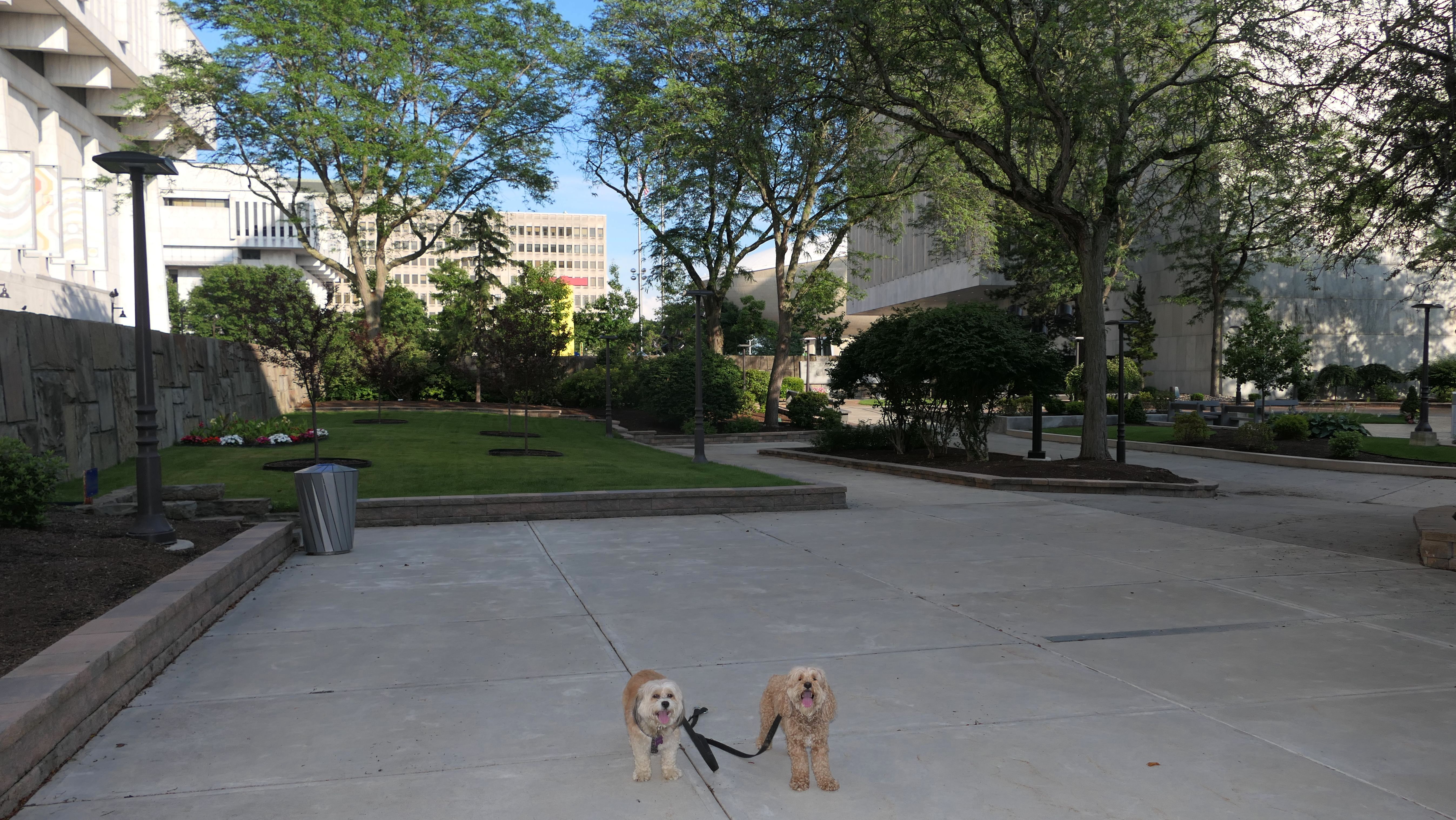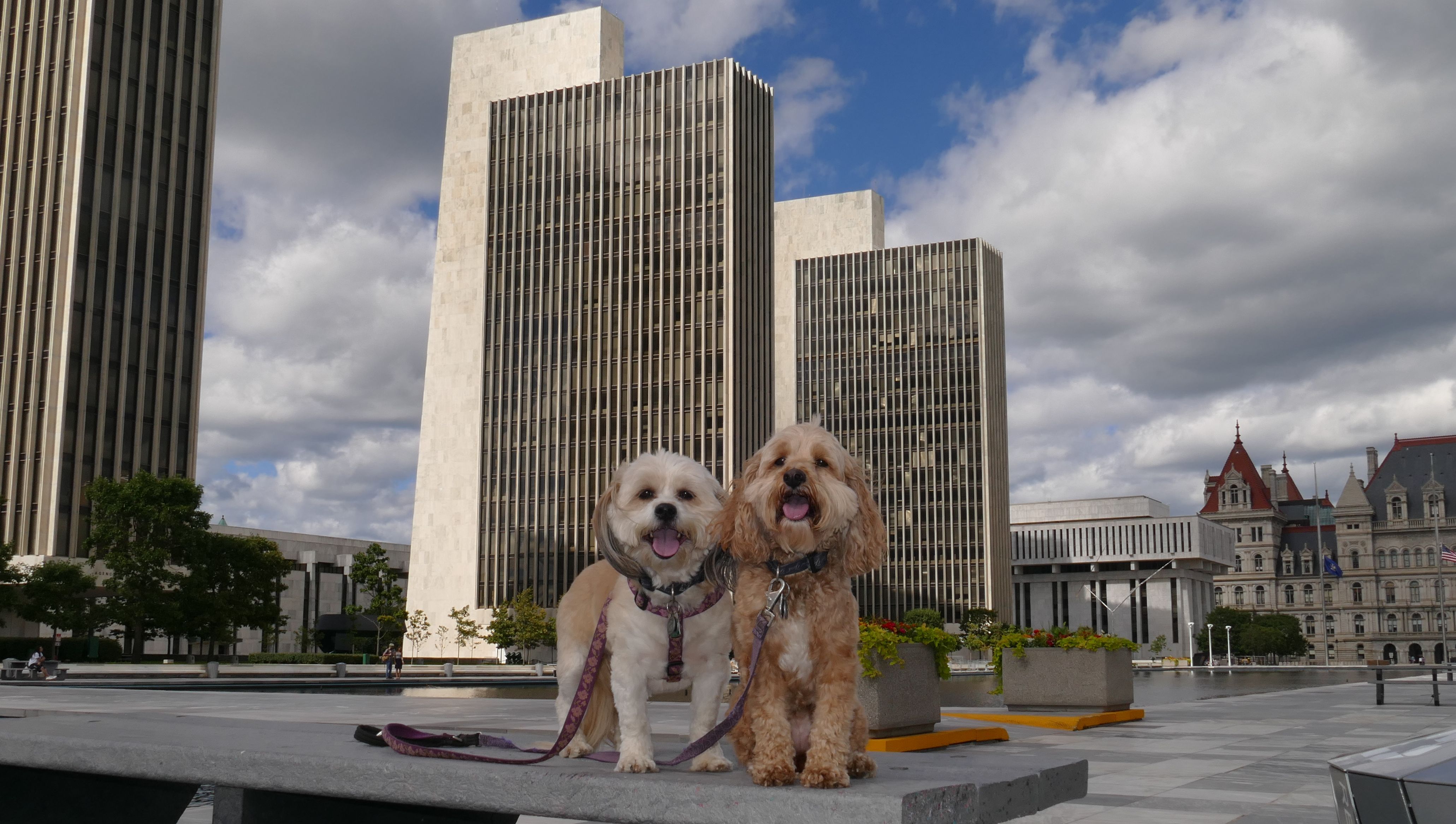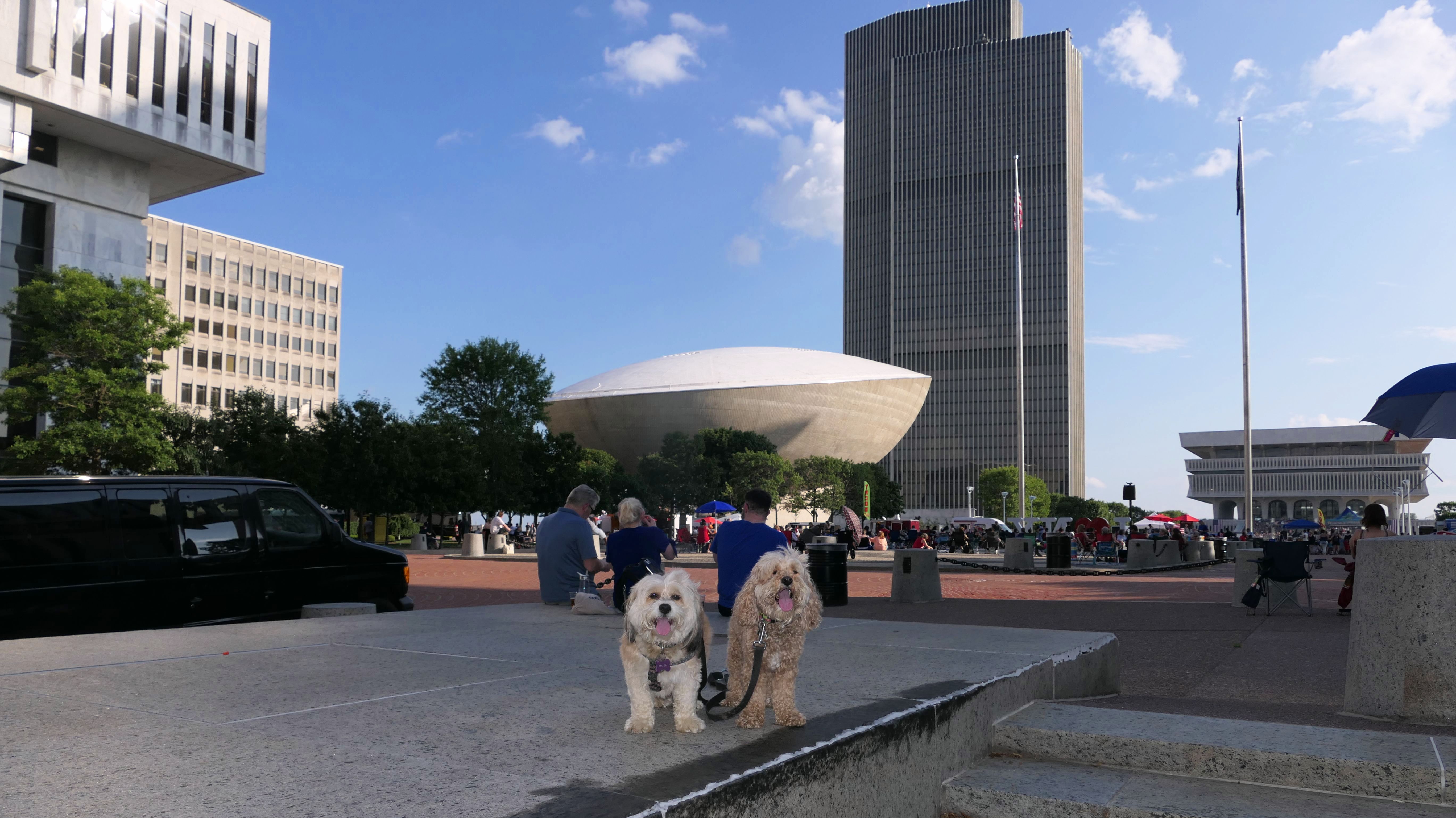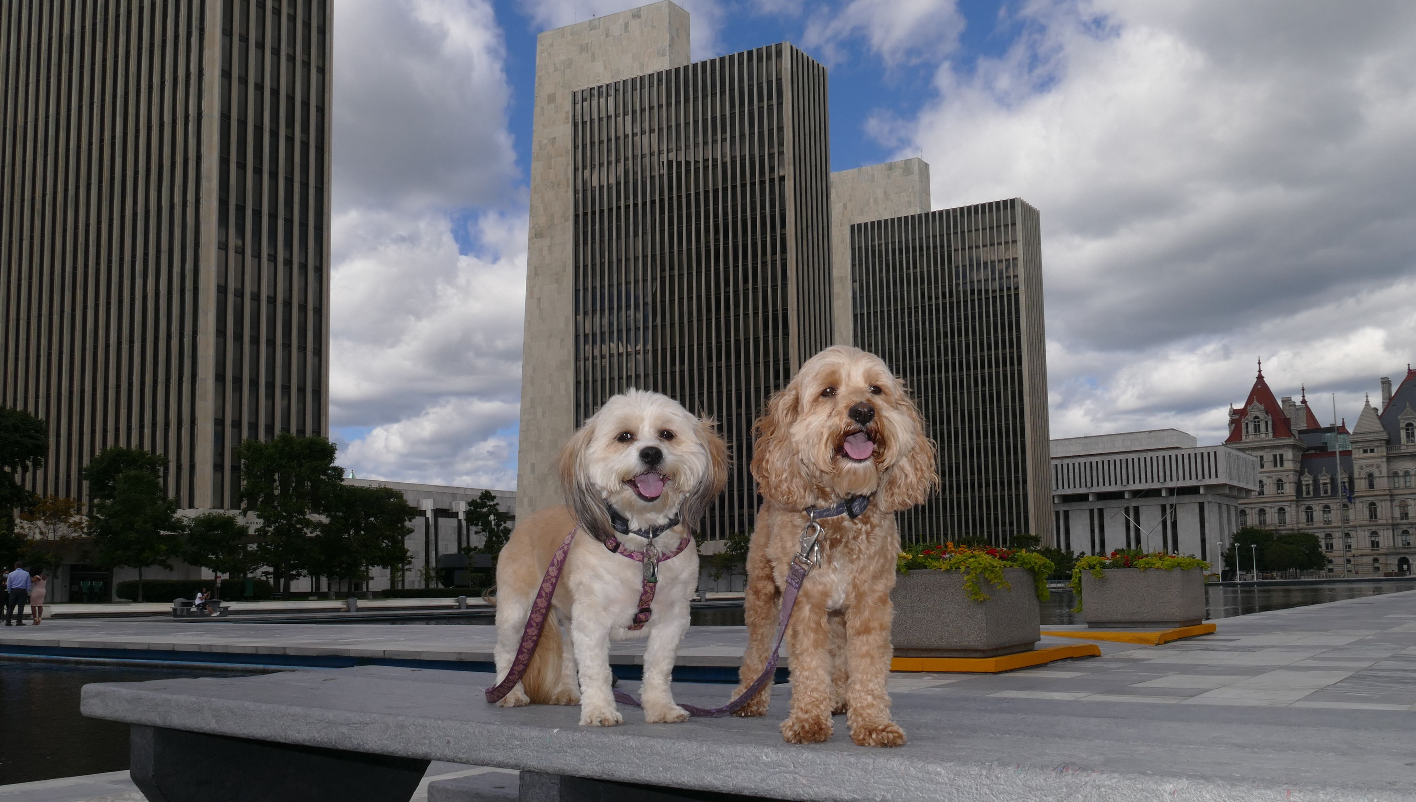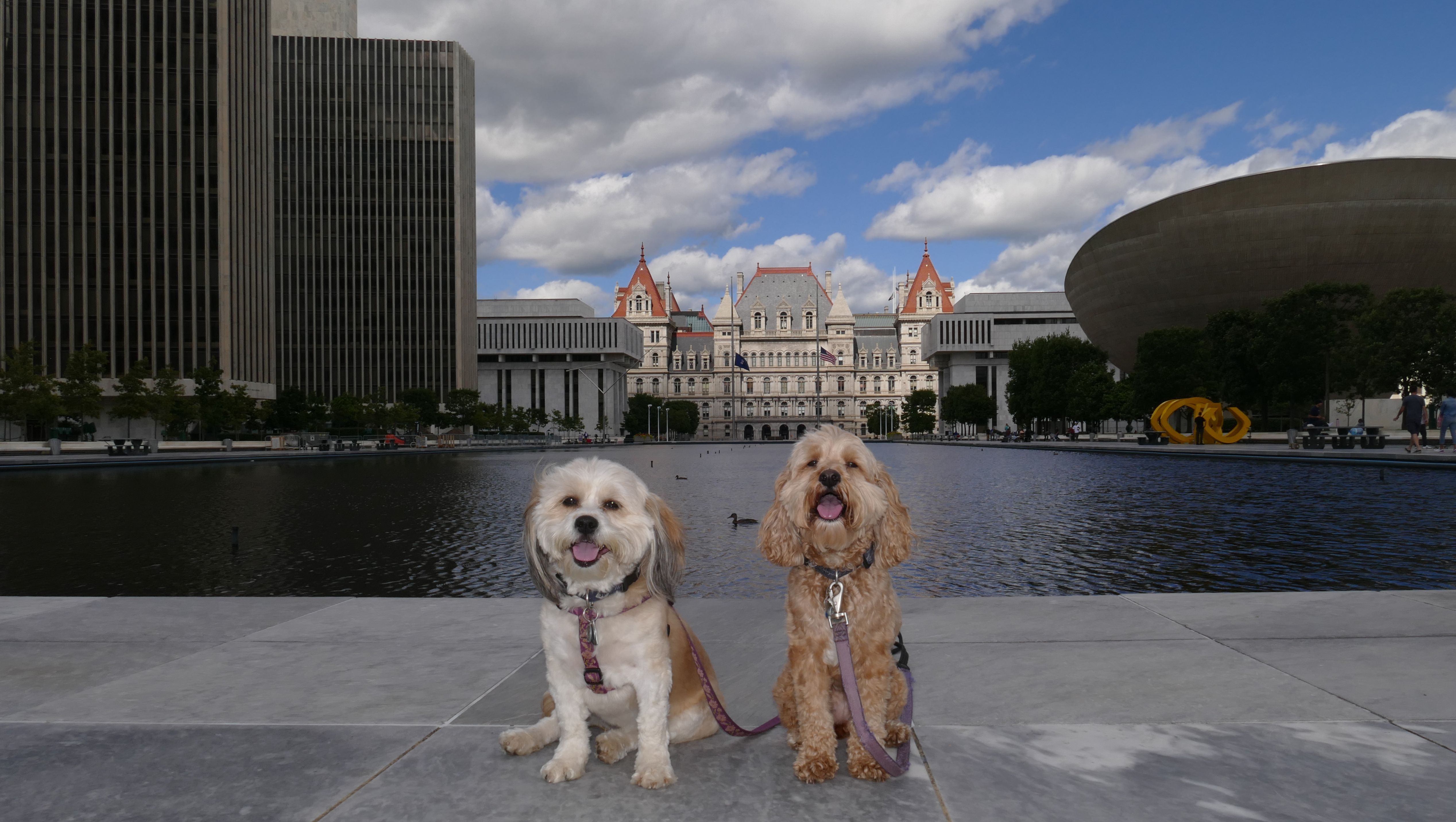 This was one of my favorite trips! I love The Egg! It is my favorite concert venue. I think I miss concerts the most during COVID. Not only is The Egg a great concert venue, Empire State Plaza is a great place. The buildings, the plaza and the sculptures all look so sleek. The dogs were super cooperative with the photos that day too. They seemed generally happy to be there.