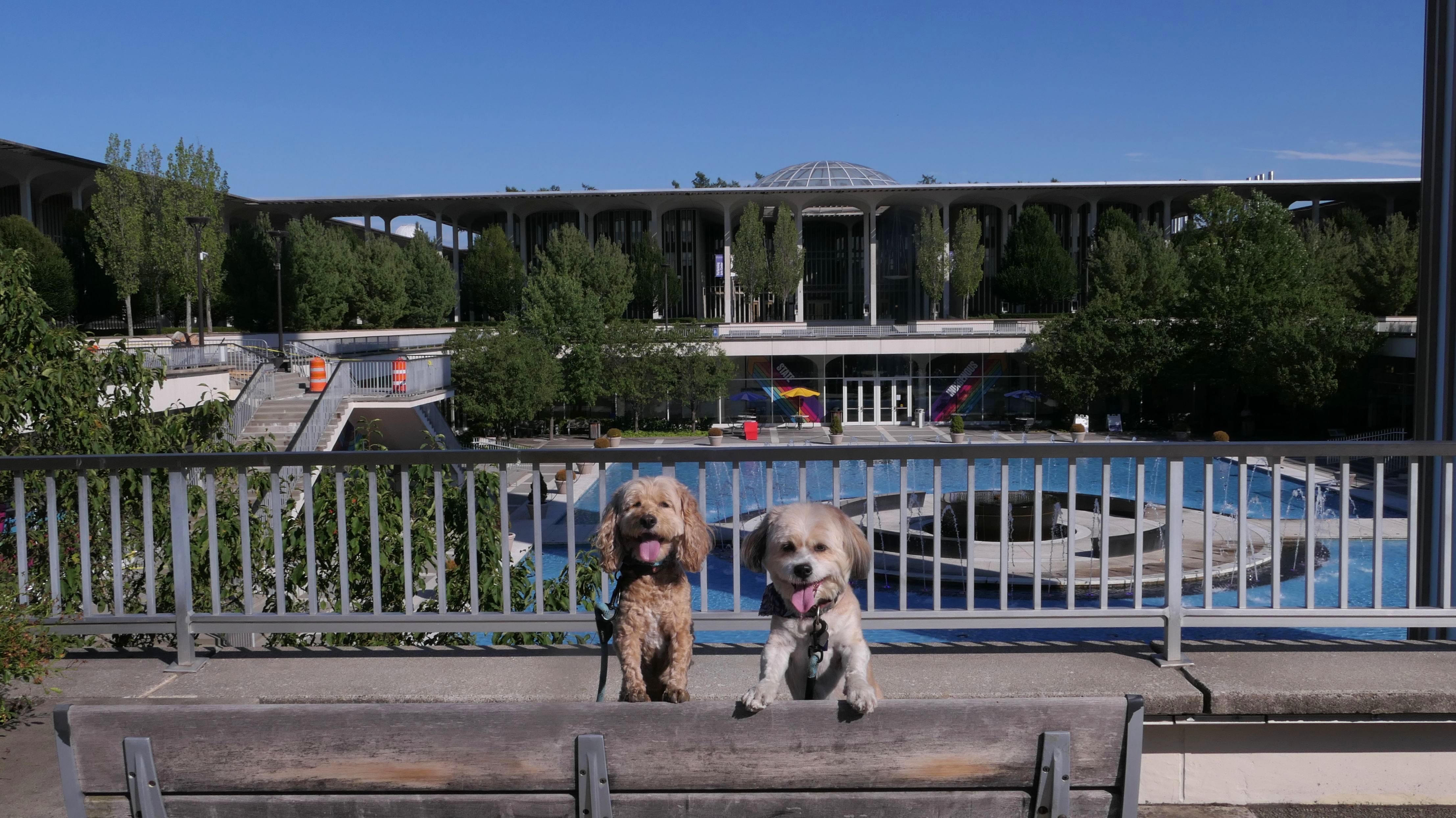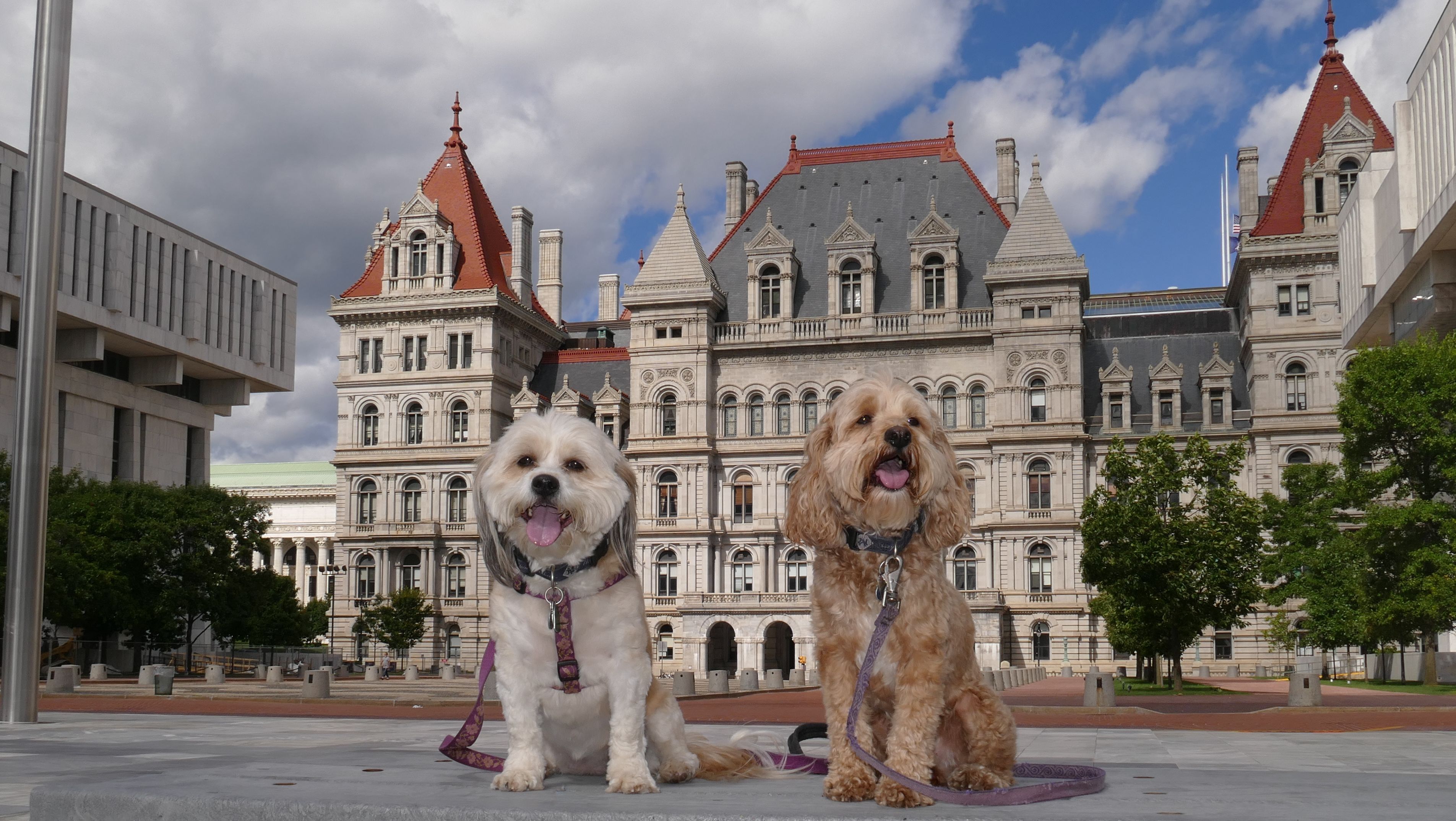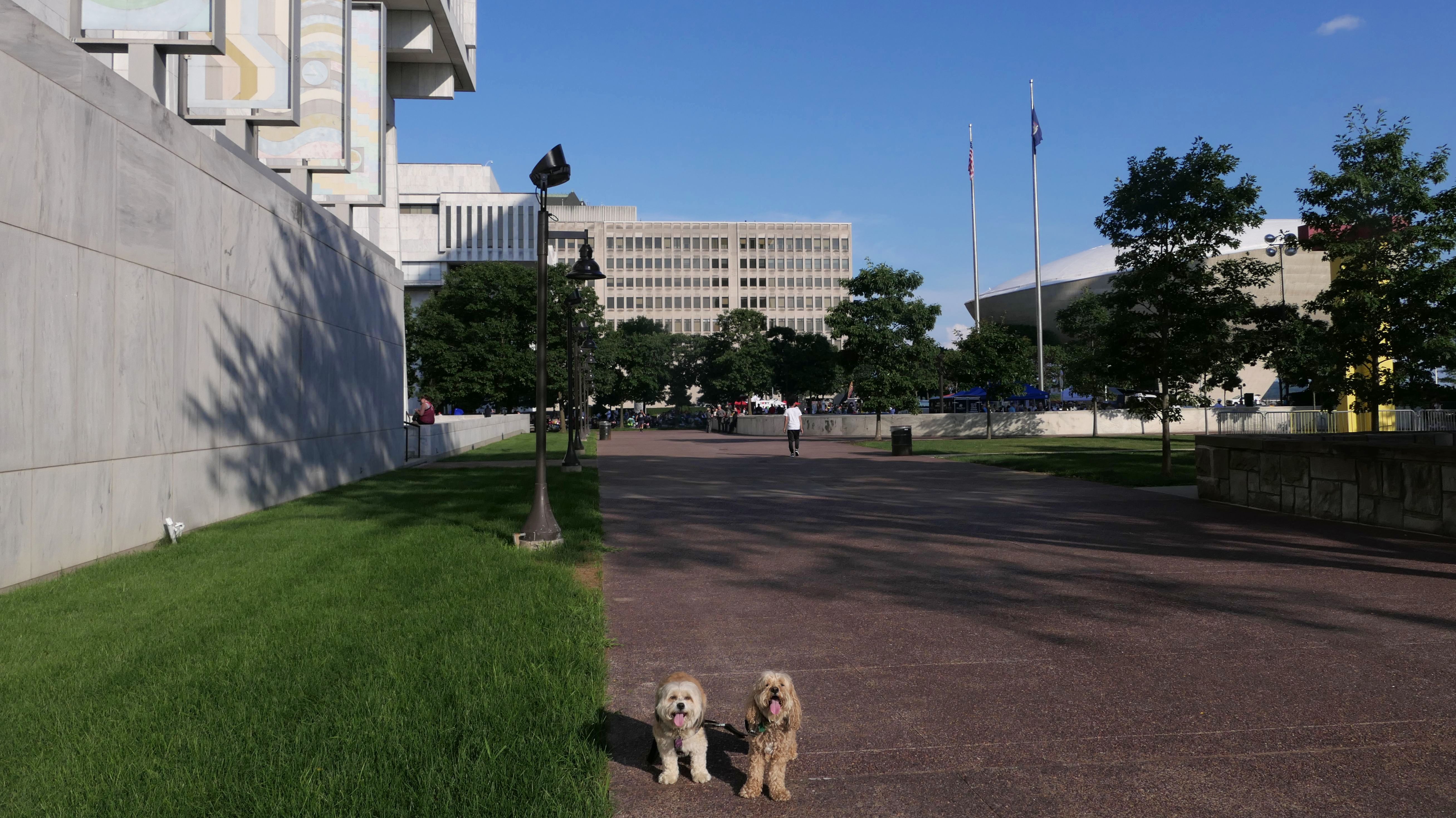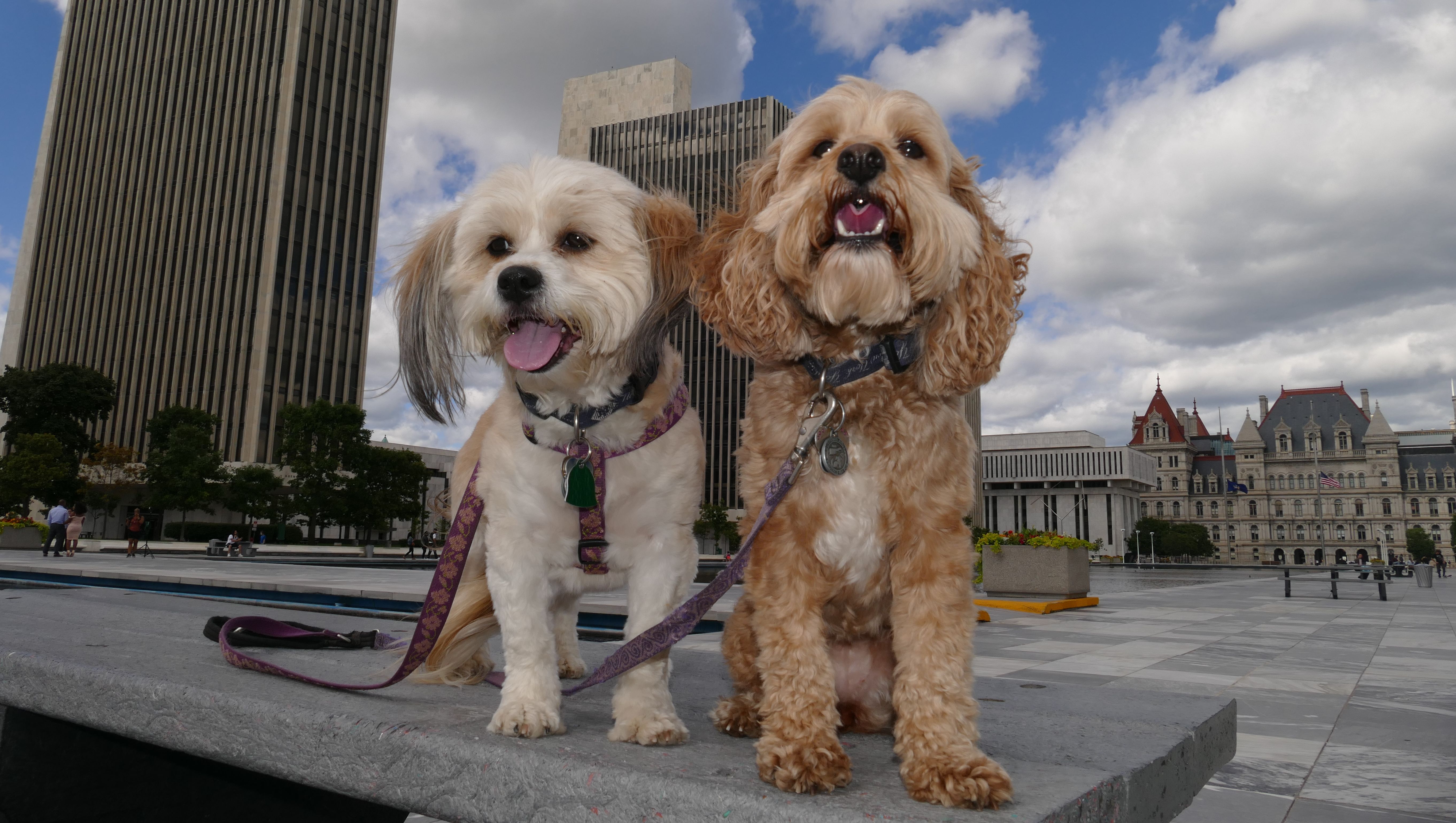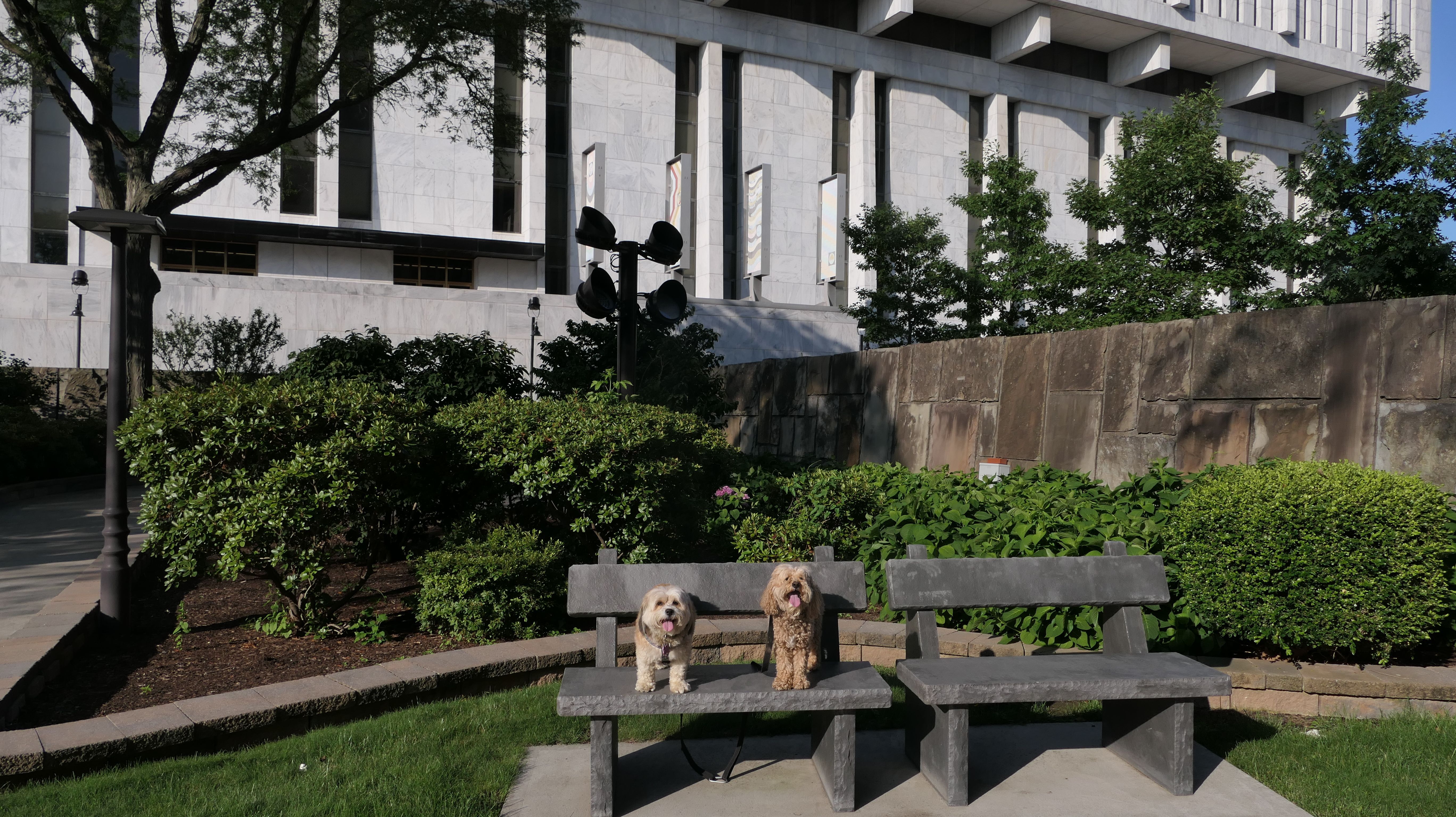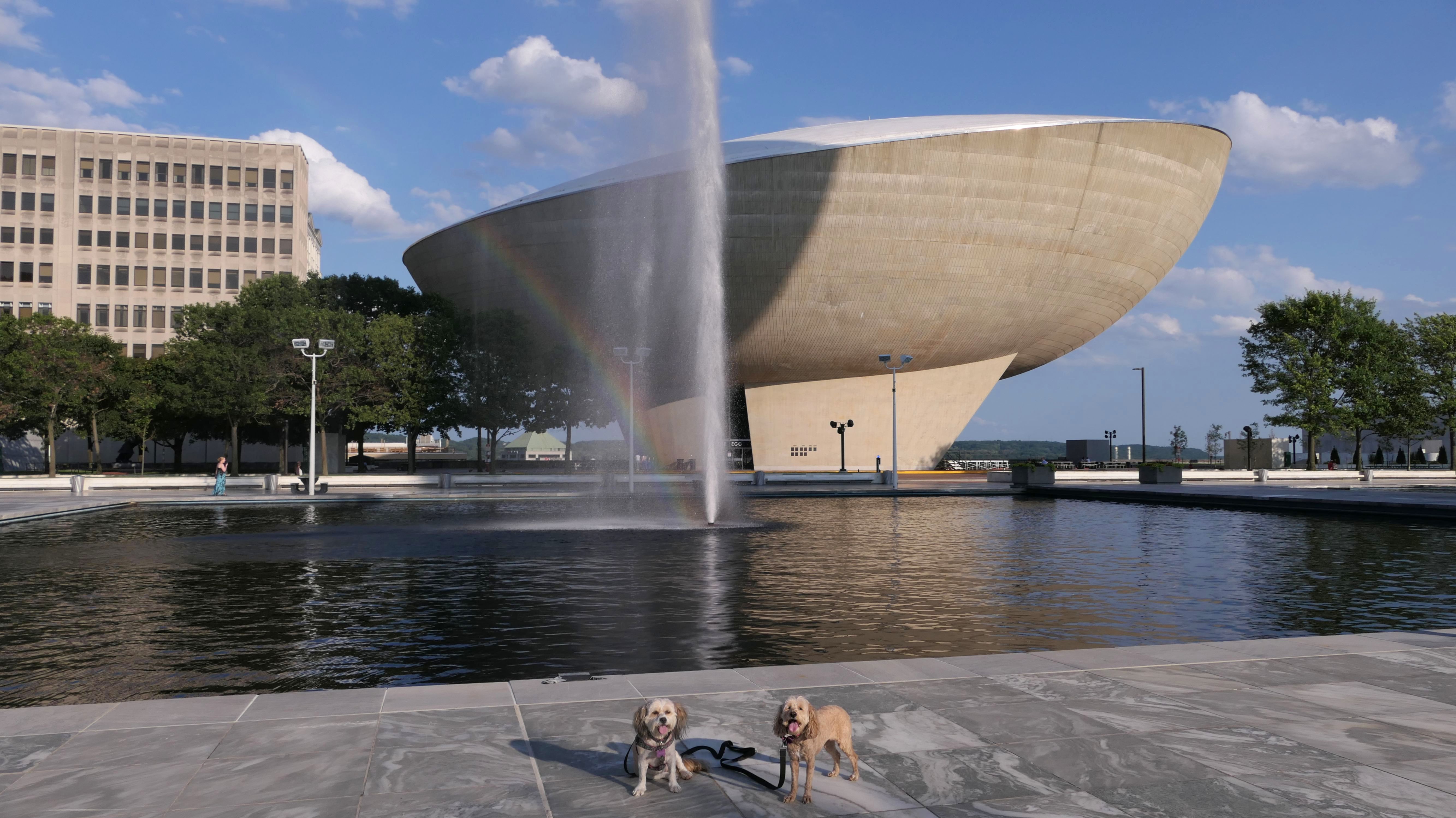 This was one of my favorite trips! I love The Egg! It is my favorite concert venue. I think I miss concerts the most during COVID. Not only is The Egg a great concert venue, Empire State Plaza is a great place. The buildings, the plaza and the sculptures all look so sleek. The dogs were super cooperative with the photos that day too. They seemed generally happy to be there.