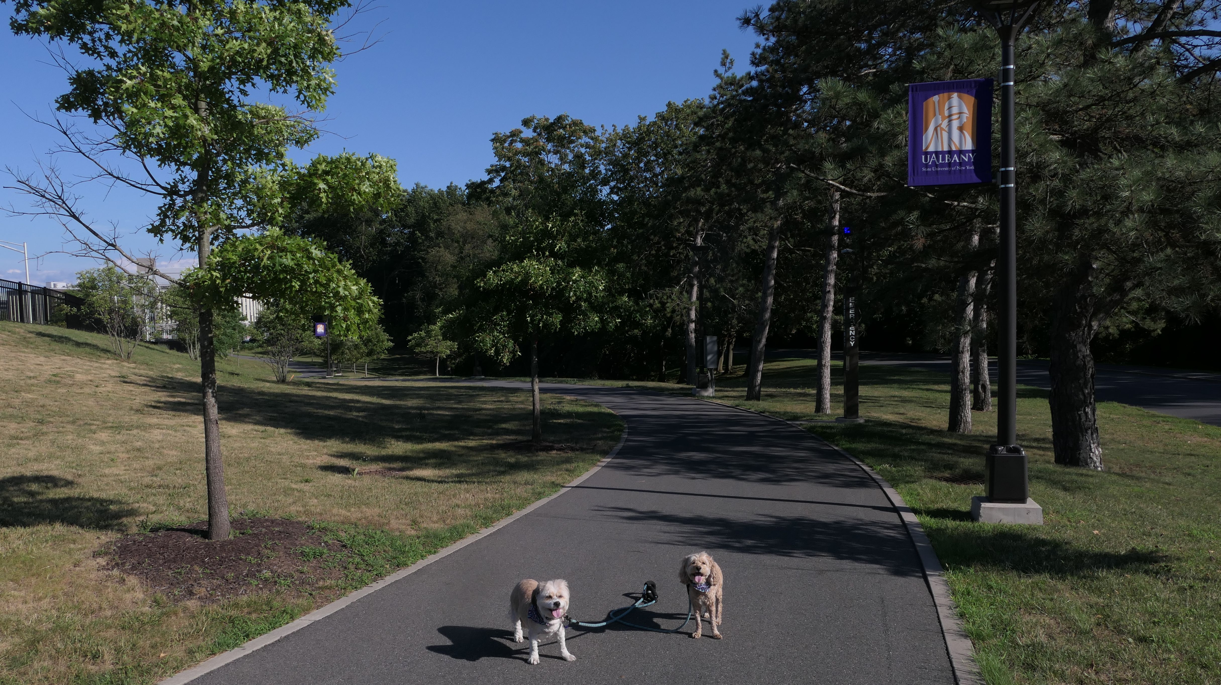 Mandy and Lexi's collegiate tour continues at the "University at Albany - State University of New York". We covered a good portion of the campus on our 3.5 mile walk, including the section with most of the athletic fields that is actually in the town of Guilderland. The architecture of the buildings reminded me of the nearby Empire State Plaza. It has that "this is what they thought was modern in the 1960's" look to it. The campus loves their fountains! The highlight of the walk was the three different fountains. Pets are not allowed in the large fountain area in the middle of the Campus Center, so we took the a photo from up above it. Our walk also included the short stone dust "Parker Pond Path", a loop trail around the pond. The campus made for a nice walk on a beautiful August evening.