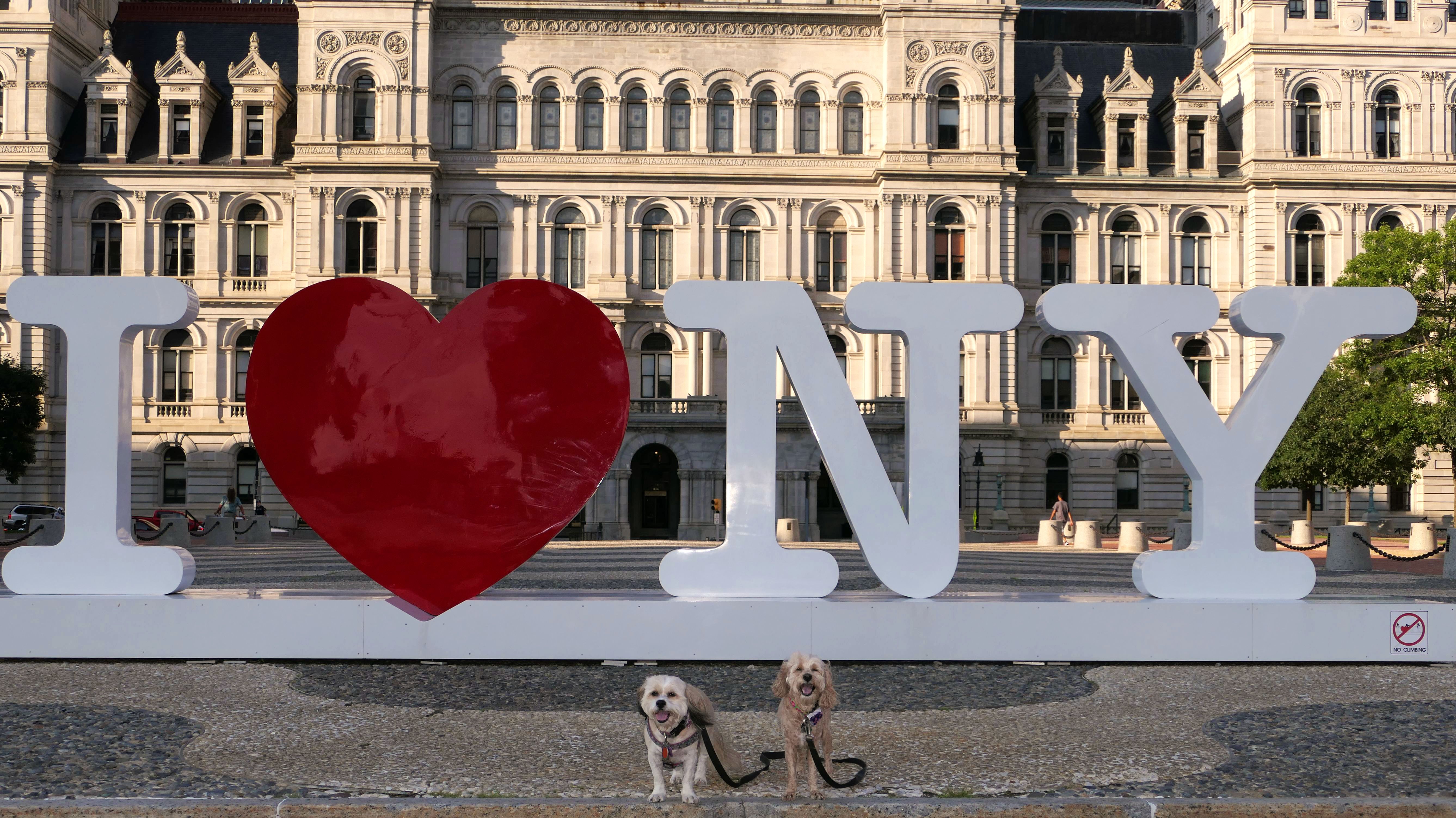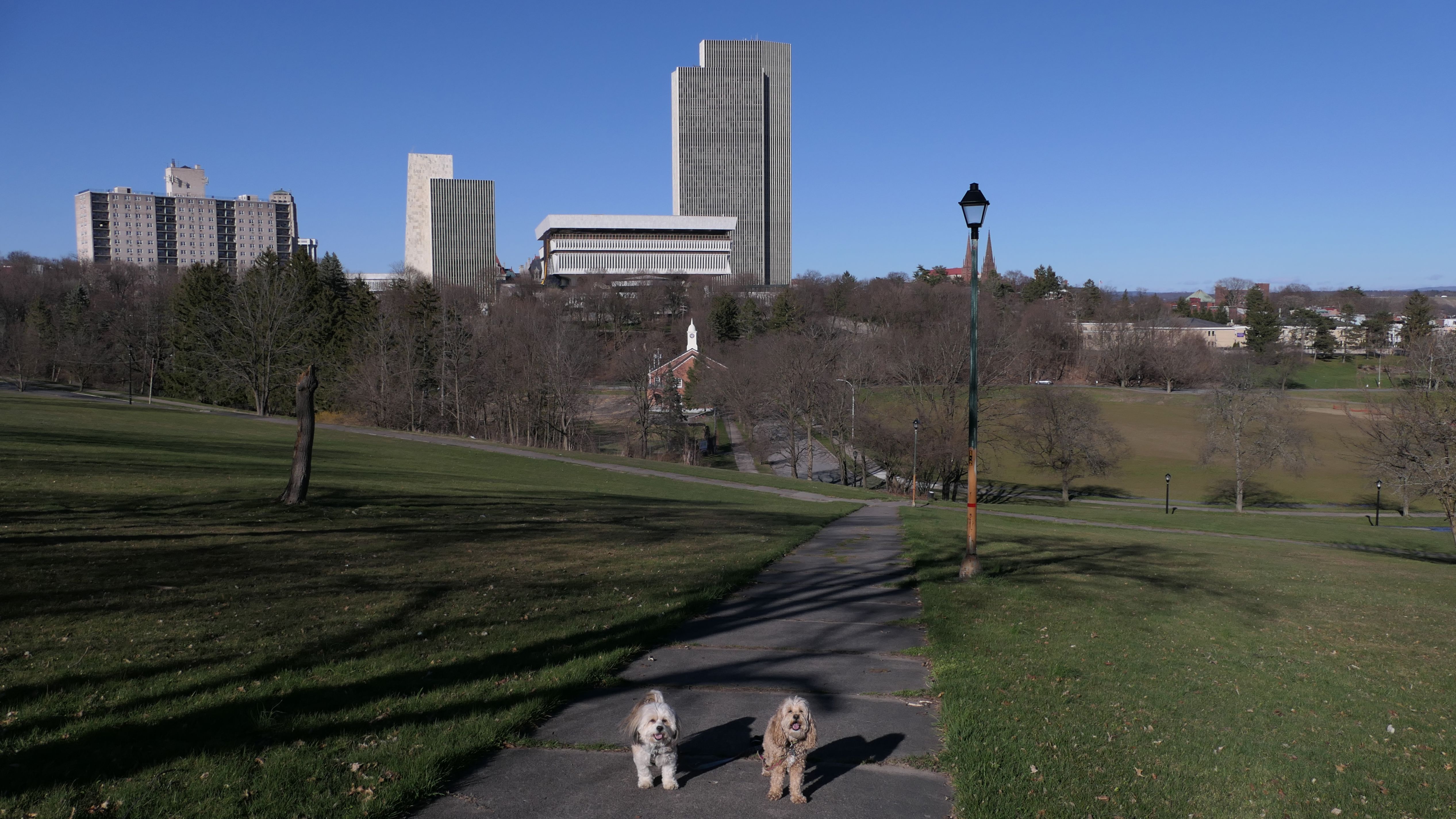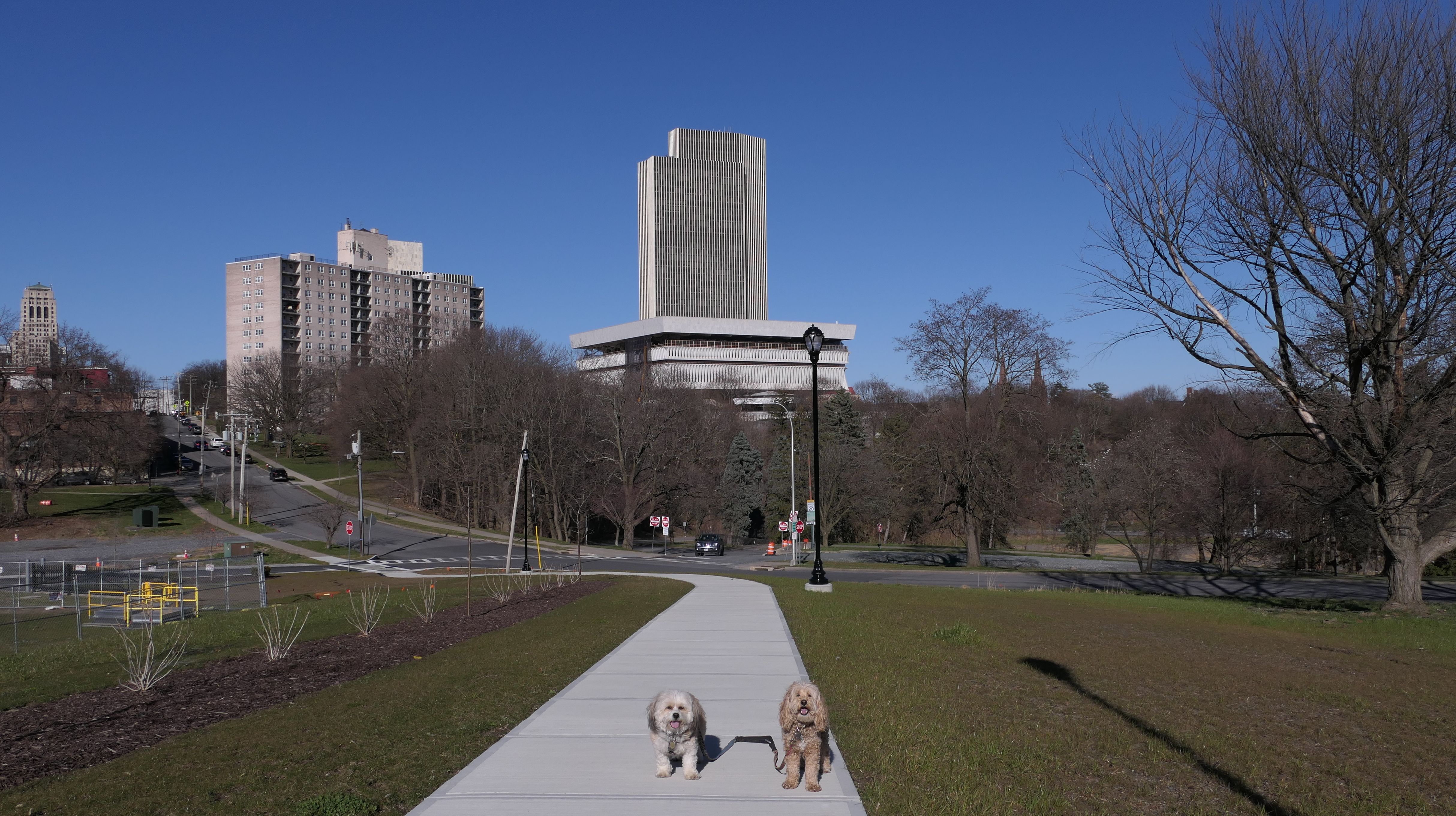 We were back just two weeks later. We walked up the hill on State Street from Corning Waterfront. Again, there was an event happening on the plaza. According to the Empire State Plaza website, it was a concert from the band Night Ranger, but there wasn't any band playing when we were there. The show was limited to the northwest side of the plaza, so we stayed on the other end. The main reason I returned was that I really wanted to take a picture of the dogs in front of the "I Love New York" sign. The sign wasn't there when we visited in 2020. This was also the first time we visited where the fountains were working. I love the first picture below where the sunlight is hitting the founatain just right, and it created a rainbow effect. Other than the pictures in front of The Egg, I tried to take photos from sections of the plaza that I did not take photos from during our first two visits.