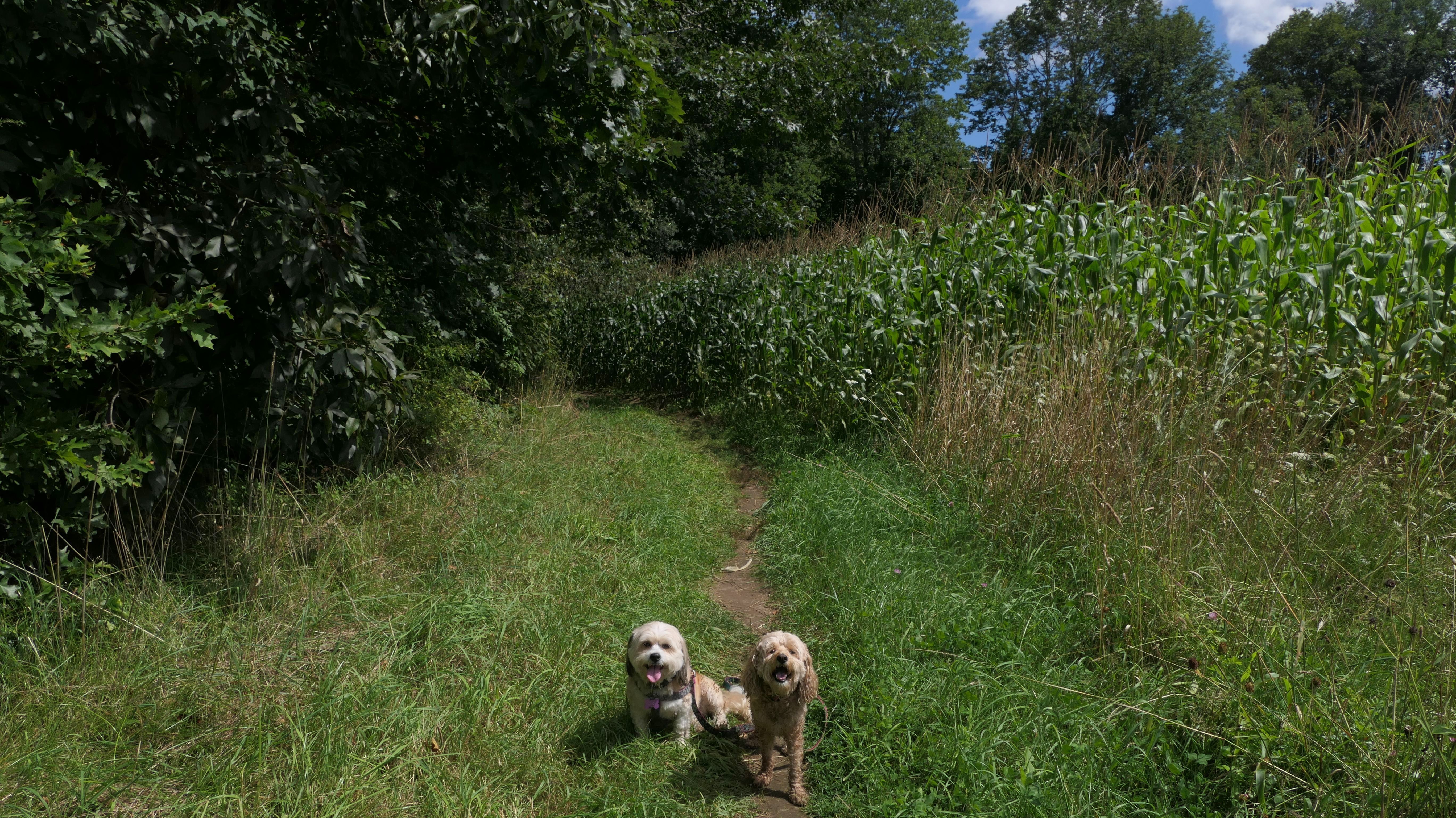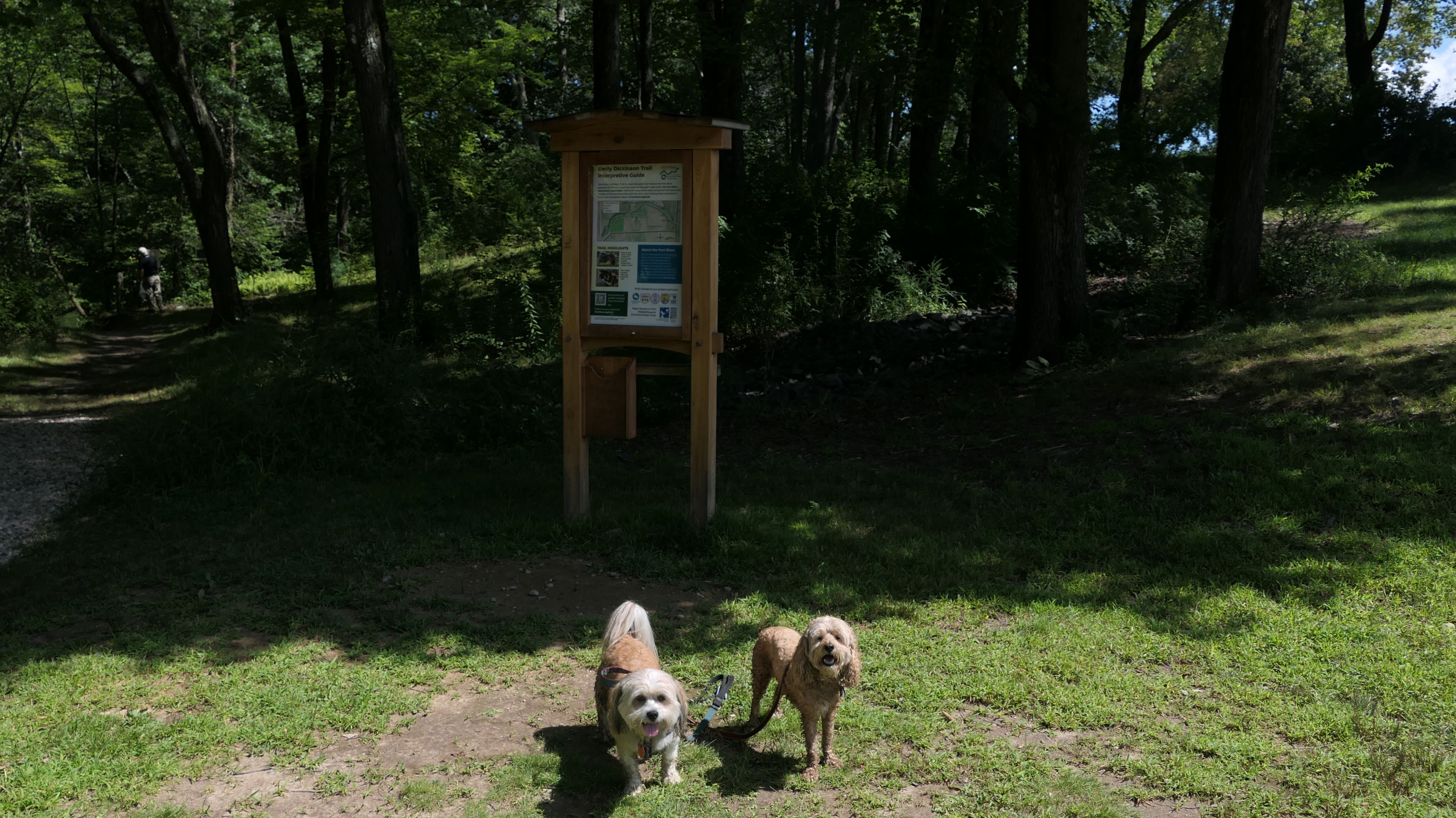 This is a better than average trail through the woods. We started at the trail head near the parking area for the Norwottuck Rail Trail on Mill Lane. We walked the length of the trail, about one mile to the other end at Groff Park. The trail runs along side the Fort River the entire way. In the process, it goes through the woods, and a meadow, and even the edge of a corn field. There is a guided tour with signs and q-codes that you can scan on your phone that provide additional information. Once we reached the park, we walked around for a bit there, before heading back the way we came.