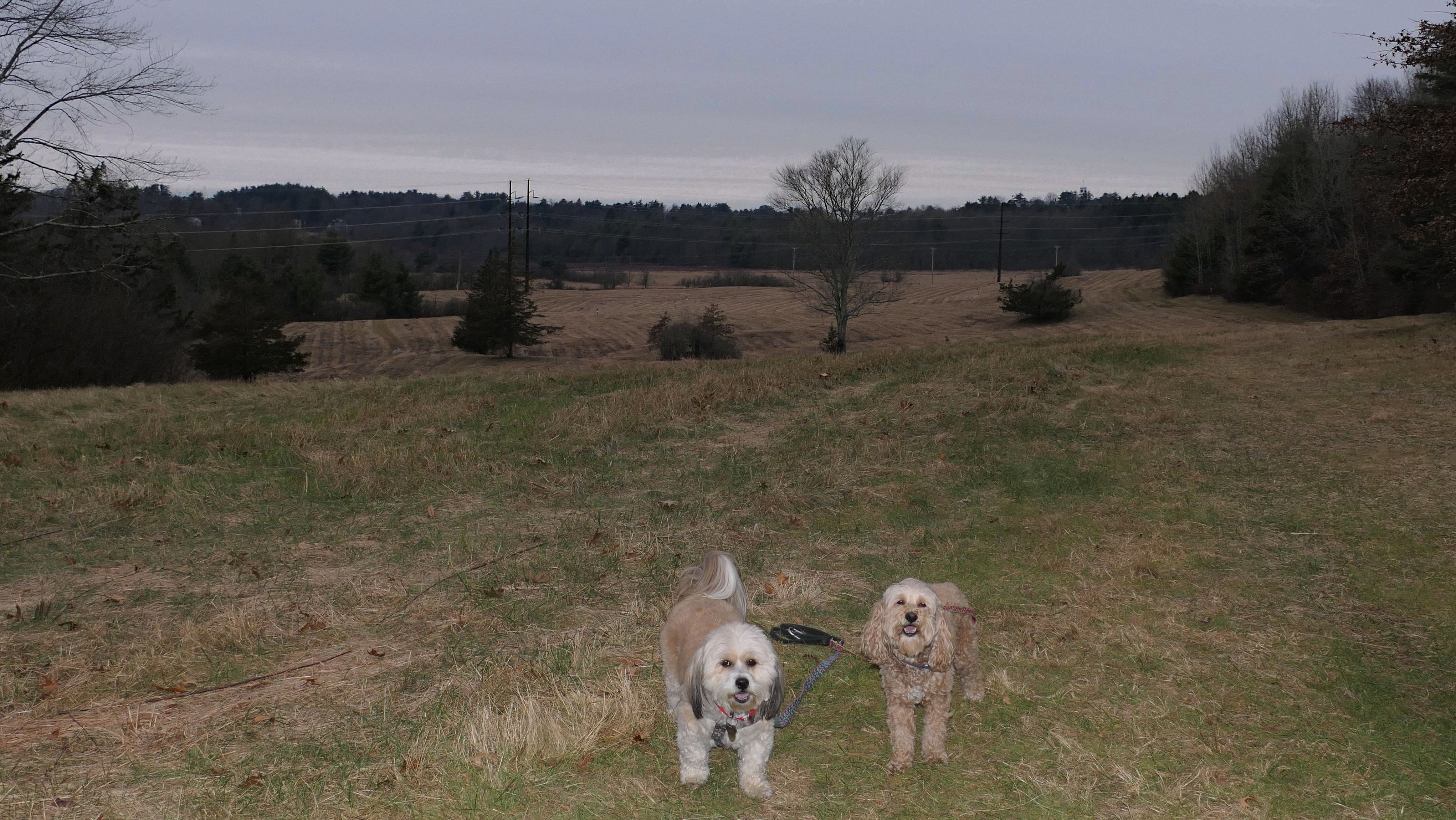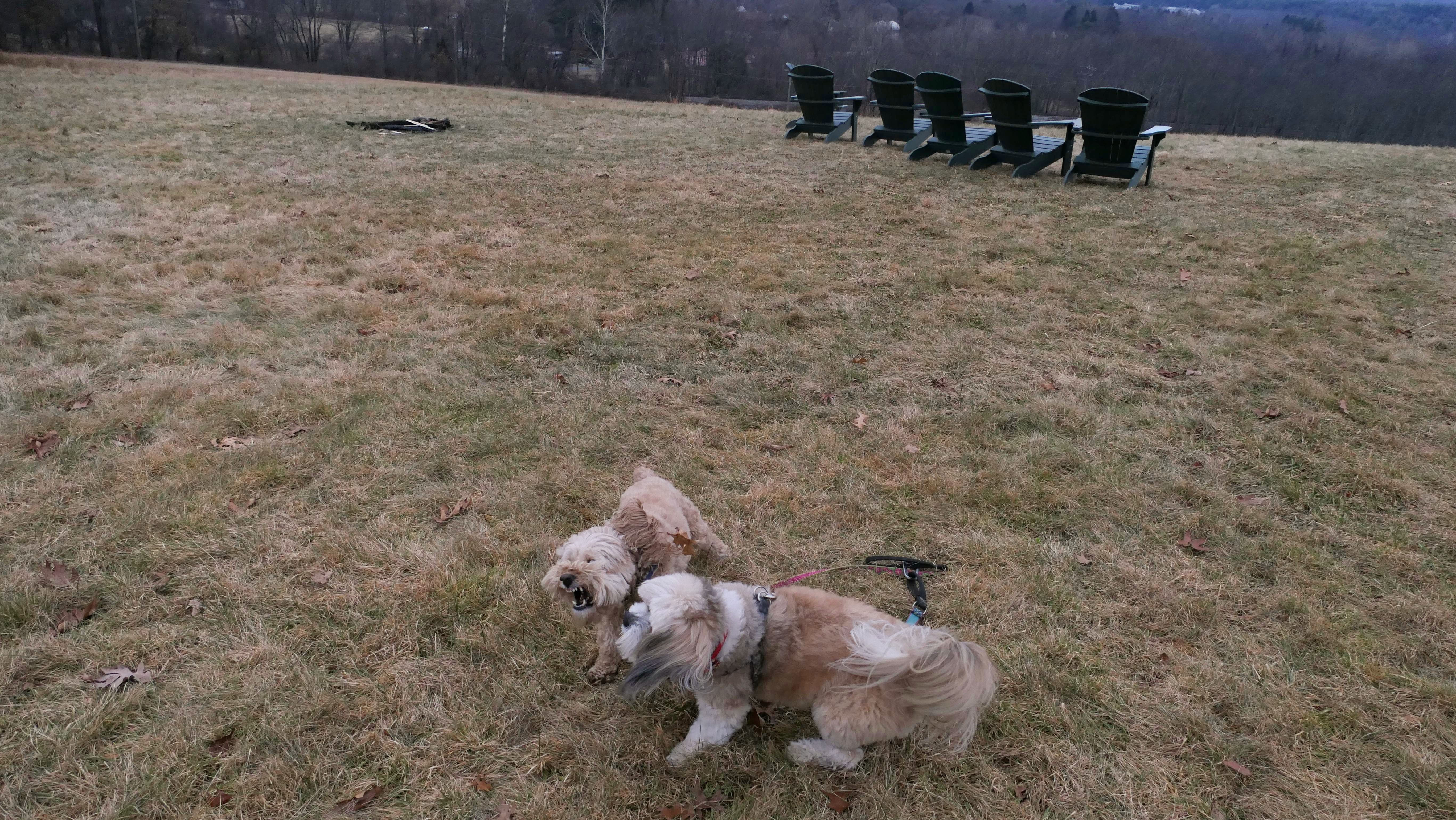 These are a series of trails on Amherst College Property that are open to the public. We connected from the Norwottuck Rail Trail. We briefly visited what my GPS enabled map called the Amherst College Cross Country Trail, and then the trail that leads out to Tuttle Hill on the other side of the rail trail. The trail that goes out to Tuttle Hill features a nice view, but it's probably much nicer any other time of the year than on a gray, damp, and dreary winter day. Mandy and Lexi saw the open field, and decided to have a brief wrestling match.