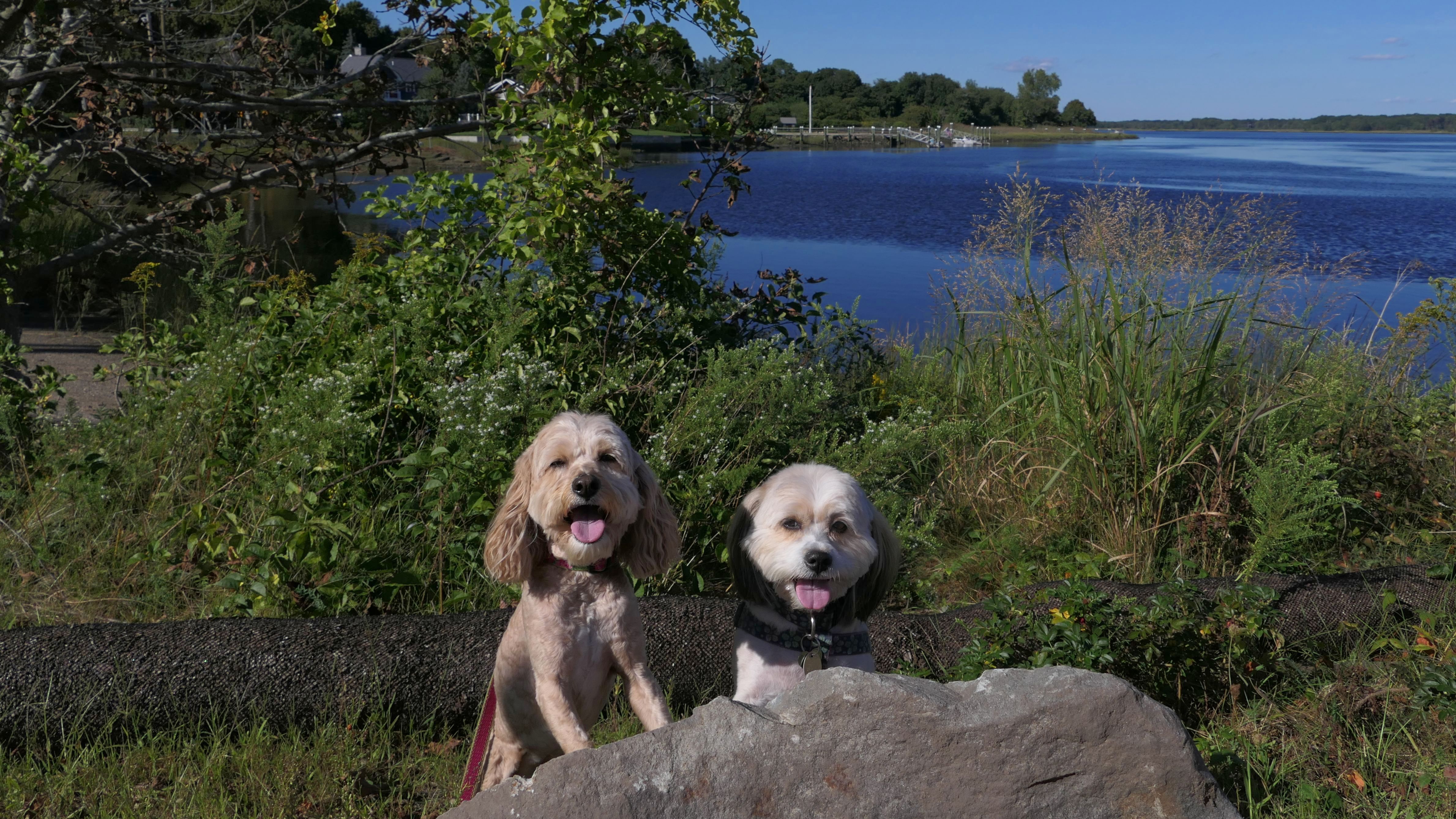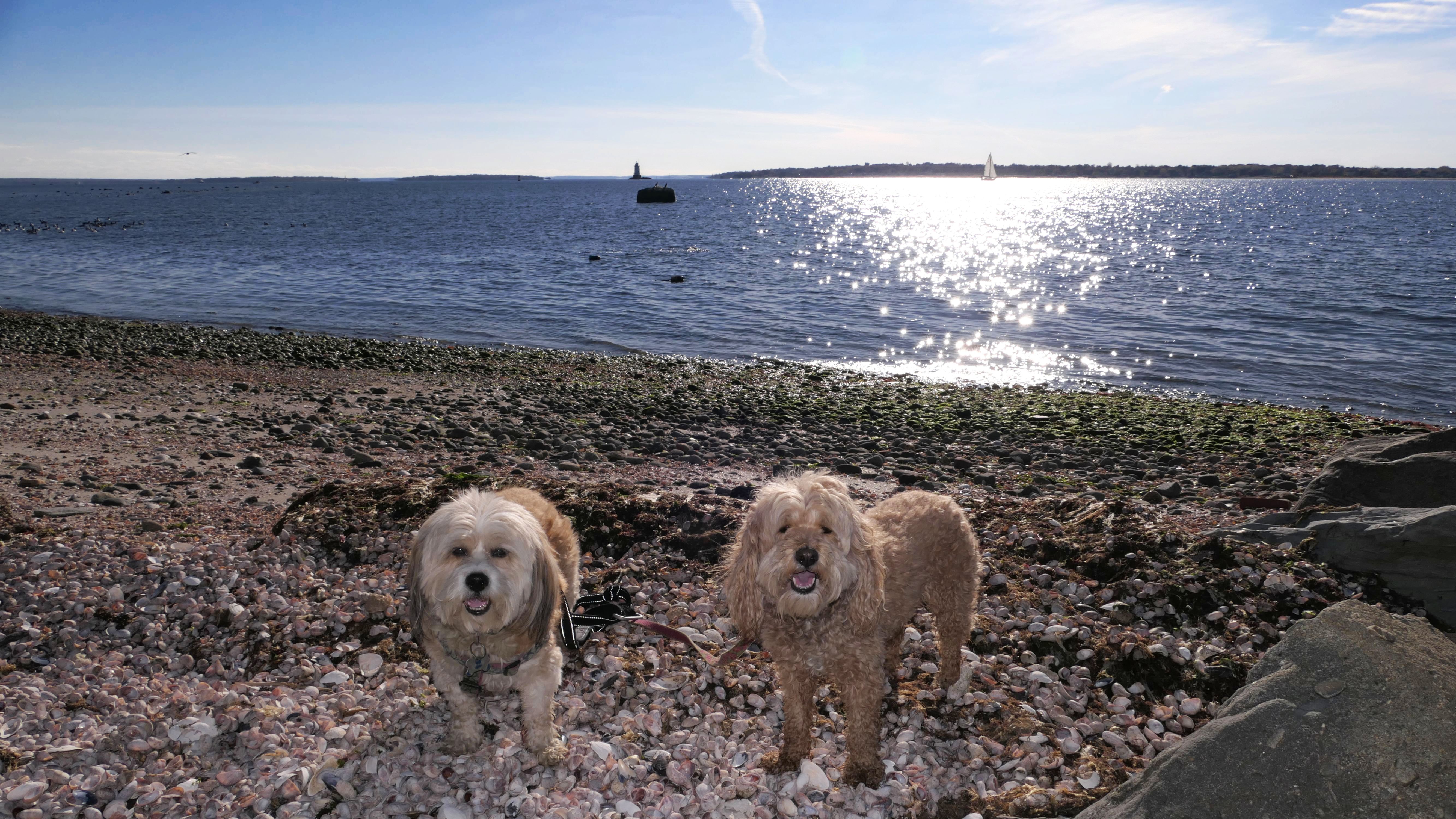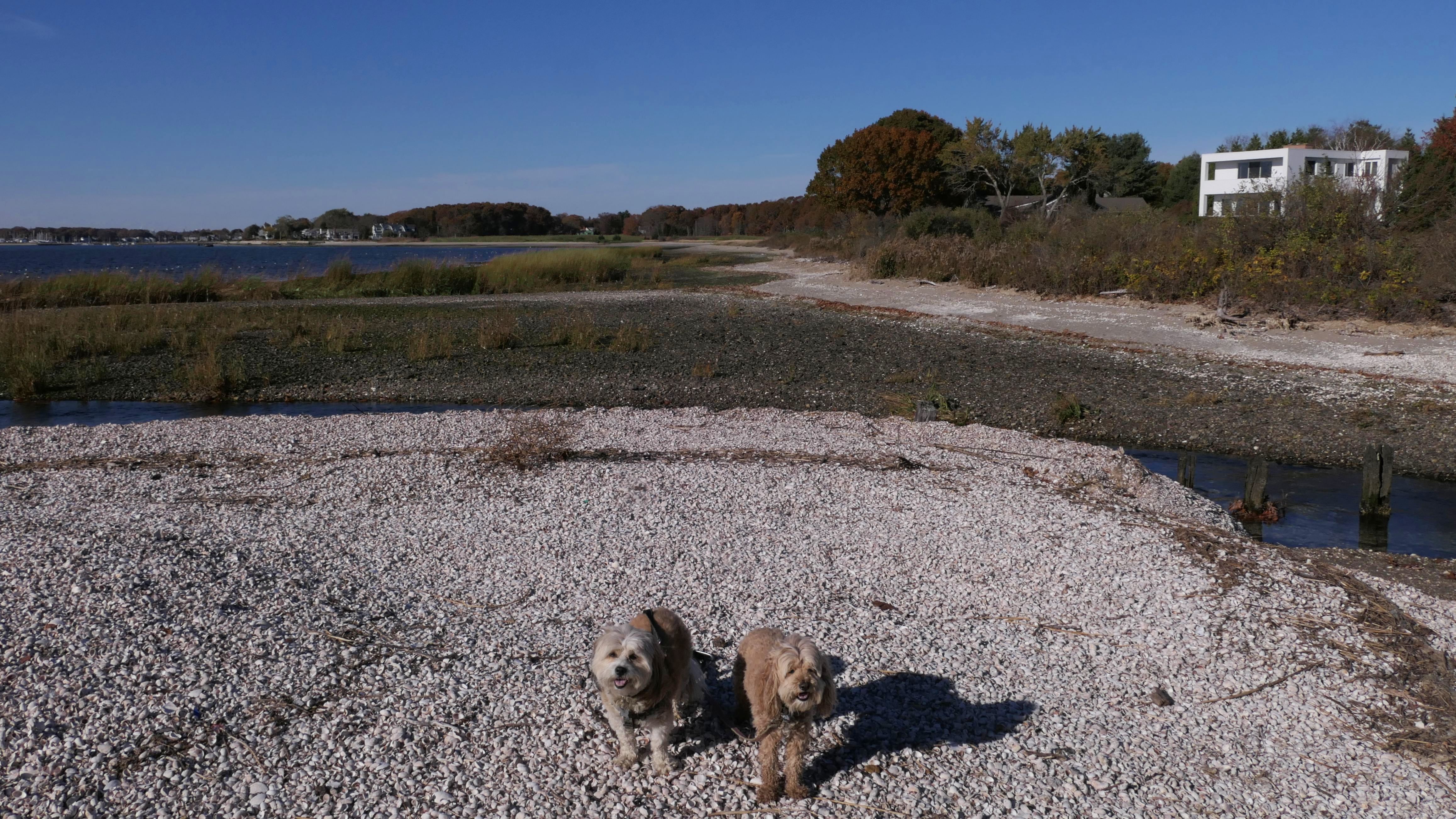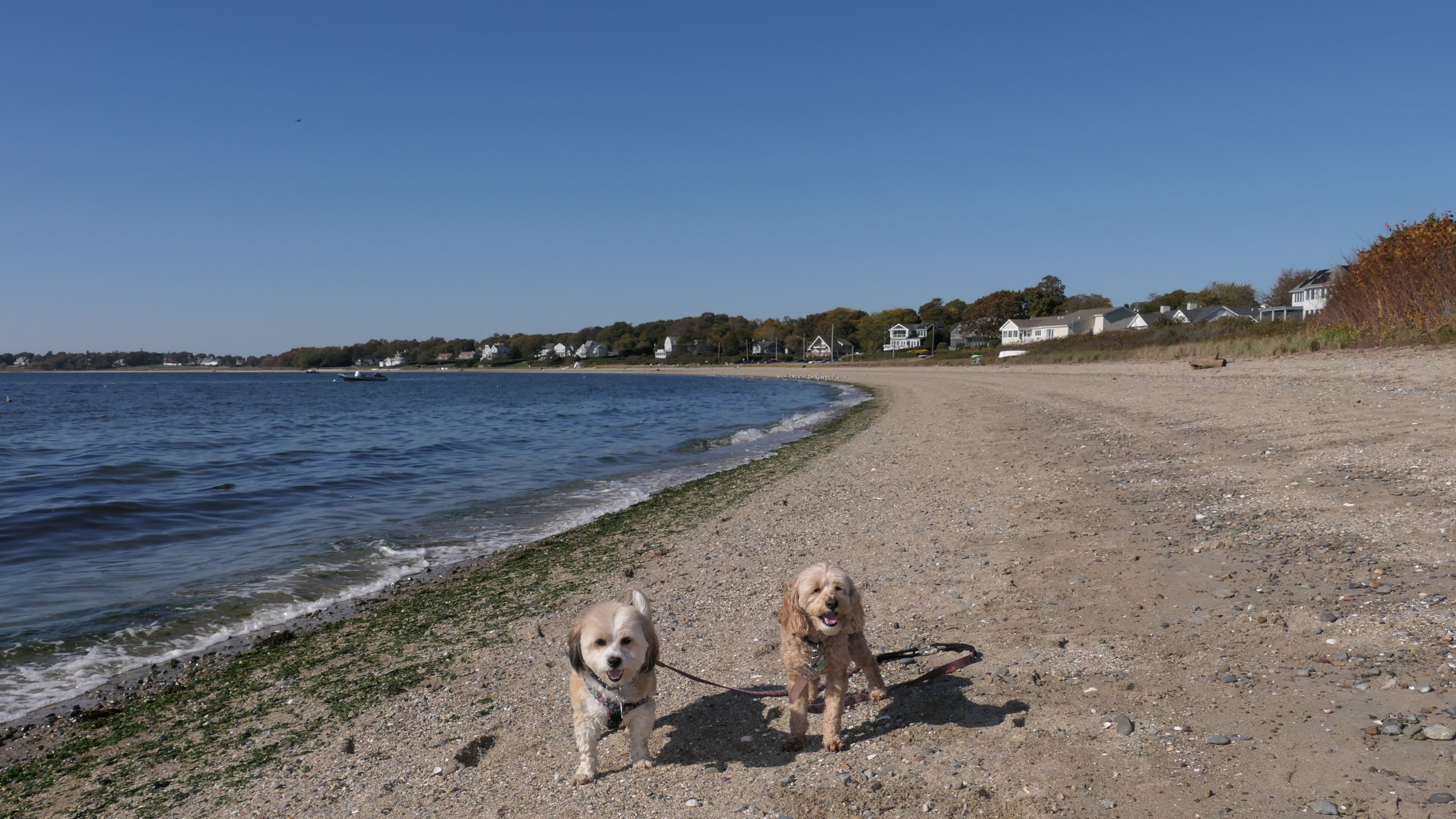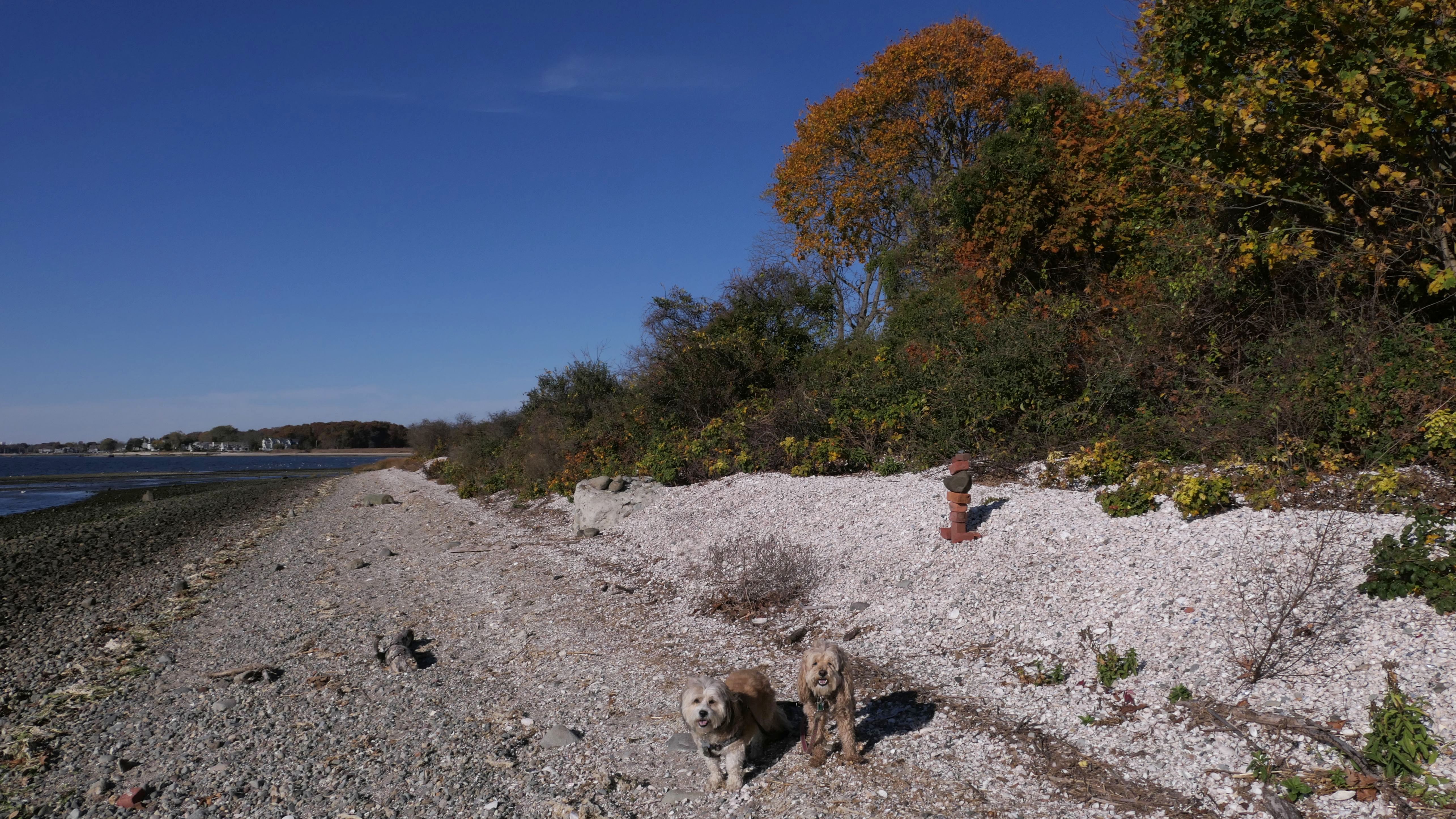 This is a Barrington Land Trust property that can be accessed from three different public access points. There is a parking lot for about four cars, maybe five, at the corner of Appian Way and Grove Street. We took the short path at the end of Appian Way to the beach area. The beach surface is more gravel and pebble than sand. We headed south along the shore until we hit Mussachuck Creek. In order to continue, we had to pass through the creek, so I took off my shoes and socks, and the dogs just ran through it. There's another public access point on the other side of the creek (Daunis Road), with parking for two cars. We were able to continue a bit further until we reached a wider beach area. Nayatt Point Lighthouse is here, but you can't get to it since it on private property. We turned around here, and backtracked the way we came. Instead of leaving via the Appian Way Access Point, we continued north. The beach is narrow here, with a rock wall protecting the adjacent properties. We eventually reached a wider beach area and an access point at Annawamscutt Road. From here, we walked via Annawamscutt Road and Appian Way back to the car. The entire adventure was just over three miles, on a beautiful, but a bit chilly autumn afternoon.