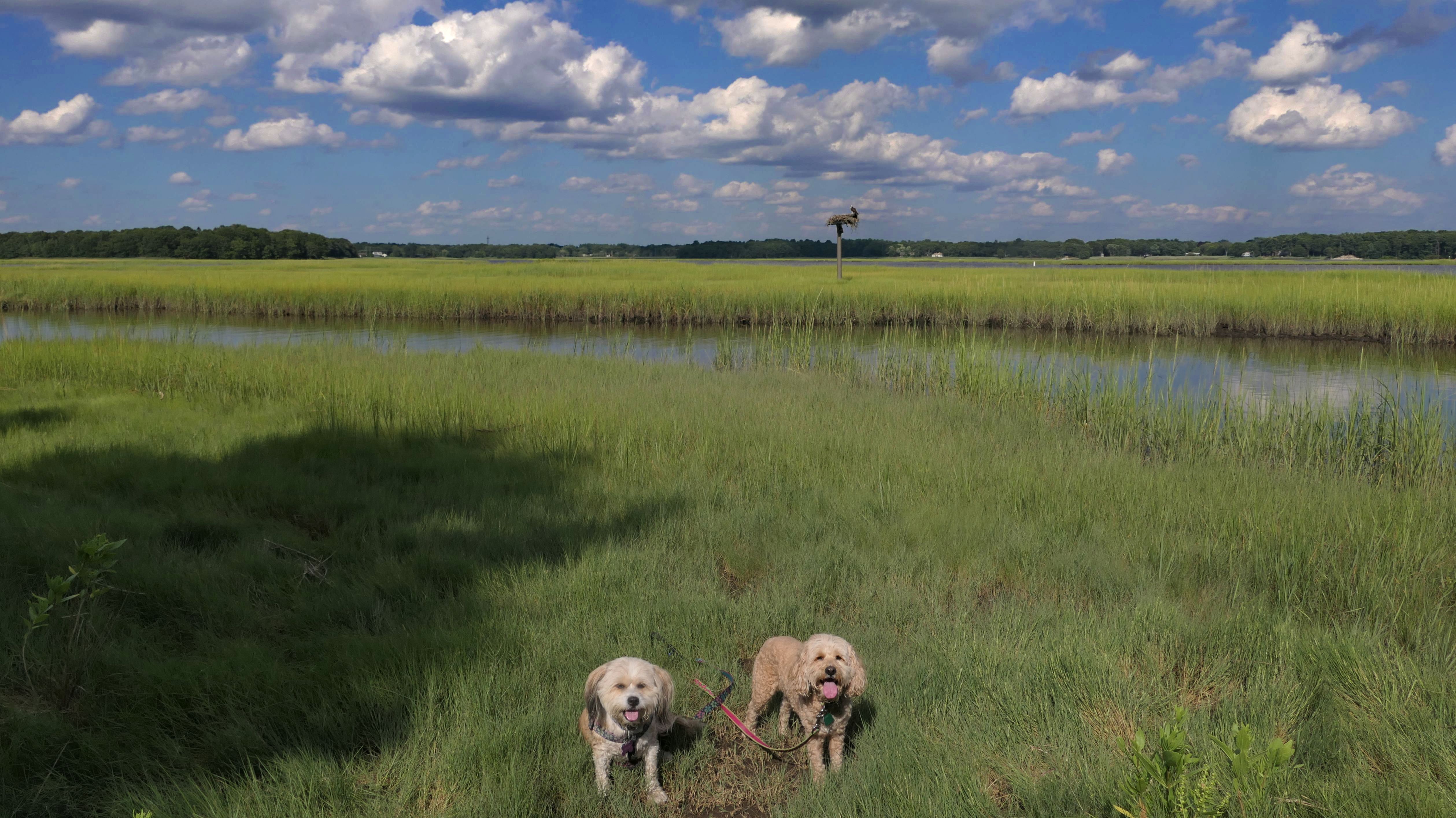 This place is also known as "Osamequin Bird Sanctuary". Dogs aren't normally allowed at bird sanctuarys, but as you can see from the sign below, they are allowed here on leash. There are mowed trails through a meadow that go out to the marsh area where you can see the osprey's nesting. There are some trails through the woods as well, including one that features a very narrow "two board" bridge with tall brush on either side. It made for quite an adventure. We also visited the Northern Trail, which is about a half mile up Route 114, and not connected to the main section. The trail here was overgrown, and very short. It also goes out to a marsh, but is not as nice as the main set of trails.