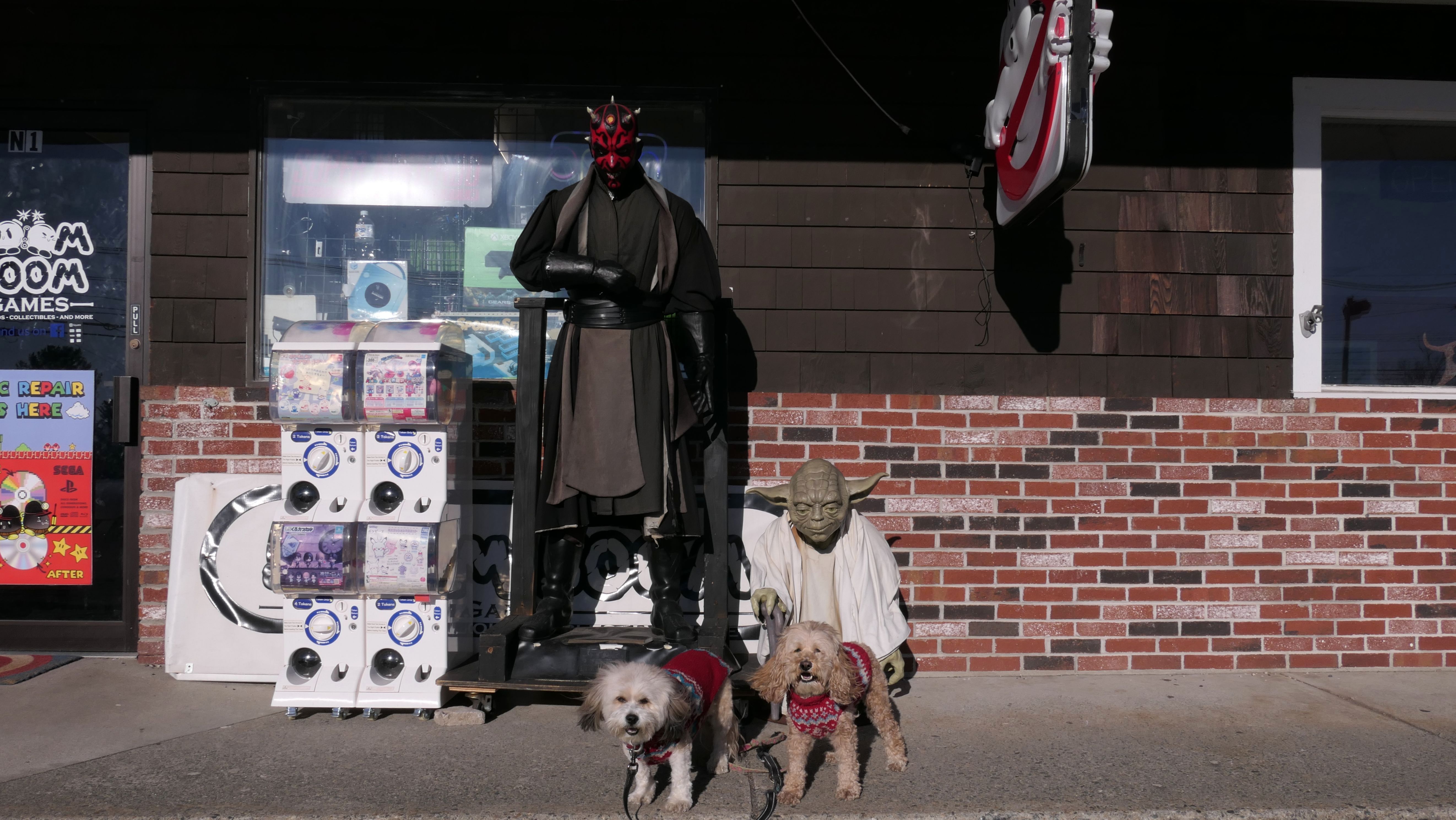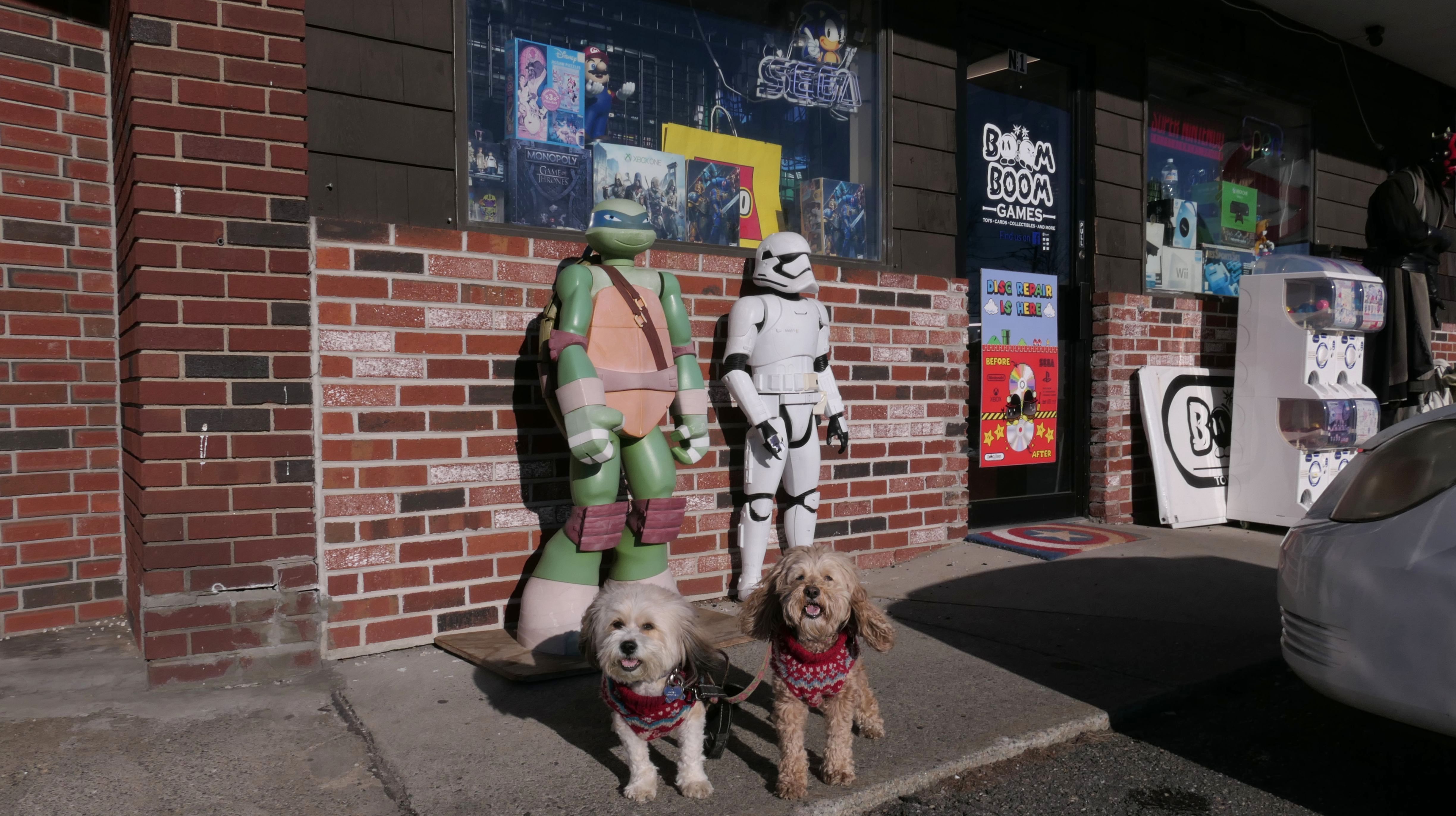 We pulled into this shopping plaza to turn around, and I saw the Star Wars statues and had to take a photo of the dogs with them. They belong to "Boom Boom Games", one of the stores in the plaza.