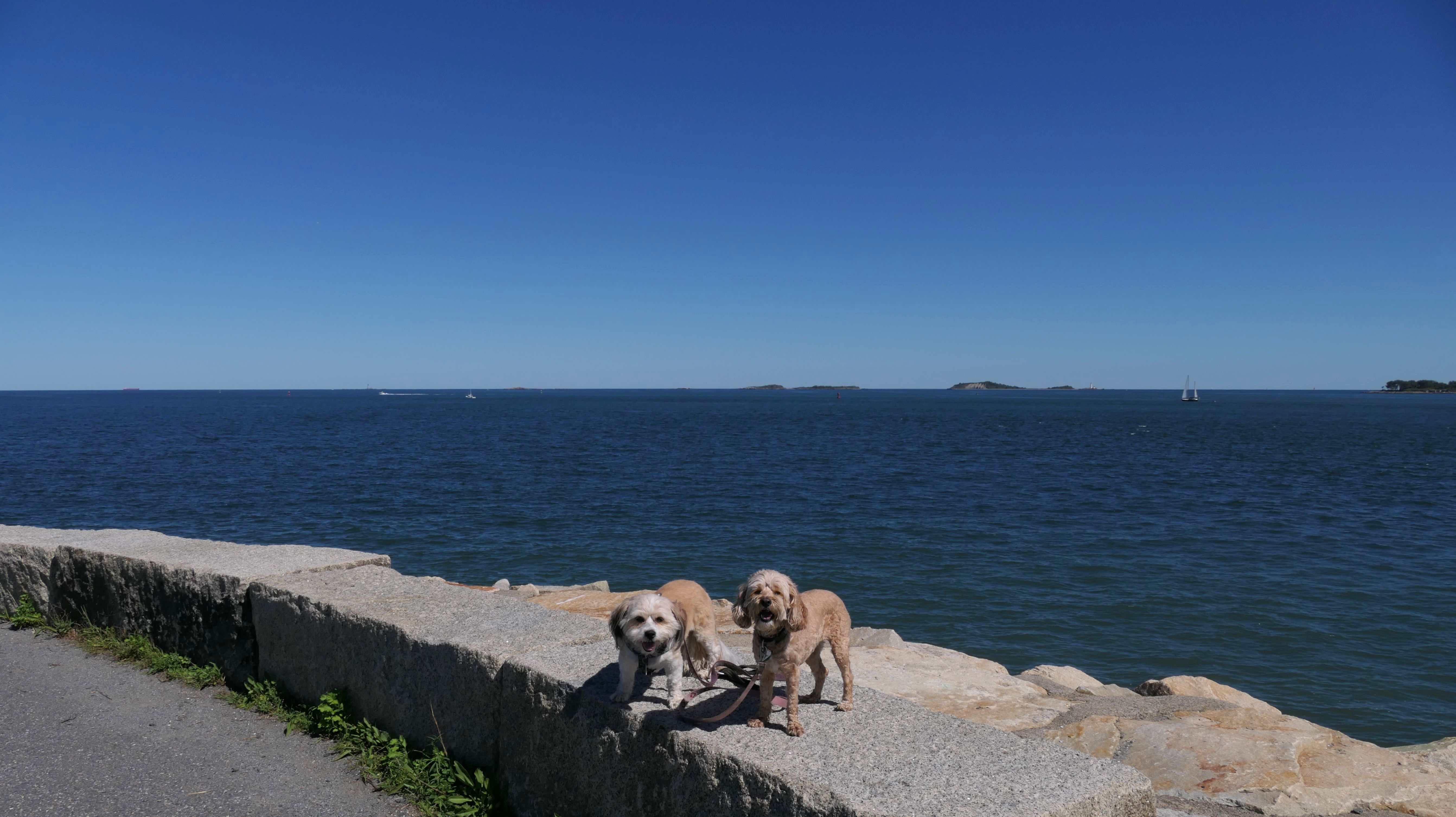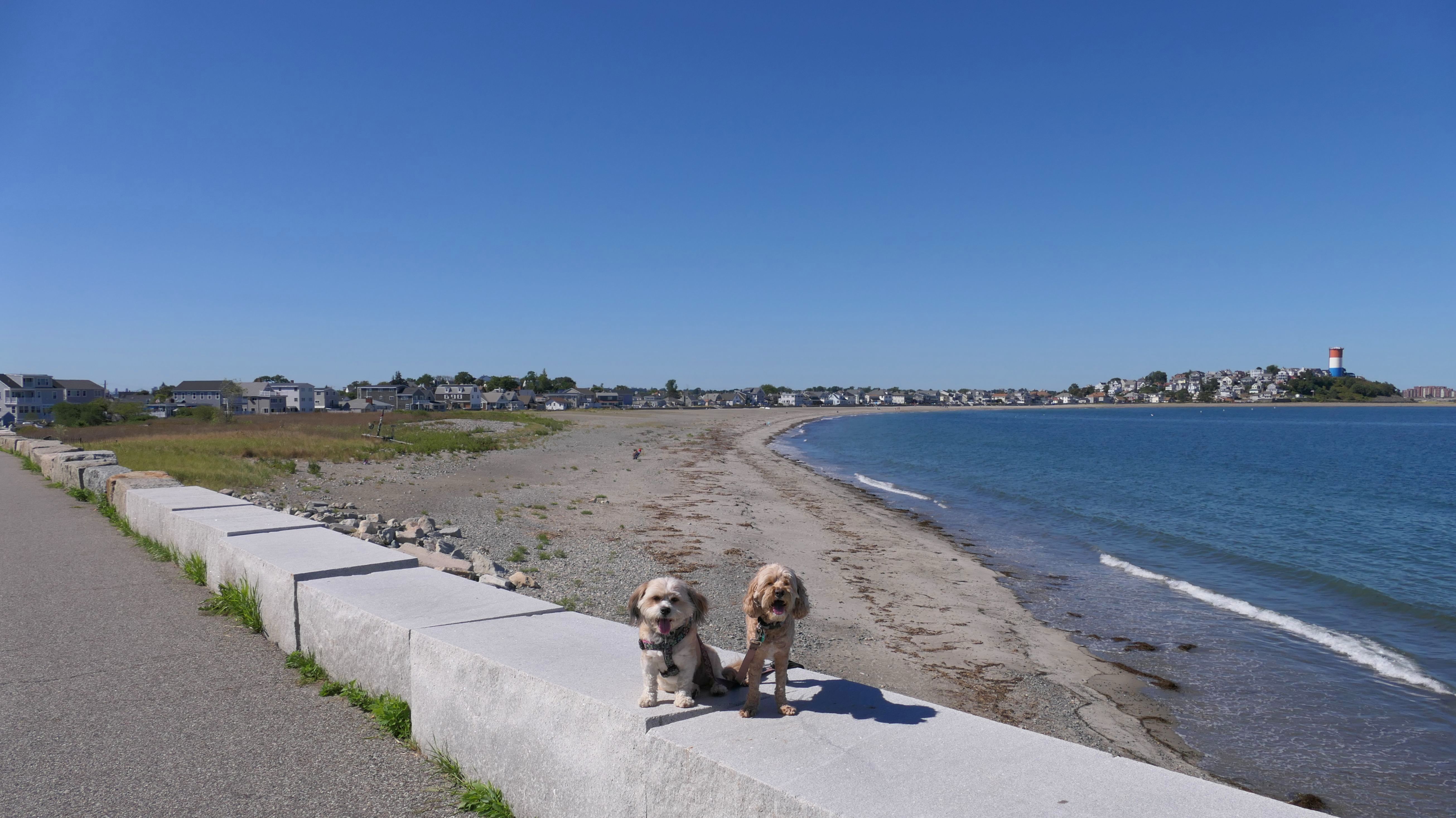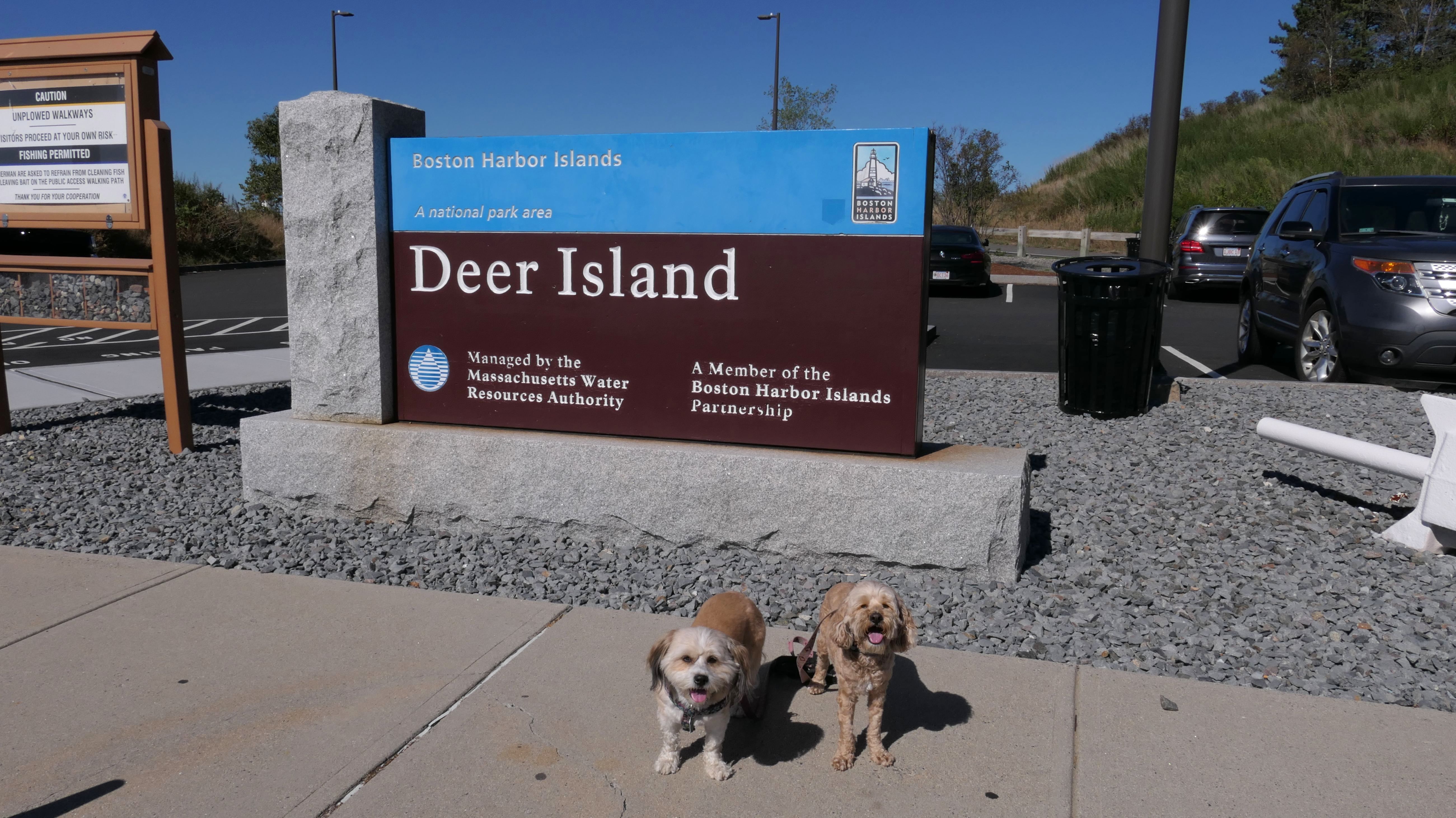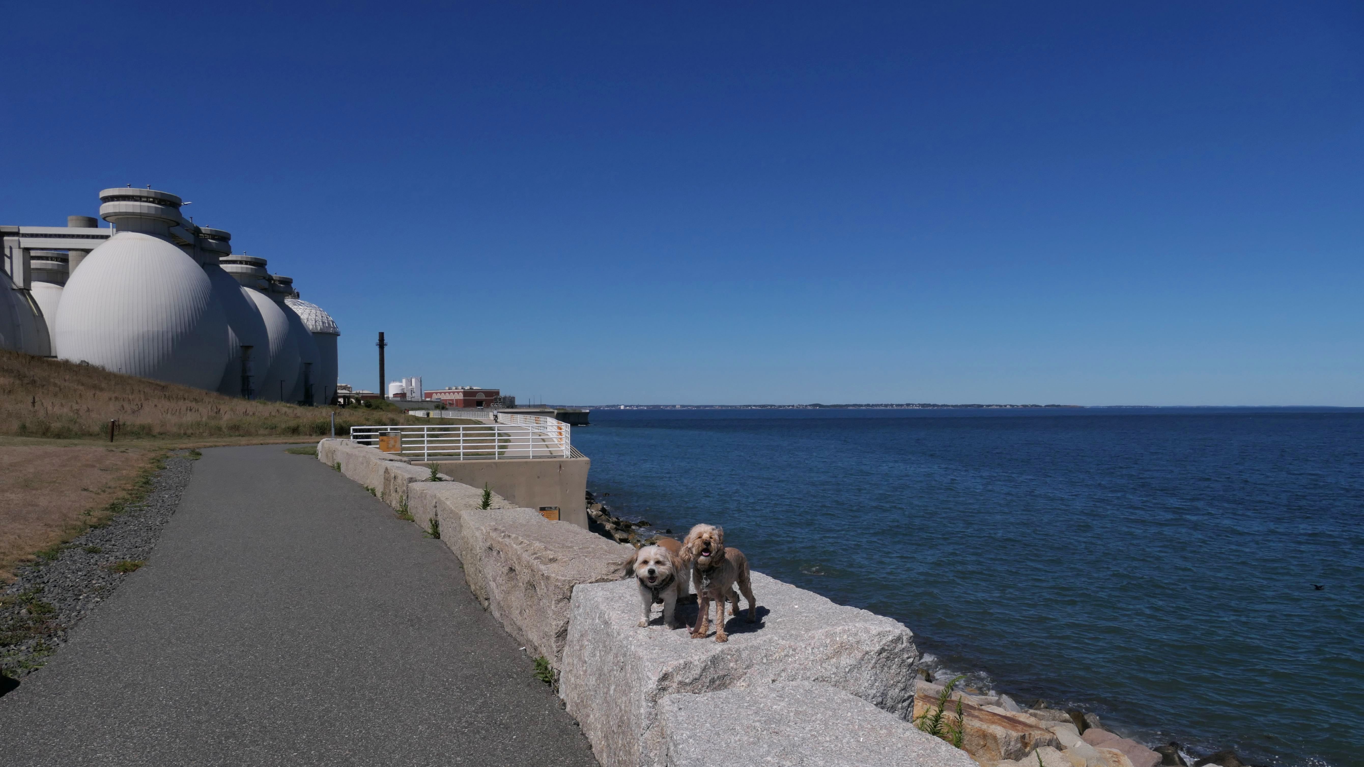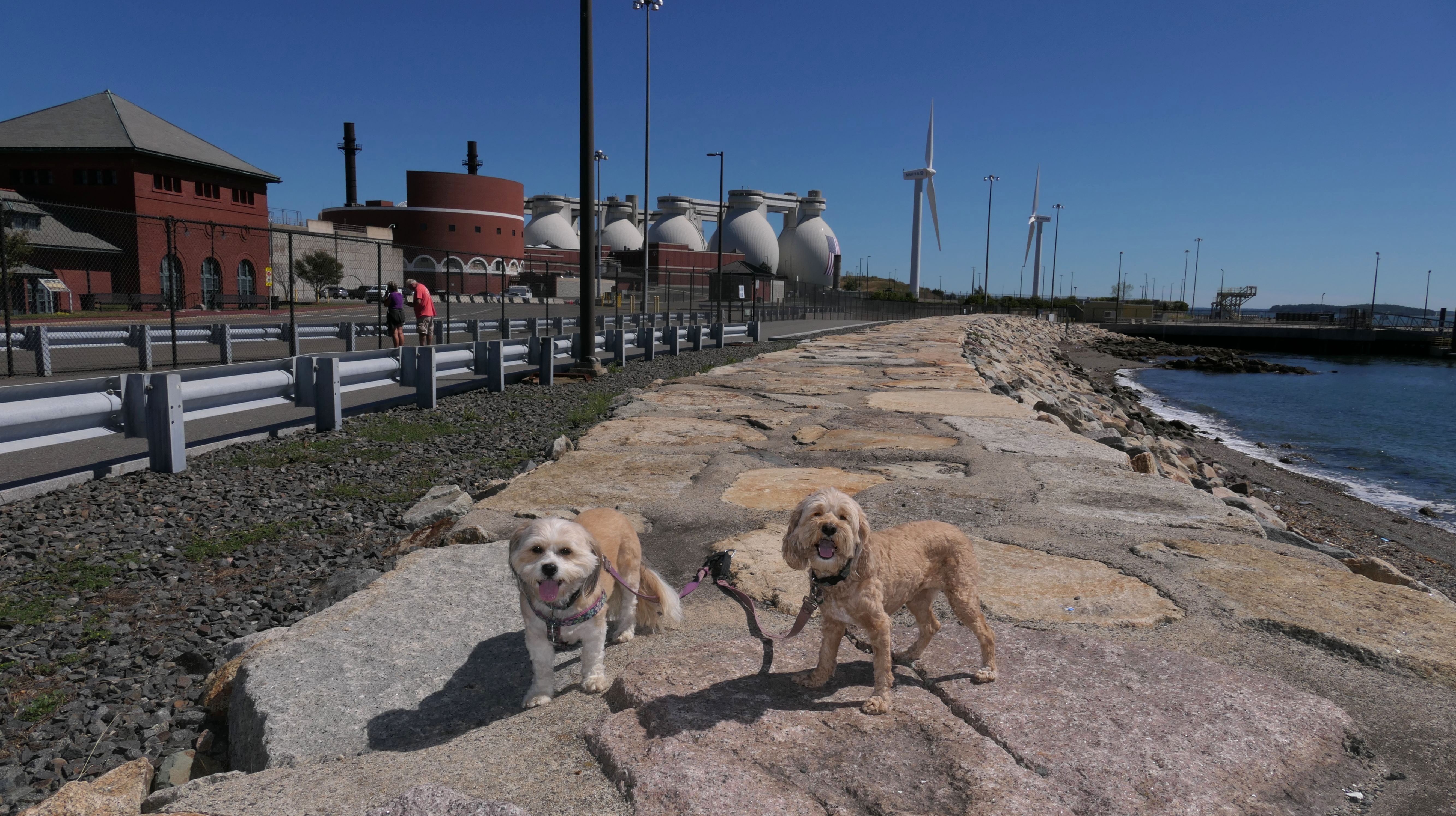 This was a wonderful trip! This place is pretty cool, and it was a spectacular day weather wise! First of all, despite it's name, it's not really an island. It was at one point, but the channel between Winthrop and Deer Island was filled in by the hurricane of 1938. Now it's a peninsula connected to Winthrop, but technically part of Boston. Two thirds of the island hosts the Deer Island Waste Water Treatment Plant, and the rest of the island is a public park. We walked the Harborwalk Trail that loops the perimeter of the island. The trail offers fantastic views of Boston Harbor. It's also a great spot to watch planes take off from Logan Airport. There are plenty poop bag dispensers and garbage cans on the trail, and even a water bowl for the dogs at one spot. The grounds are kept very nice and clean. At the end of the loop is a small trail that connects to Point Shirley Beach in Winthrop. A small section of the beach is actually part of Deer Island. You can see the rest of the beach pictures on the Winthrop Page. The only downside to this trip was the terrible traffic driving back to Connecticut. It took over three hours. I'm sure the start of Labor Day weekend had something to do with it. Despite the traffic, it was a very fun trip with the dogs.