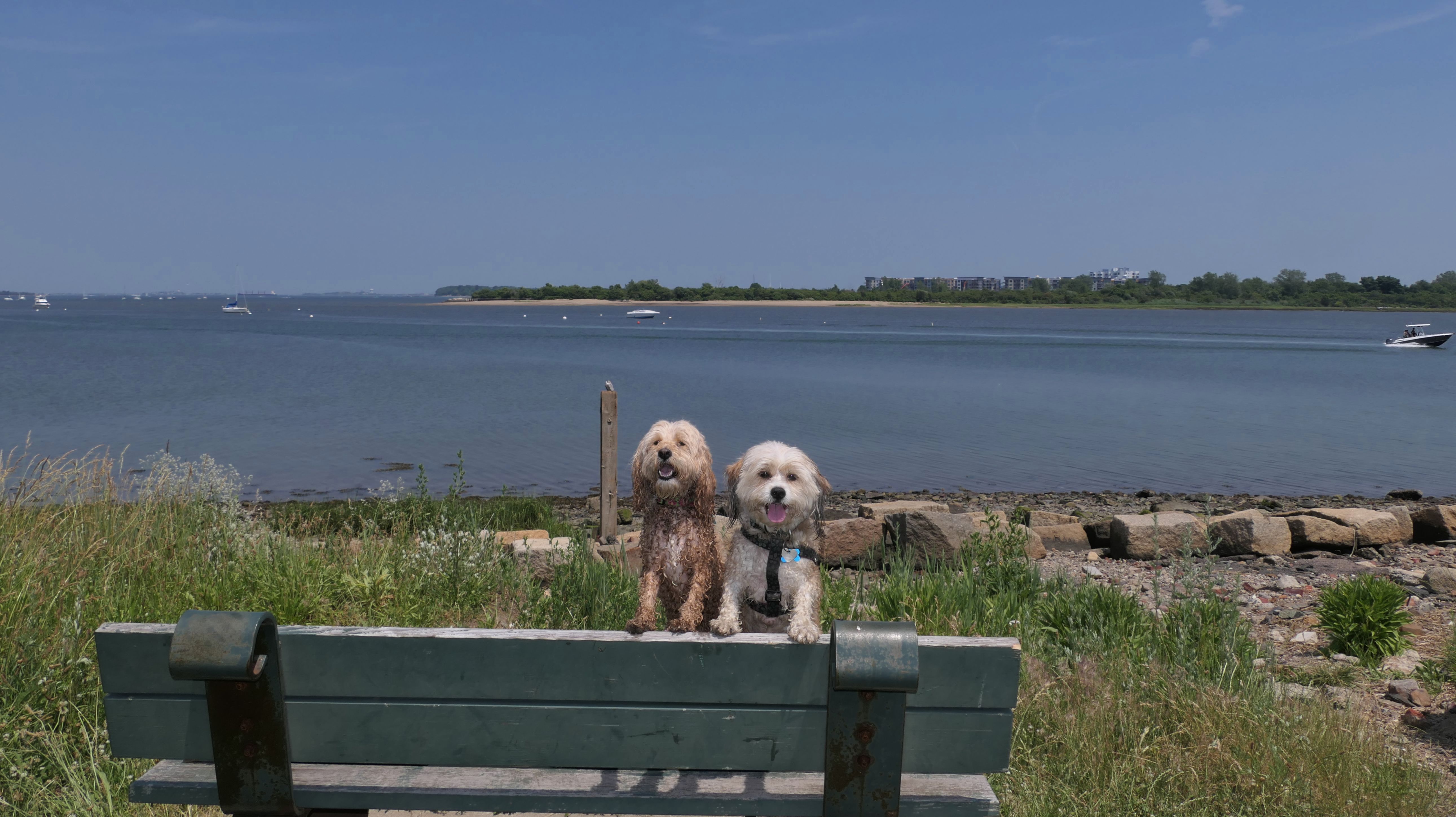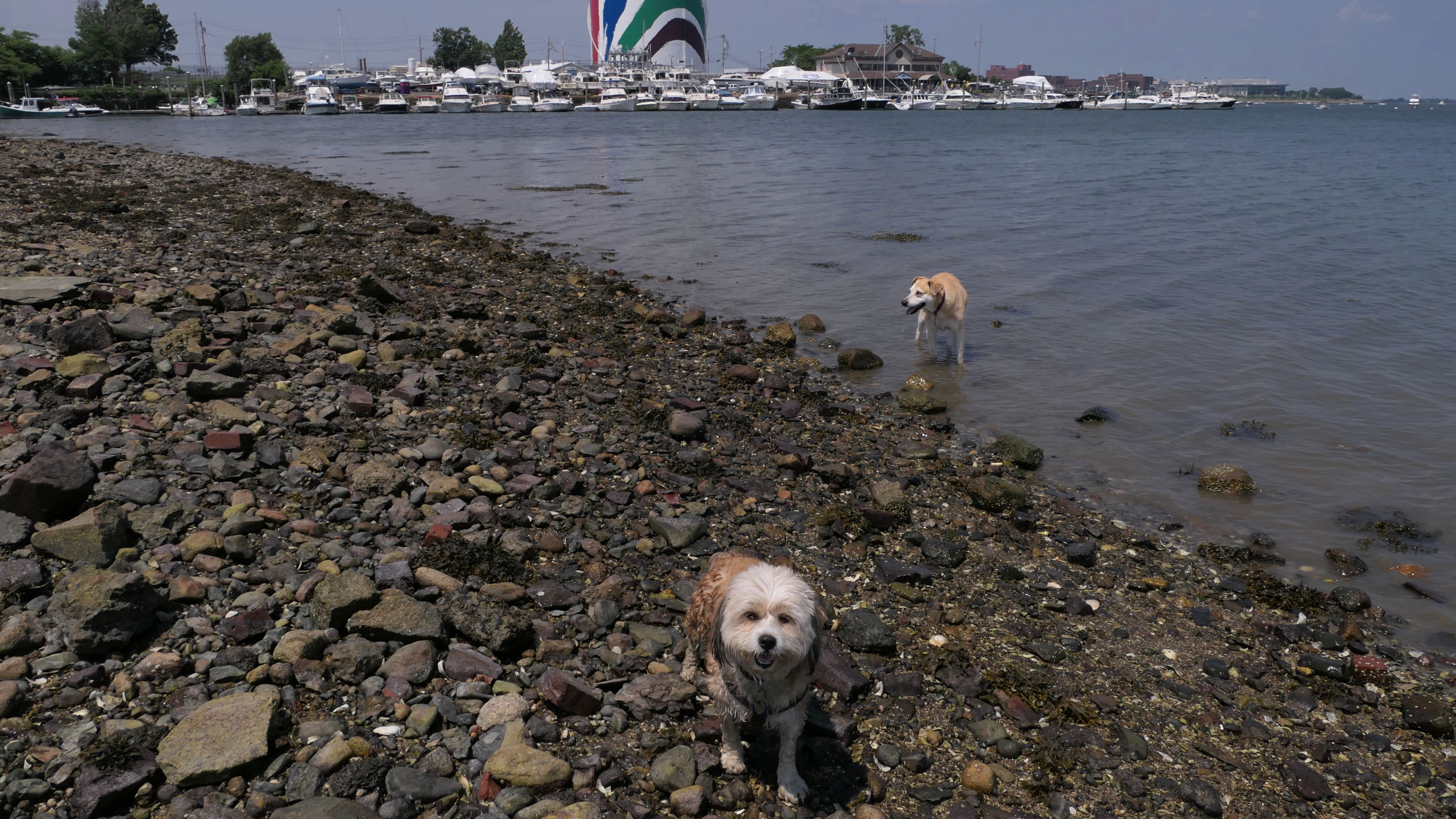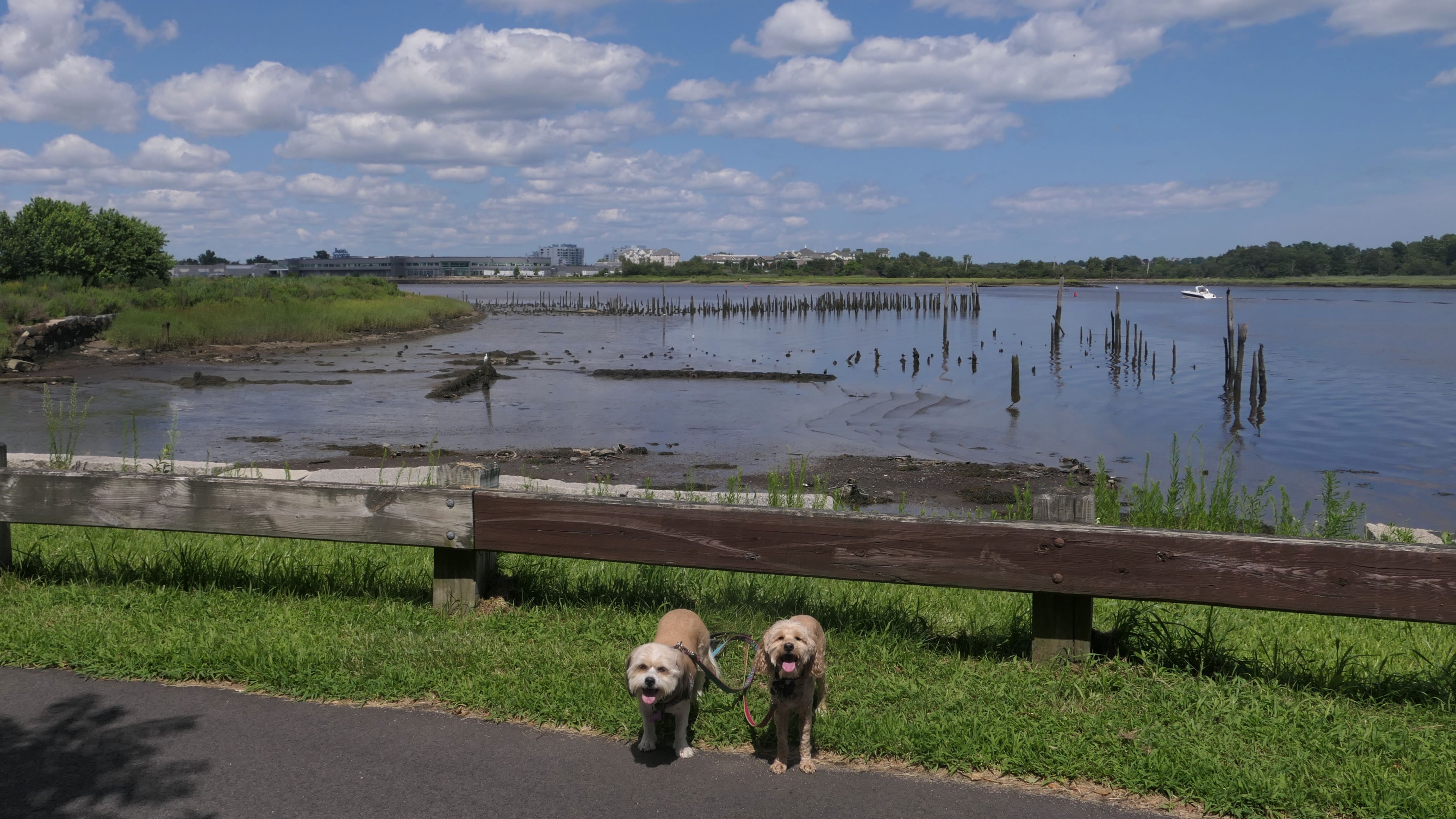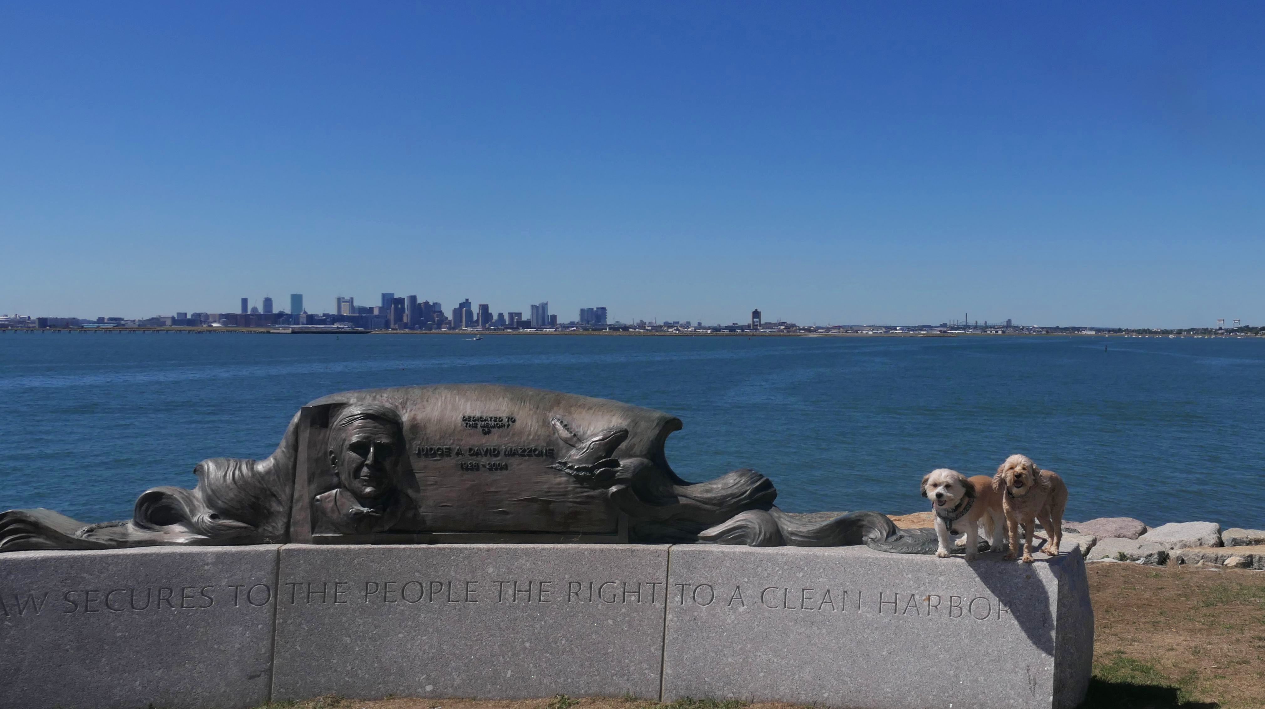 Also known as "Victory Park", this park sits on a small peninsula accessed via a short trail. It is used these days as an off-leash dog park, and a place where dogs can go swimming. There was record heat in Boston on this day, so Mandy and Lexi went straight for the water! The area that overlooks I-93 isn't that nice, but on the other side of the peninsula, views are better. You can see out to Squantum Point Park in Quincy, which is another dog-friendly area we've visited before, and a bit nicer than this one. We were joined here by a dog-walker who had five dogs with him, so Mandy and Lexi got to socialize a bit here too. This place isn't terrible, and the dogs enjoyed the water.