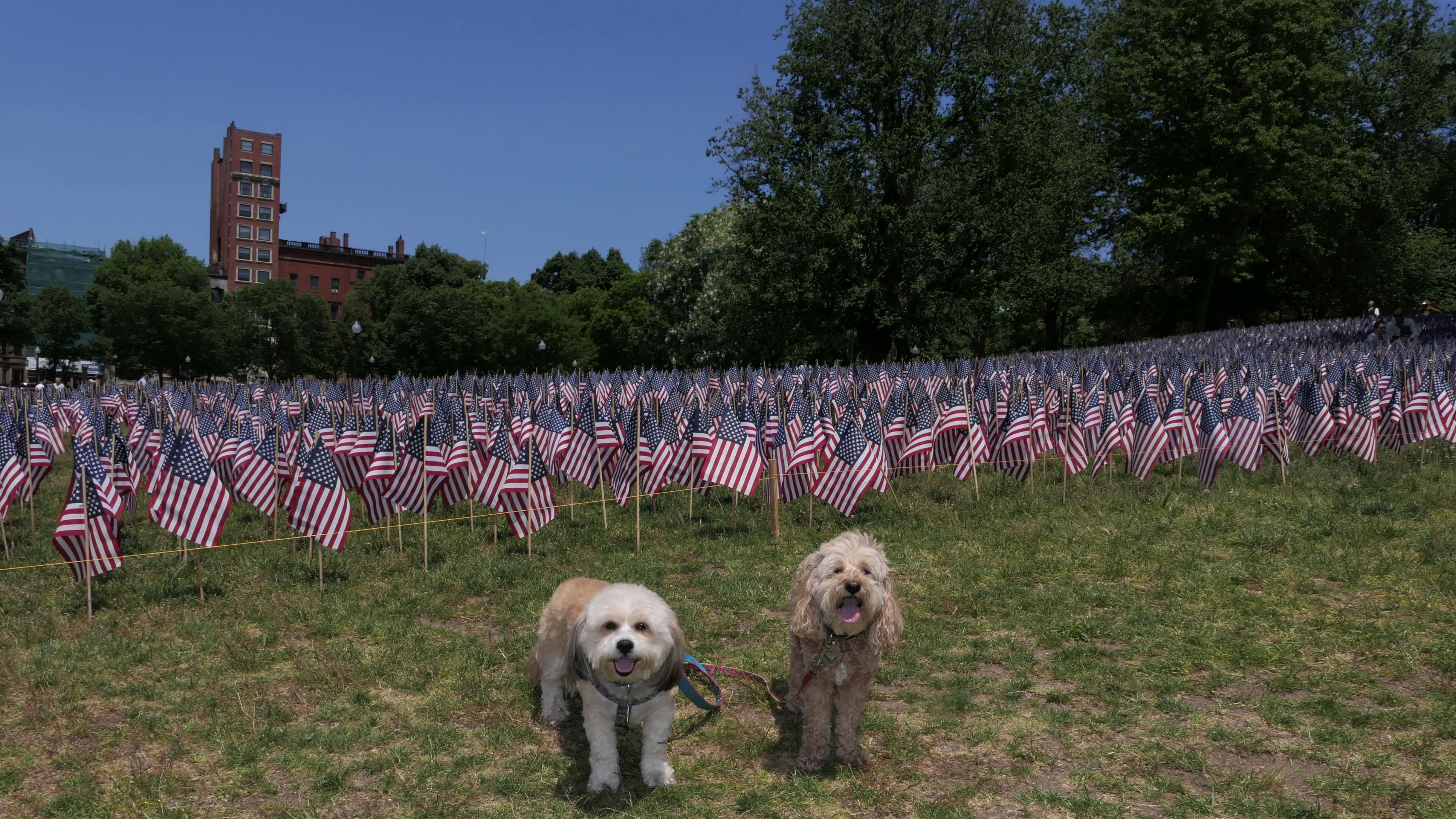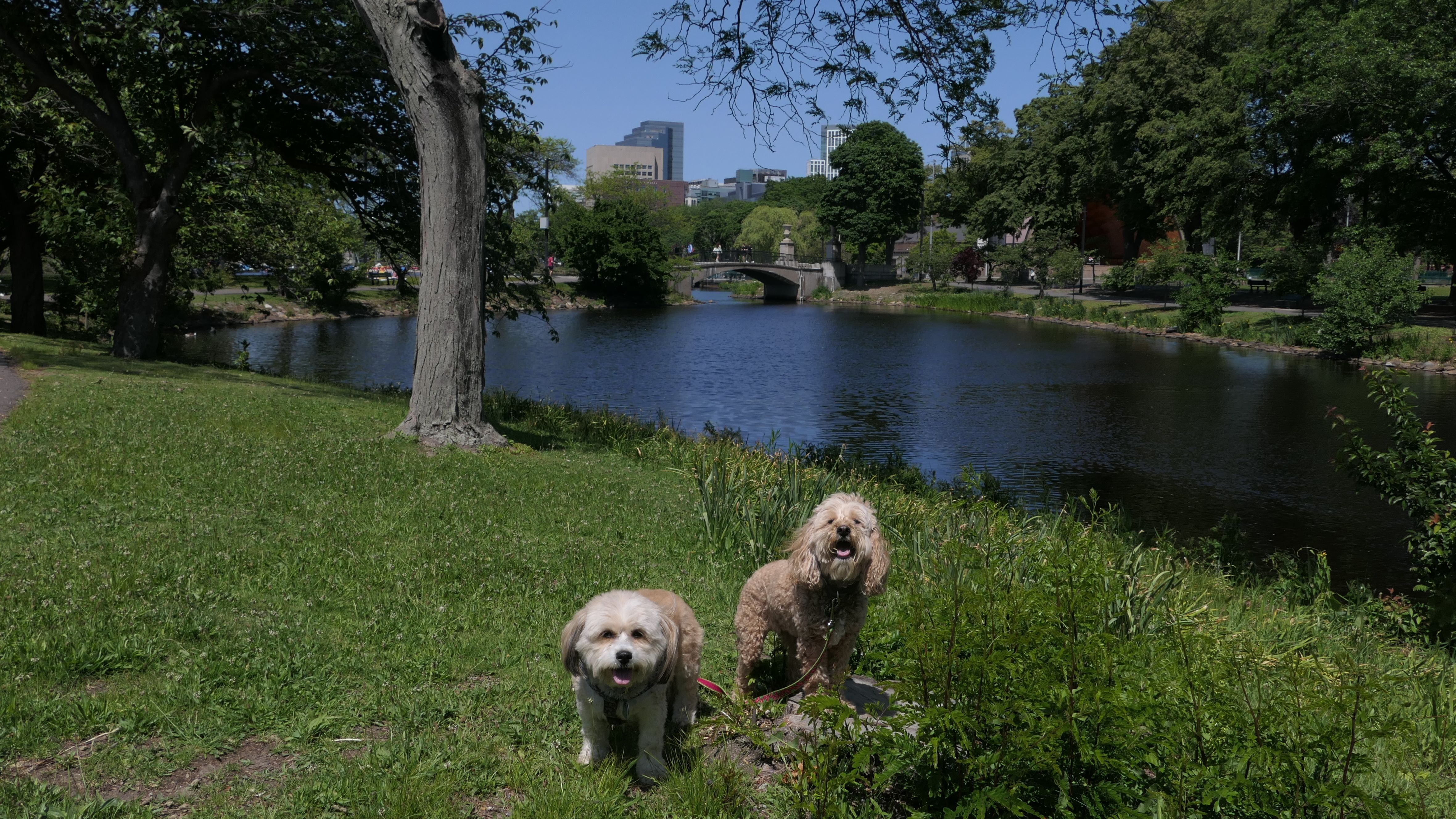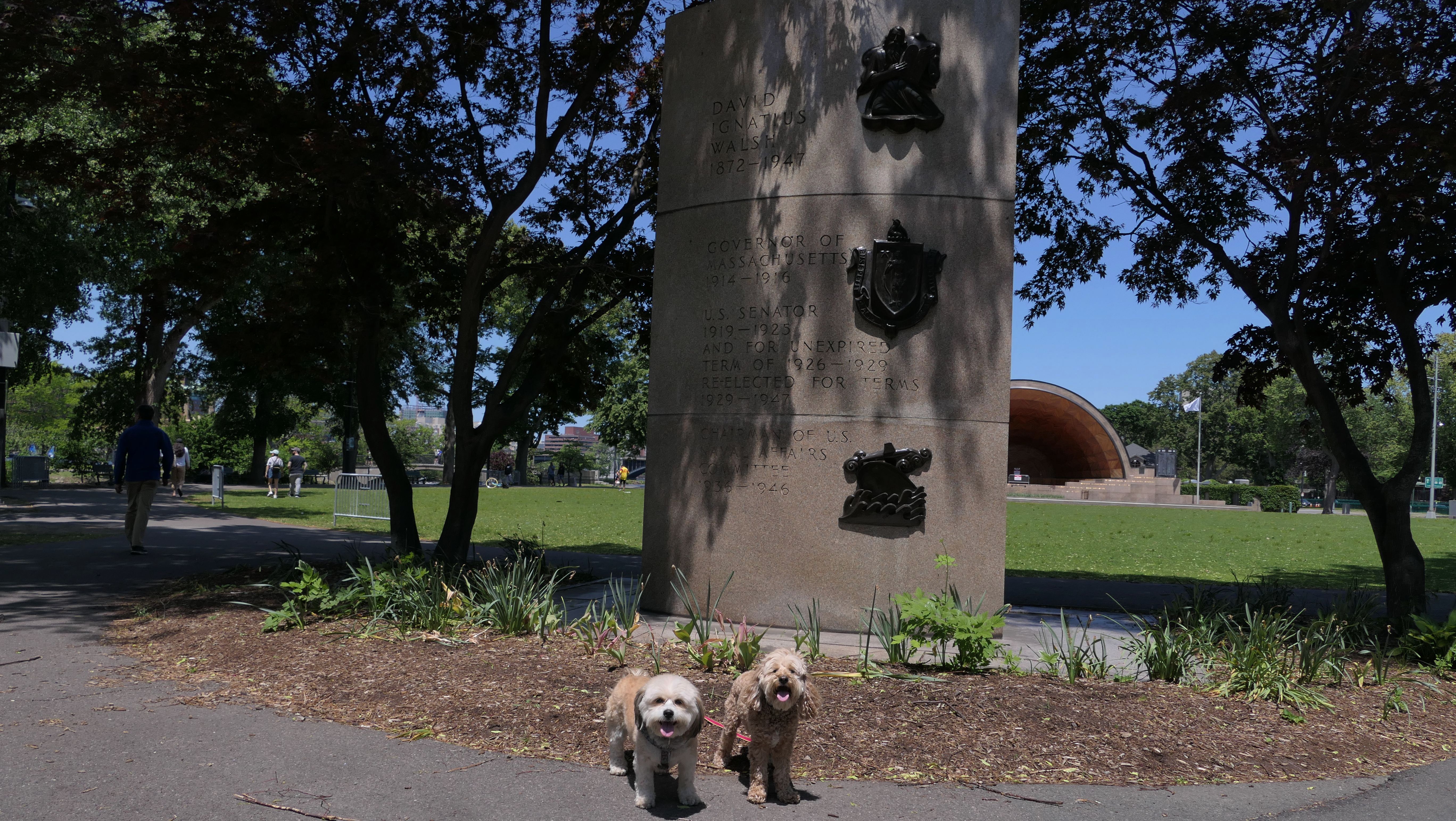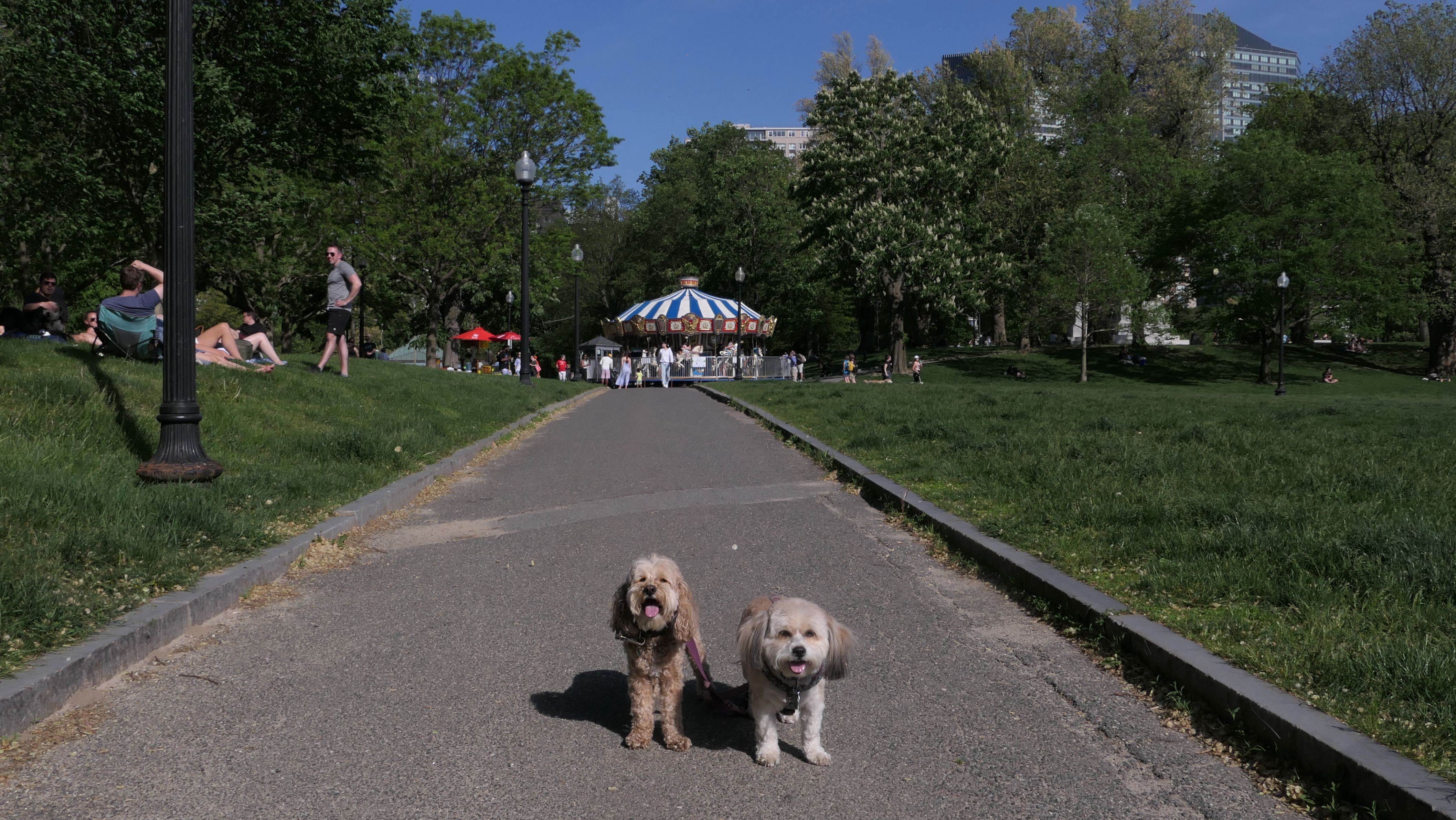 This park is a bit larger than the adjacent Boston Public Garden, and more open. There's also an off-leash dog area here, but Mandy and Lexi weren't really into it. There are many interesting statues and structures in this park. It also includes a carousel and the Tadpole Playground. We returned on Memorial Day, a couple weeks later. They had 37,000 flags on display in rememberance of the 37,000 people from Massachusetts that gave their lives for this country.