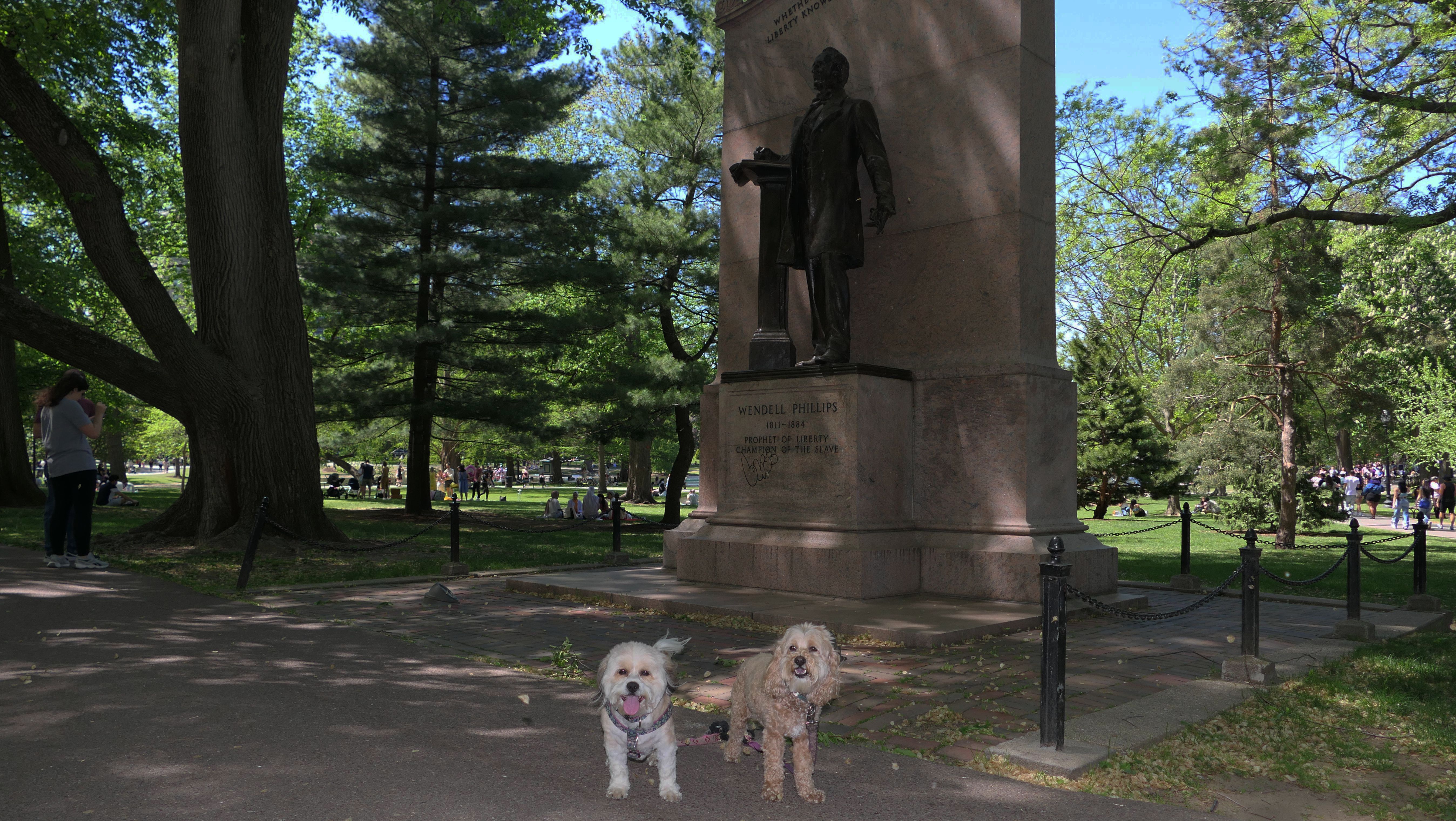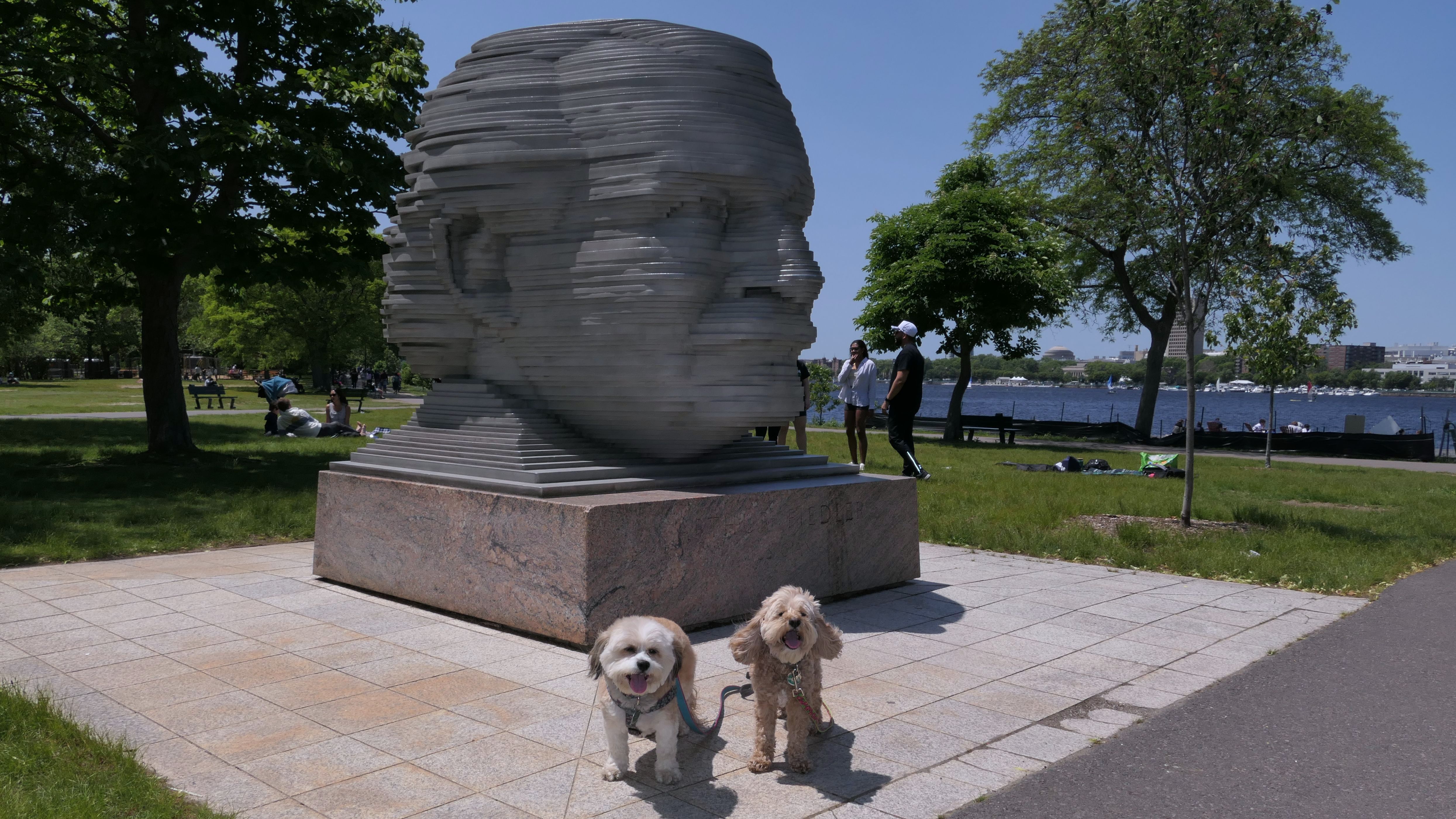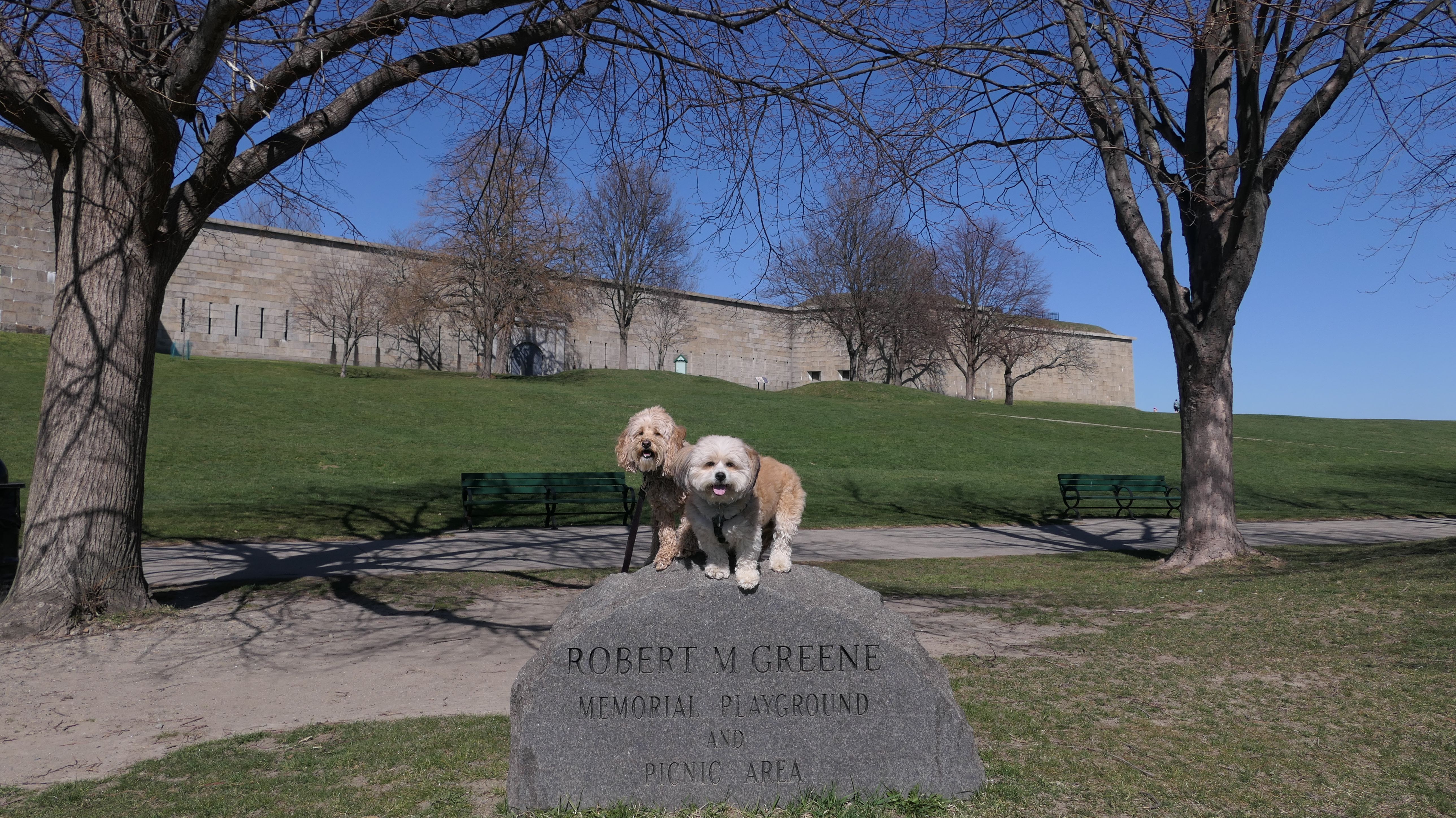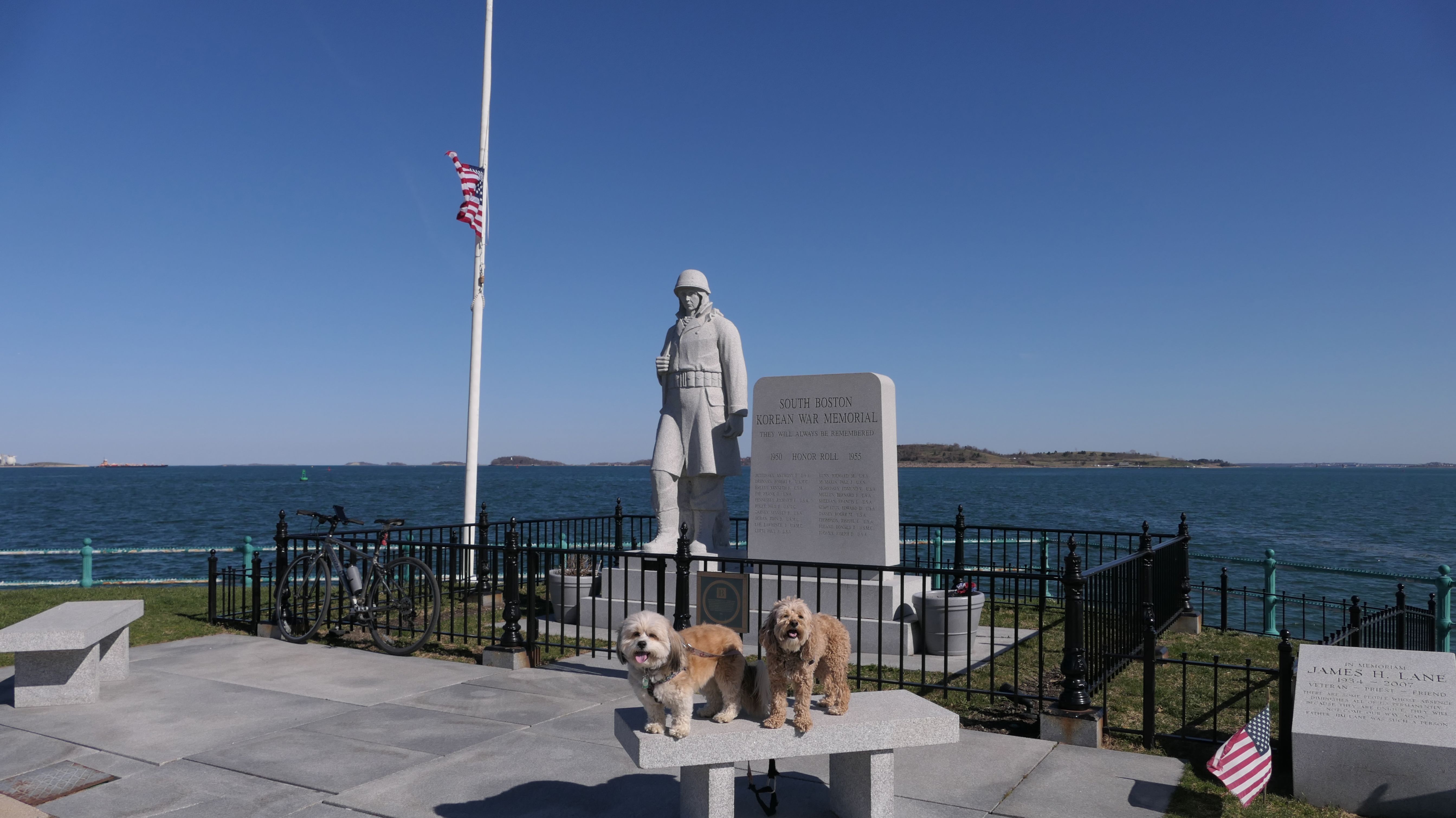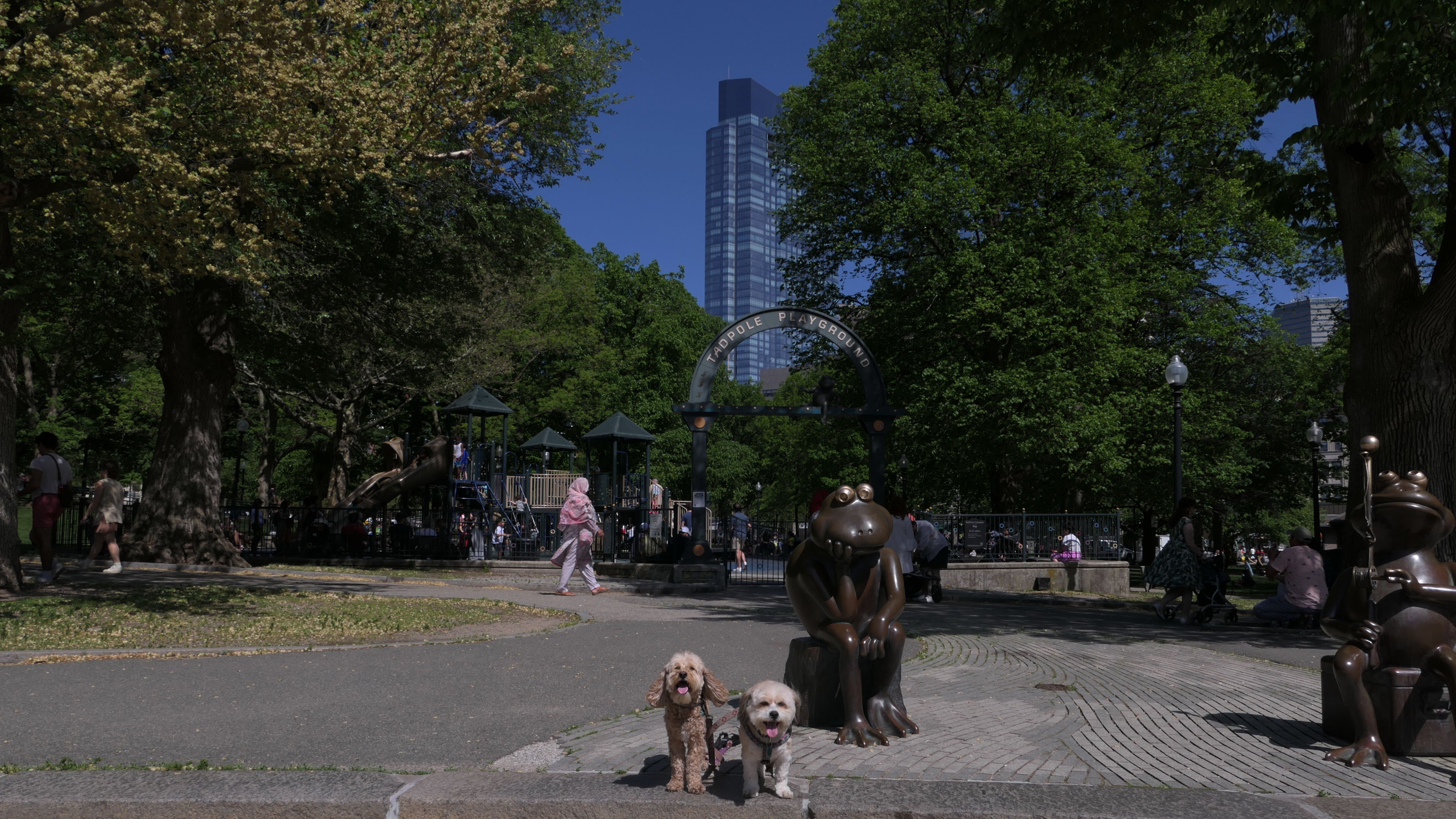 This park is a bit larger than the adjacent Boston Public Garden, and more open. There's also an off-leash dog area here, but Mandy and Lexi weren't really into it. There are many interesting statues and structures in this park. It also includes a carousel and the Tadpole Playground. We returned on Memorial Day, a couple weeks later. They had 37,000 flags on display in rememberance of the 37,000 people from Massachusetts that gave their lives for this country.