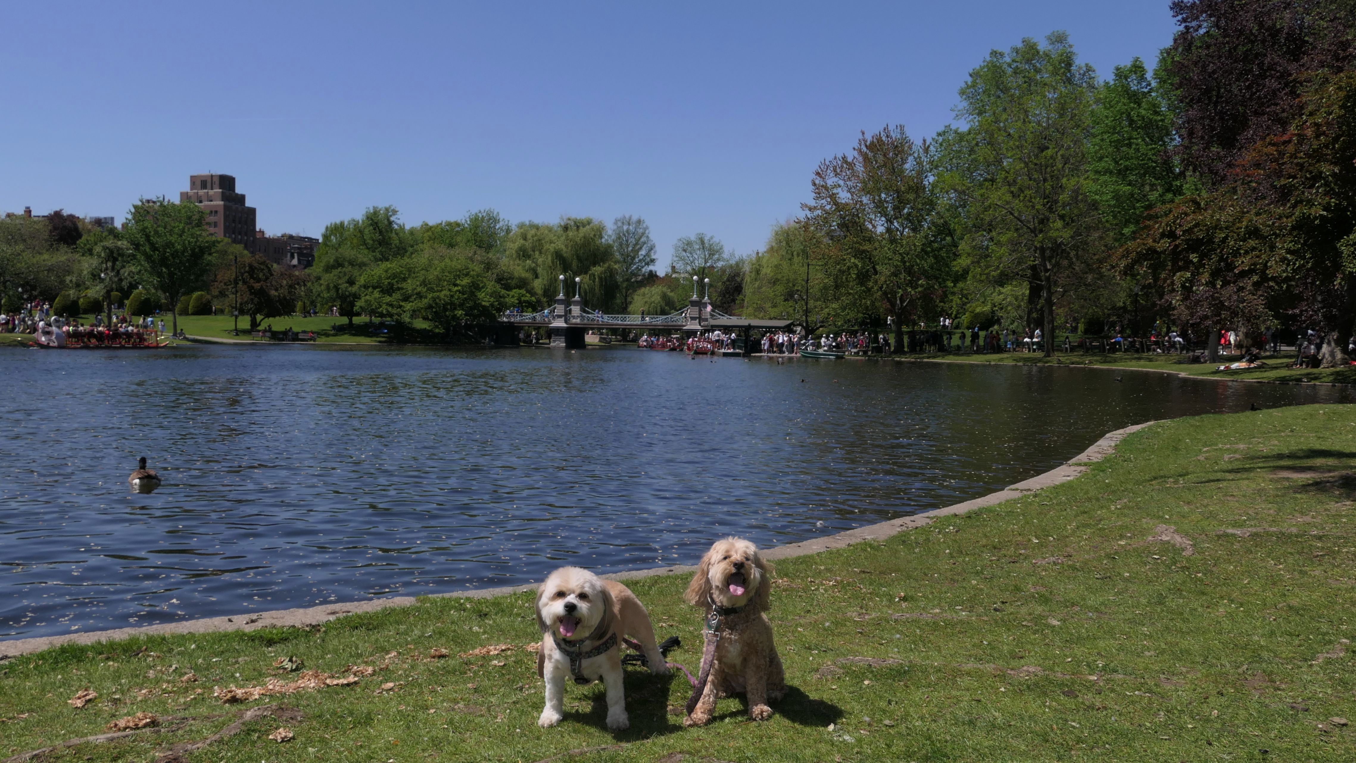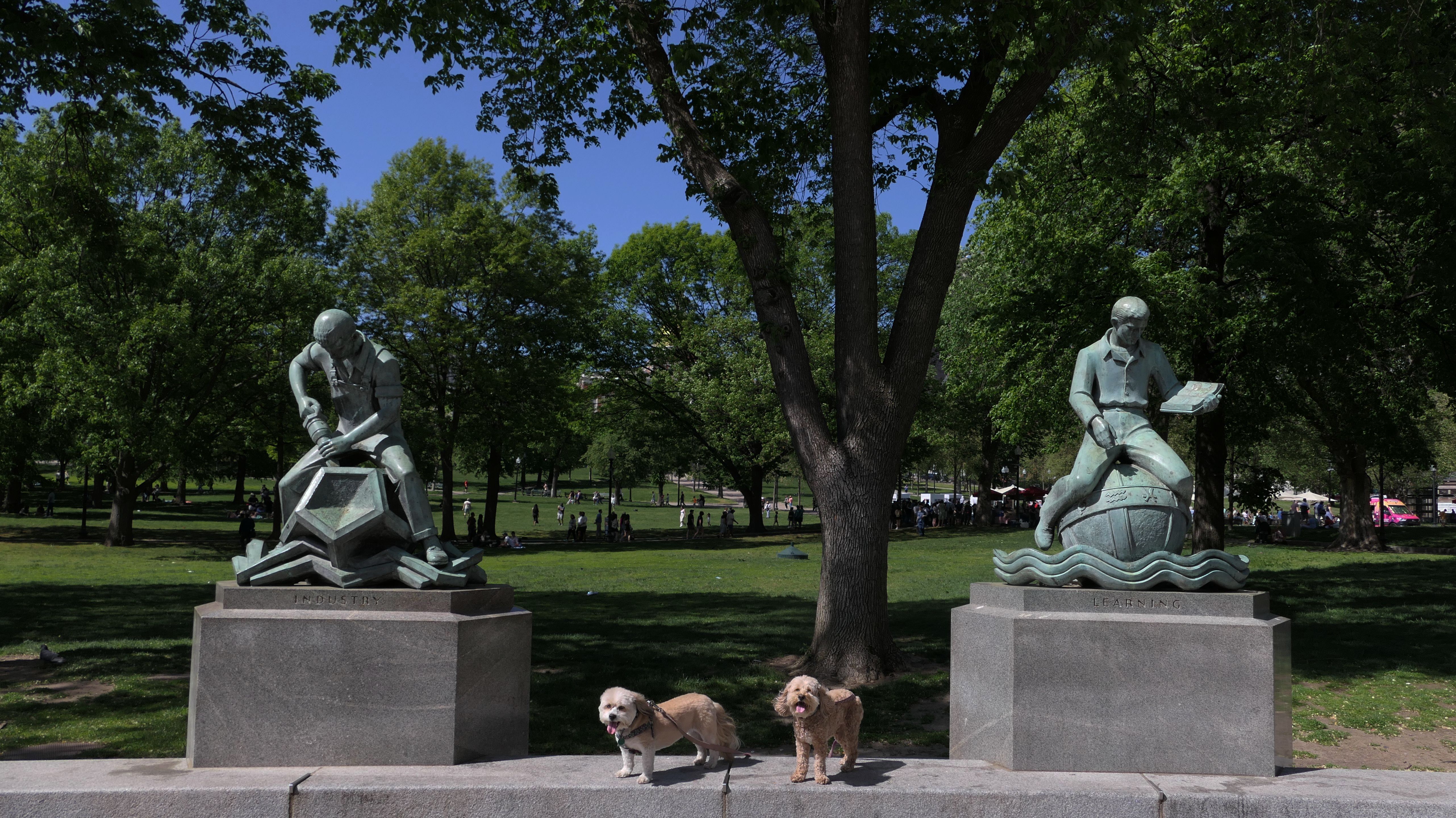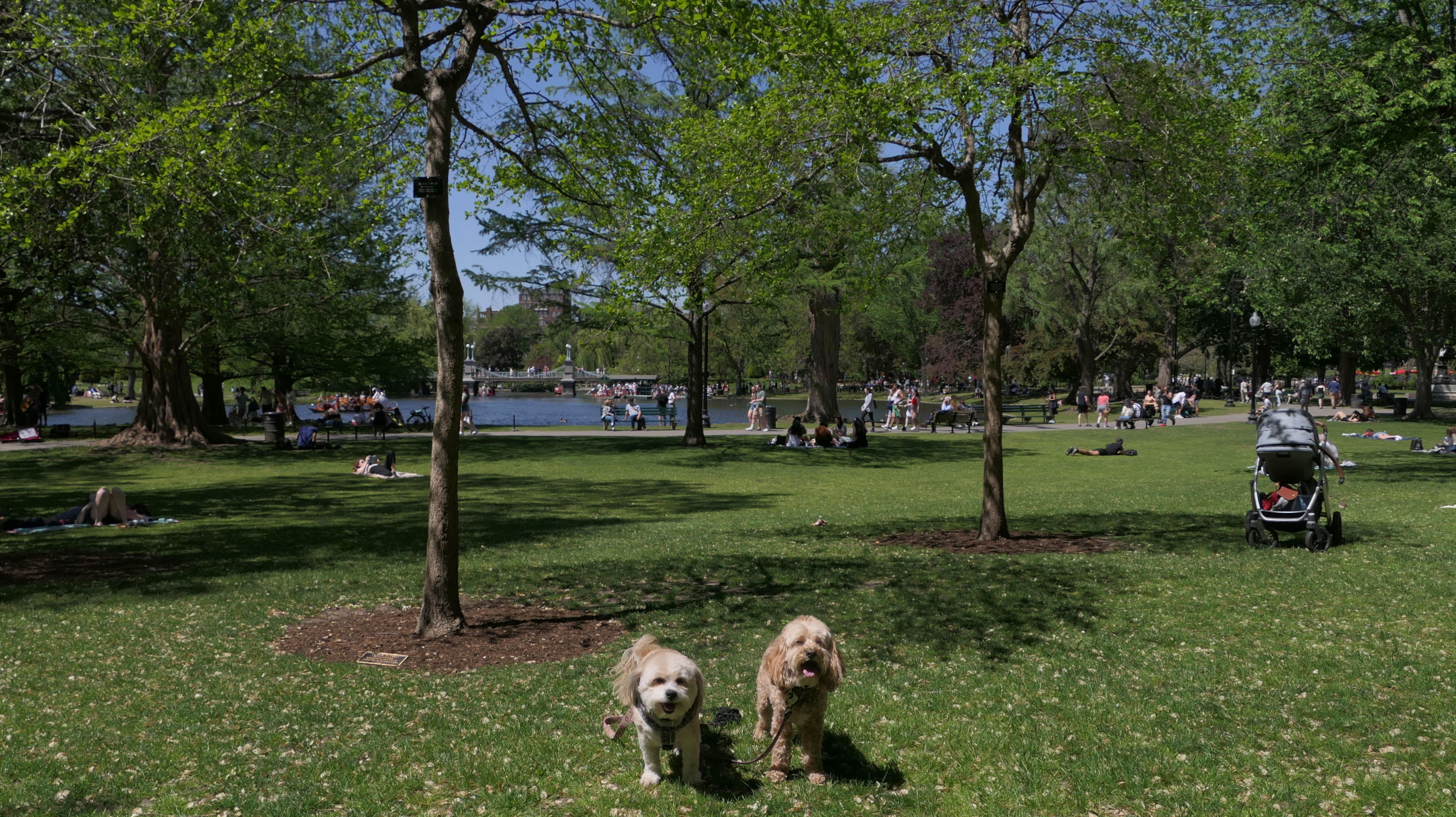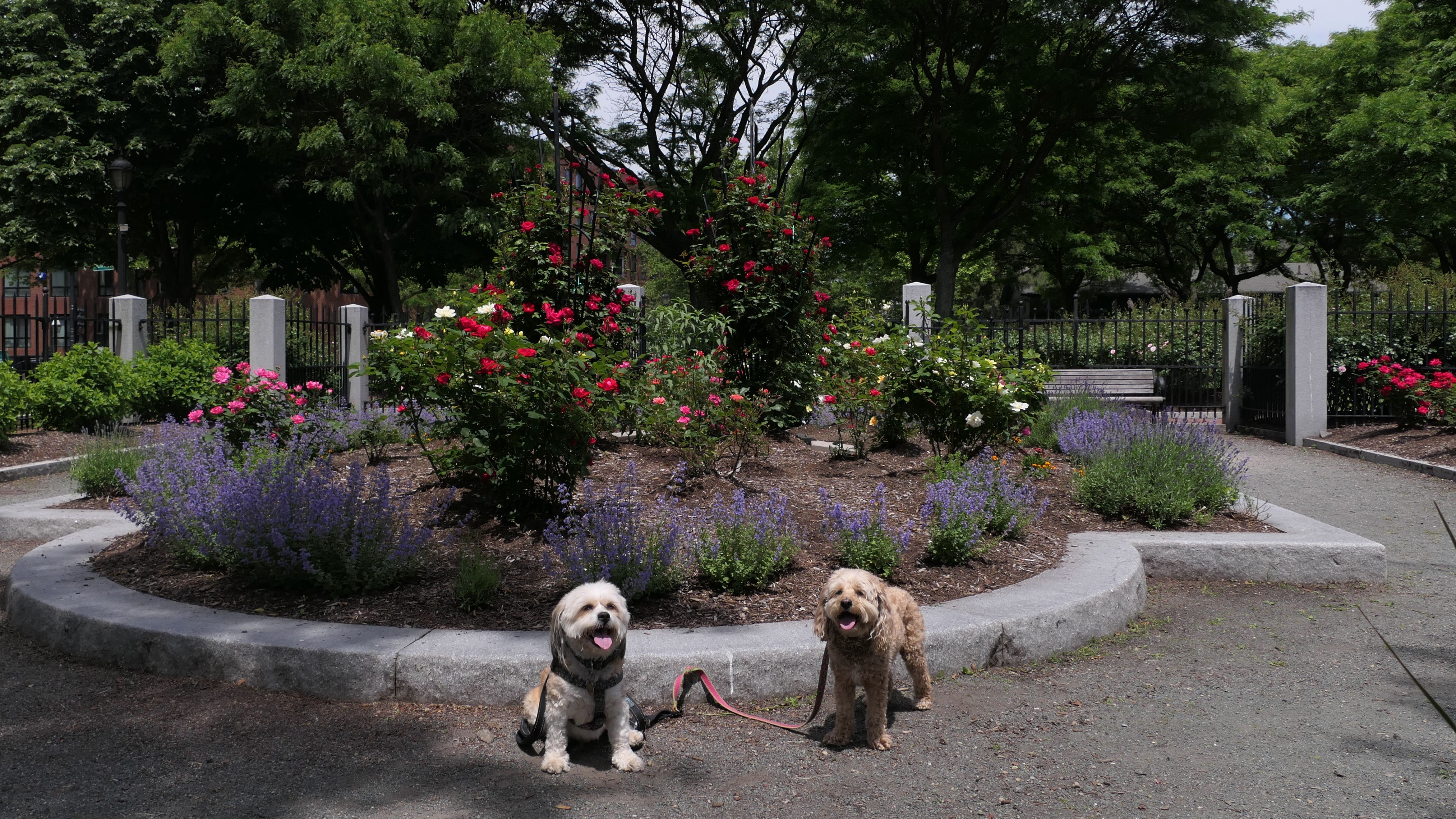This park is a bit larger than the adjacent Boston Public Garden, and more open. There's also an off-leash dog area here, but Mandy and Lexi weren't really into it. There are many interesting statues and structures in this park. It also includes a carousel and the Tadpole Playground. We returned on Memorial Day, a couple weeks later. They had 37,000 flags on display in rememberance of the 37,000 people from Massachusetts that gave their lives for this country.