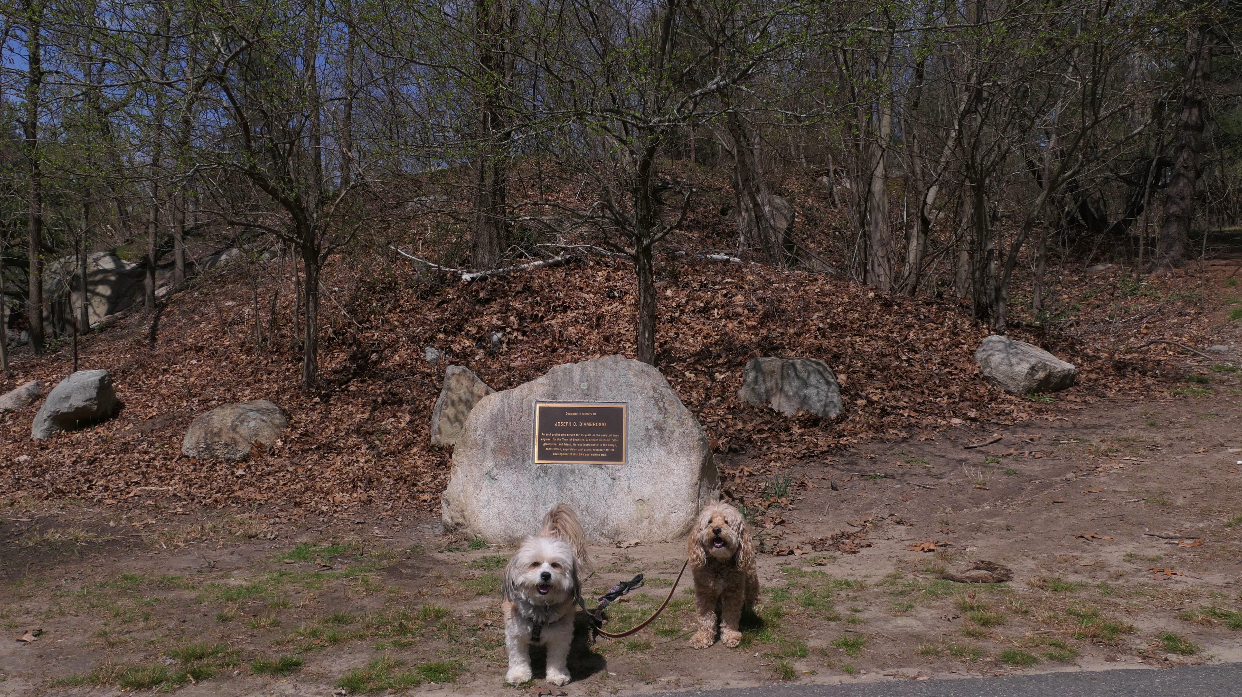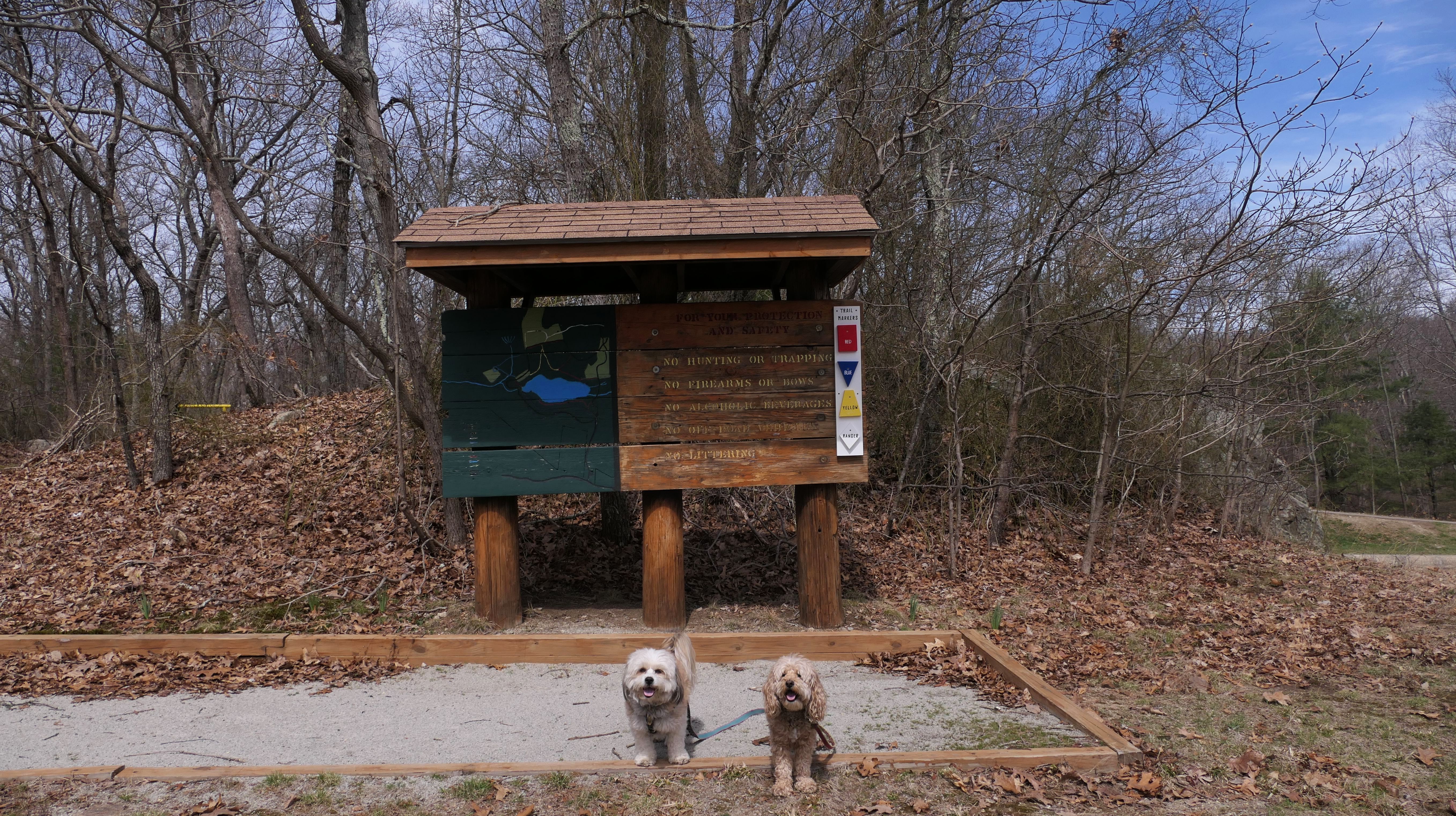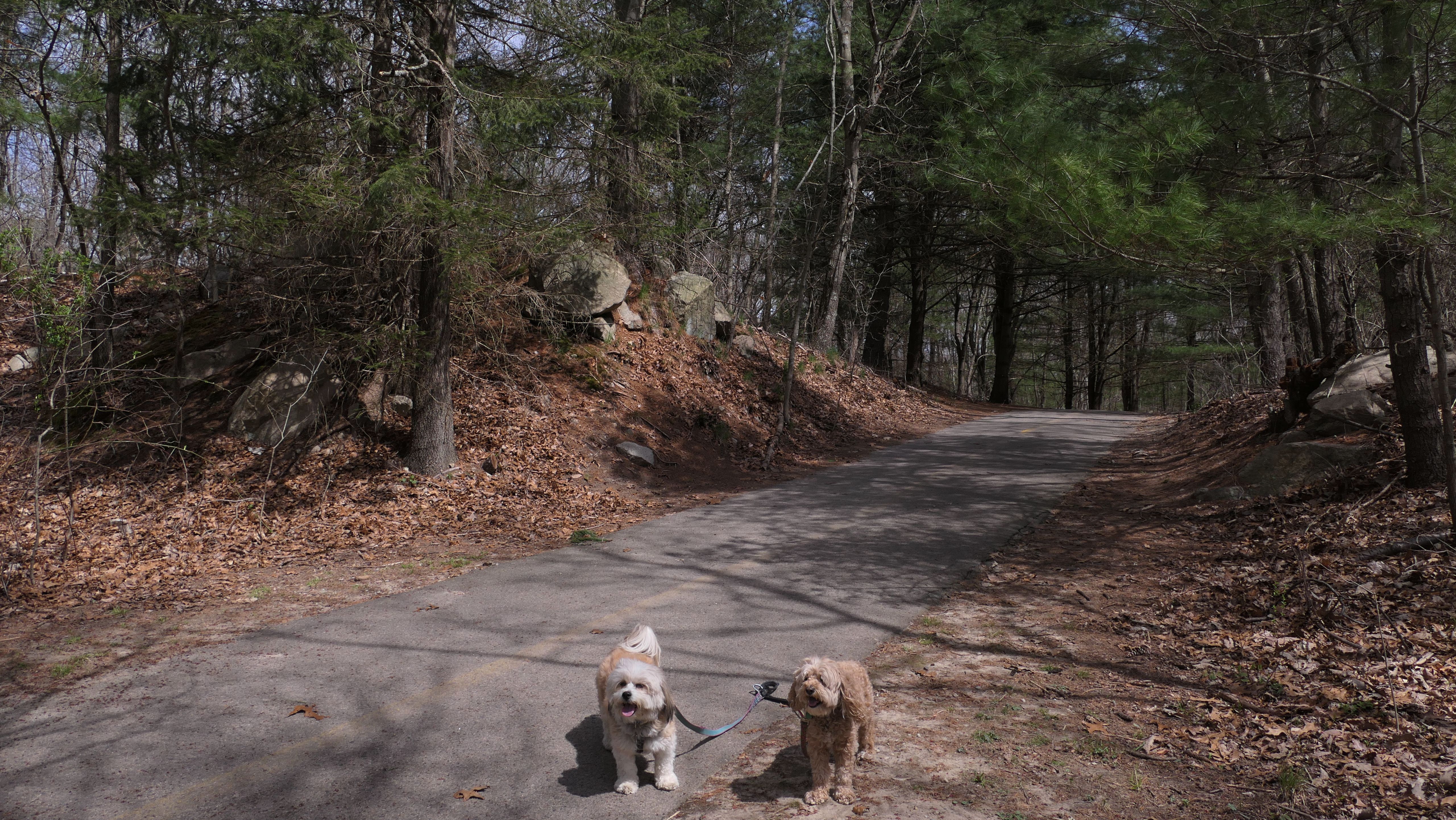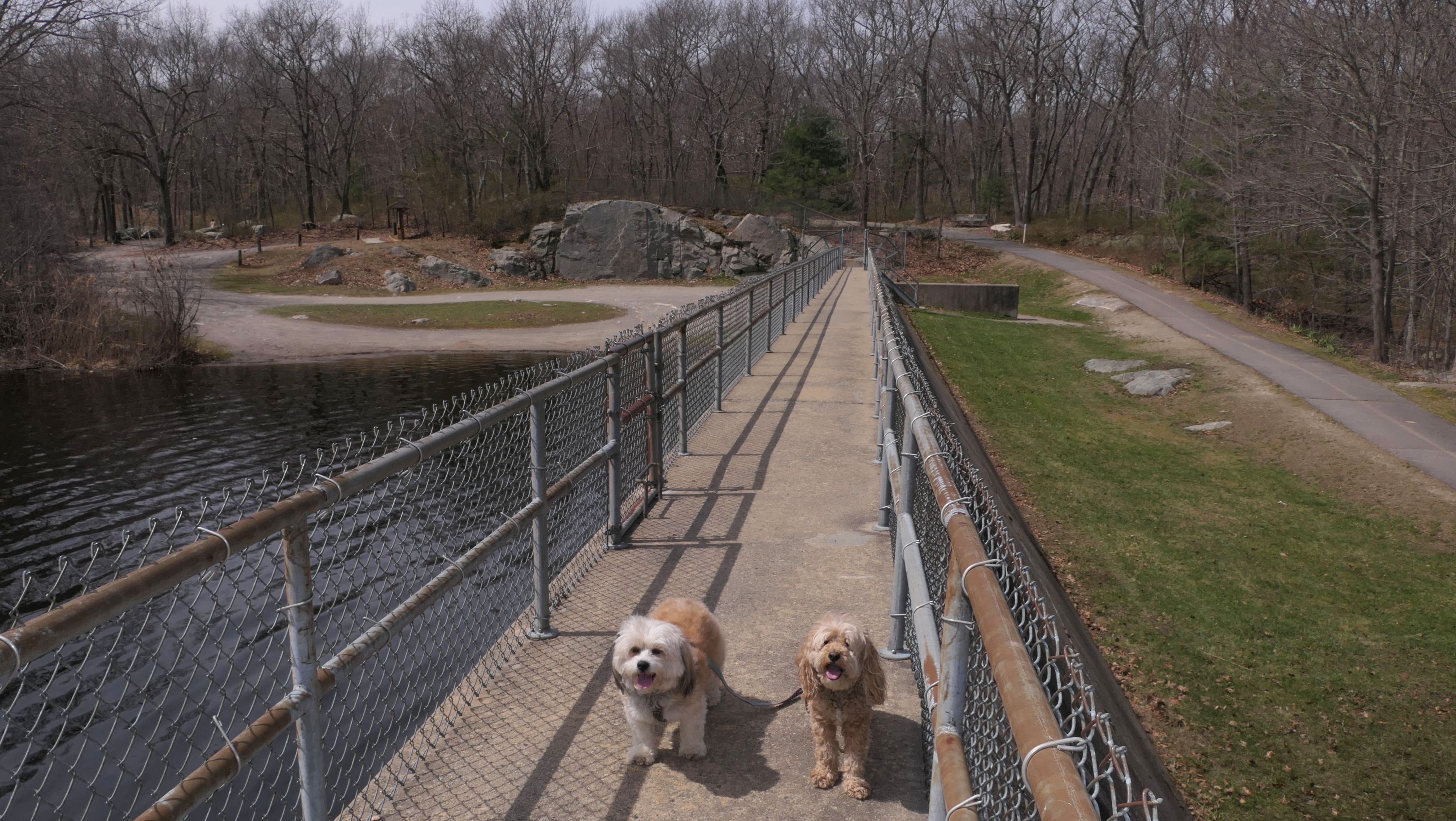 The main feature here is the paved two mile trail that loops the pond. There are two paved connecting trails, one from the main parking area, and another from a secondary parking area in nearby Weymouth. This paved trail is very popular with the dog walkers. We saw may different dogs on this day. The loop trail is unusual as it is "one-way", and has many small hills, especially at the beginning of the trail. There are standard, natural surface side trails that lead closer to the pond, or to the woods, but many of them were muddy or completely flooded, so we stayed on the main trail. We extended our walk an additional mile by walking out and back on the connector trail that leads to the Weymouth parking area. This was an early trip for us. We arrived before noon, as rain was forecasted later in the day. It started to pour about 10 minutes after we finished, so it was a good thing we went early!