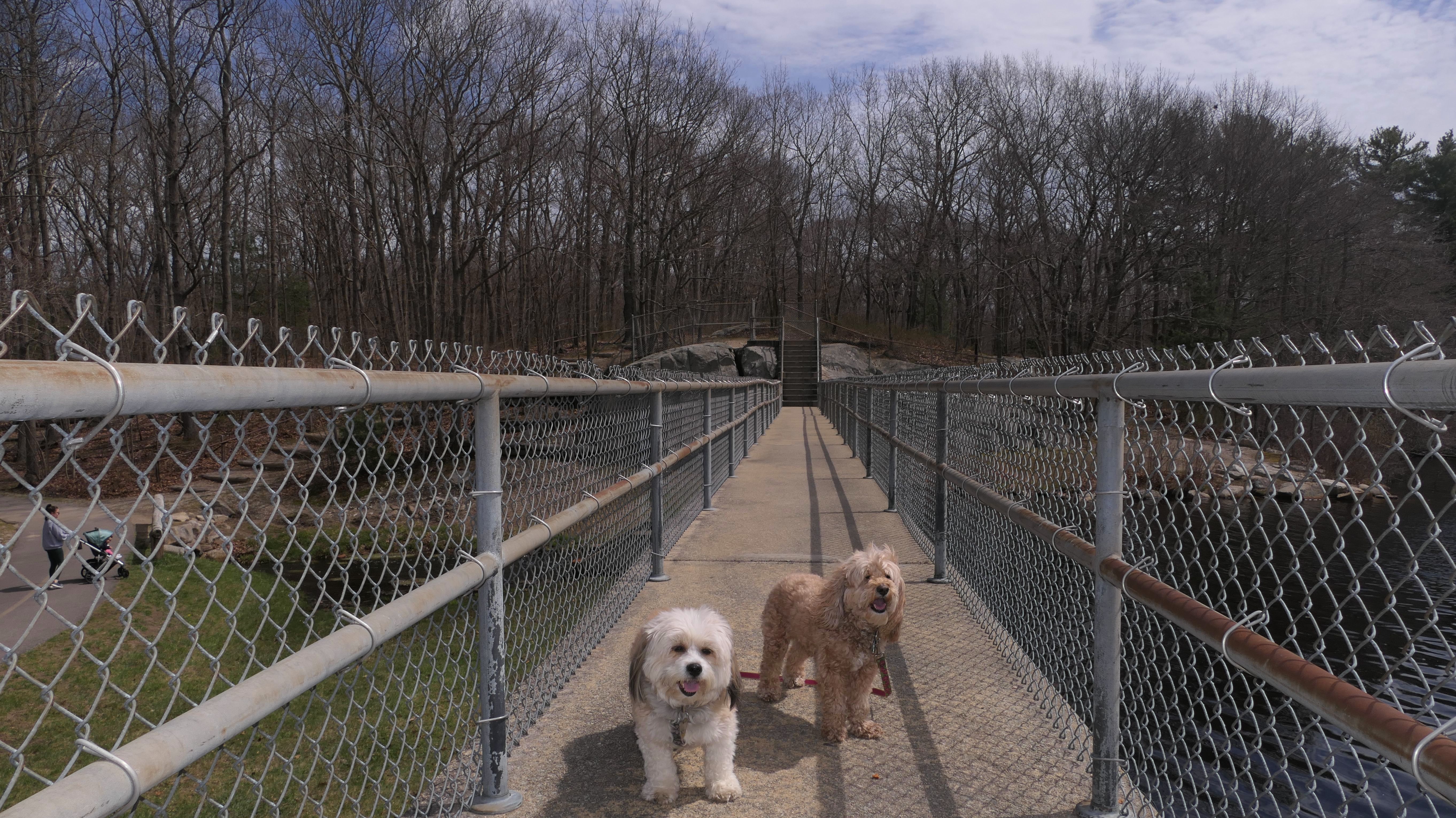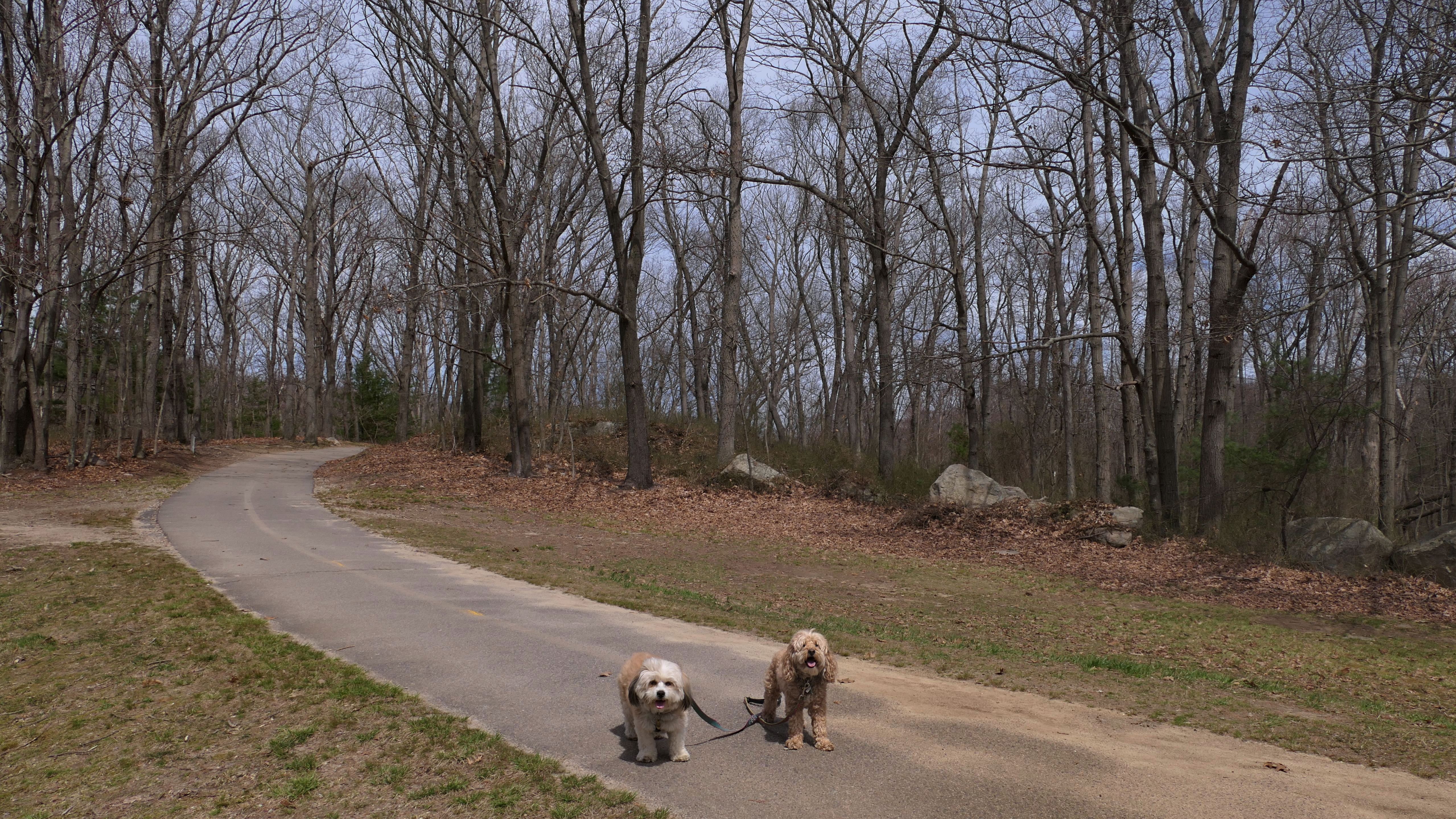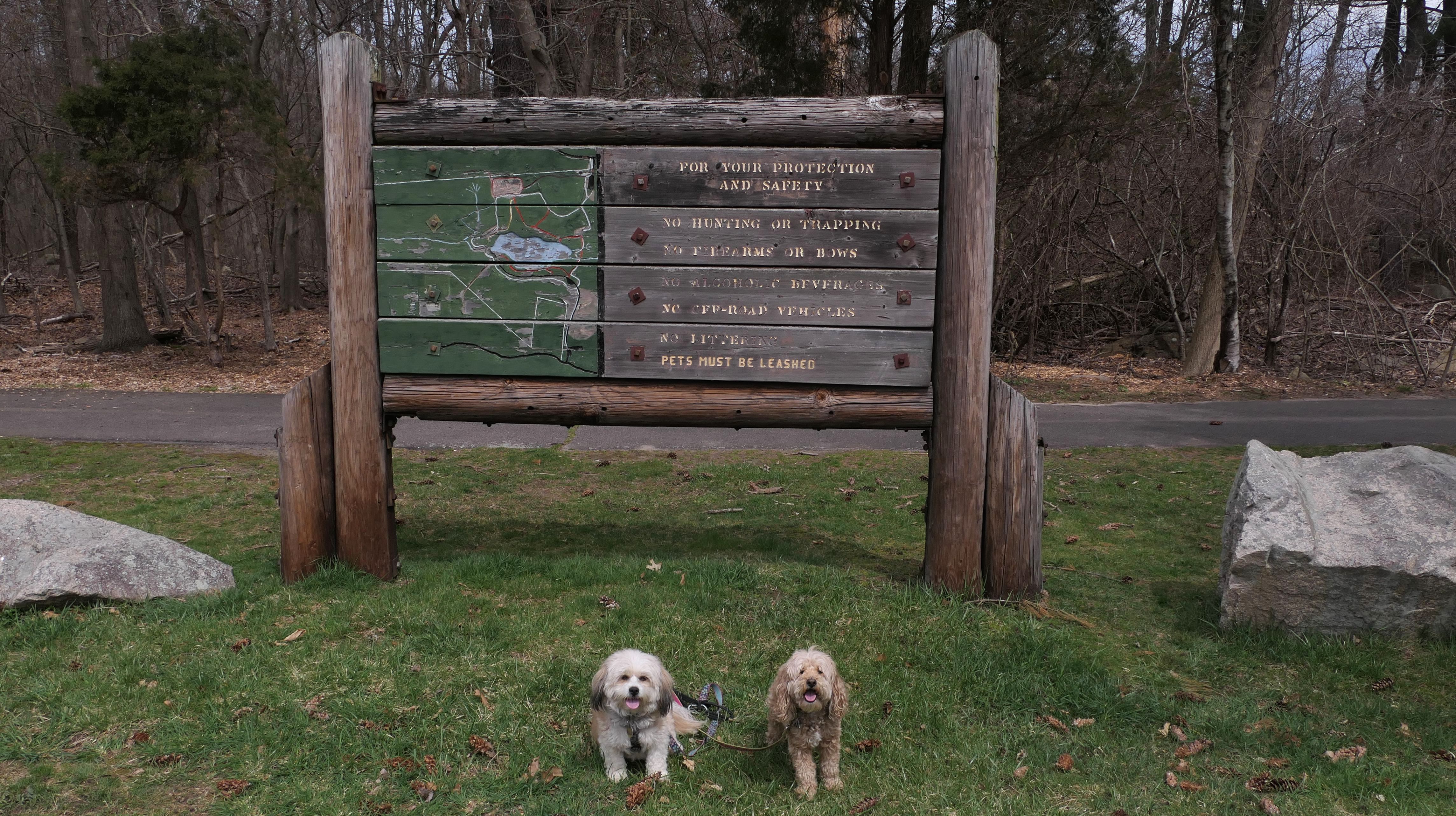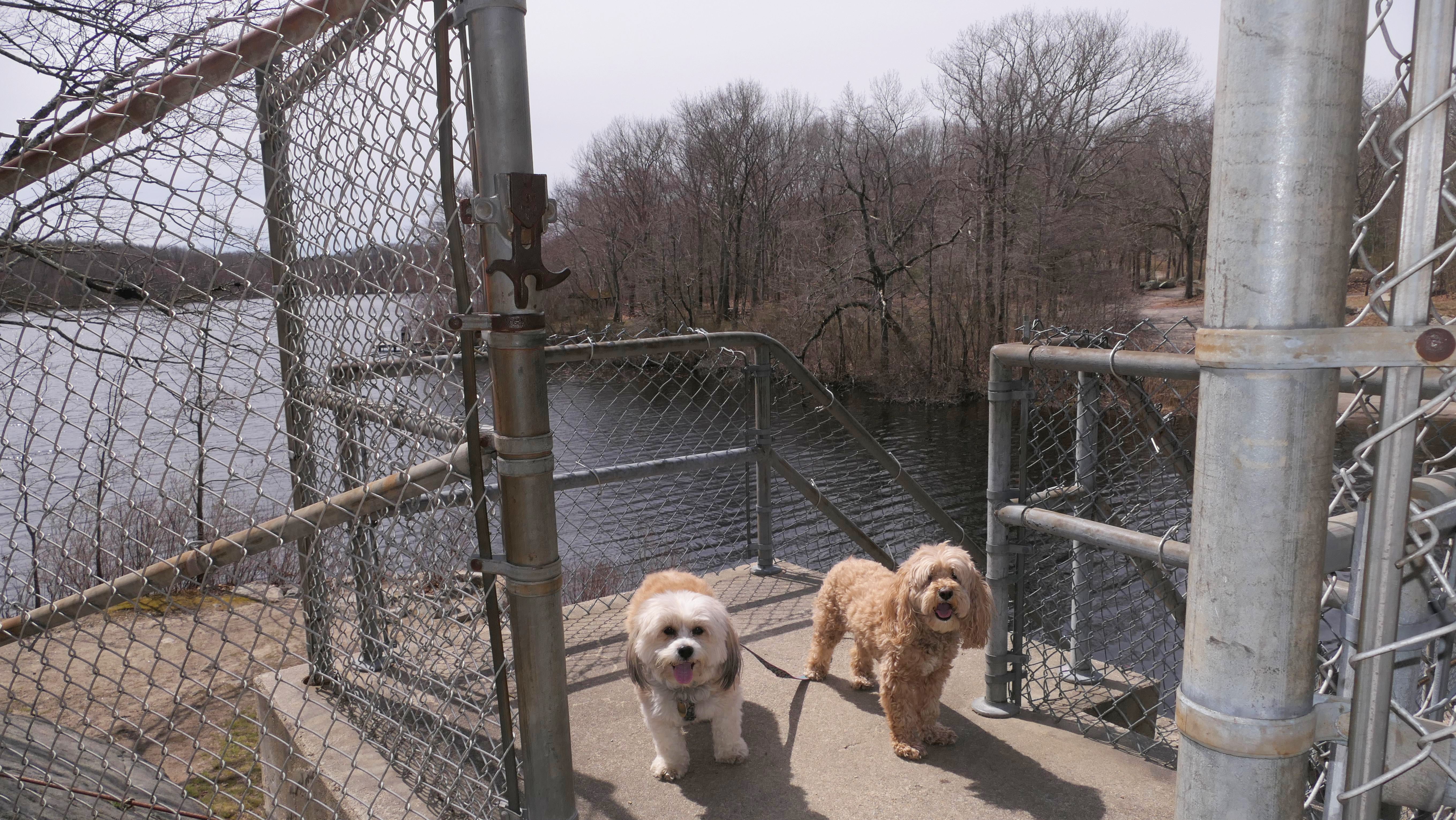 The main feature here is the paved two mile trail that loops the pond. There are two paved connecting trails, one from the main parking area, and another from a secondary parking area in nearby Weymouth. This paved trail is very popular with the dog walkers. We saw may different dogs on this day. The loop trail is unusual as it is "one-way", and has many small hills, especially at the beginning of the trail. There are standard, natural surface side trails that lead closer to the pond, or to the woods, but many of them were muddy or completely flooded, so we stayed on the main trail. We extended our walk an additional mile by walking out and back on the connector trail that leads to the Weymouth parking area. This was an early trip for us. We arrived before noon, as rain was forecasted later in the day. It started to pour about 10 minutes after we finished, so it was a good thing we went early!