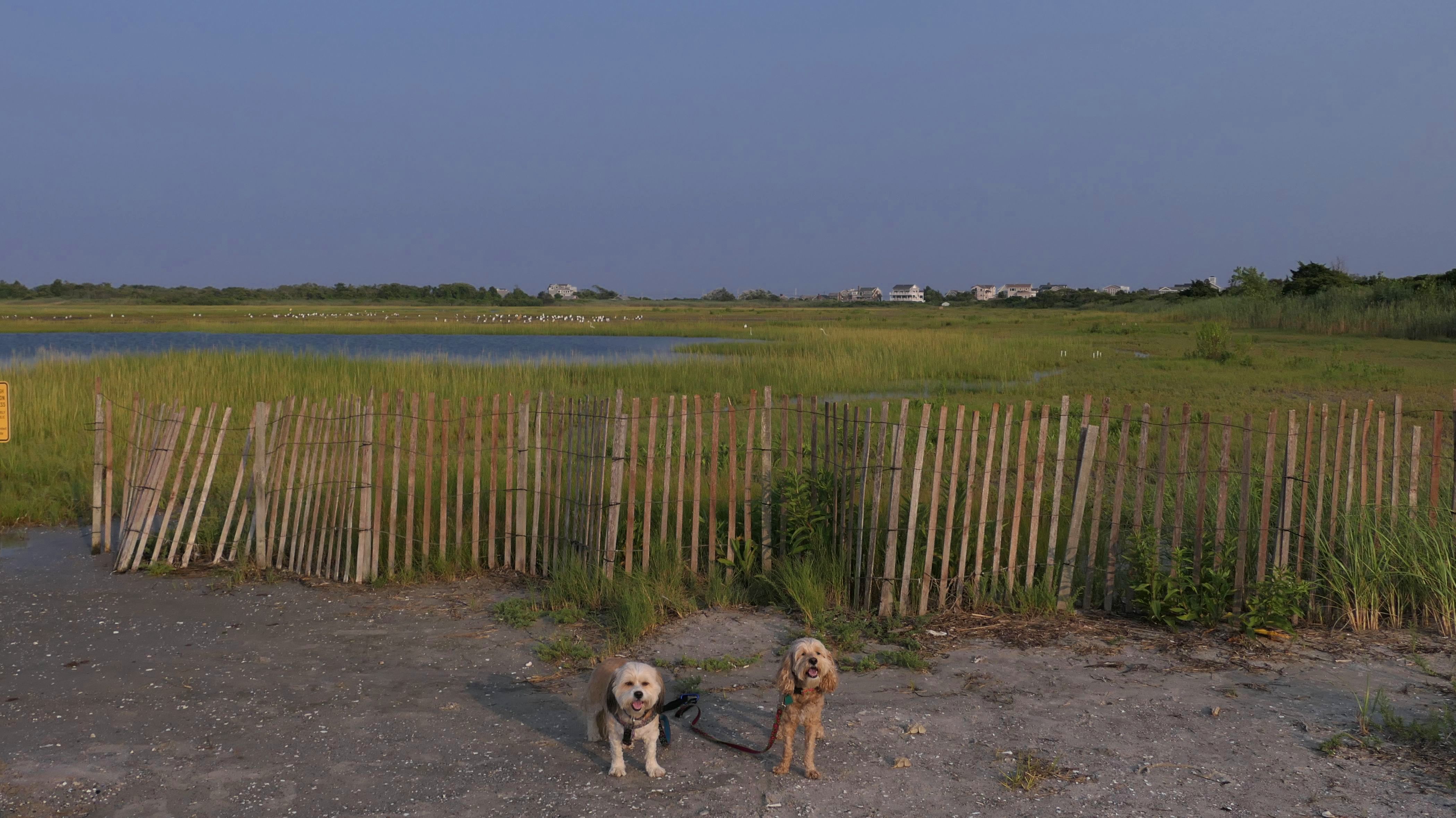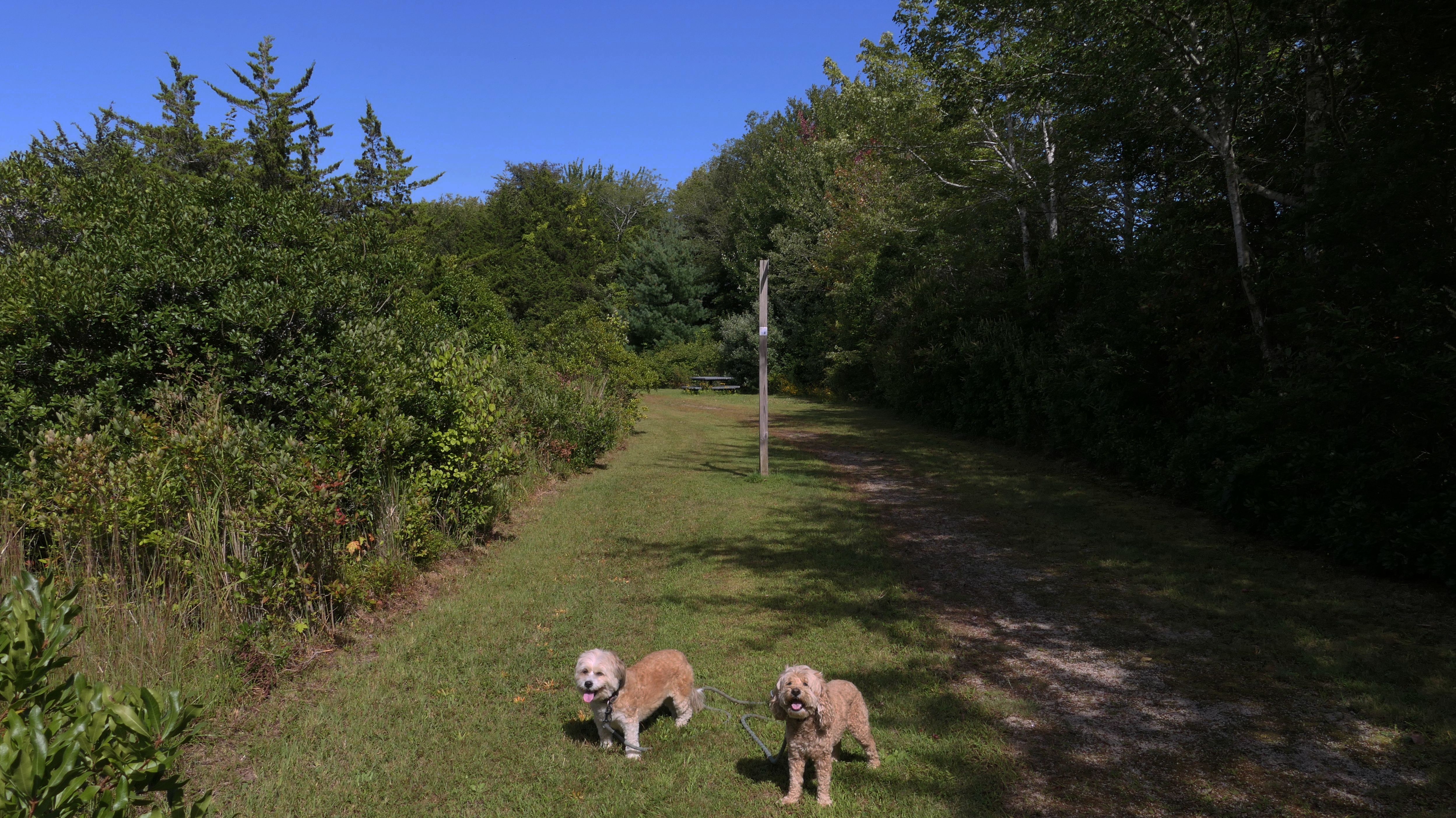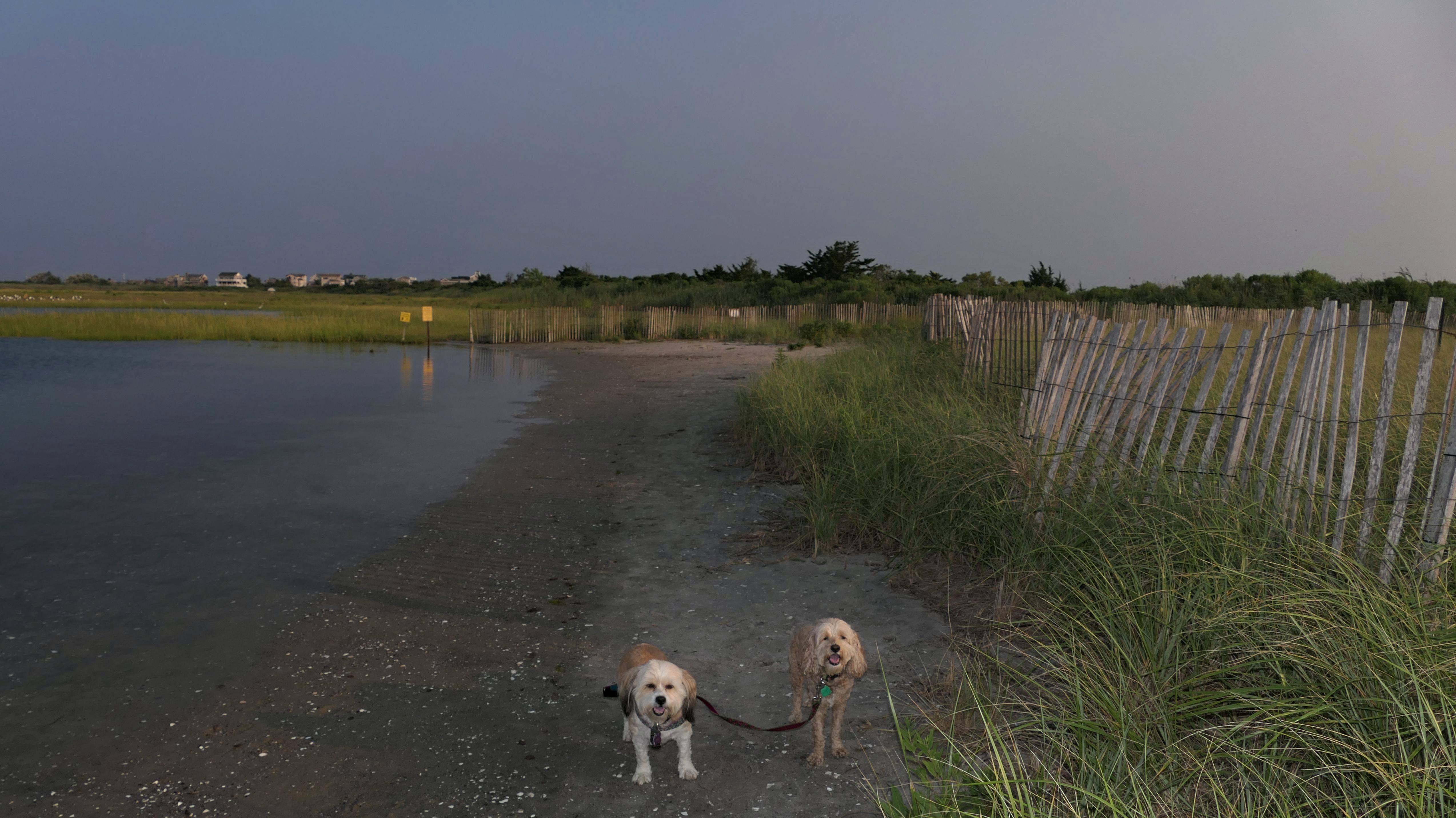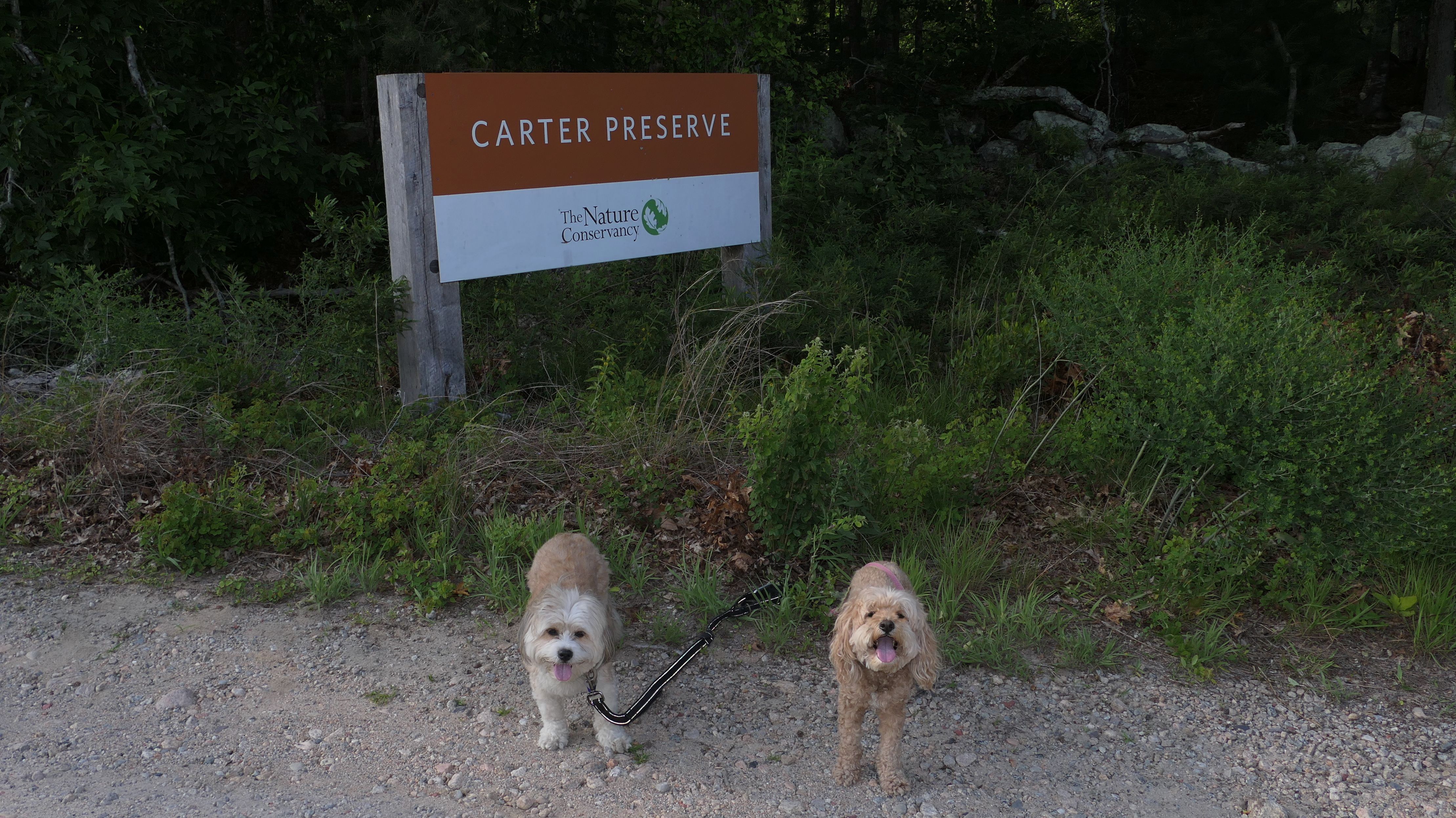 This is a fishing area and boat launch at Quonochontaug Breachway and Pond. Google Maps shows a hiking area here, but I don't think it's there anymore. There is a section near the pond that is closed for salt marsh restoration, and I think a trail used to be there. Even though there wasn't a cloud in the sky, it was super hazy from Canadian wildfire smoke. That and the lack of any real trail made this a disappointing trip. There were a few spots where the dogs could get in the water, so they enjoyed it regardless. The parking area is about a third of a mile down a dirt road from West Beach Road. We wound up walking about a mile down the dirt road and onto West Beach Road, before turning around and heading back. I was hoping that maybe West Beach would be accesible, but no luck there either. It seems to be completely private. I shouldn't complain, the awesome Blue Shutters Beach is right around the corner, and dogs are allowed in the summer after five there. It's not like there's no ocean access at all! At any rate, the dogs seemed to enjoy the trip, so I guess that is what counts!