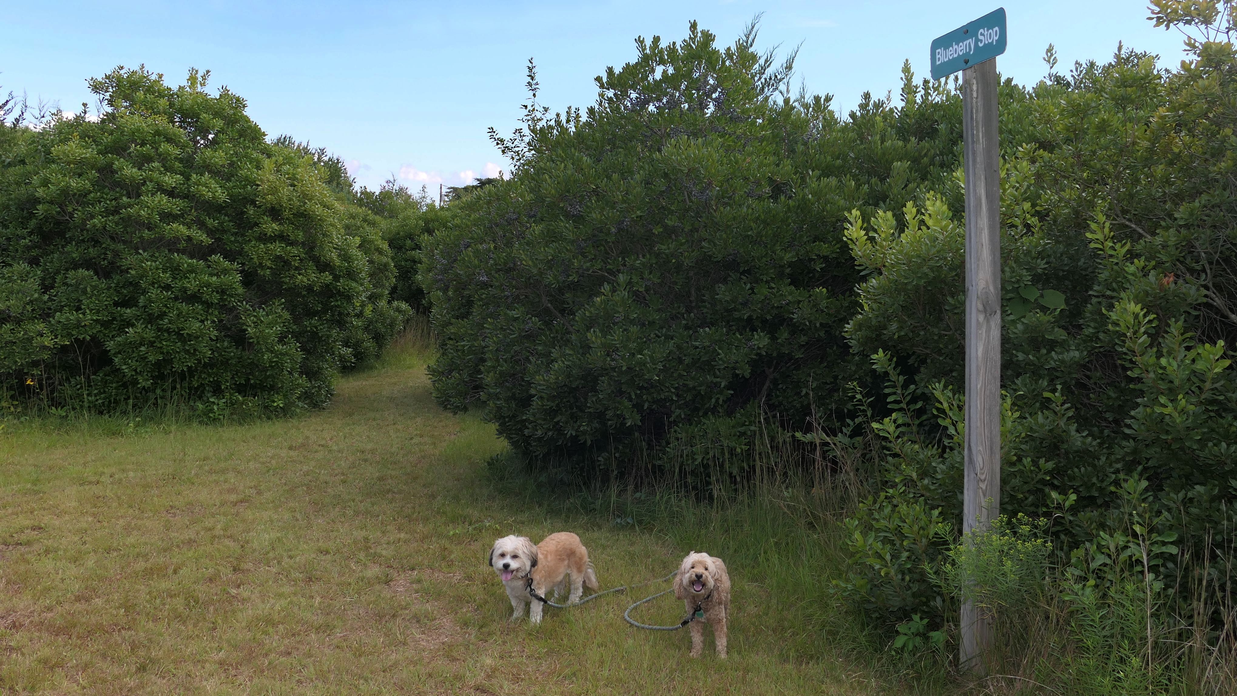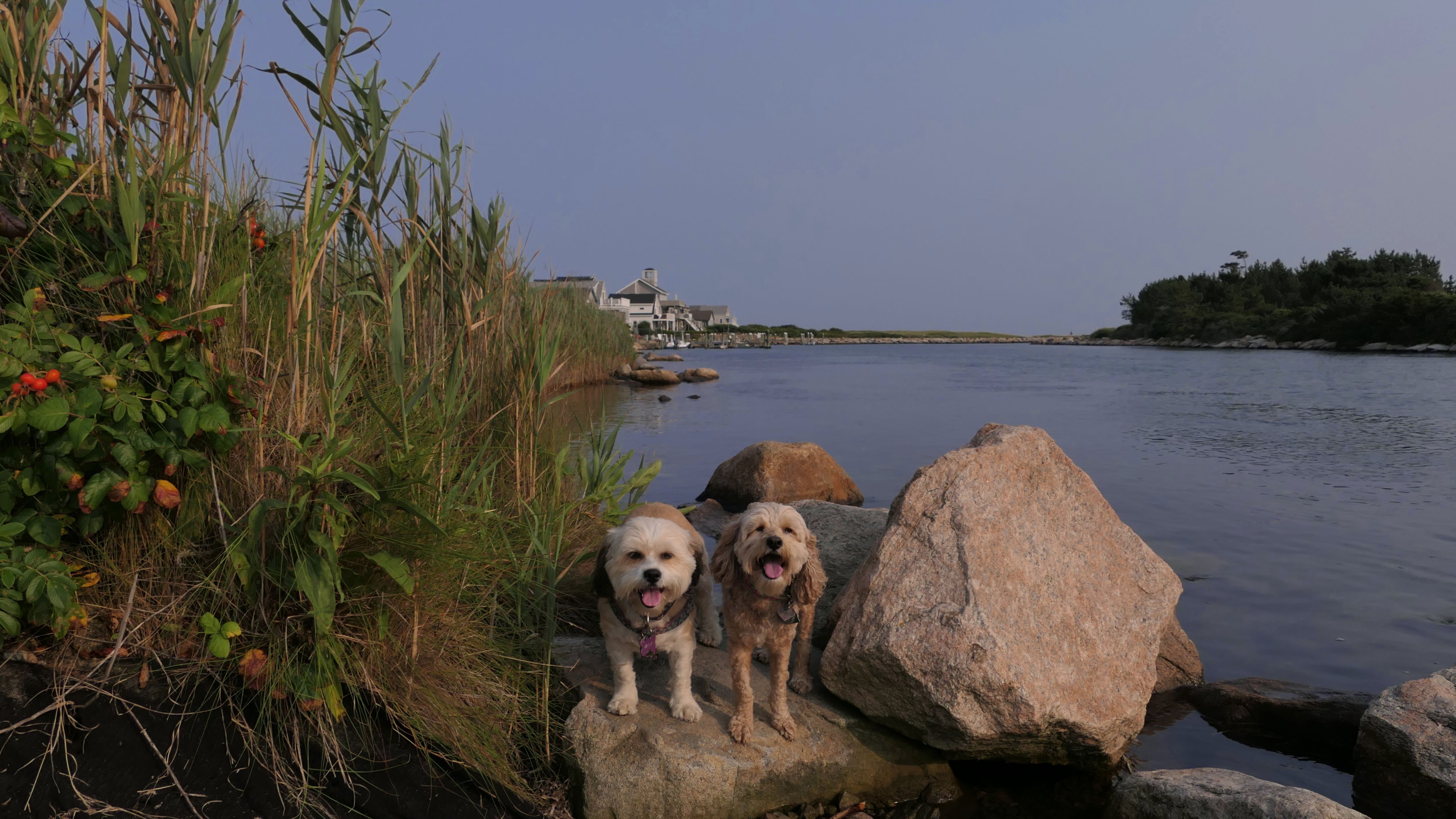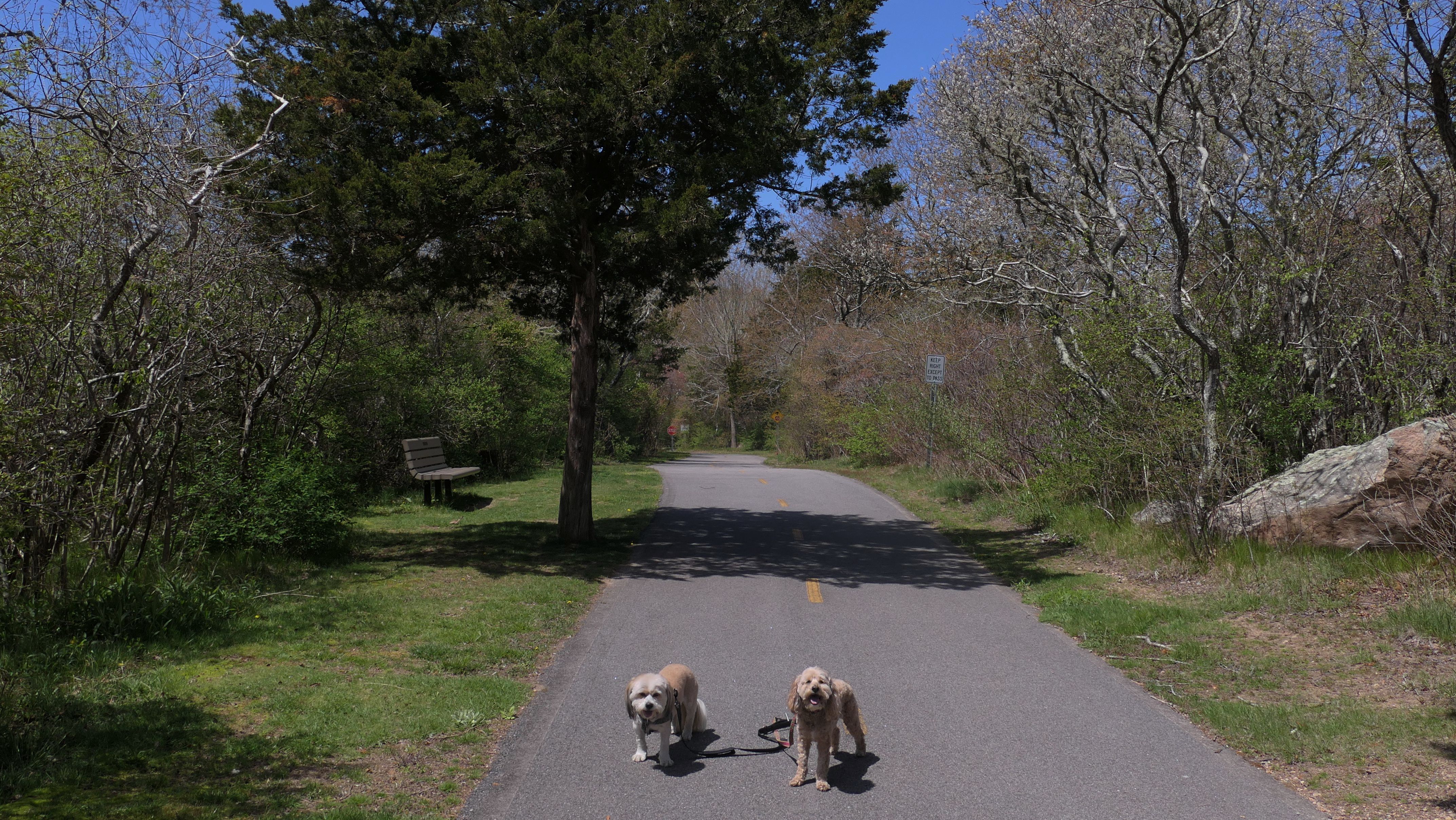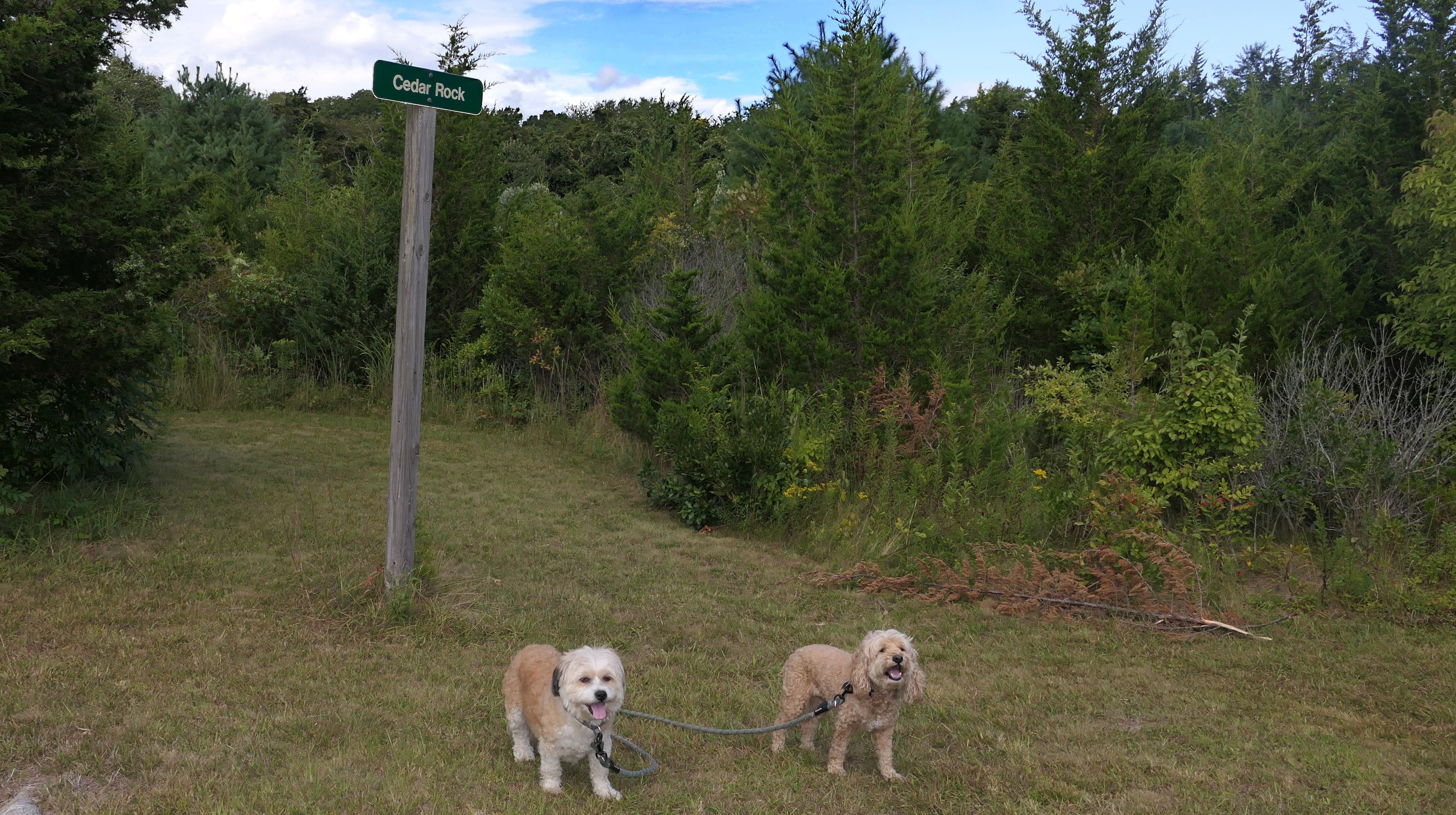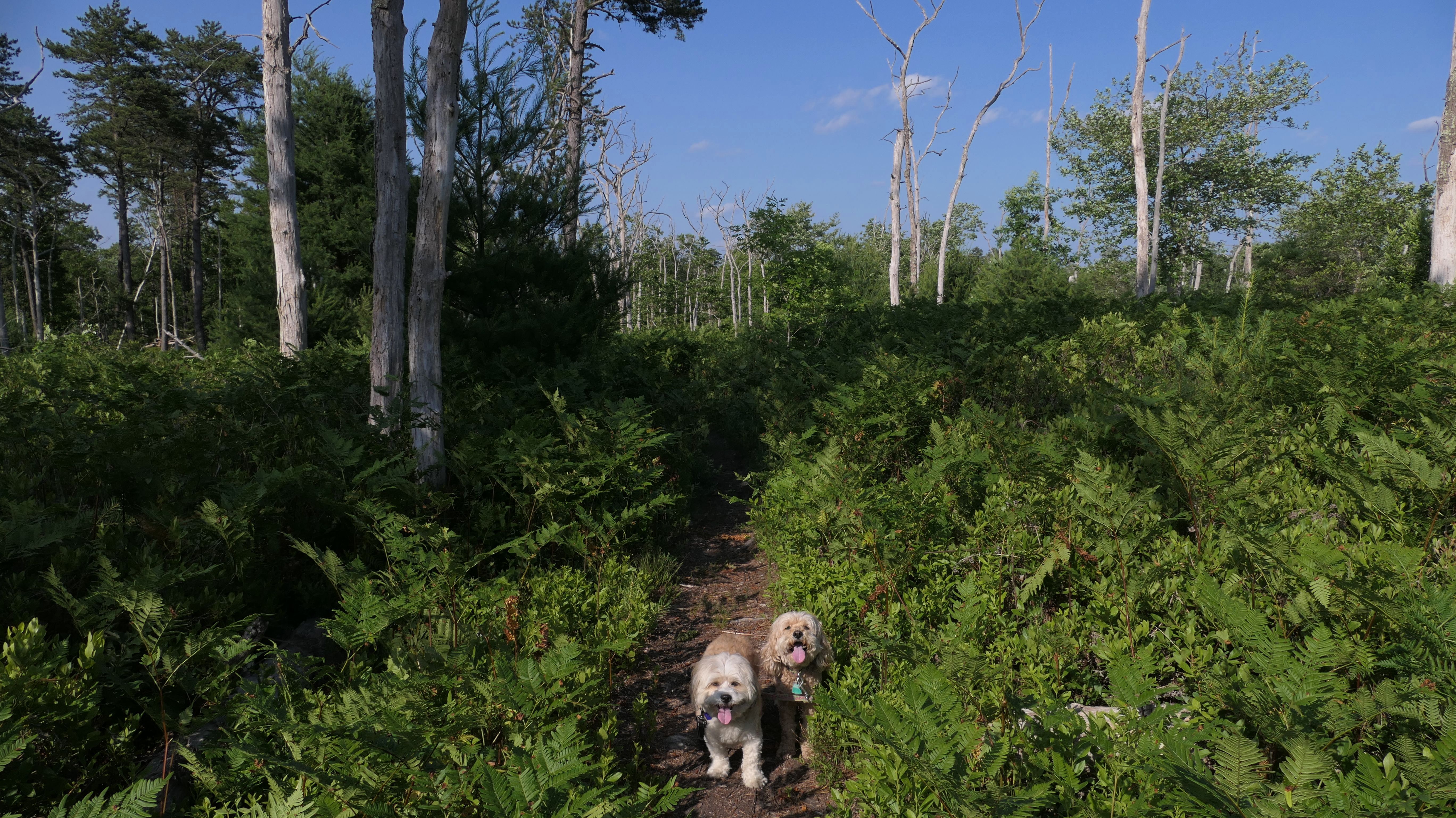 This is a fishing area and boat launch at Quonochontaug Breachway and Pond. Google Maps shows a hiking area here, but I don't think it's there anymore. There is a section near the pond that is closed for salt marsh restoration, and I think a trail used to be there. Even though there wasn't a cloud in the sky, it was super hazy from Canadian wildfire smoke. That and the lack of any real trail made this a disappointing trip. There were a few spots where the dogs could get in the water, so they enjoyed it regardless. The parking area is about a third of a mile down a dirt road from West Beach Road. We wound up walking about a mile down the dirt road and onto West Beach Road, before turning around and heading back. I was hoping that maybe West Beach would be accesible, but no luck there either. It seems to be completely private. I shouldn't complain, the awesome Blue Shutters Beach is right around the corner, and dogs are allowed in the summer after five there. It's not like there's no ocean access at all! At any rate, the dogs seemed to enjoy the trip, so I guess that is what counts!