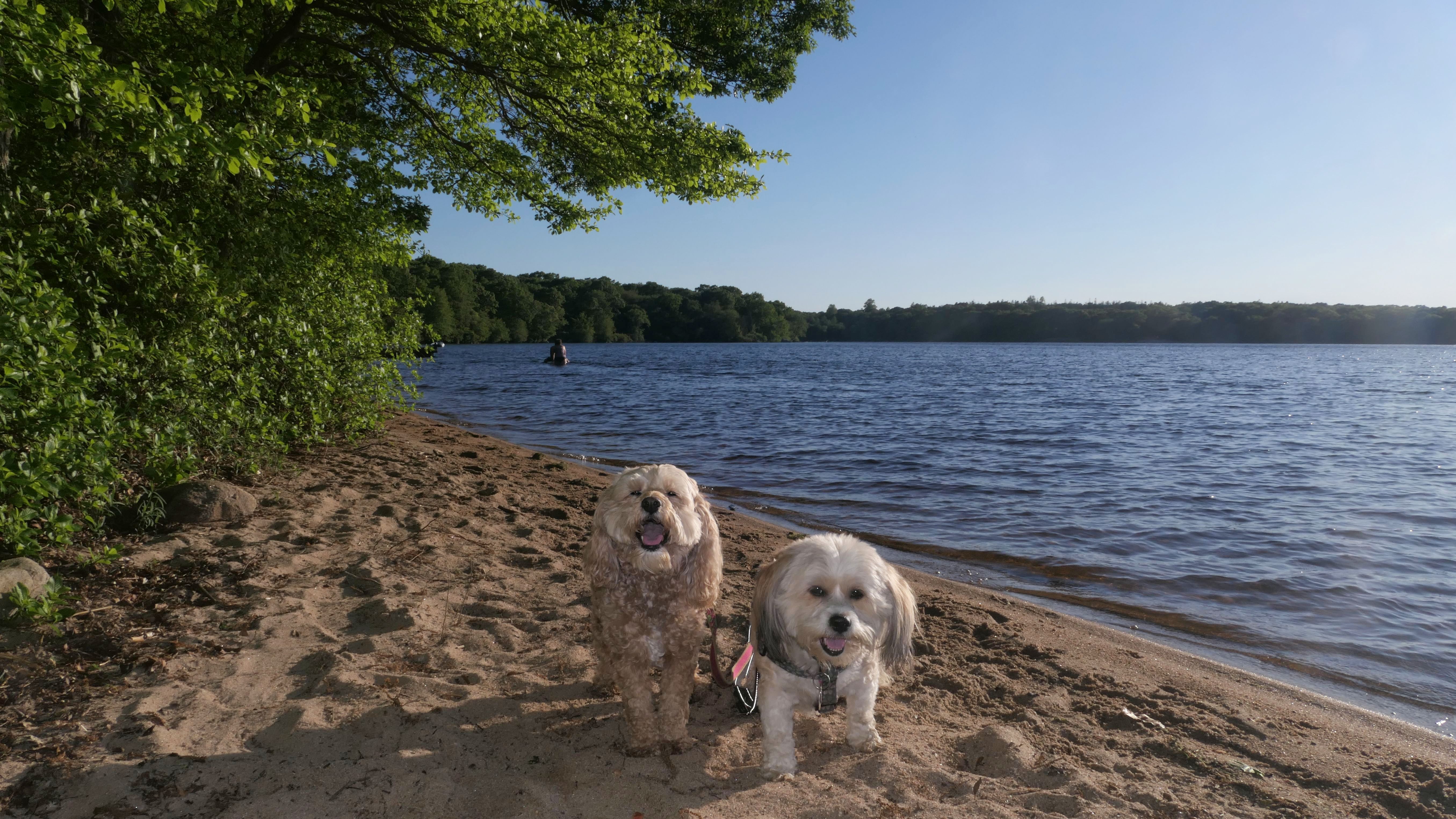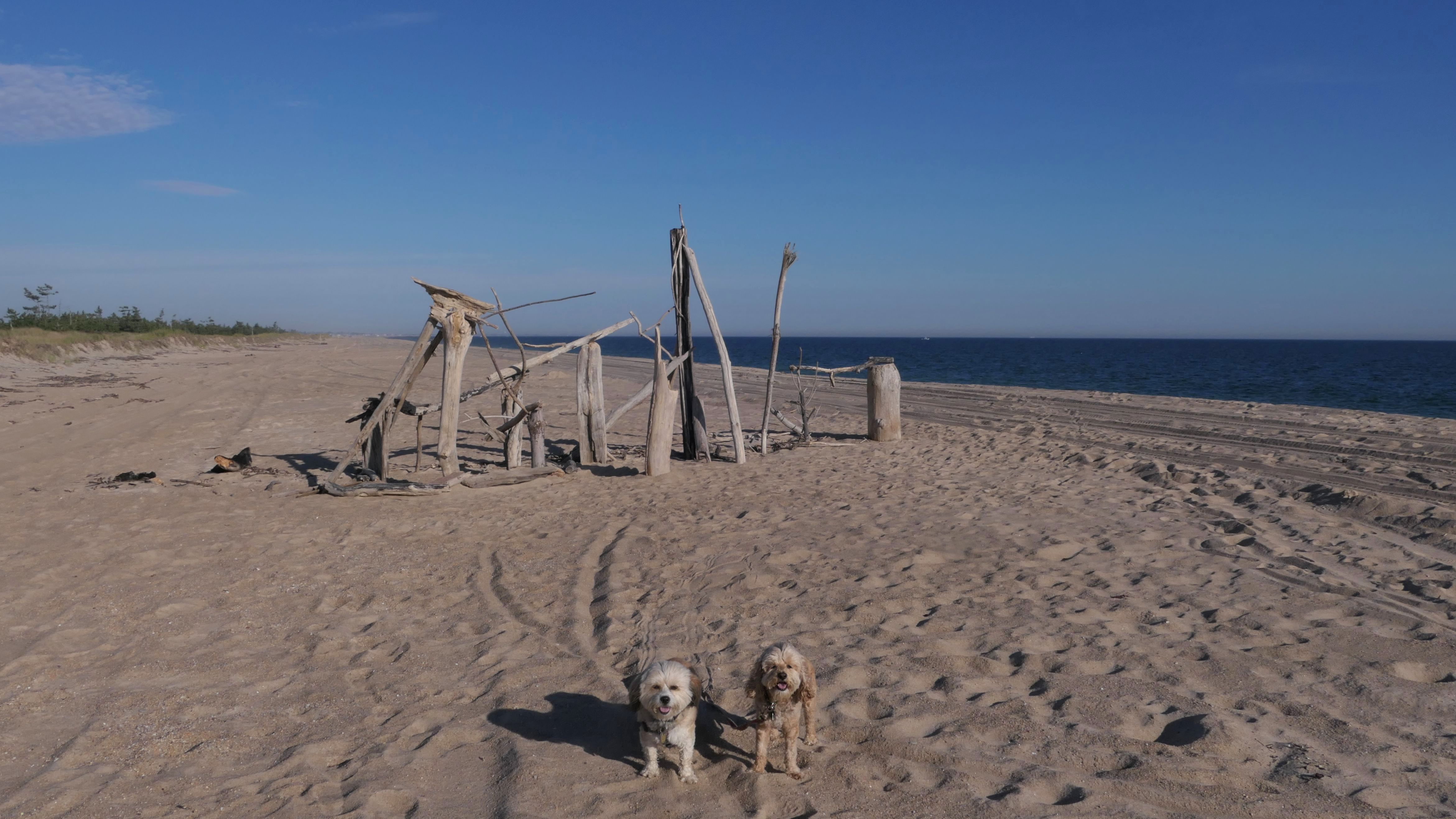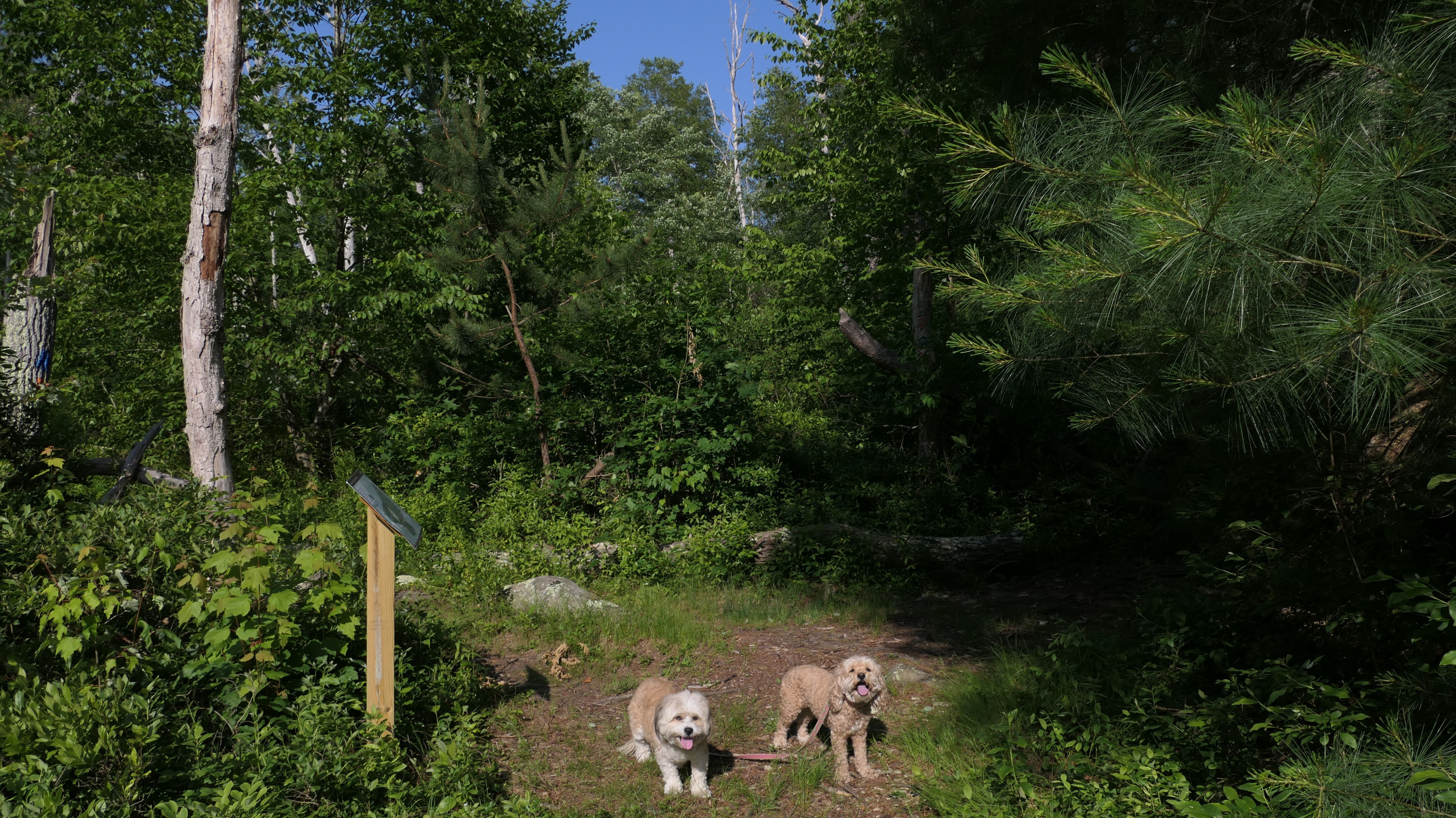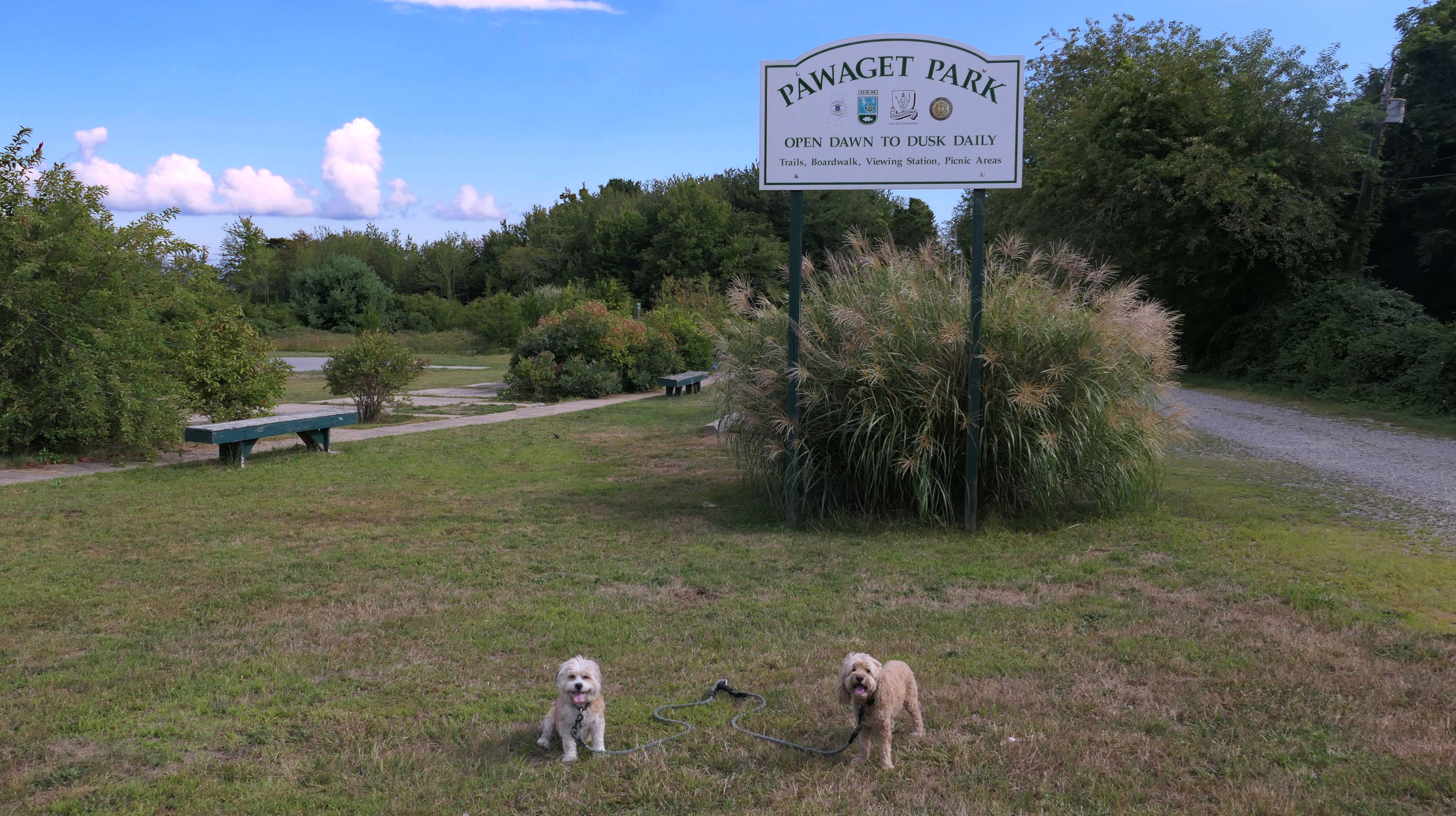 This is a fishing area and boat launch at Quonochontaug Breachway and Pond. Google Maps shows a hiking area here, but I don't think it's there anymore. There is a section near the pond that is closed for salt marsh restoration, and I think a trail used to be there. Even though there wasn't a cloud in the sky, it was super hazy from Canadian wildfire smoke. That and the lack of any real trail made this a disappointing trip. There were a few spots where the dogs could get in the water, so they enjoyed it regardless. The parking area is about a third of a mile down a dirt road from West Beach Road. We wound up walking about a mile down the dirt road and onto West Beach Road, before turning around and heading back. I was hoping that maybe West Beach would be accesible, but no luck there either. It seems to be completely private. I shouldn't complain, the awesome Blue Shutters Beach is right around the corner, and dogs are allowed in the summer after five there. It's not like there's no ocean access at all! At any rate, the dogs seemed to enjoy the trip, so I guess that is what counts!