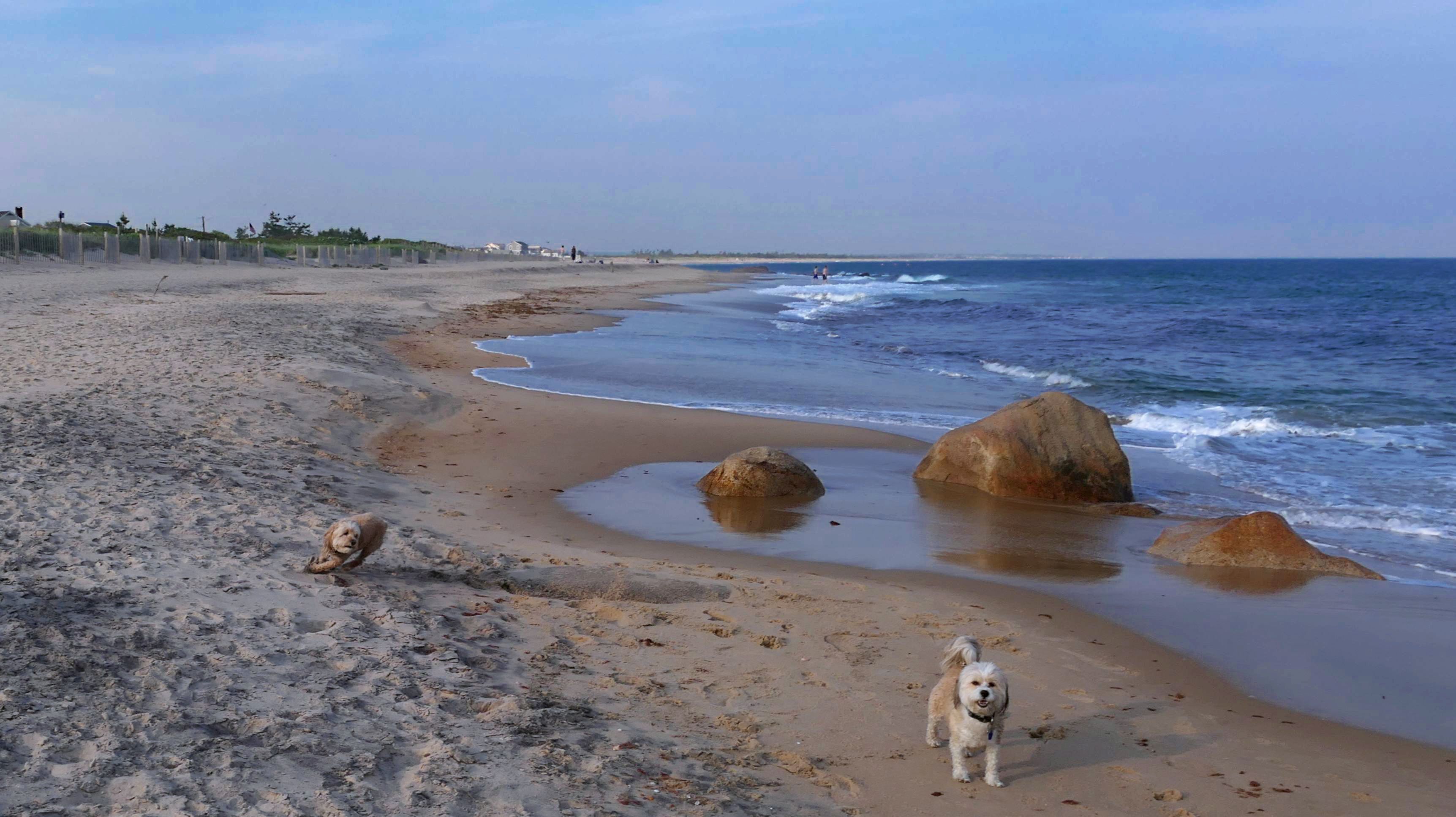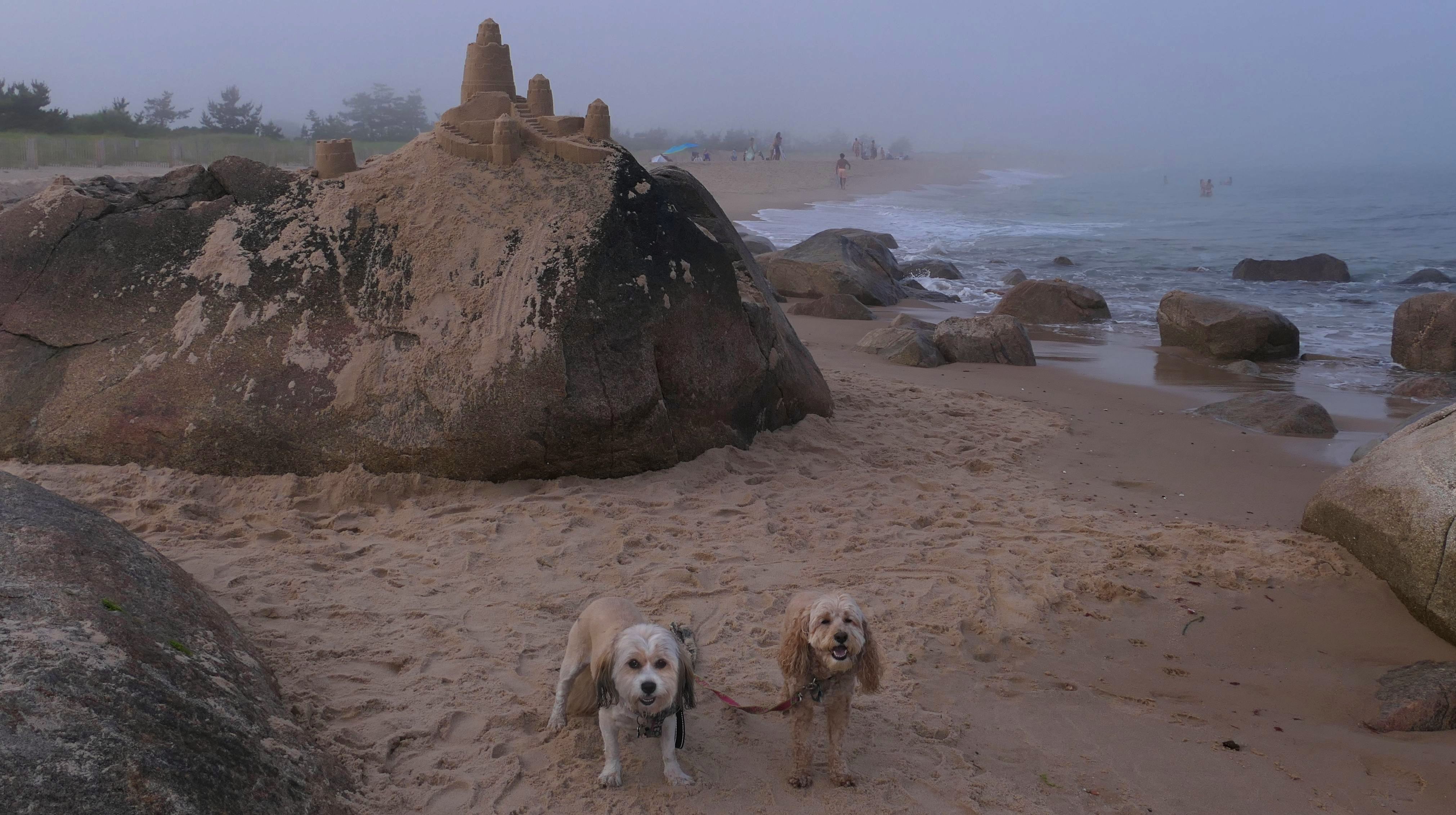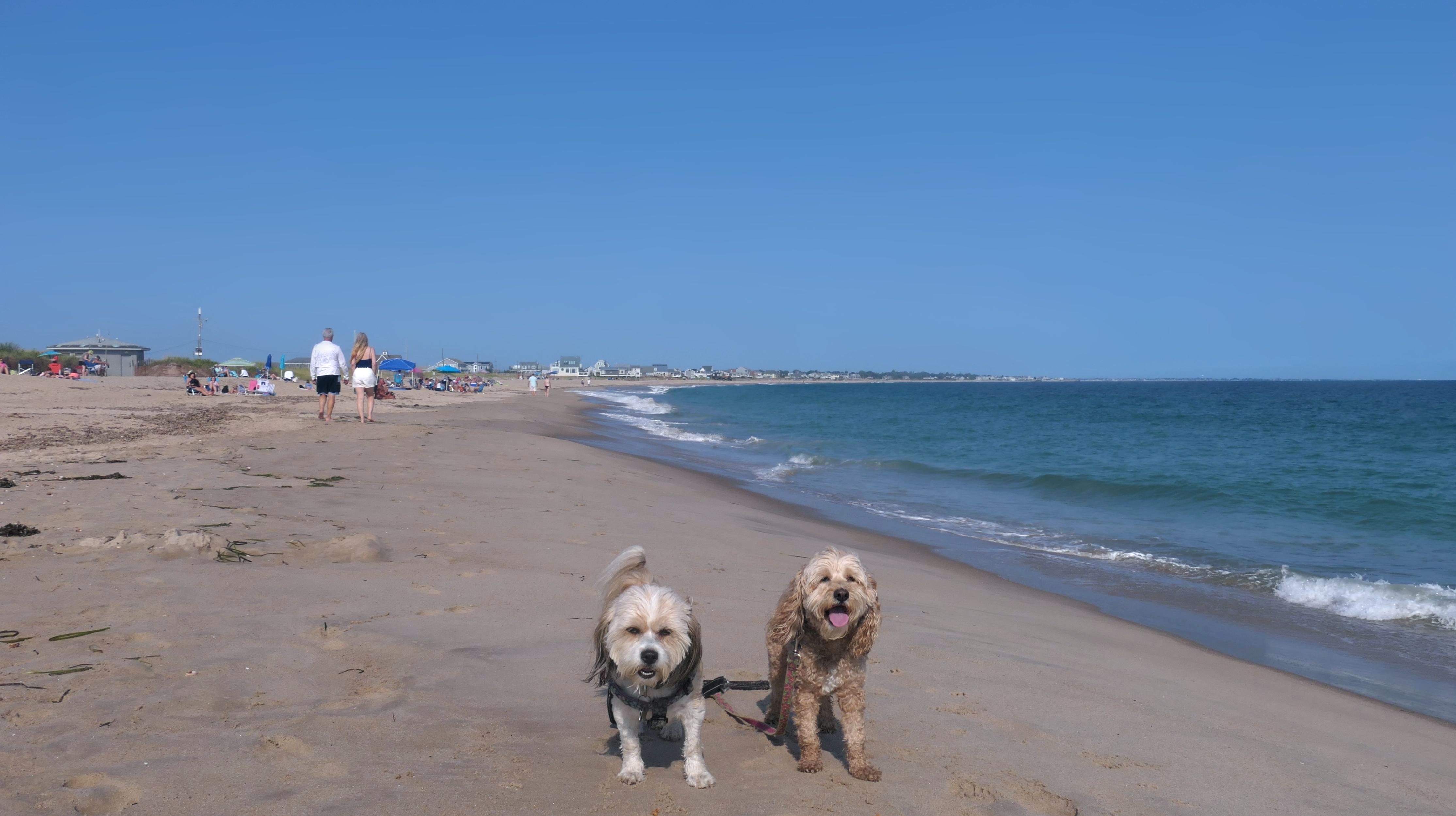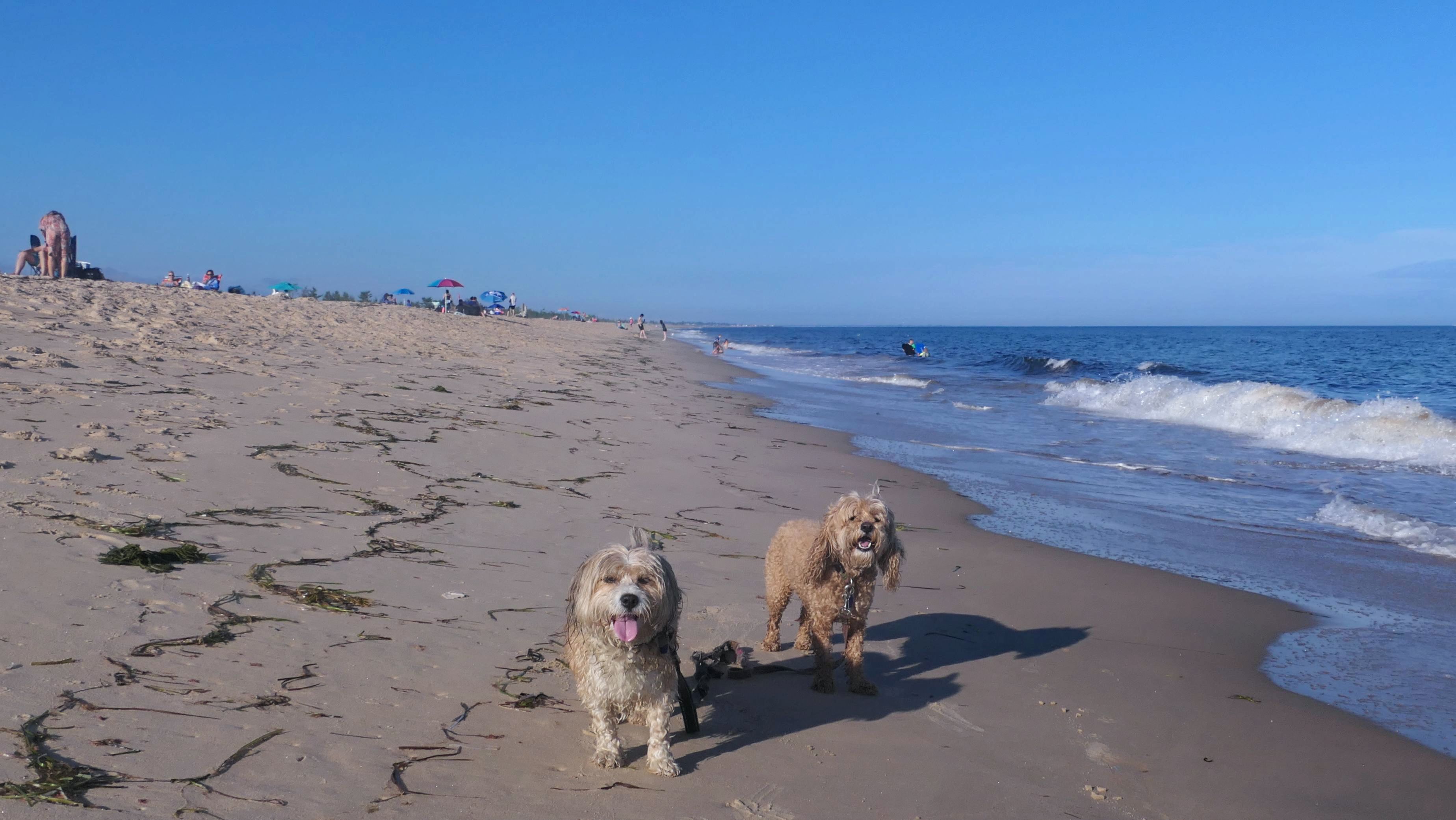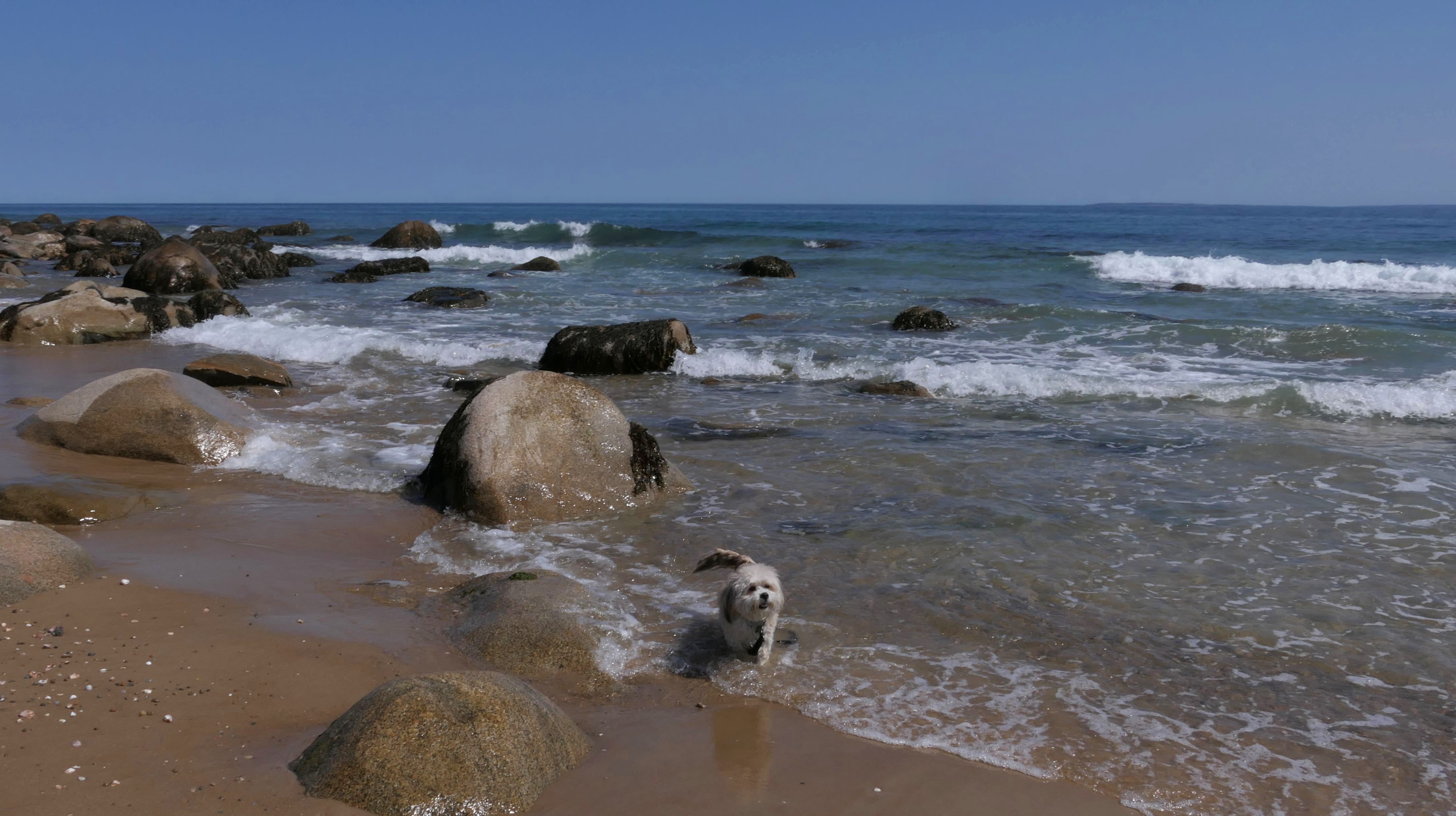 This is Day 2 of our late June heat wave. I mentioned on the write-up for our previous trip that if we go on adventures during this hot spell, it would probably be dog-friendly beaches in Rhode Island, where it's a little bit cooler. Dogs are allowed here after 5PM, and we arrived around 5:30. We went for a short walk, wading through the edge of the waves on a hazy and hot day.