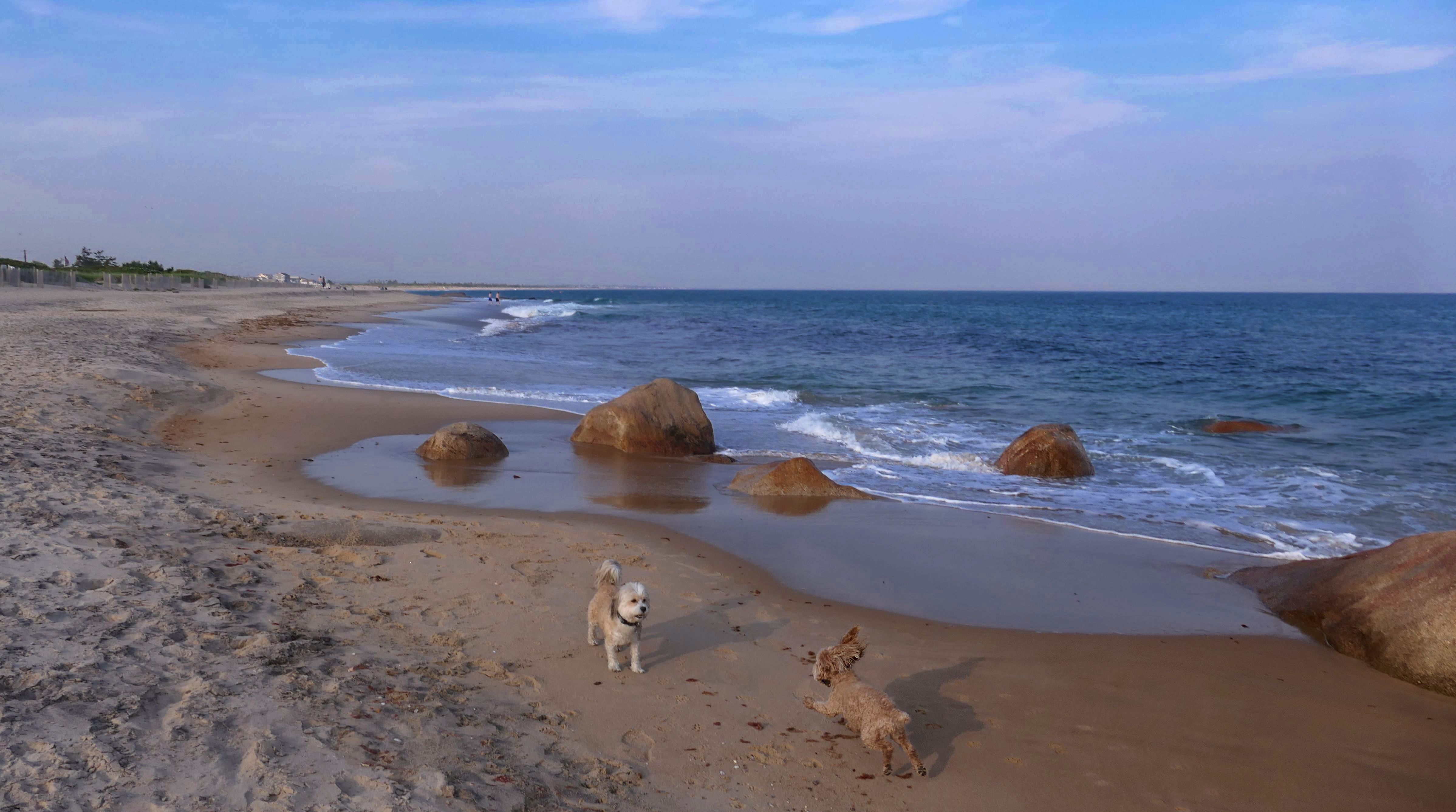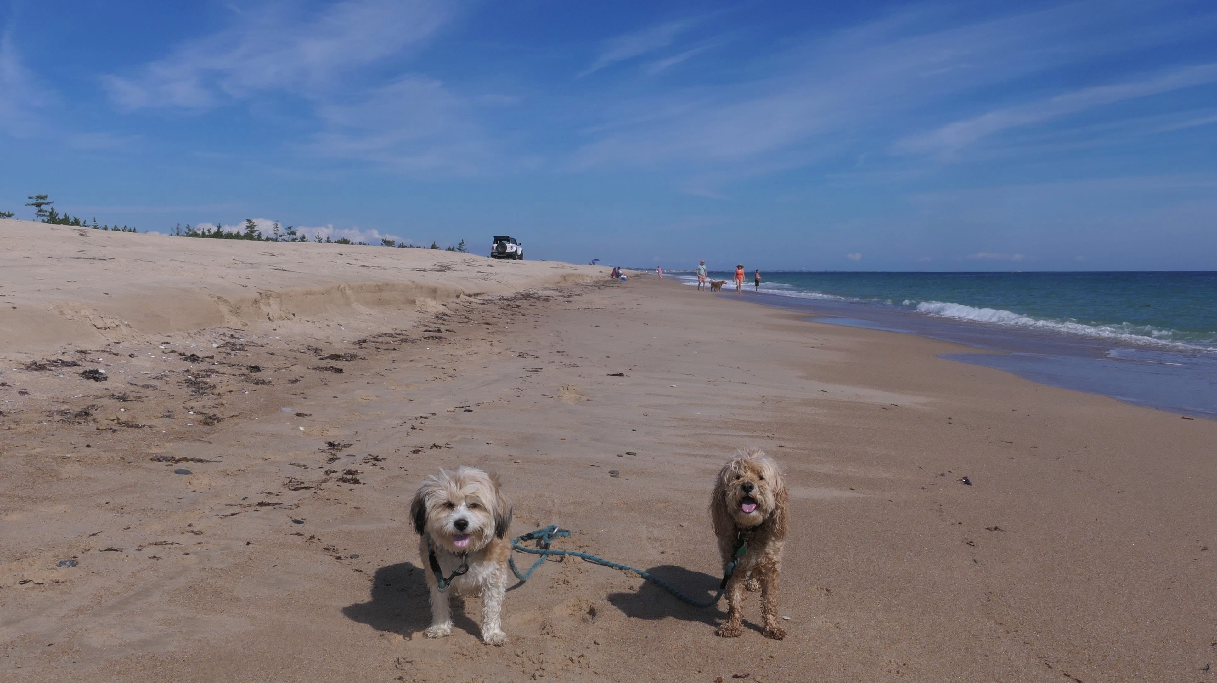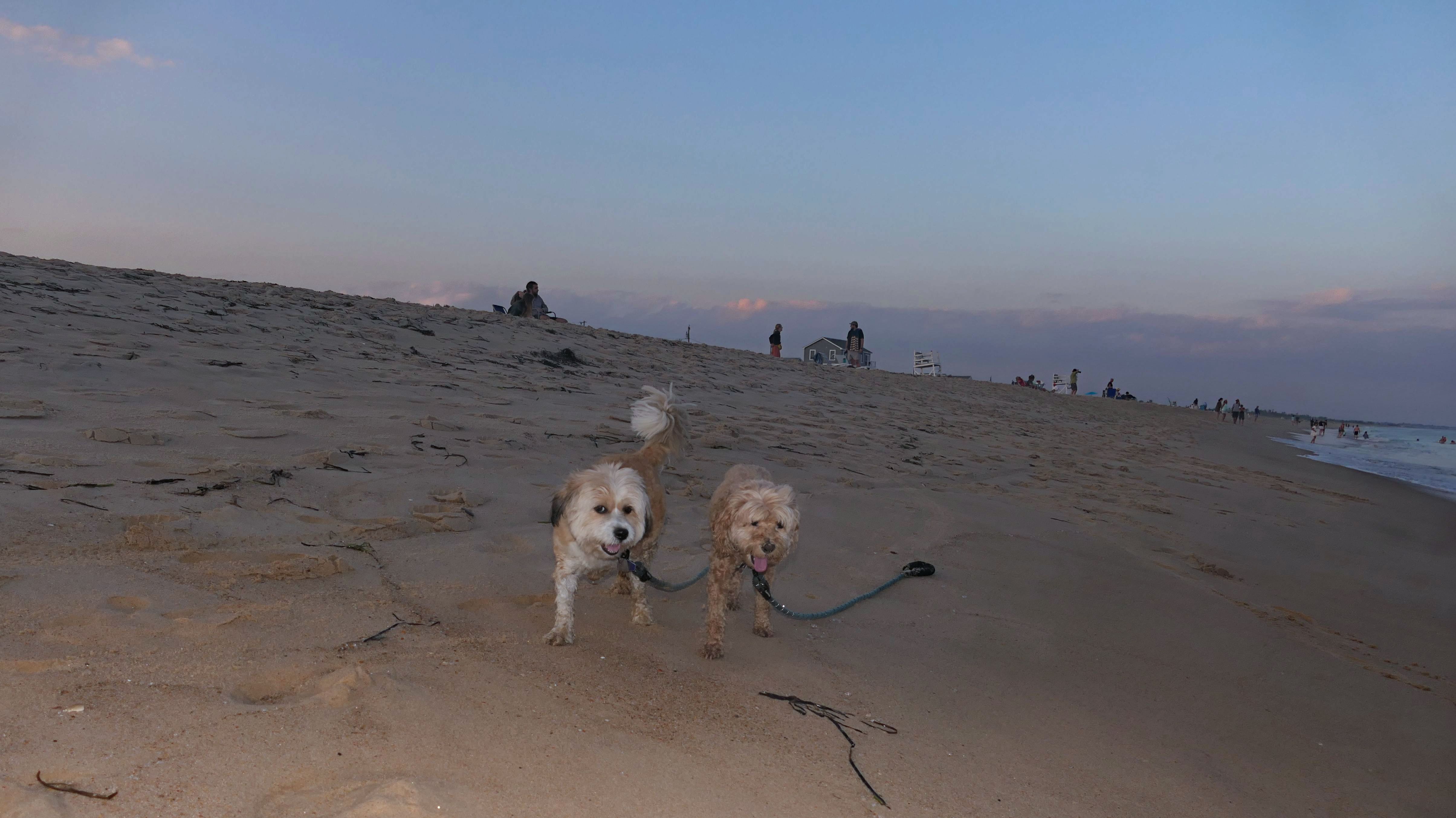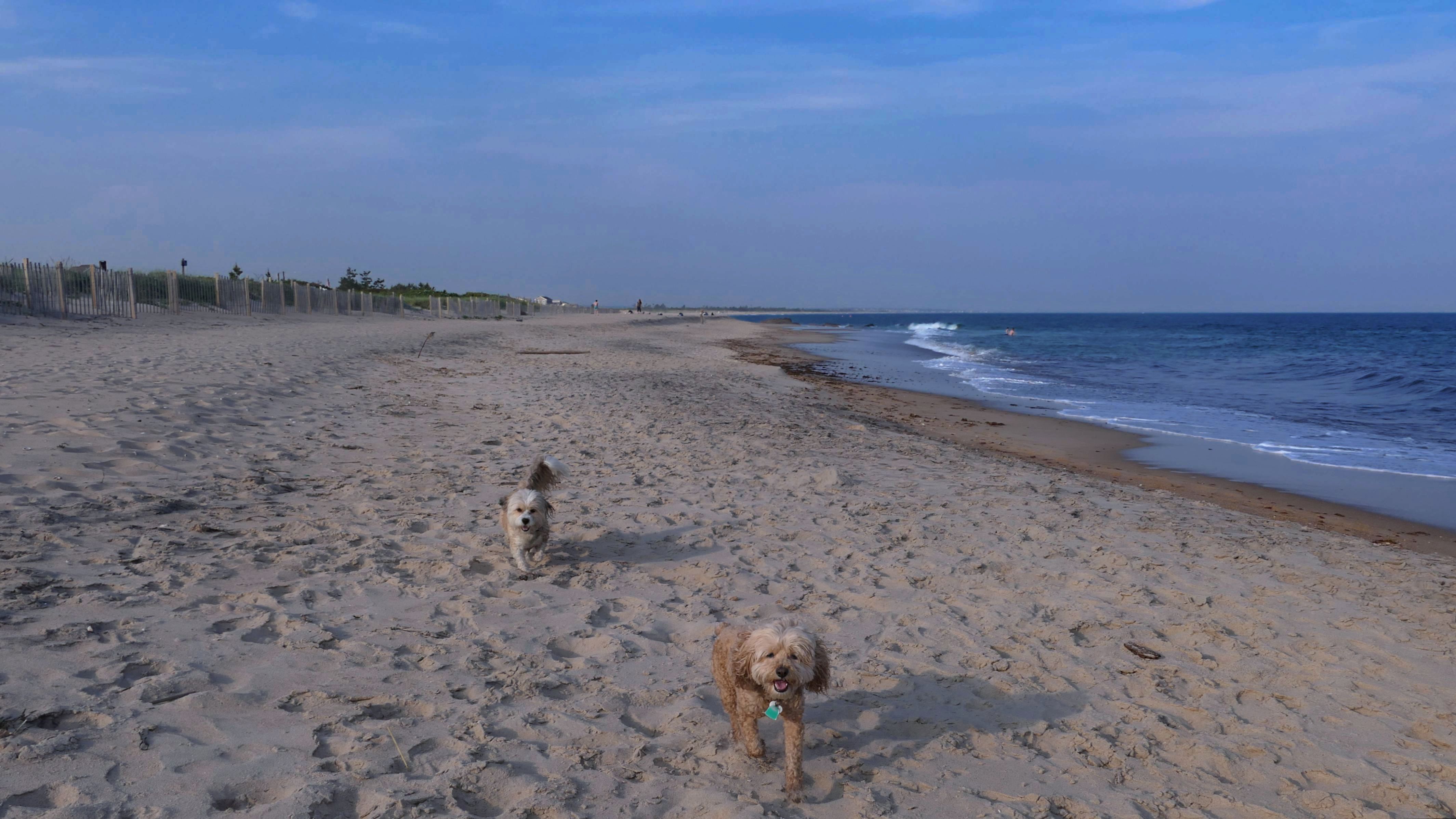 This is Day 2 of our late June heat wave. I mentioned on the write-up for our previous trip that if we go on adventures during this hot spell, it would probably be dog-friendly beaches in Rhode Island, where it's a little bit cooler. Dogs are allowed here after 5PM, and we arrived around 5:30. We went for a short walk, wading through the edge of the waves on a hazy and hot day.