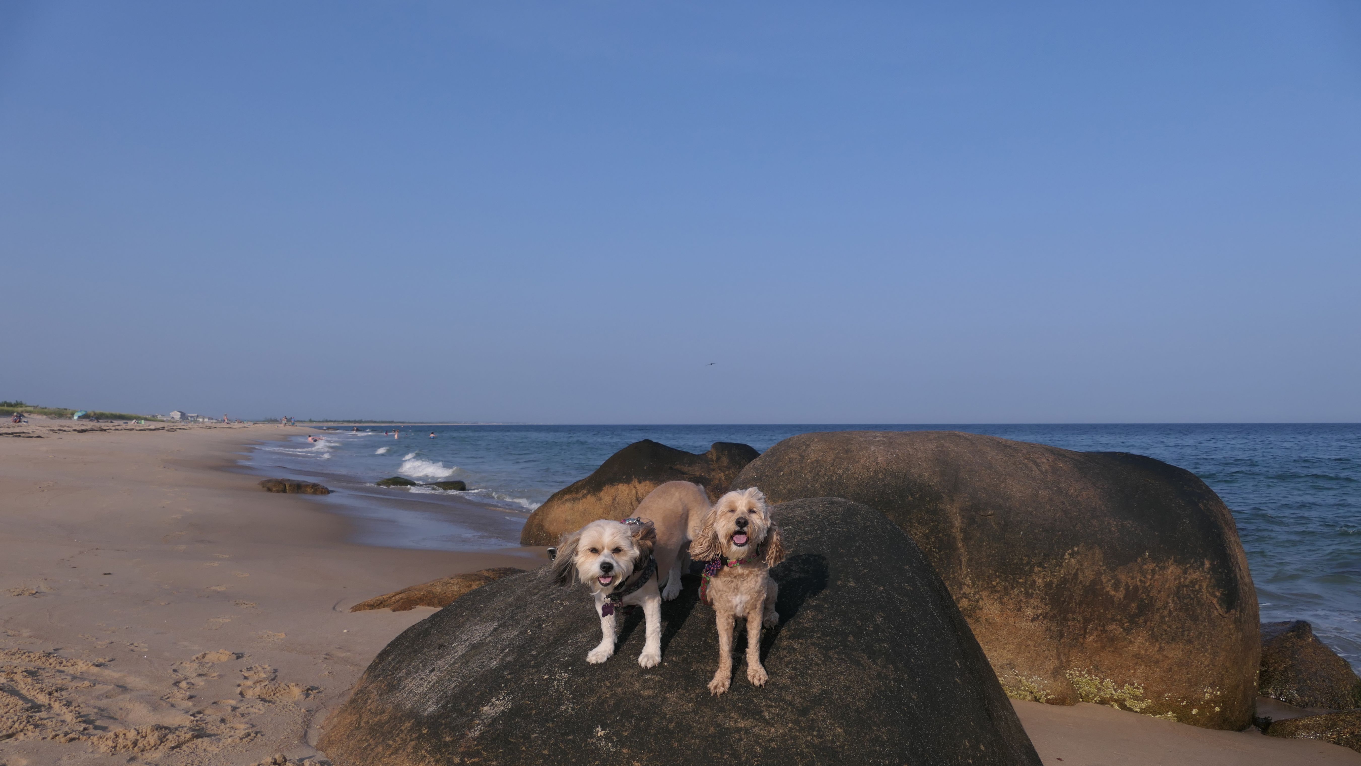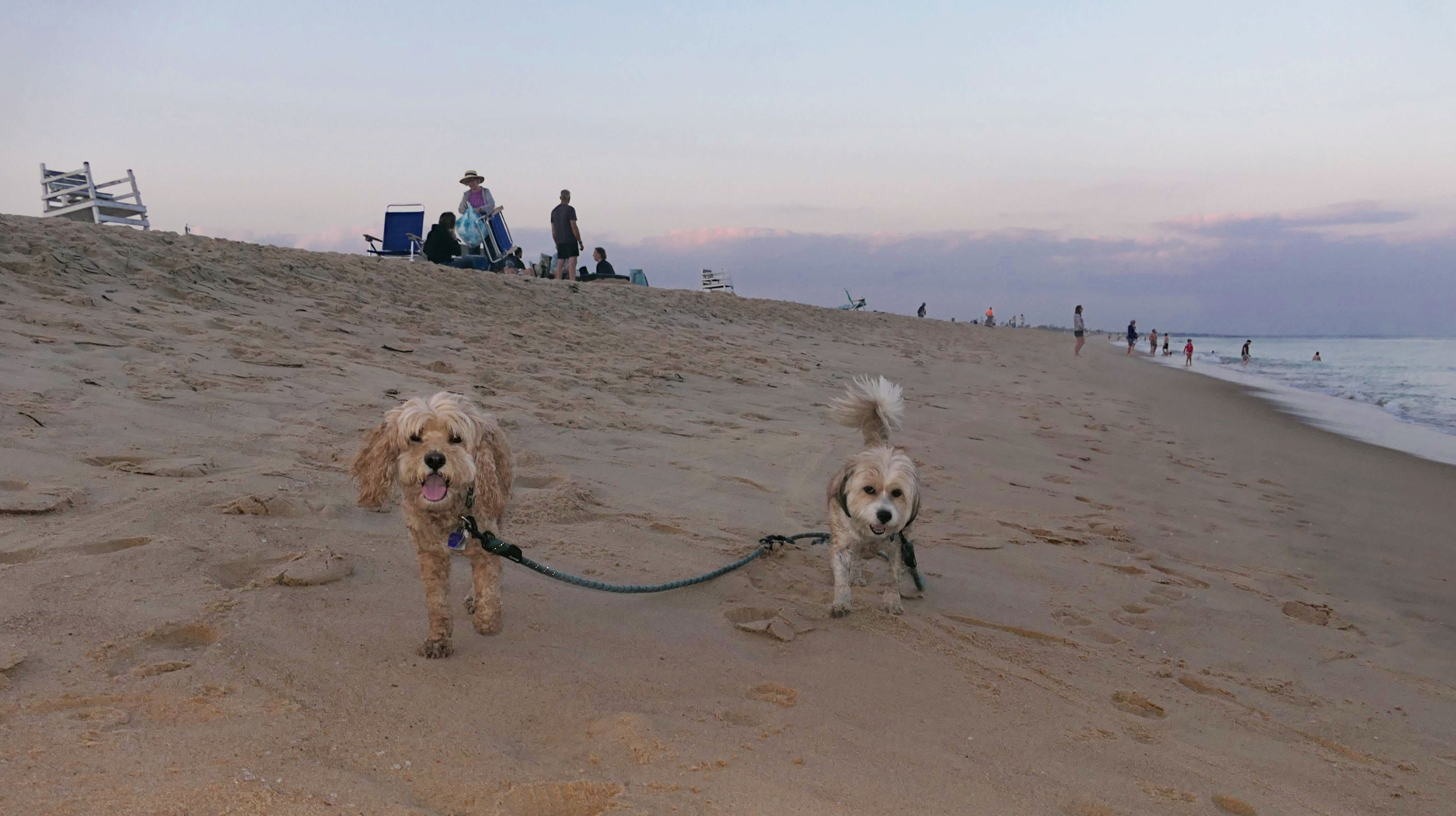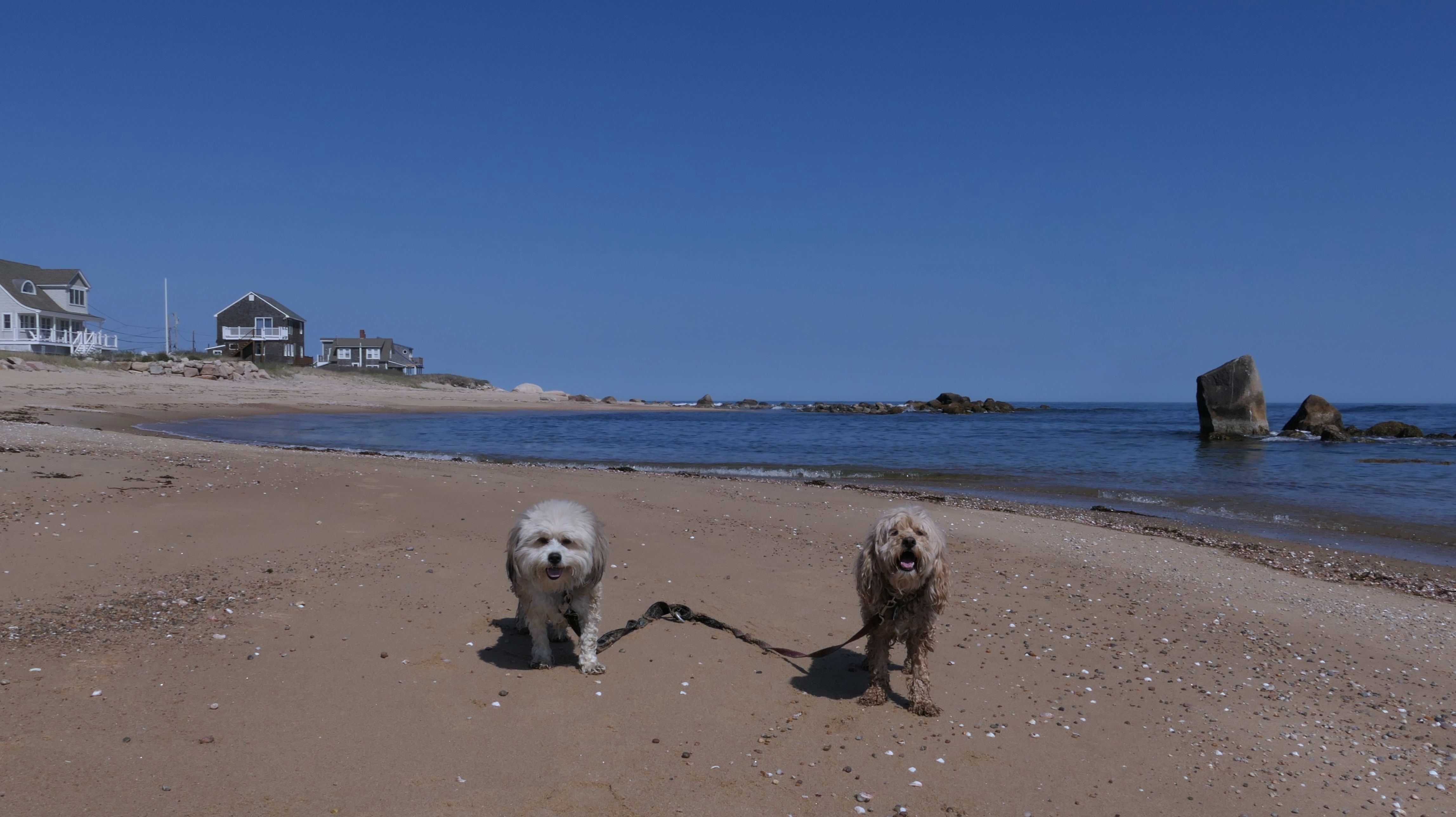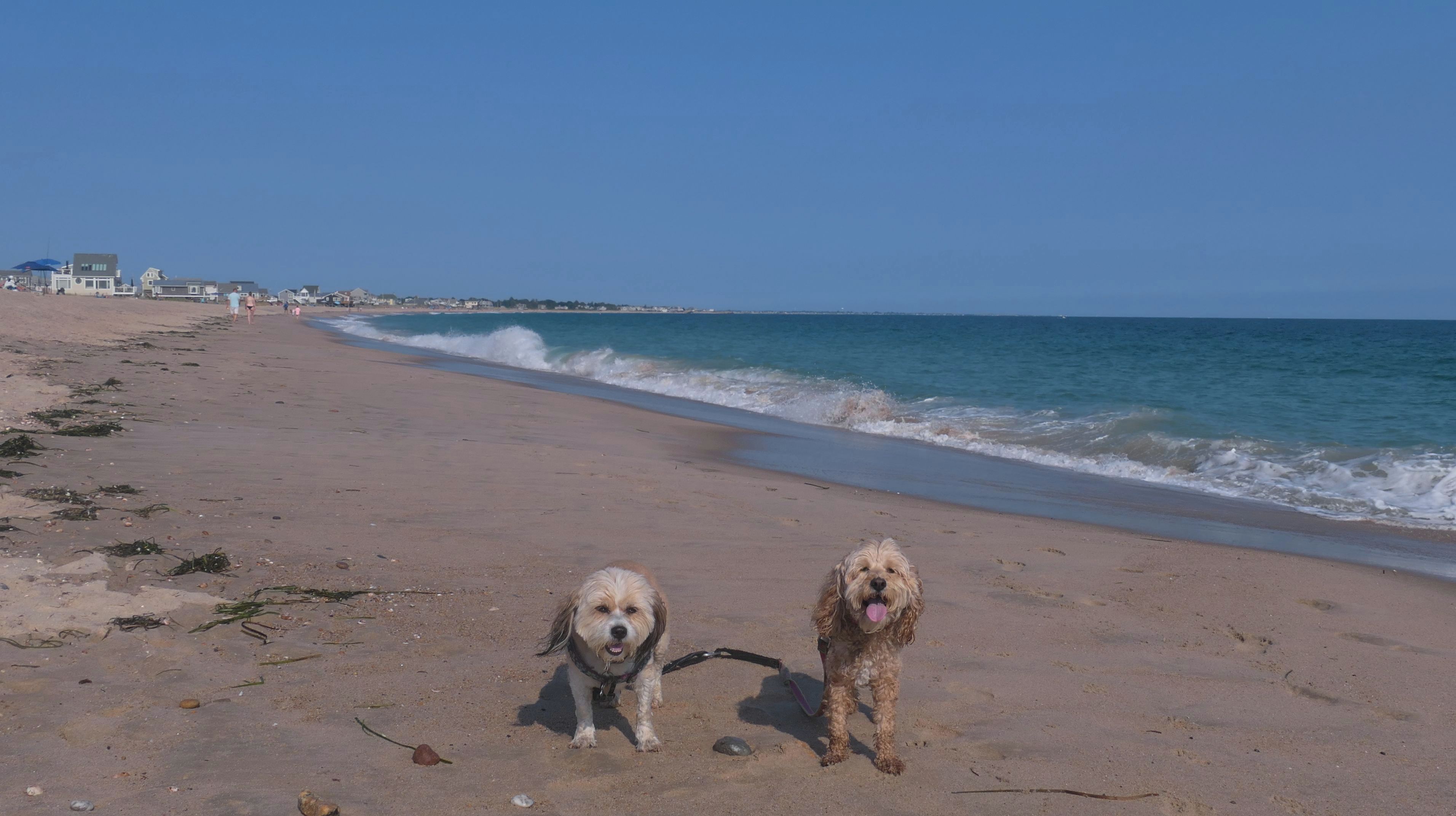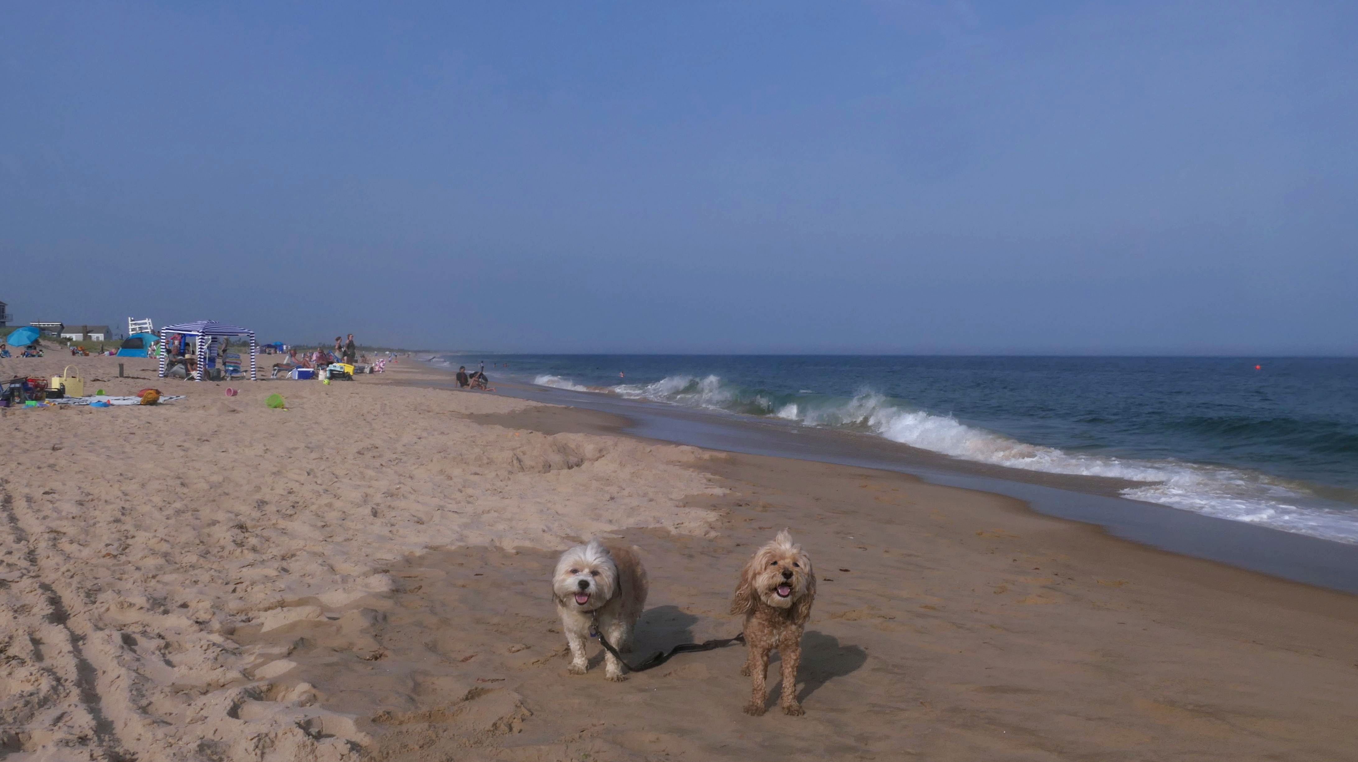 This is Day 2 of our late June heat wave. I mentioned on the write-up for our previous trip that if we go on adventures during this hot spell, it would probably be dog-friendly beaches in Rhode Island, where it's a little bit cooler. Dogs are allowed here after 5PM, and we arrived around 5:30. We went for a short walk, wading through the edge of the waves on a hazy and hot day.
