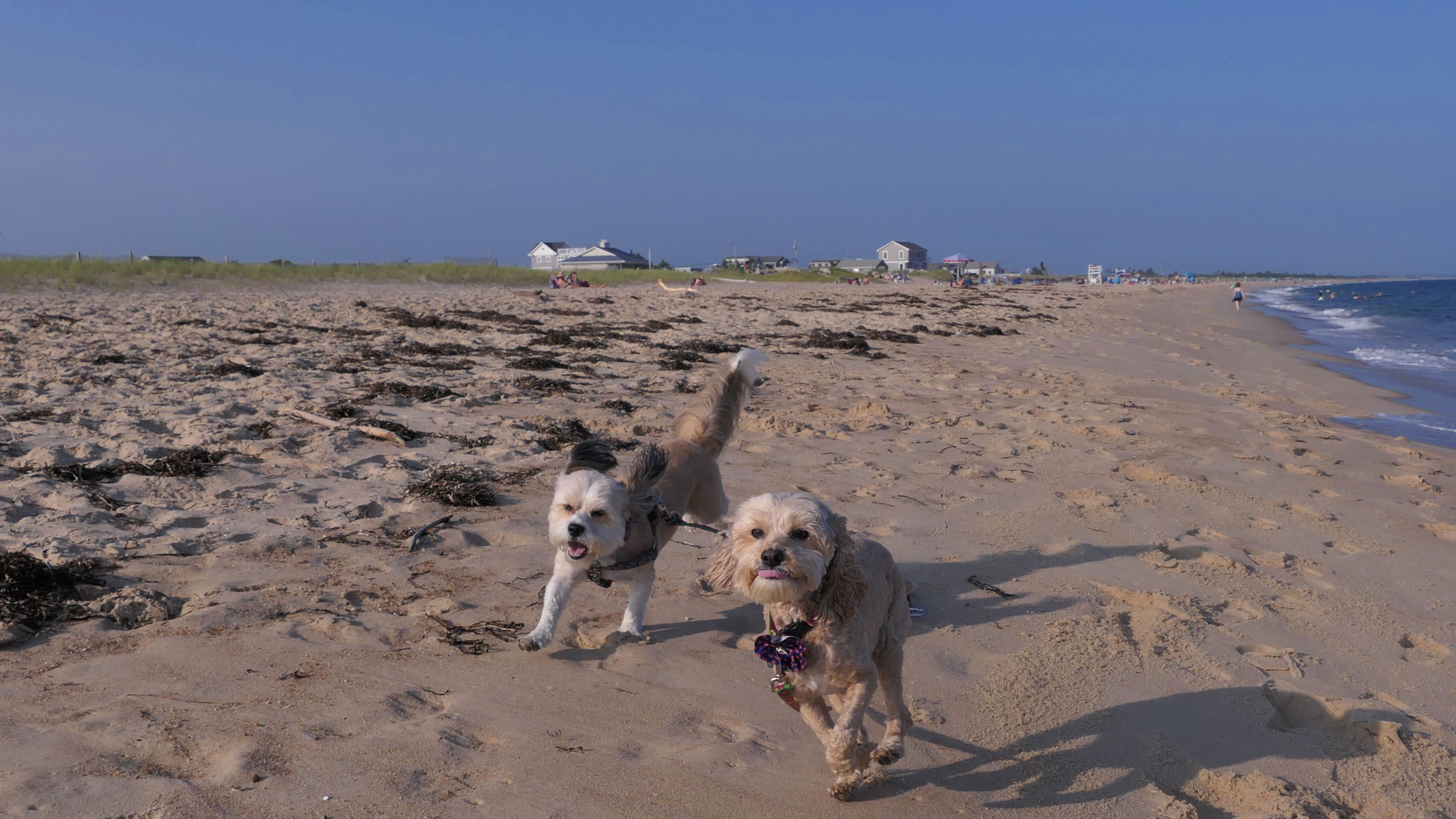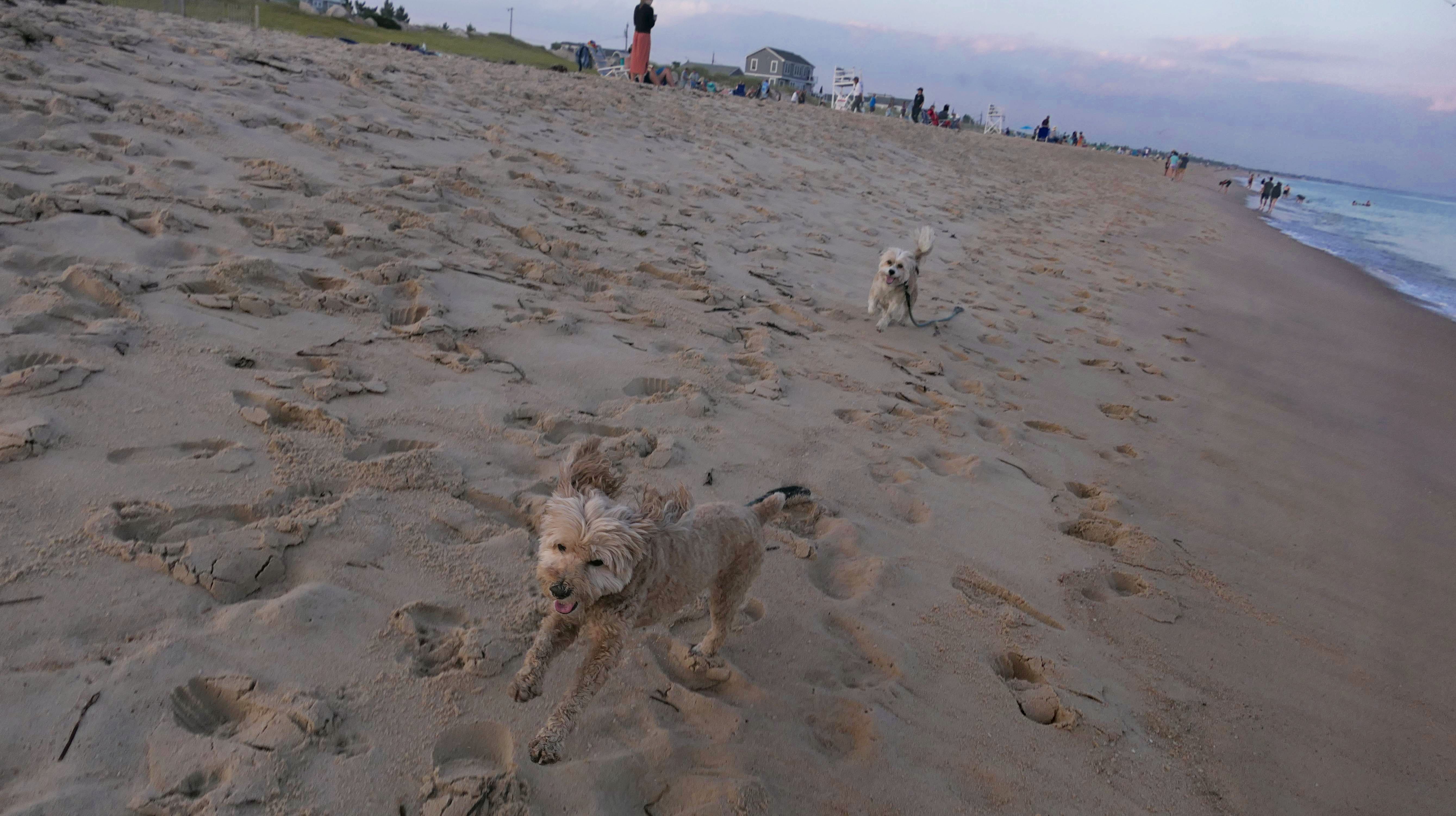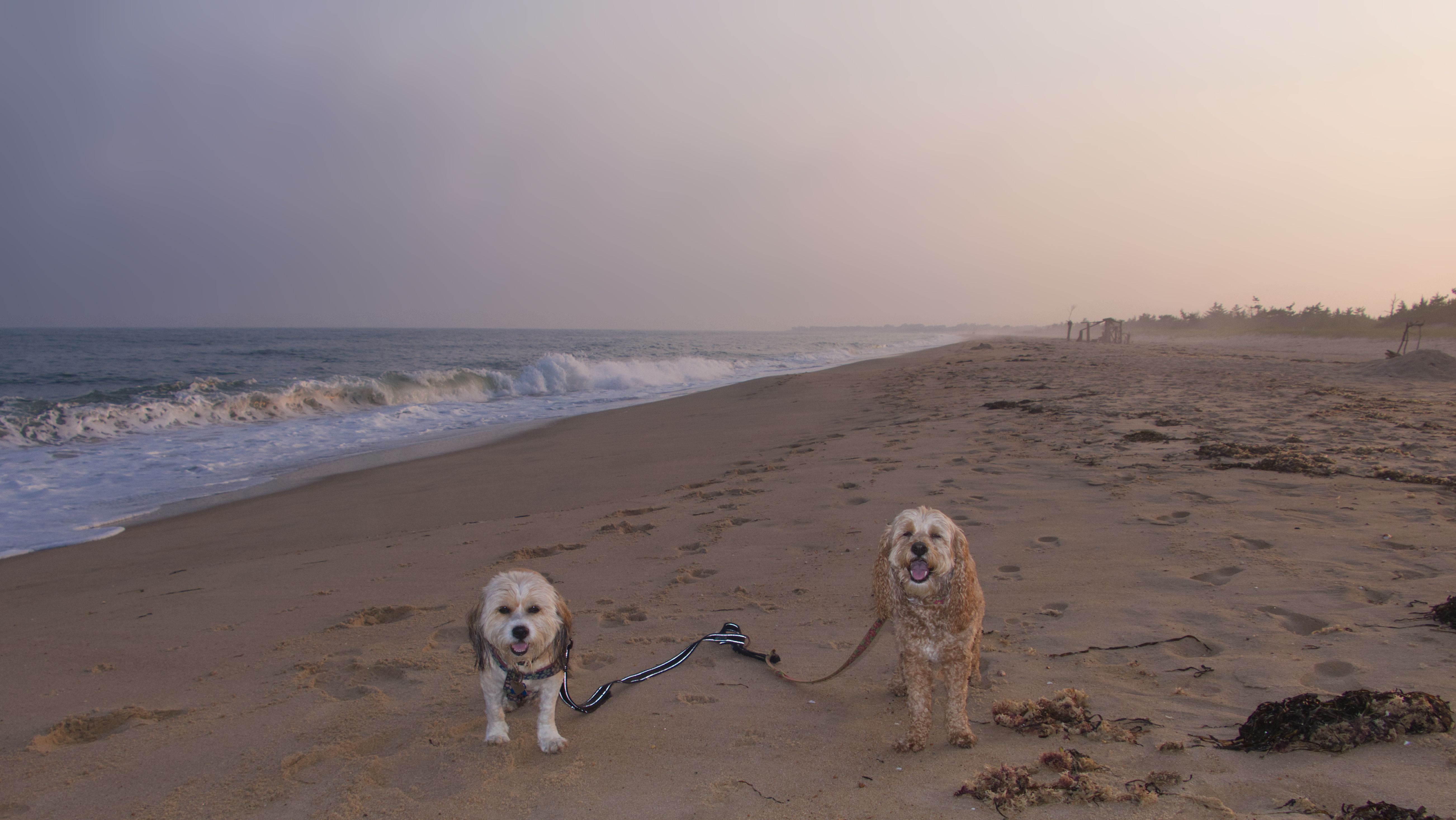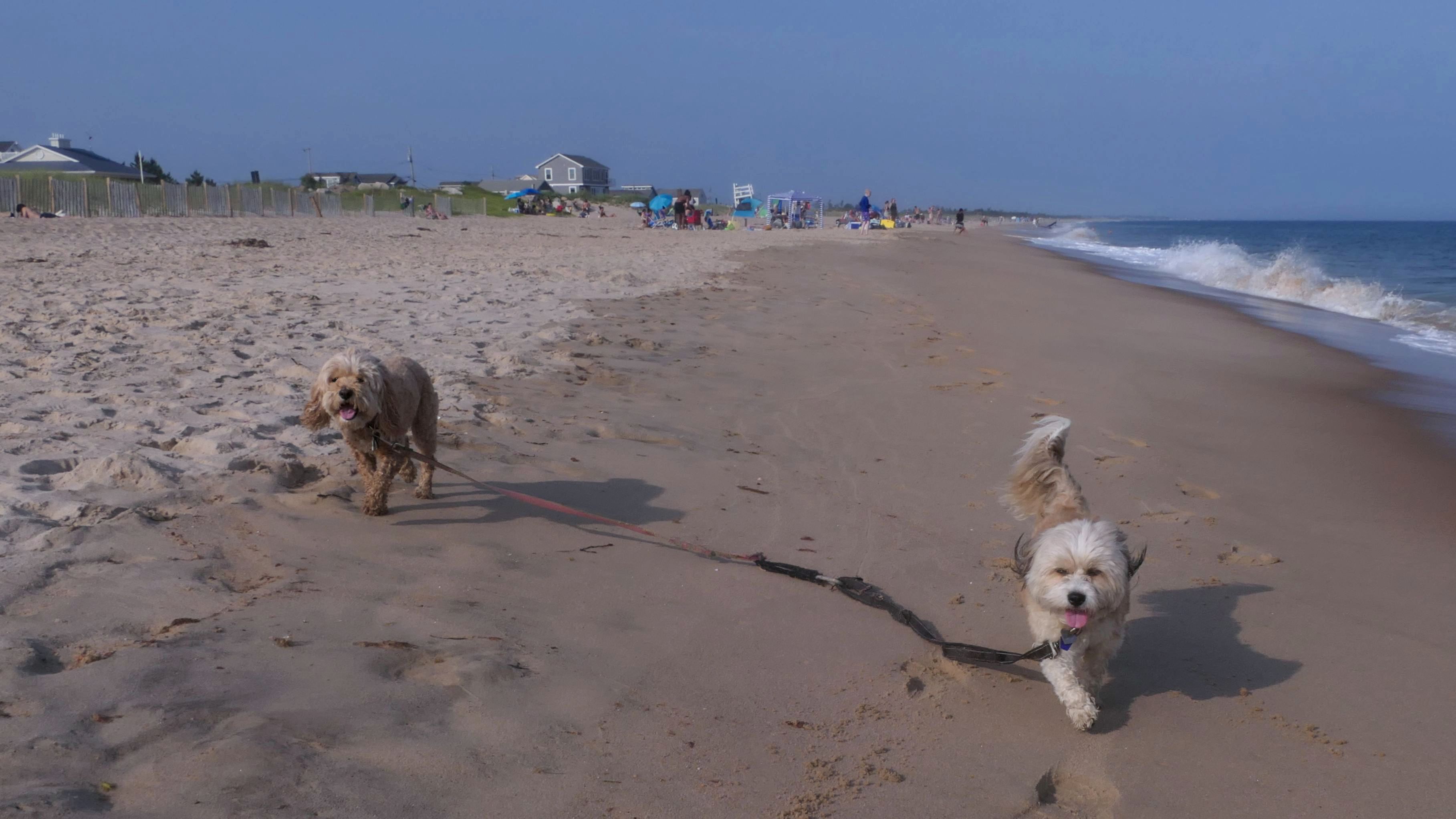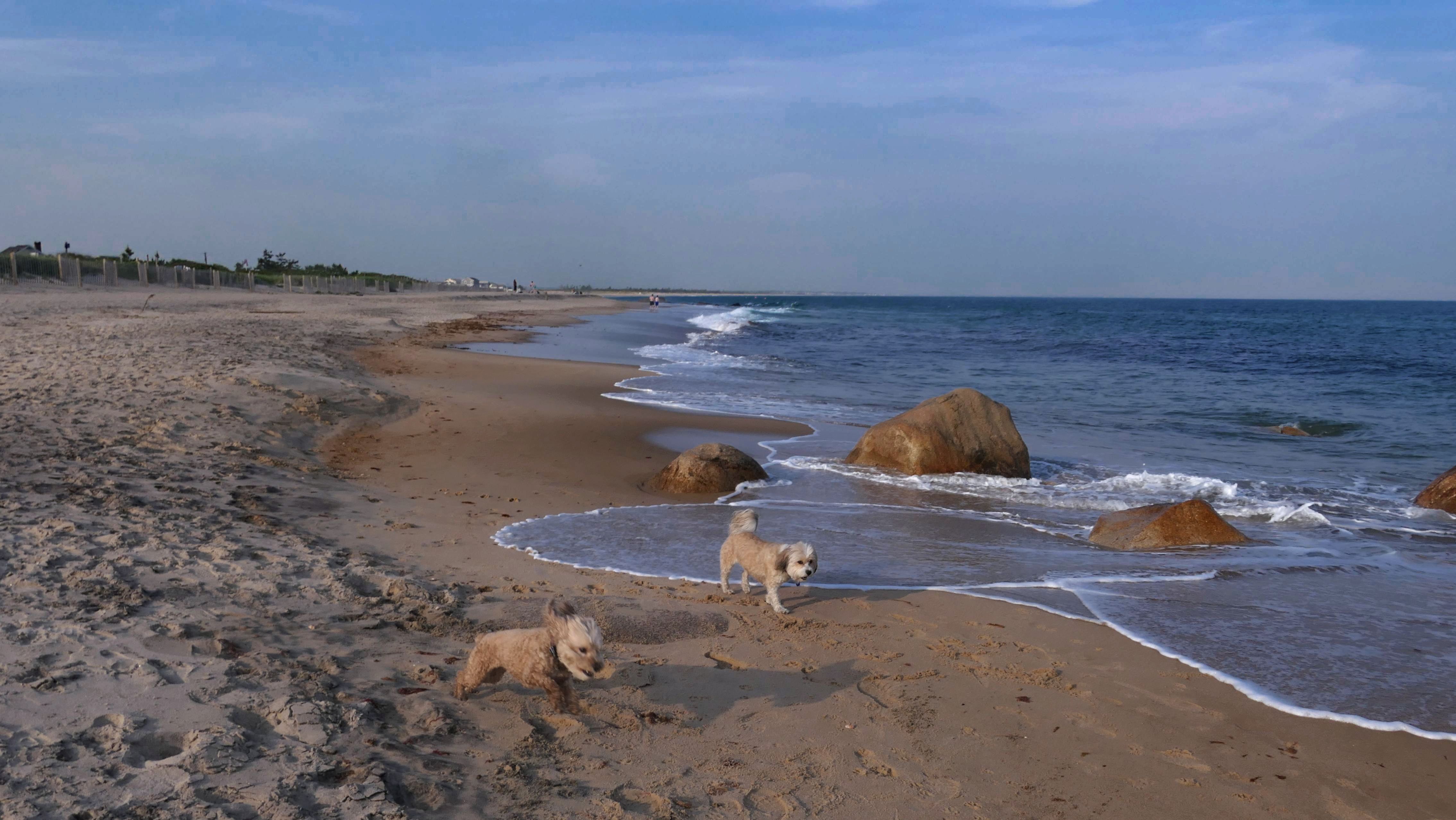 This is Day 2 of our late June heat wave. I mentioned on the write-up for our previous trip that if we go on adventures during this hot spell, it would probably be dog-friendly beaches in Rhode Island, where it's a little bit cooler. Dogs are allowed here after 5PM, and we arrived around 5:30. We went for a short walk, wading through the edge of the waves on a hazy and hot day.