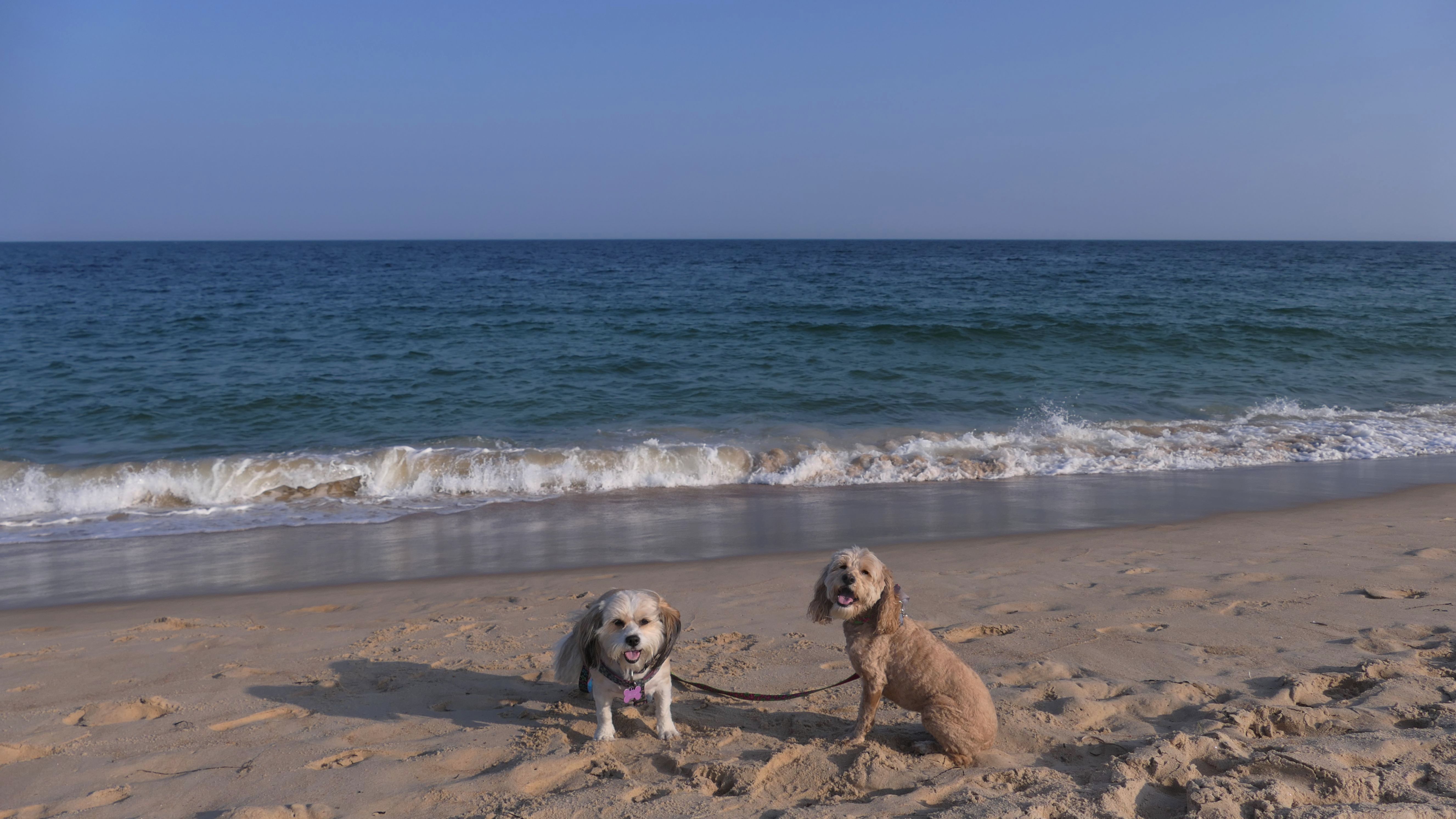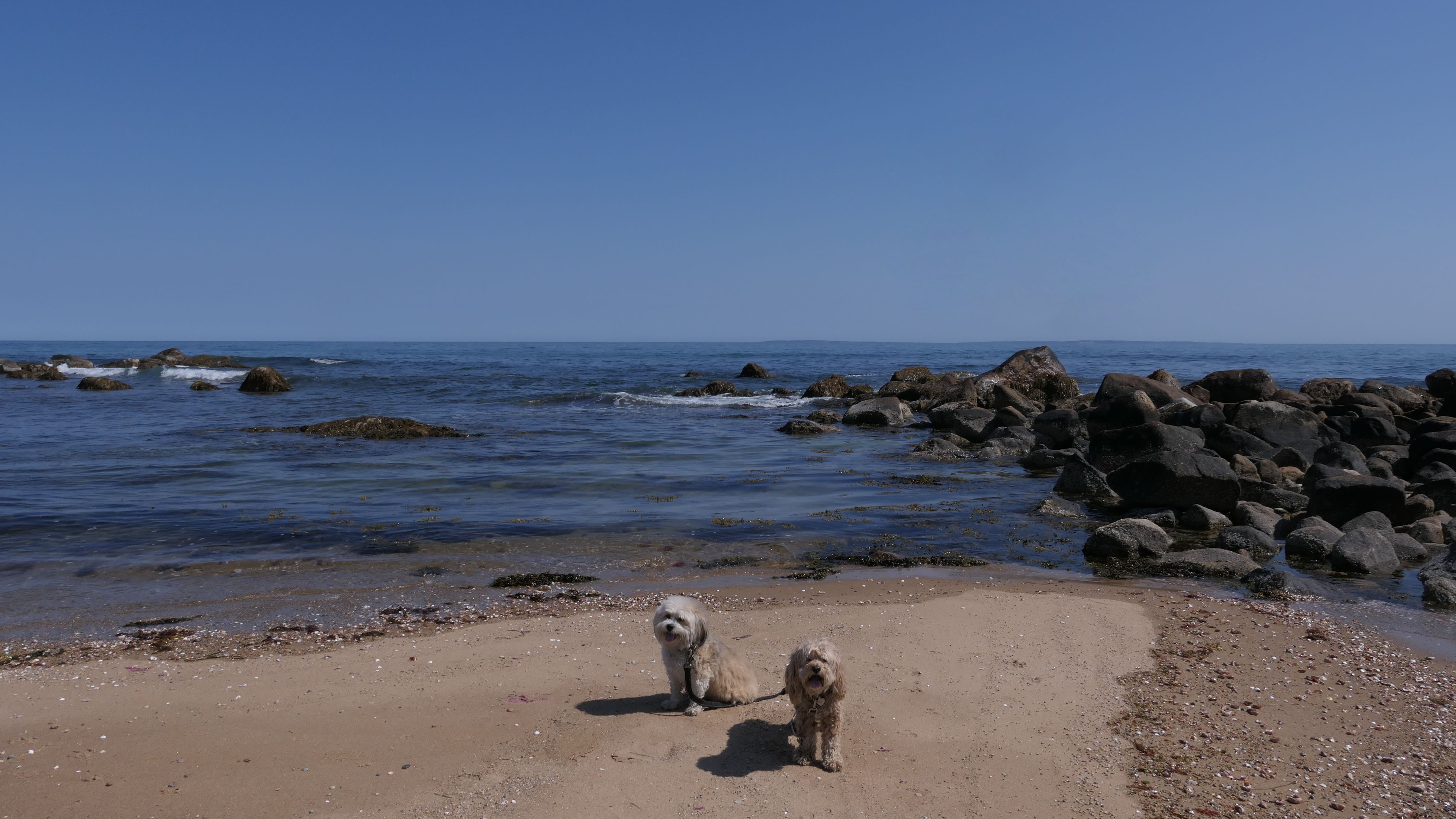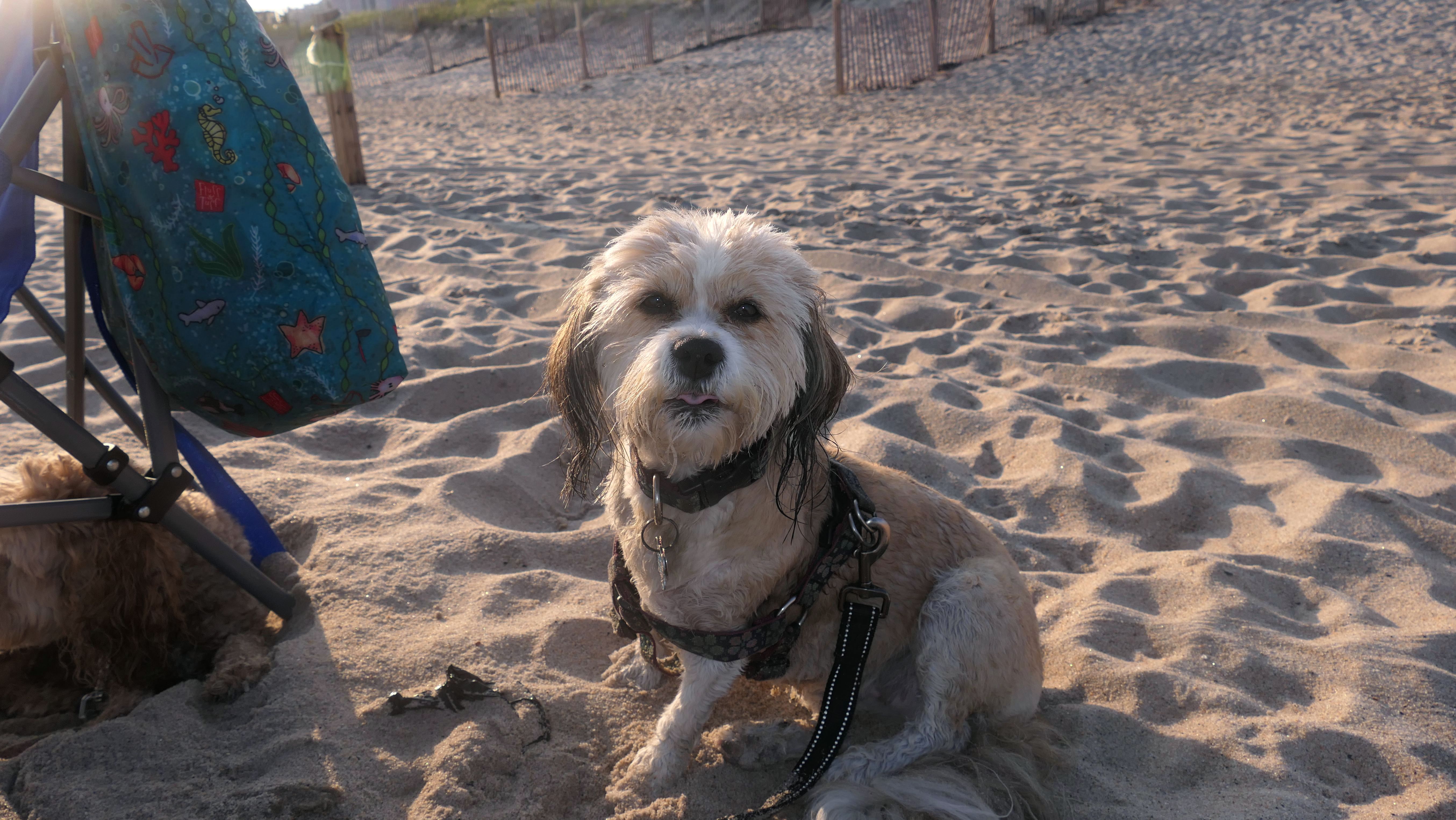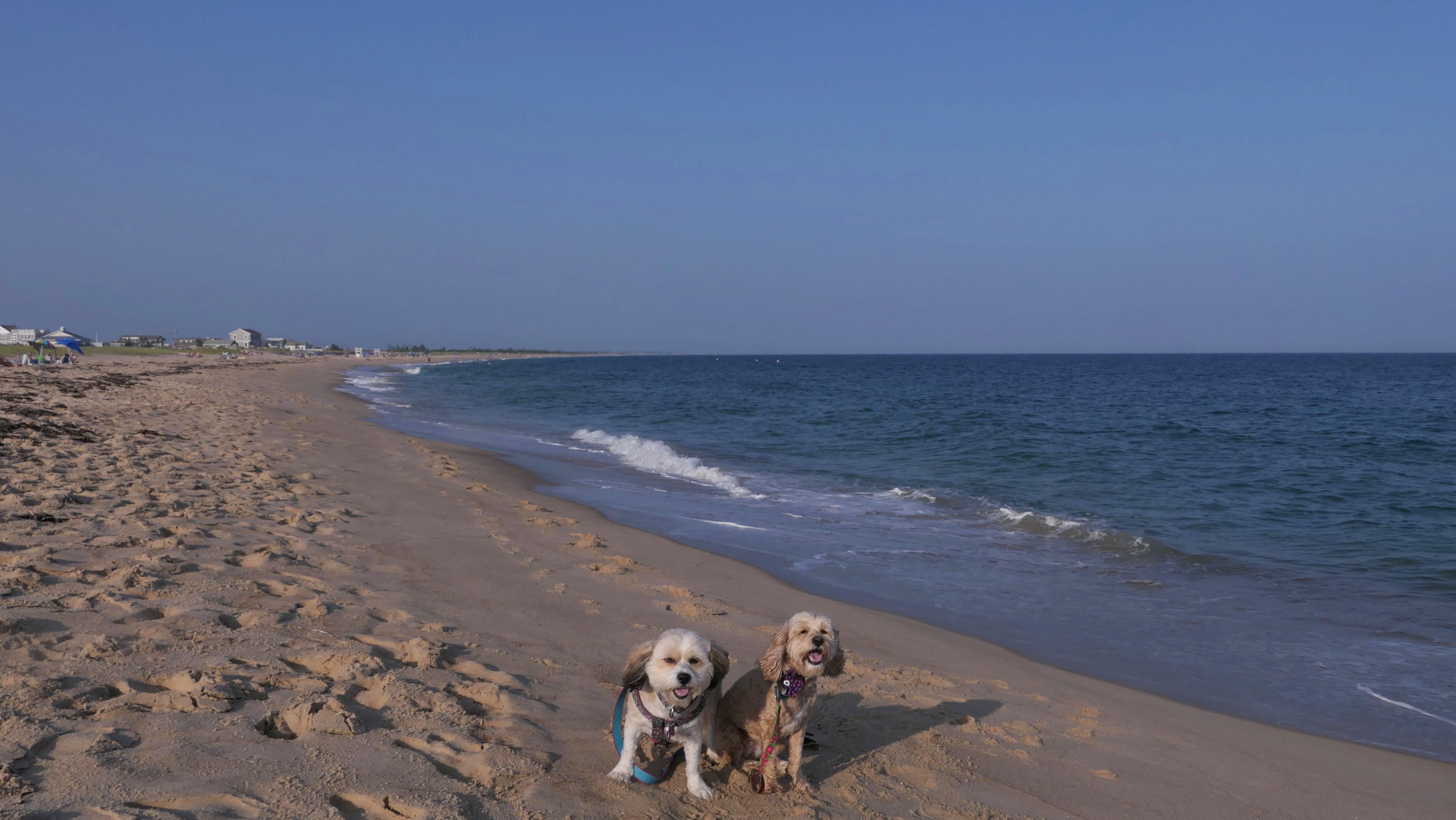 This is Day 2 of our late June heat wave. I mentioned on the write-up for our previous trip that if we go on adventures during this hot spell, it would probably be dog-friendly beaches in Rhode Island, where it's a little bit cooler. Dogs are allowed here after 5PM, and we arrived around 5:30. We went for a short walk, wading through the edge of the waves on a hazy and hot day.