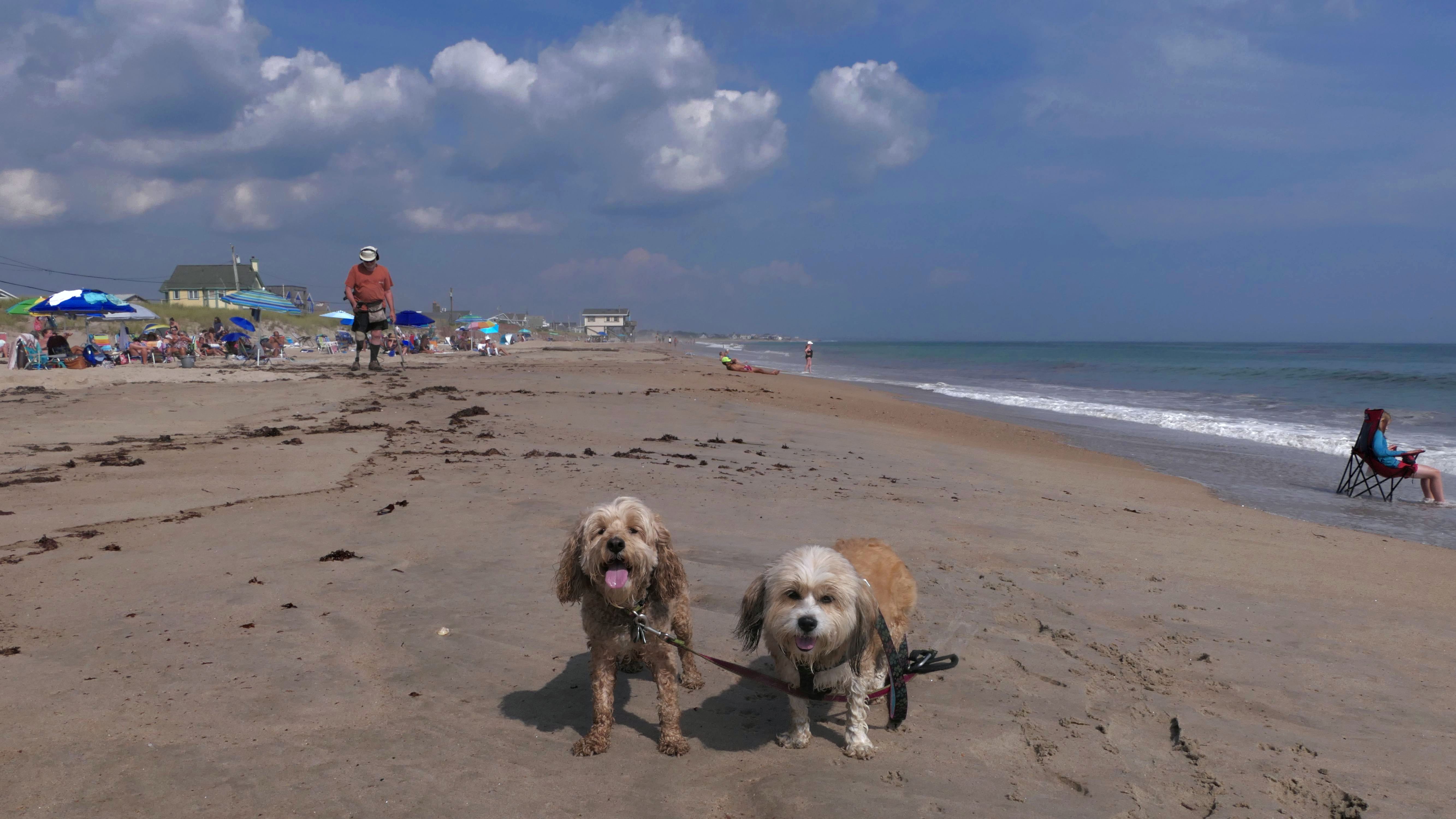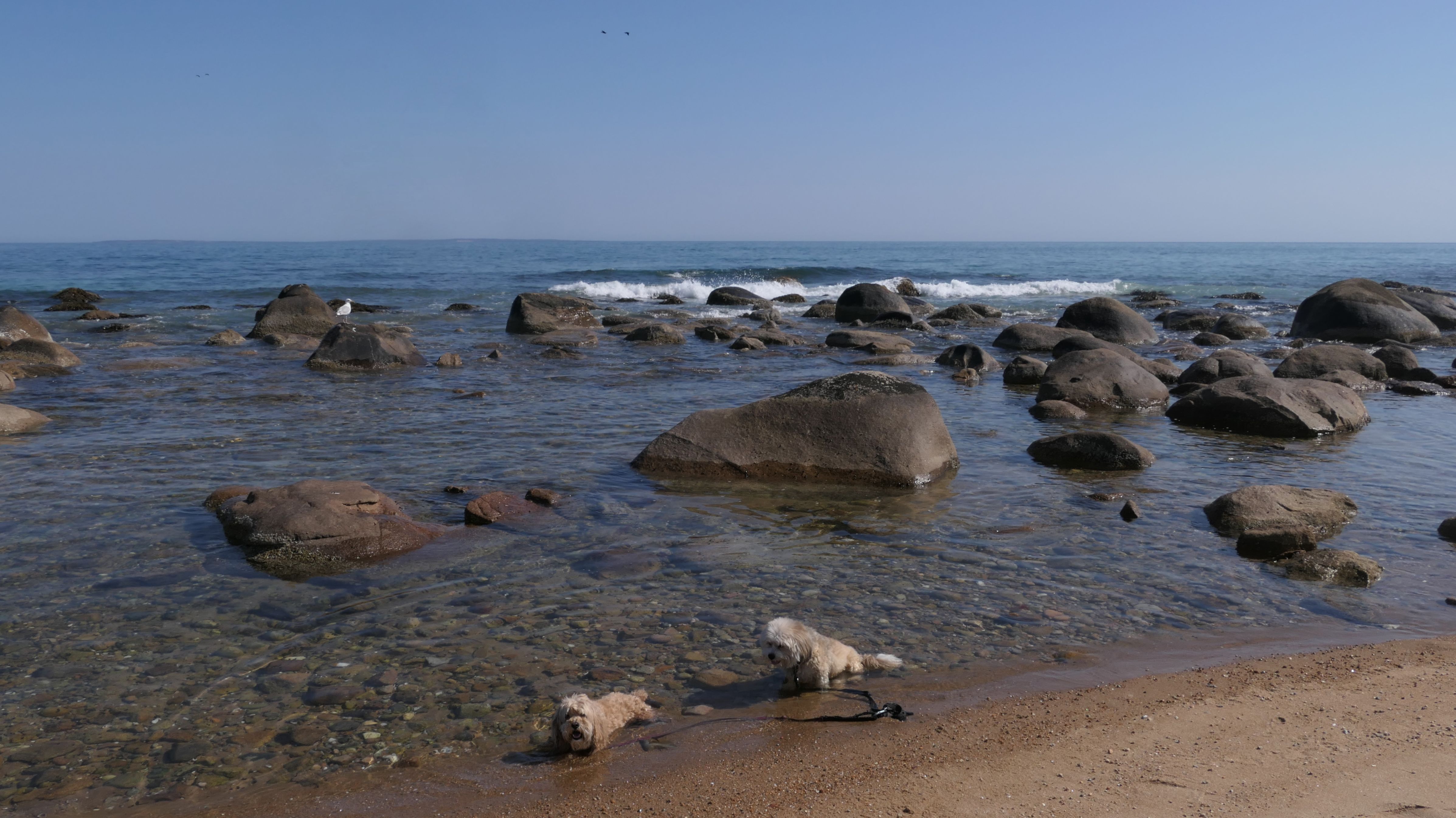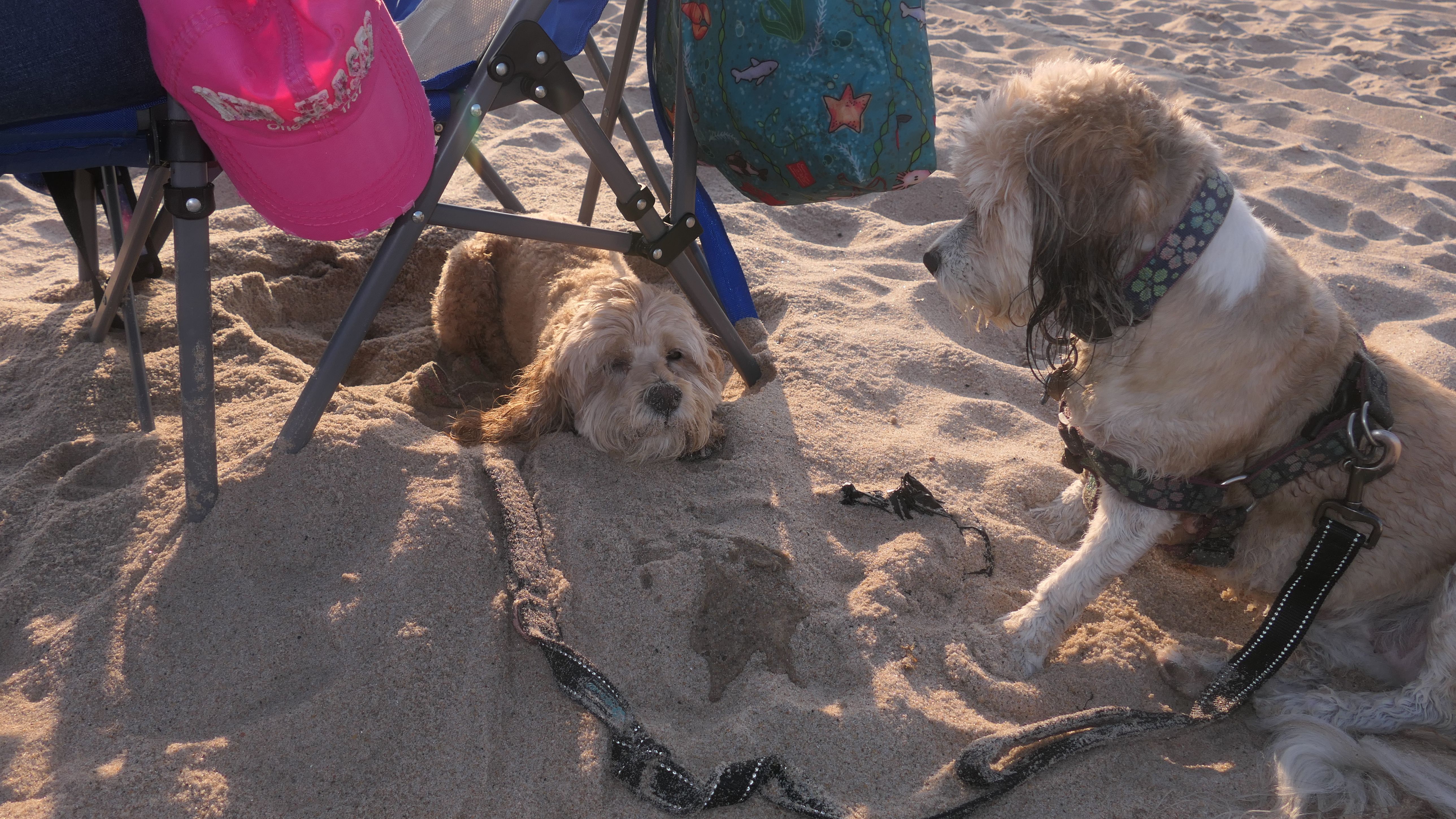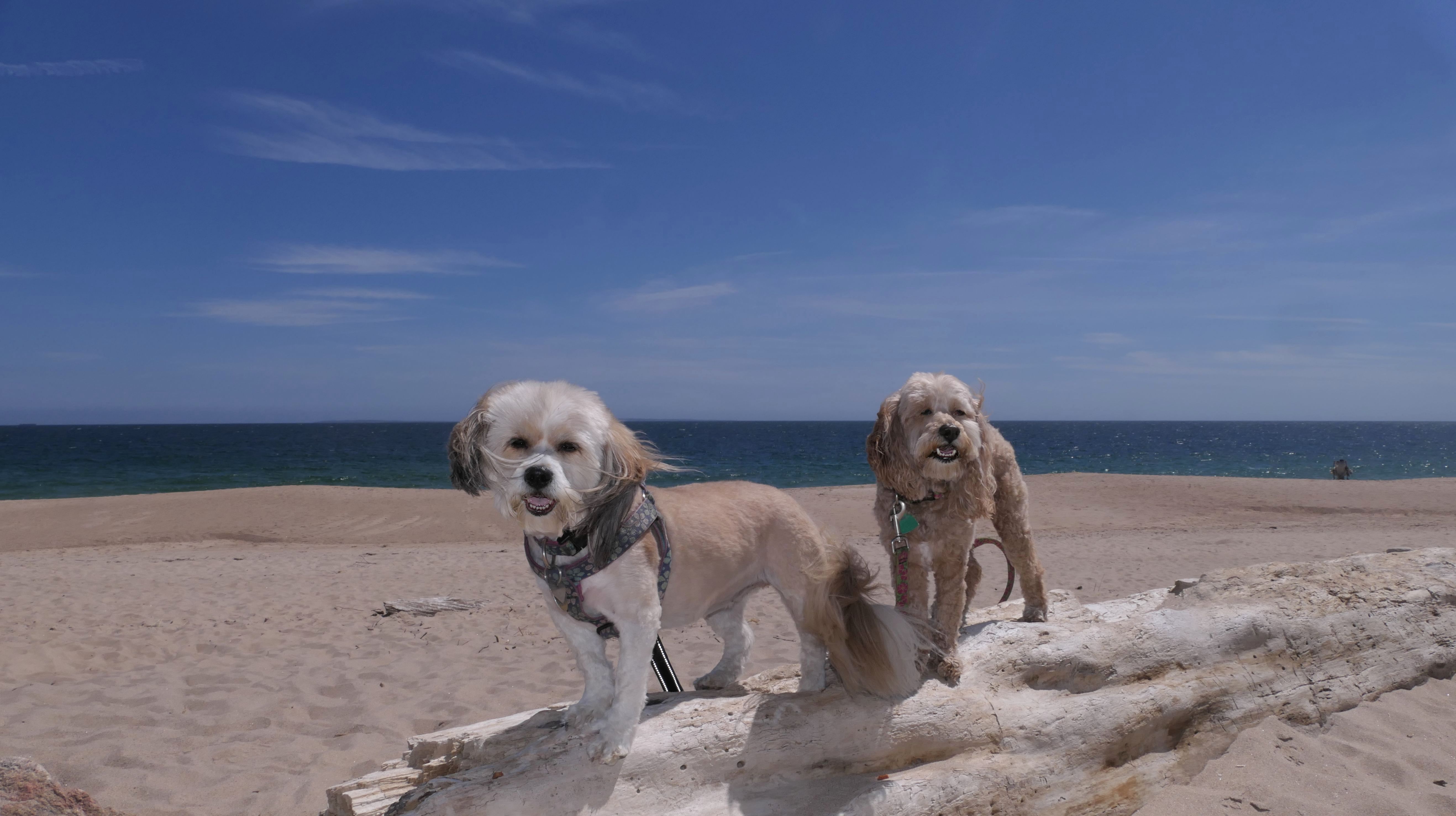 We're back here again. It was the first 90+ degree day of the year inland, so it seemed like a good time to go to a beach! Our beach options are limited this time of year, and this beach allows dogs after 5PM. It's also my favorite of all the beaches we've visited. We walked down to the rocks. On the way back, I let Mandy and Lexi run off-leash for a bit. Lexi ran around some, and Mandy walked through the edge of the waves. It's always a nice time at this beach.