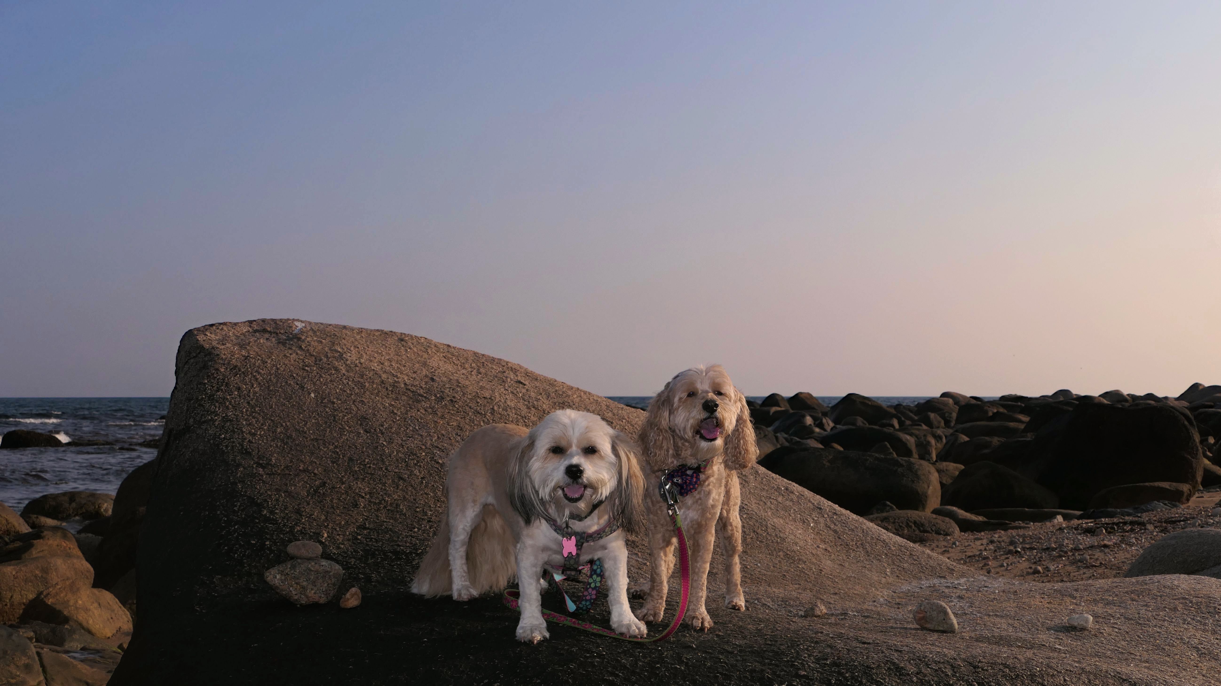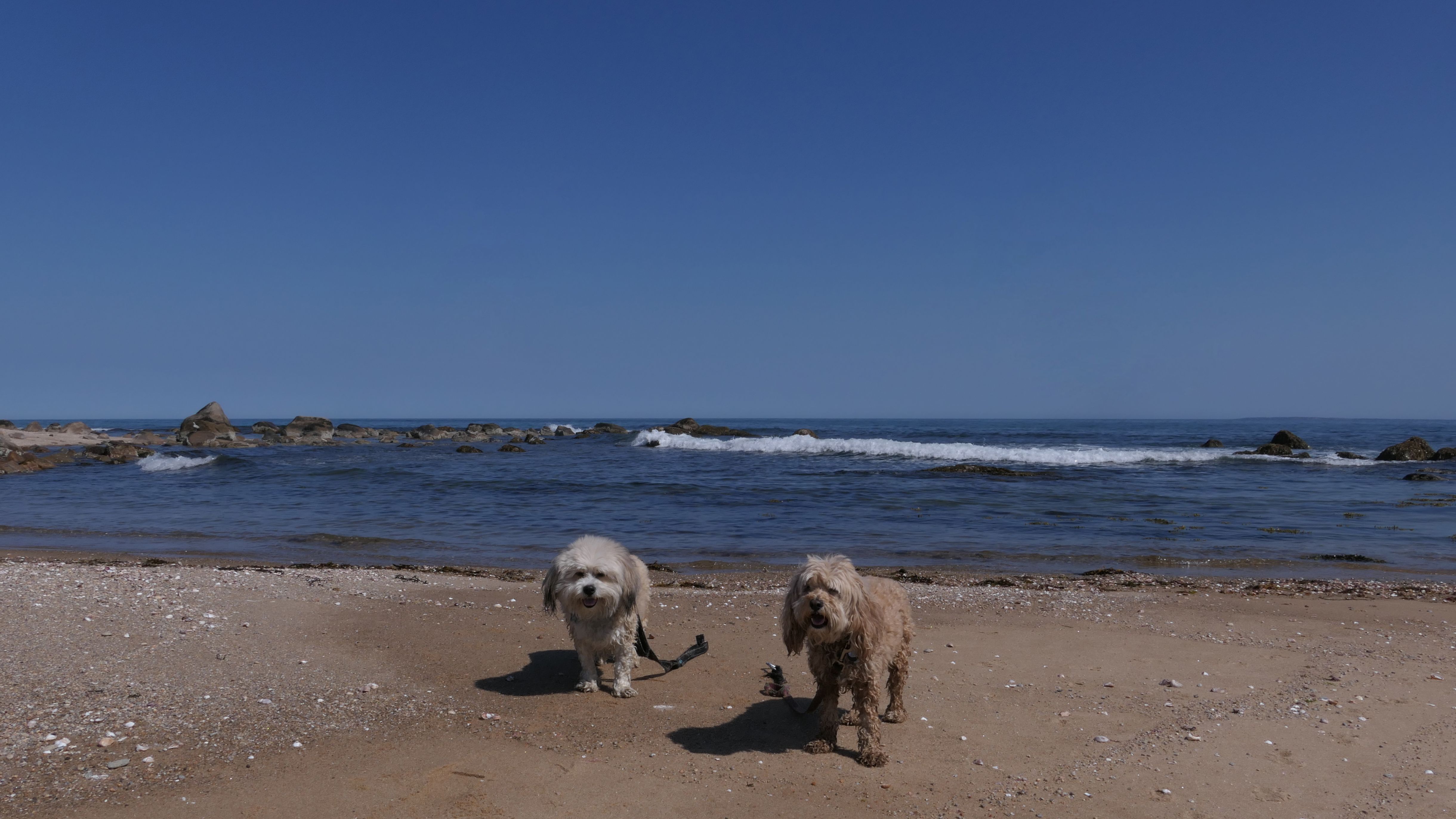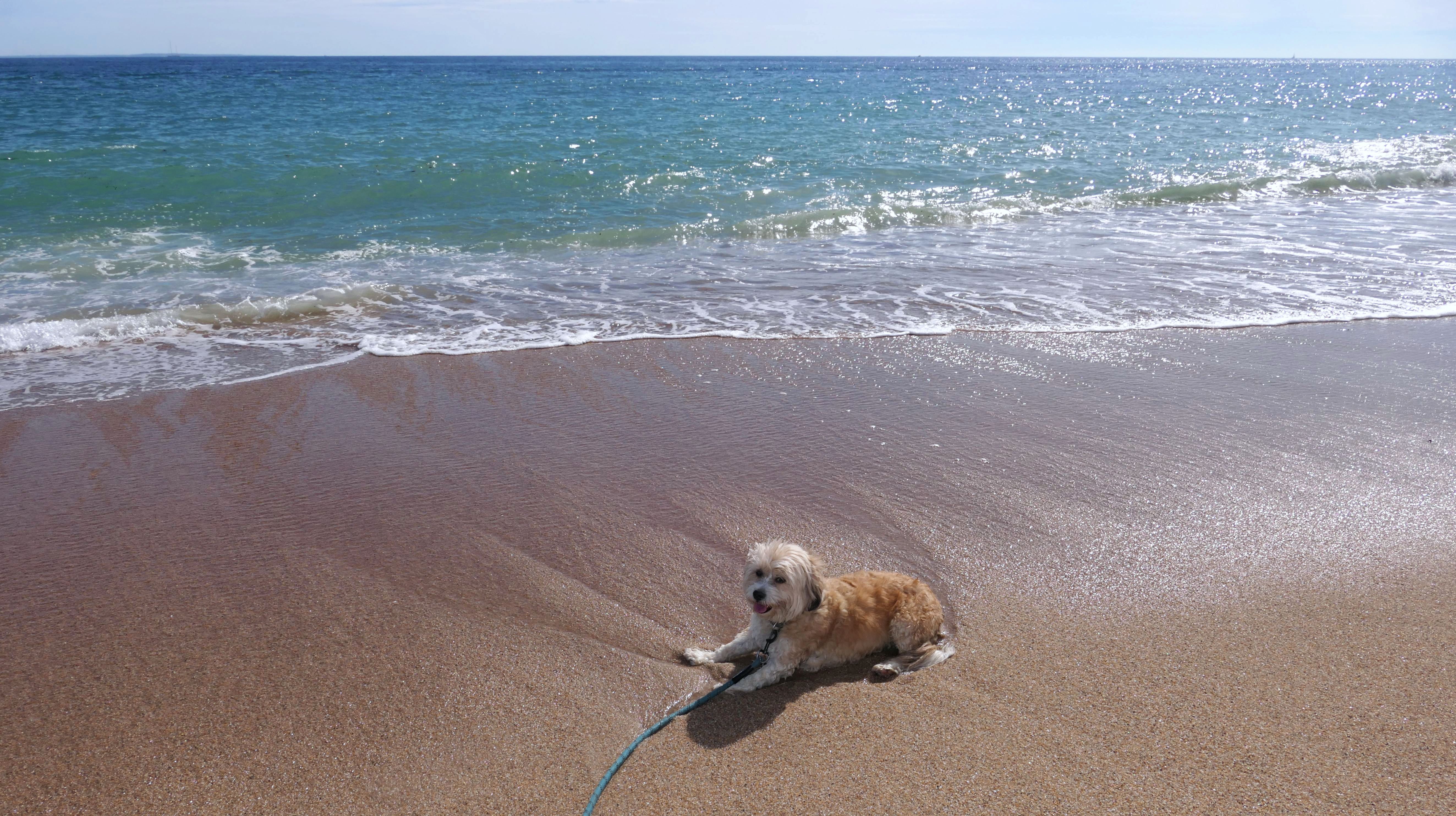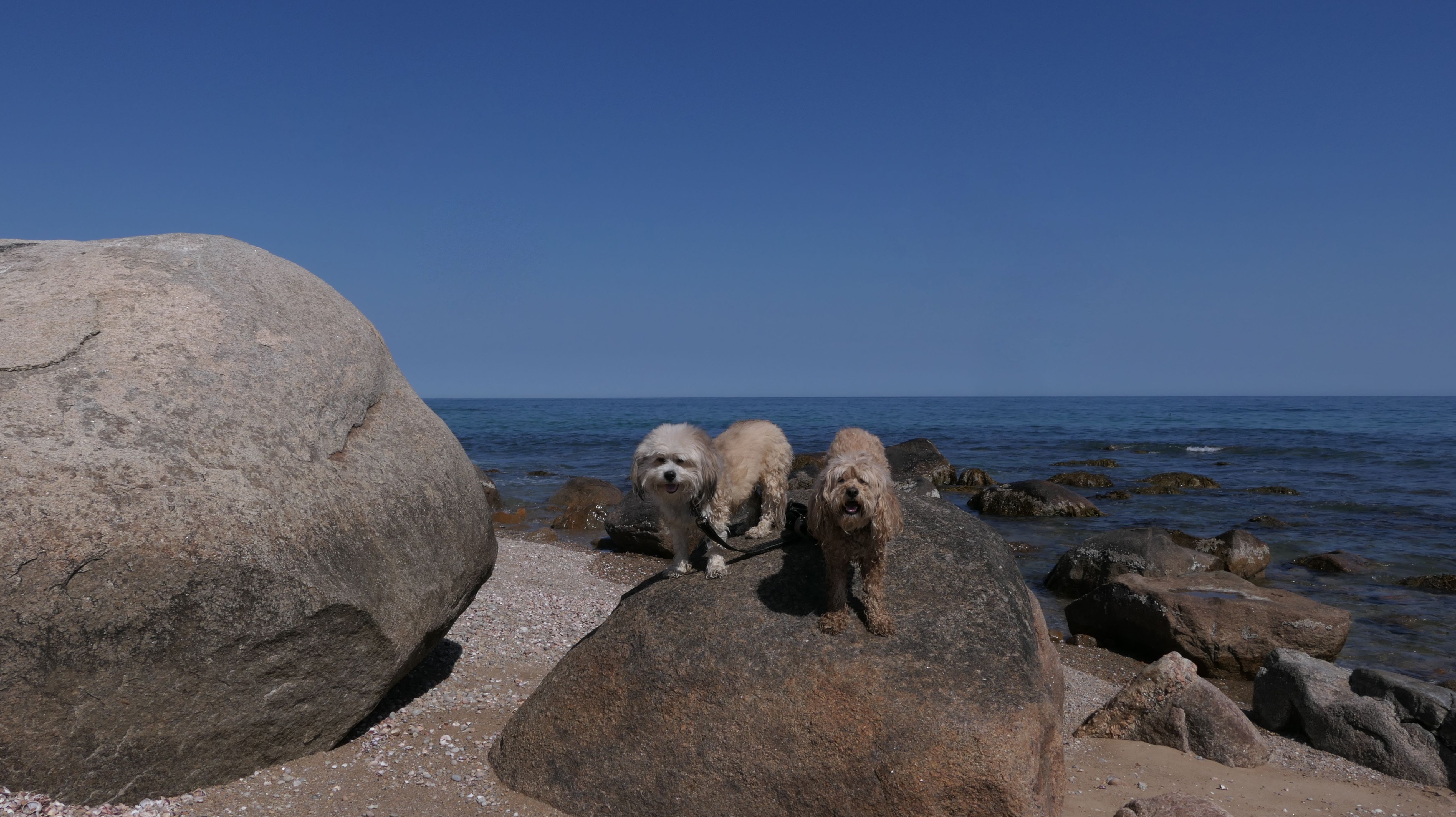 We're back here again. It was the first 90+ degree day of the year inland, so it seemed like a good time to go to a beach! Our beach options are limited this time of year, and this beach allows dogs after 5PM. It's also my favorite of all the beaches we've visited. We walked down to the rocks. On the way back, I let Mandy and Lexi run off-leash for a bit. Lexi ran around some, and Mandy walked through the edge of the waves. It's always a nice time at this beach.