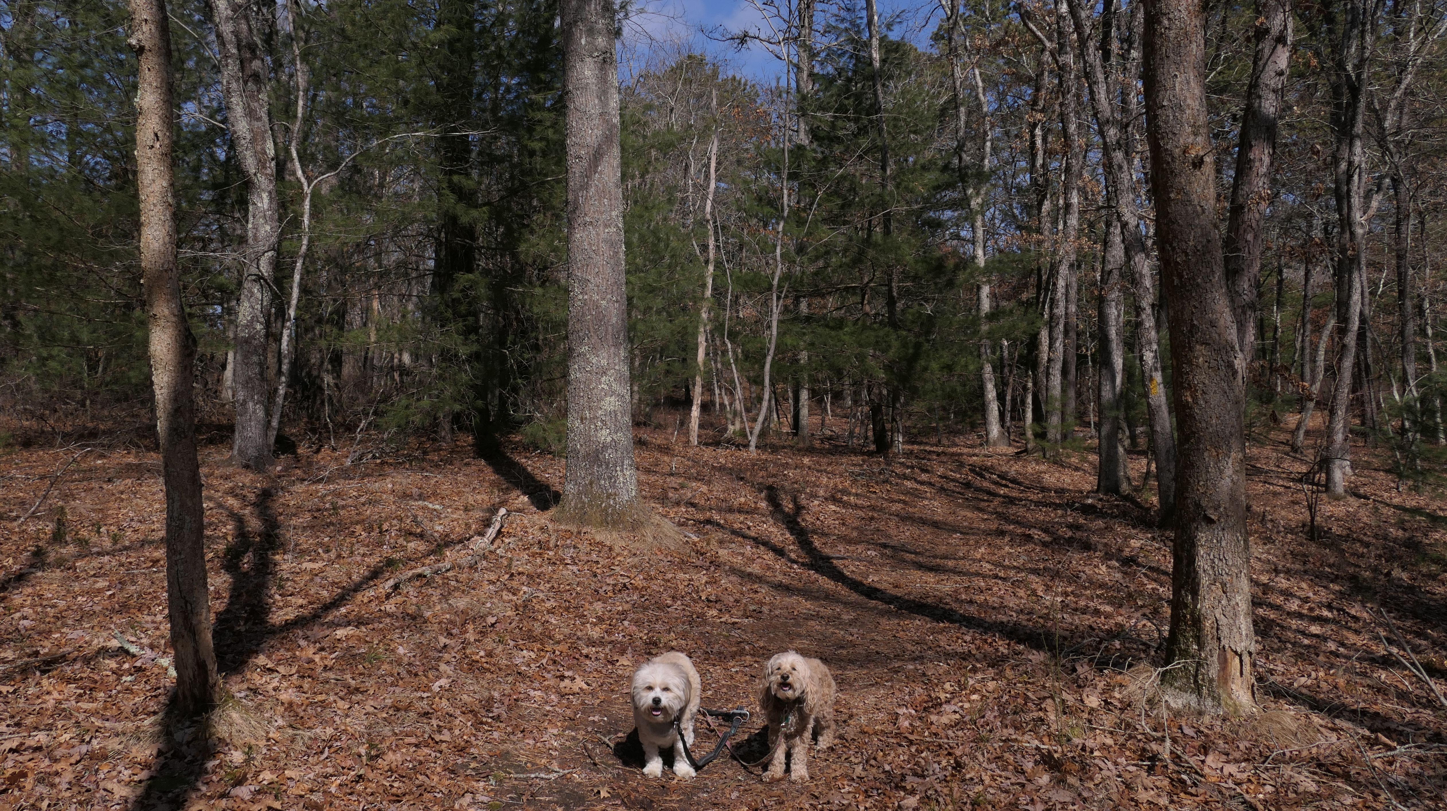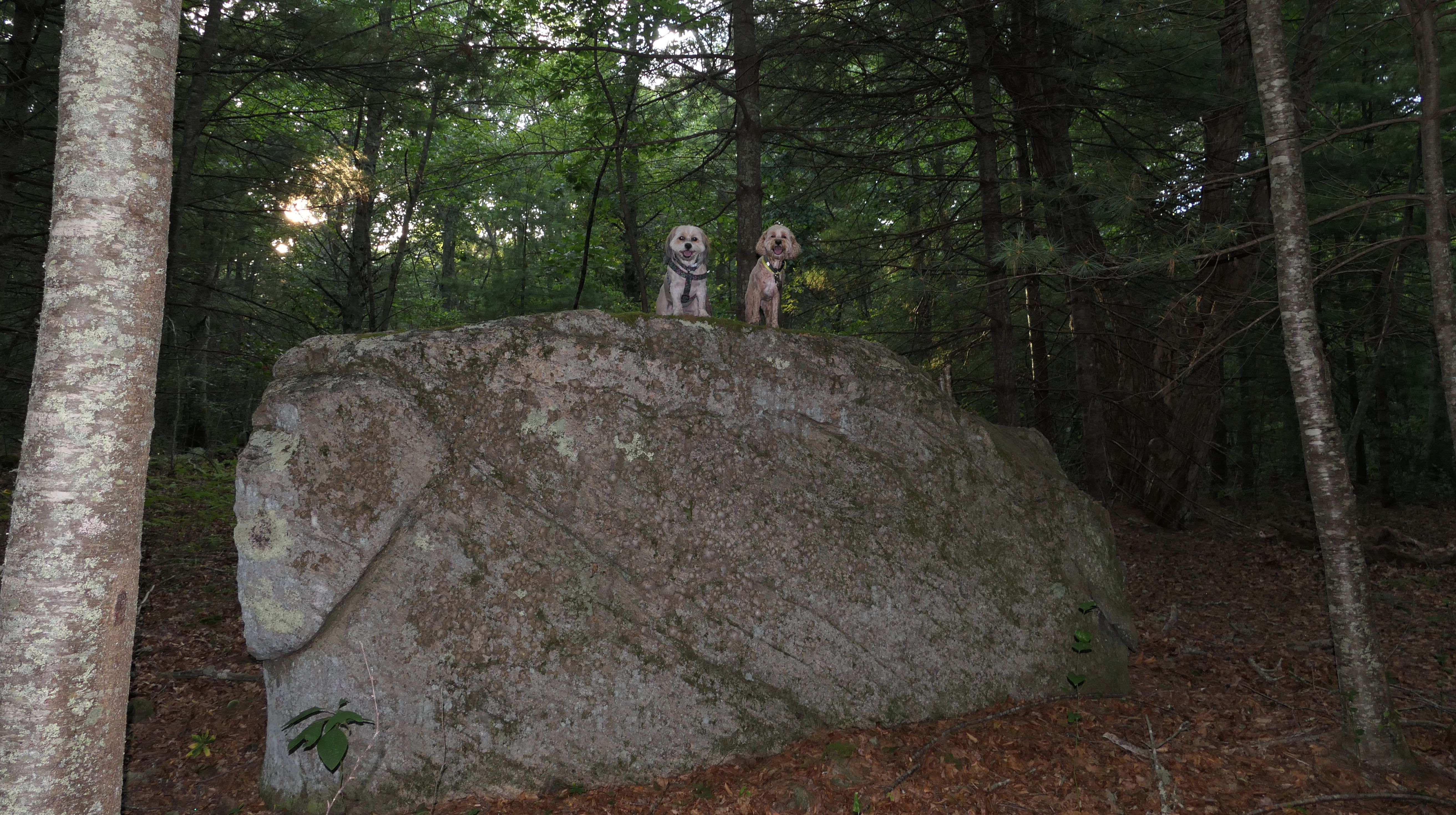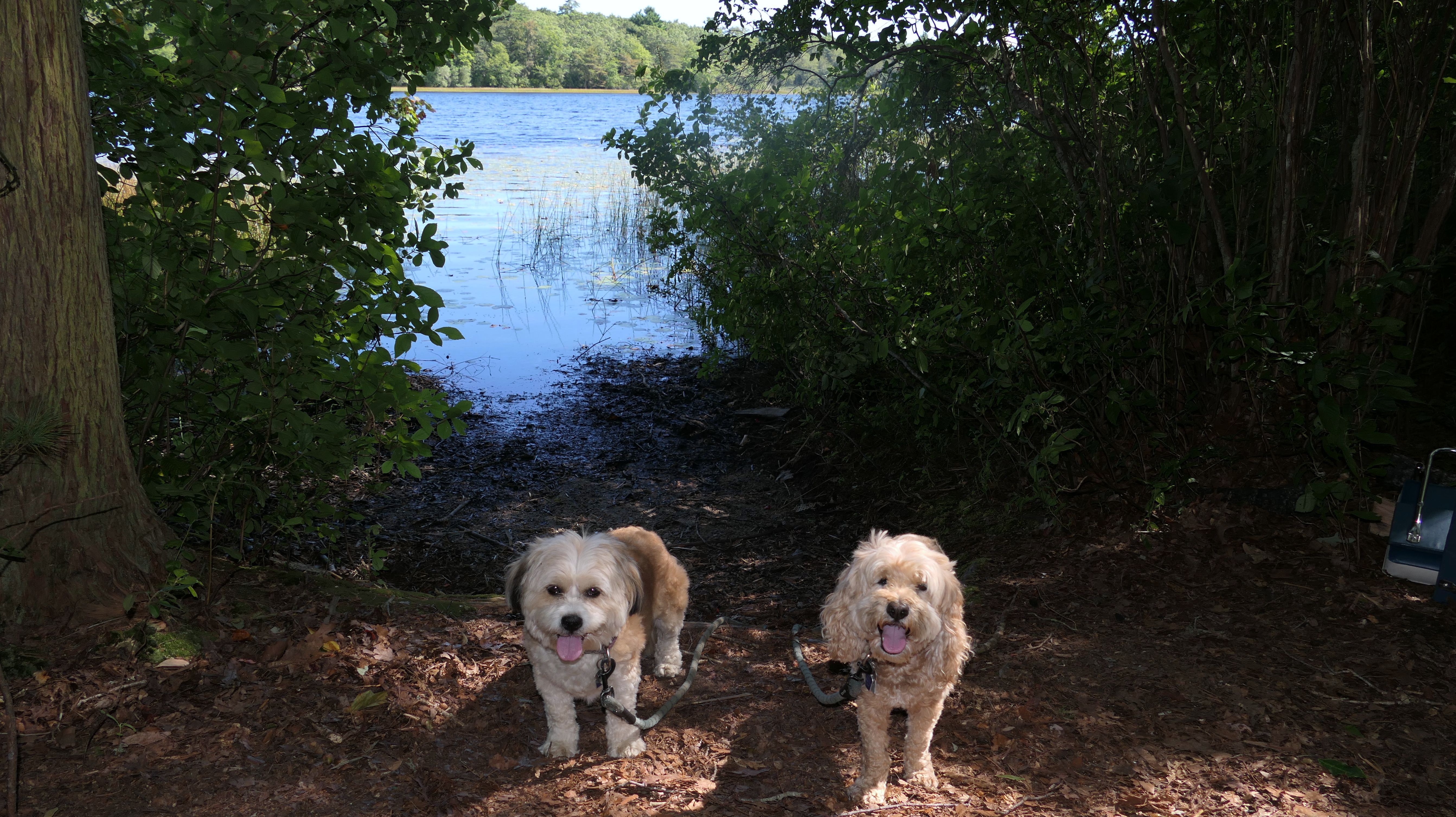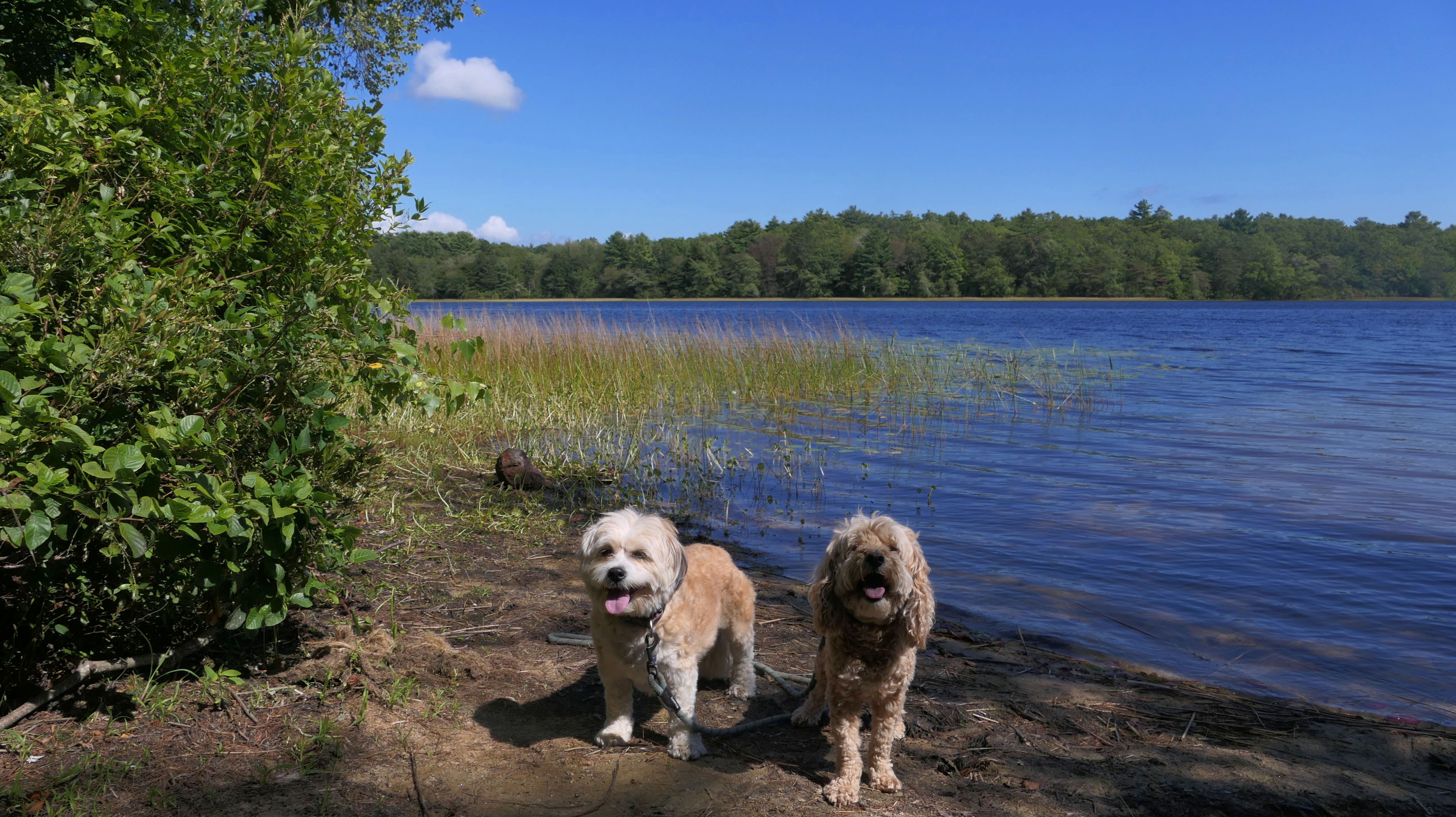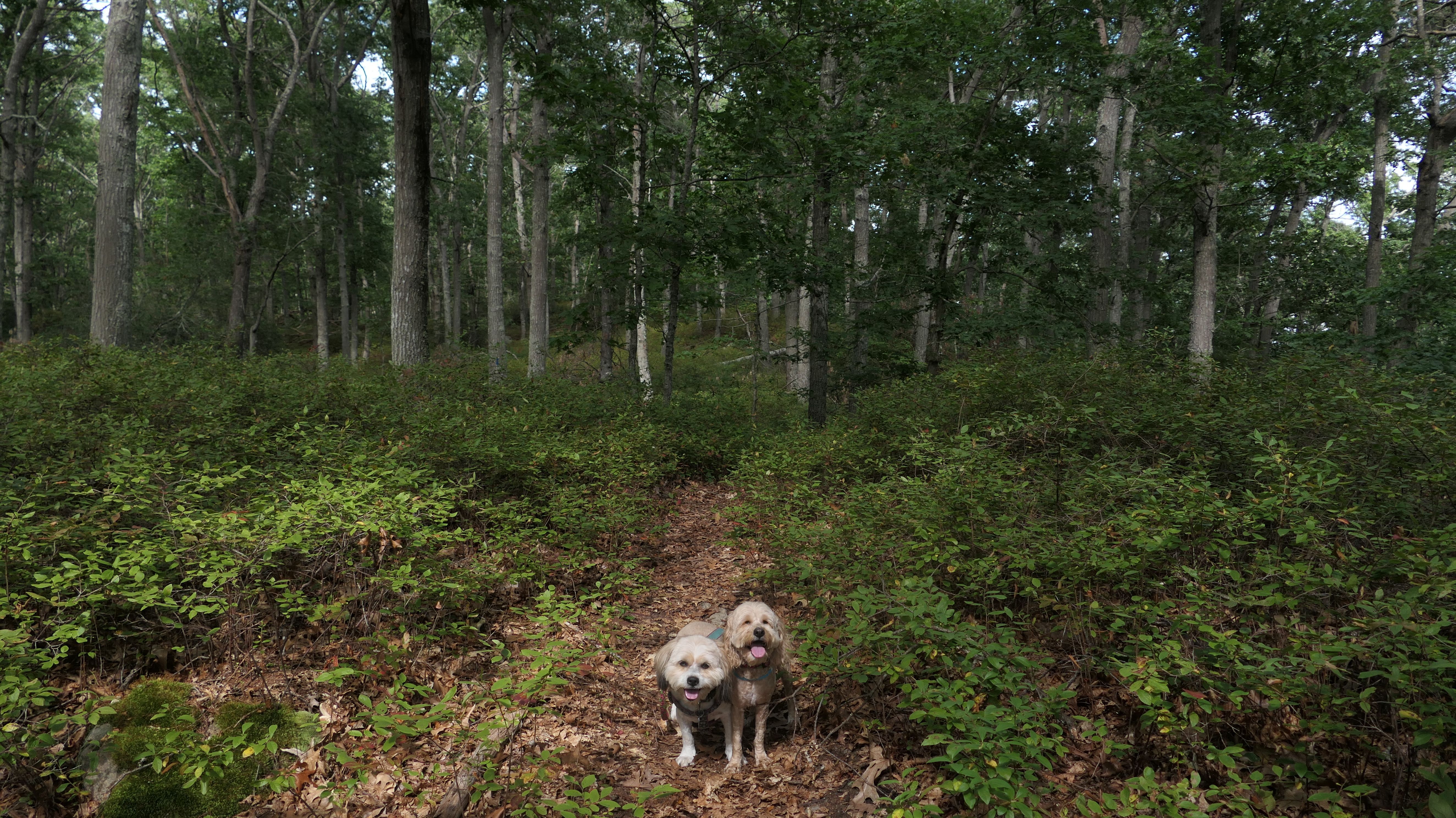 Initially, the GPS took me to the campground, and I don't think I can just park there, so I re-routed to the "picnic area". It's a nice spot, right on Watchaug Pond. (We visited the other side of the pond a couple of years ago). I didn't see any trails or anything at the picnic area, and dogs are not allowed in the "beach" area, so we headed down the dirt road near the parking area where we came across a trail that led to the pond west of the main beach. There's a vary narrow strip of beach between the heavy woods and the pond here, but we couldn't really walk any of it, because a family was all setup there and it was too difficult to get by. There must be a better section of the park to visit, but instead of looking for it while we were losing daylight, since it was a gorgeous evening I decided to just take the dogs to a real beach instead.