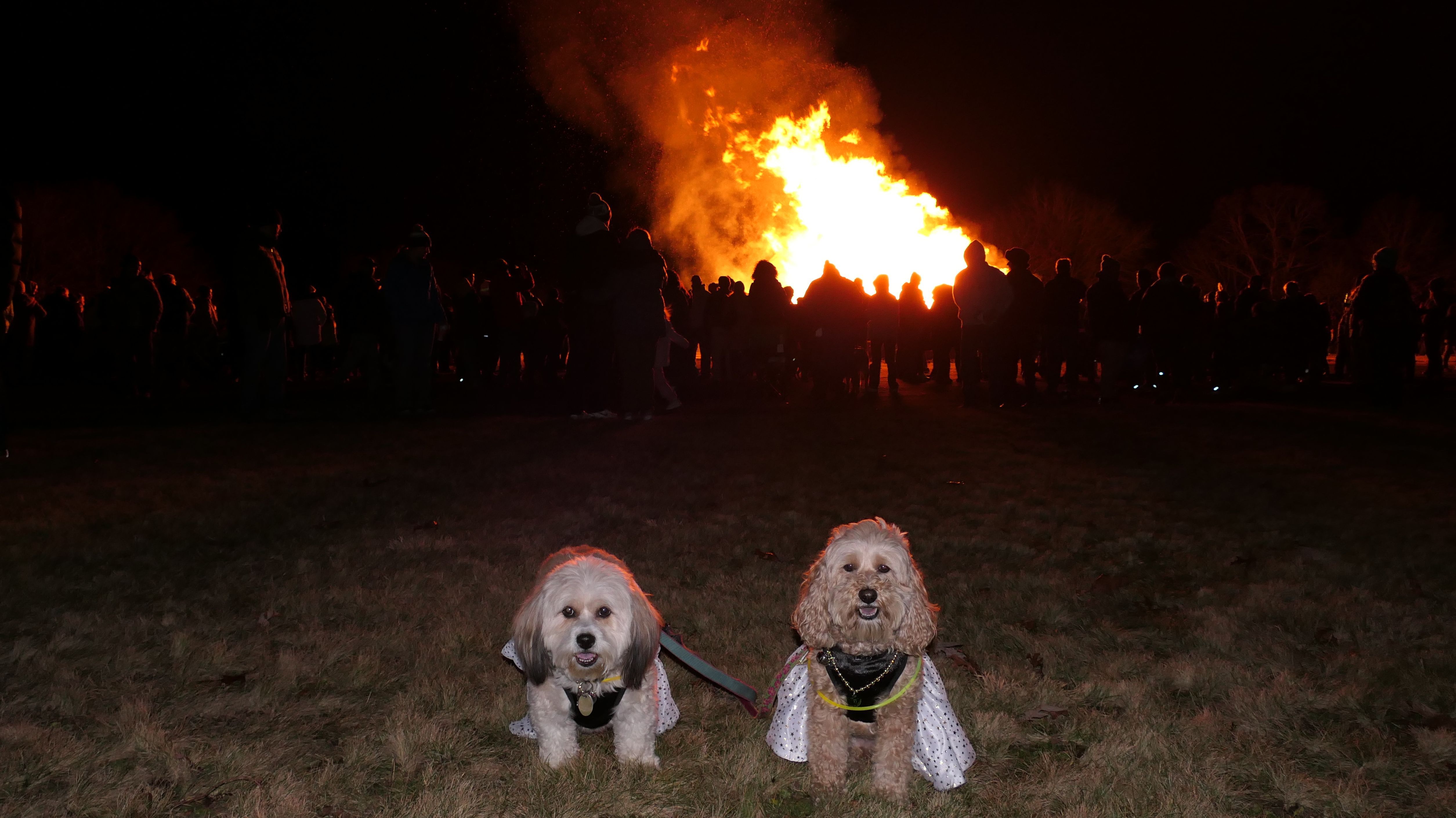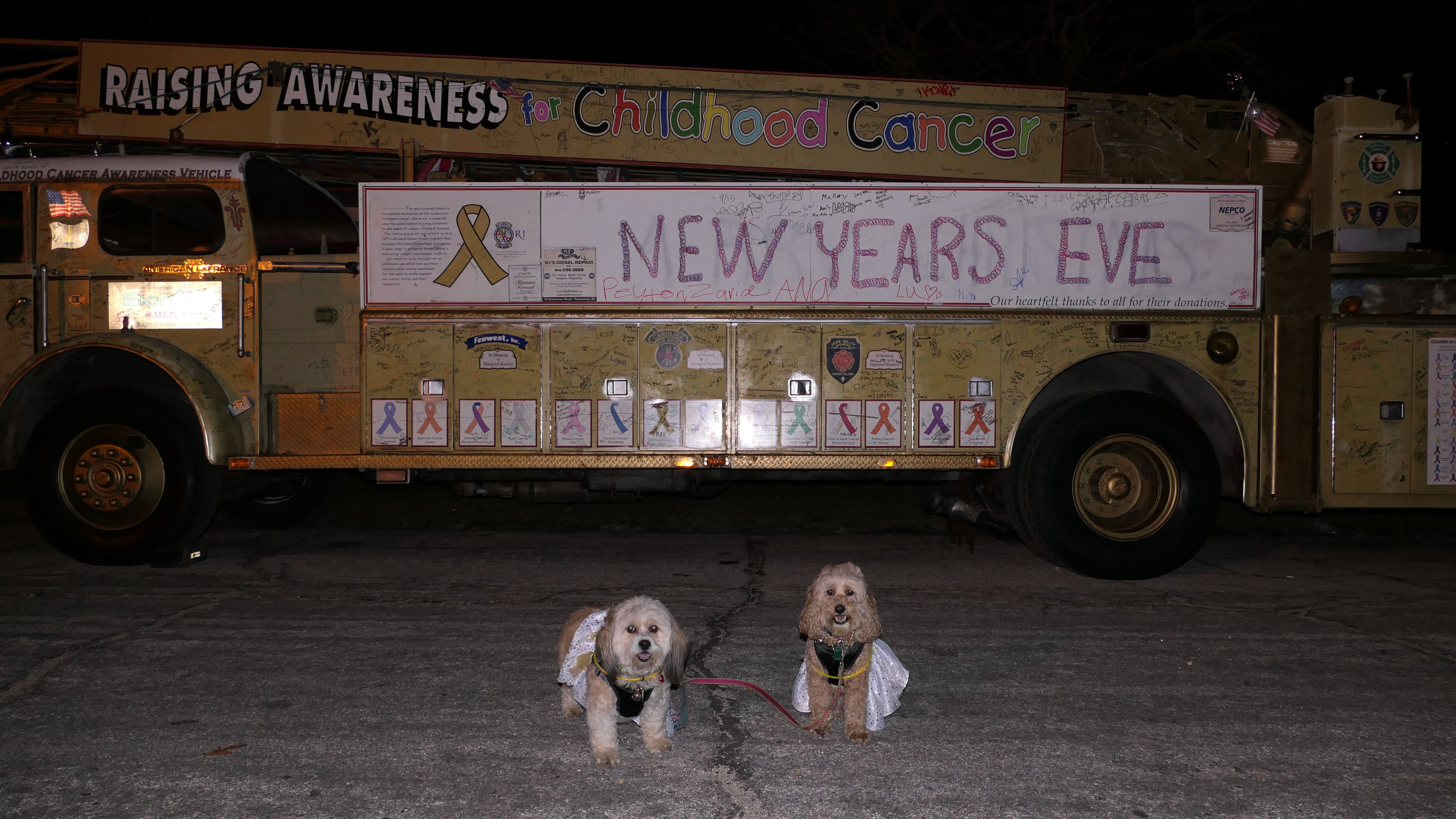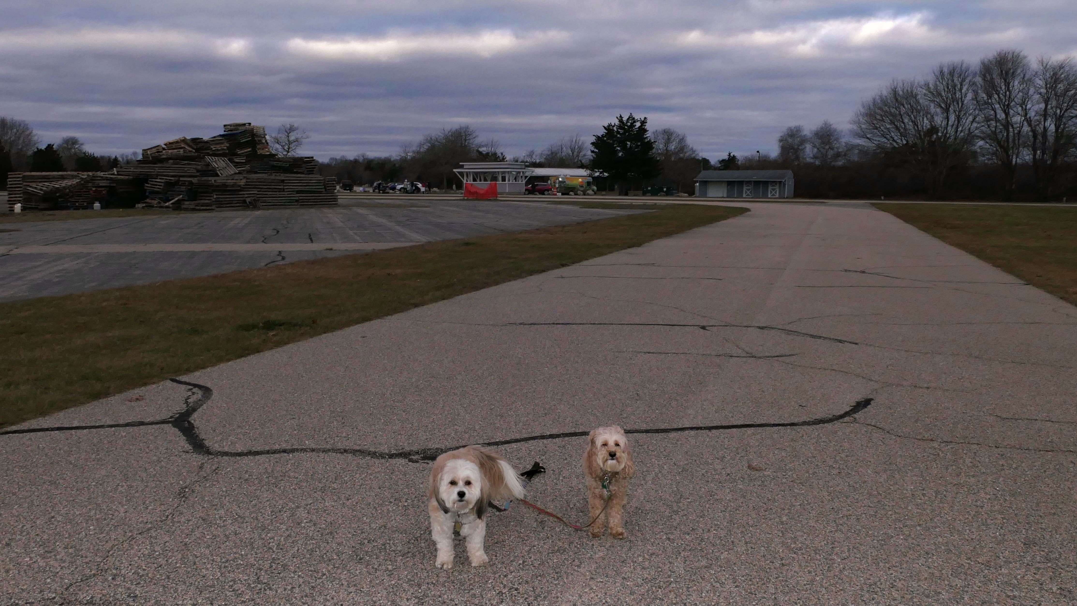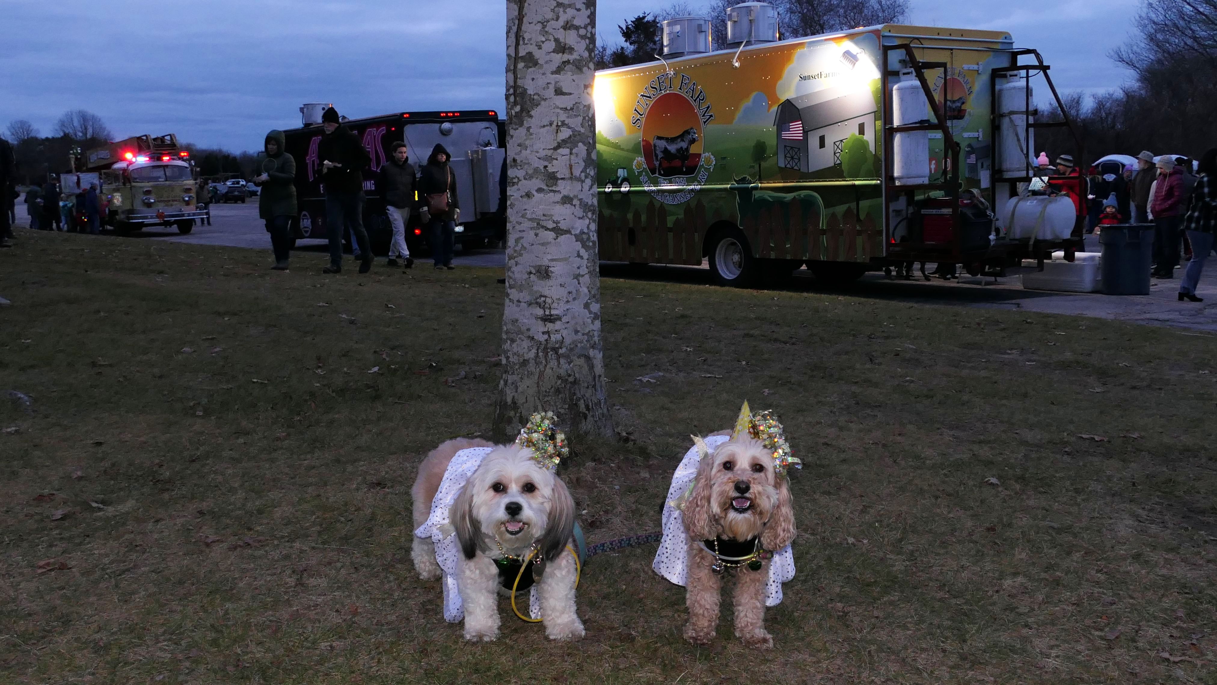 One final trip to Rhode Island to end the year. We attended the annual Charlestown New Years Eve Bonfire at Ninigret Park. We originally planned to visit a beach first, but the forecasted sun never came out, so we just went to the park and walked the 2.5 mile paved bike trail instead. The event started around 3PM, and they lit the fire at 5PM. The event was fun, but wasn't well organized. As you can see, the dogs were ready for the costume contest, but it wasn't clear how to enter, when the contest was, or who even wound up winning. Besides the bonfire, there was also a band and food trucks. There was only two food trucks, and a ton of people so the lines were very long. I think we waited about an hour to get chicken sandwiches. There was also only two port-a-potties. I'm not sure they planned on so many people. The fire was very high when it started (we were still in line), but we took some pictures and got real close as the fire burned down and the people started to file out. It was pretty much over by 7PM. It was a fun and different way to celebrate New Years Eve at a dog friendly event.
