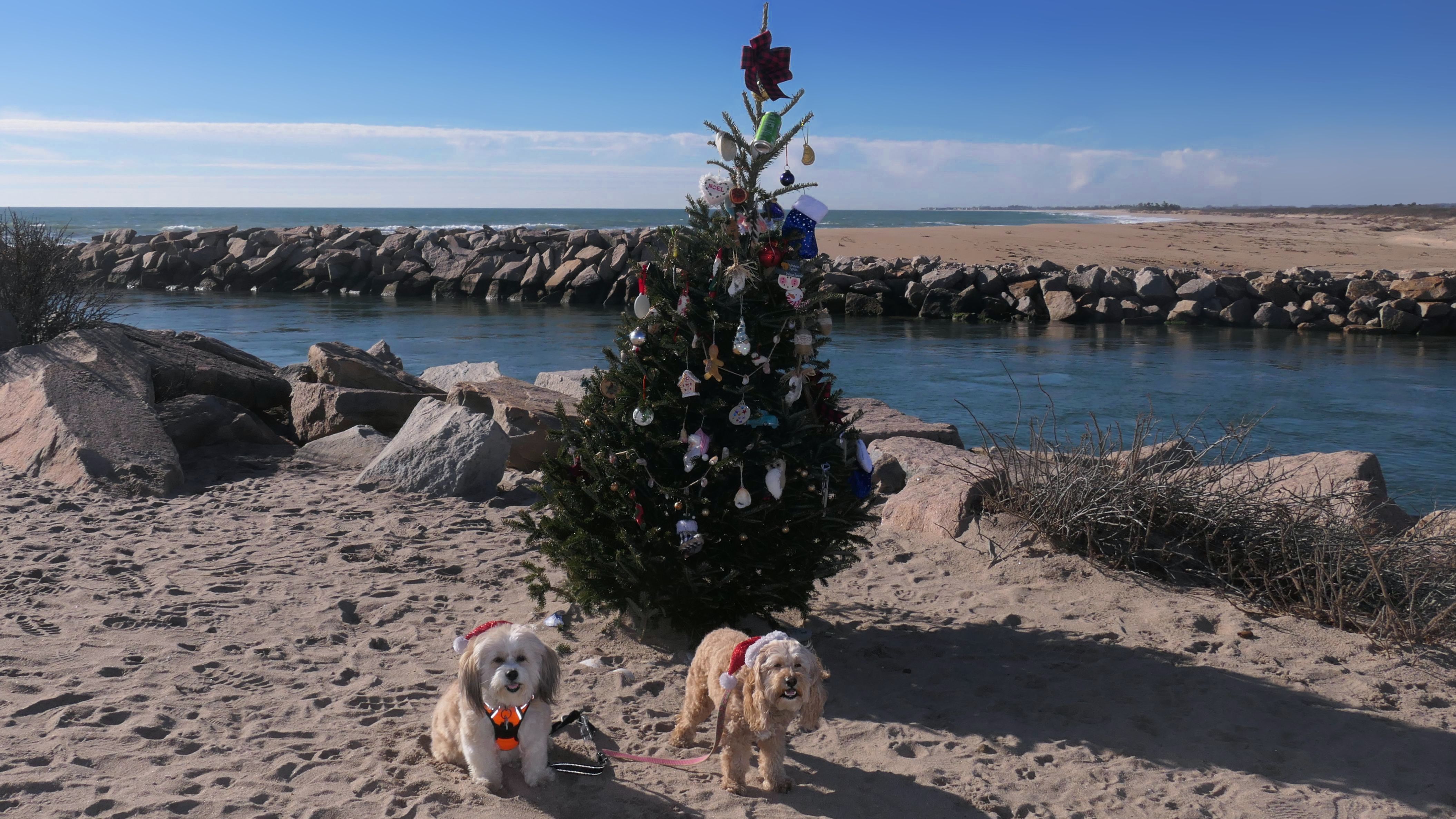 We've actually been to the "beach" part of the state park a few times. Since the beach section of the state park is small, and we've always accessed this area by walking from the town beach, I've always included any photos near the breachway in the Charlestown Town Beach section. This time, we actually explored the state park too. In addition to the beach, there is a campground, and a boat launch and fishing areas along the breachway. There was also a well decorated Christmas Tree here today, and Mandy and Lexi came prepared with their Santa hats.