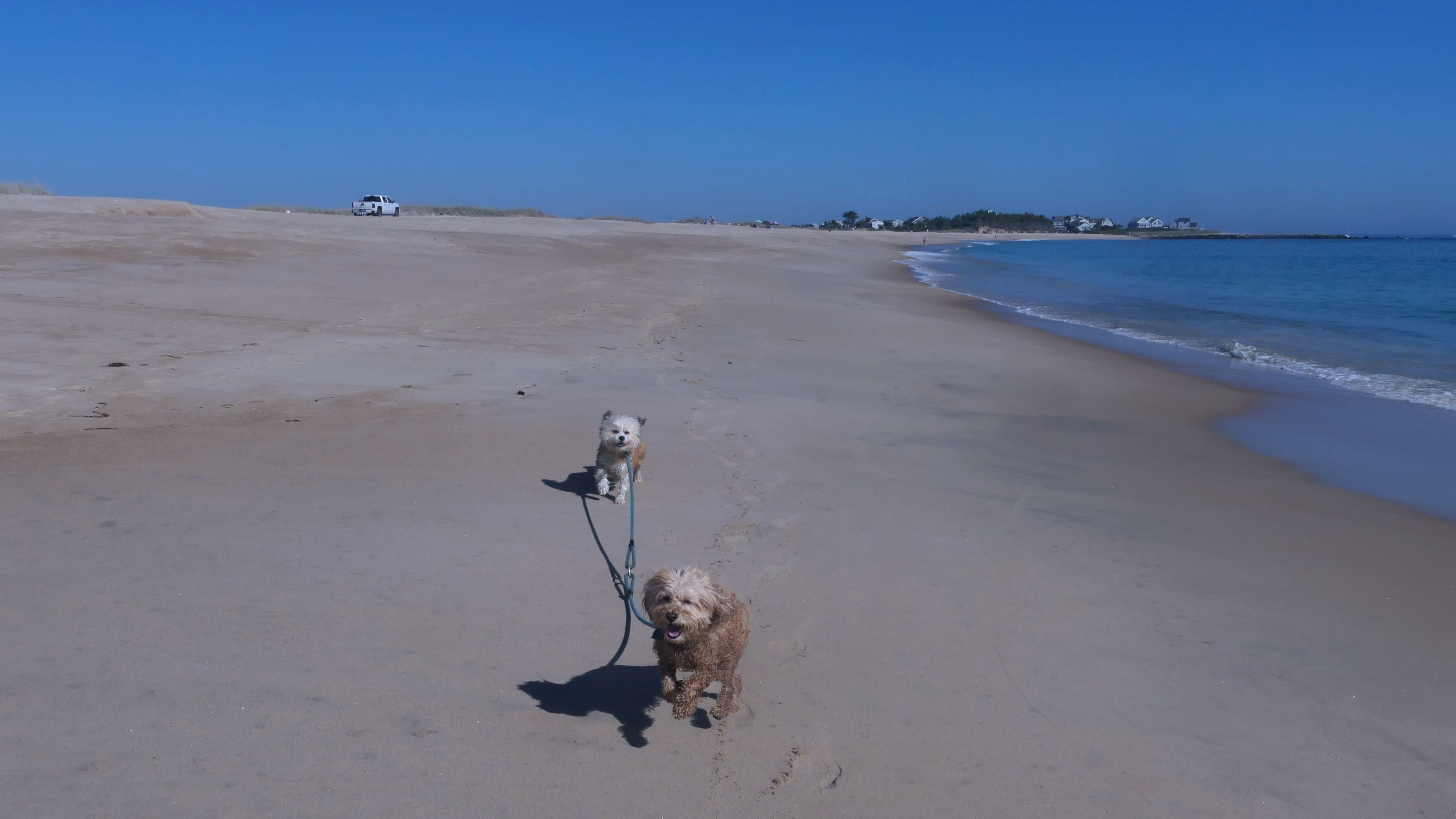 This is the Quonochontaug Beach portion of our walk that started and ended at Weekapaug Beach in Westerly. This is only the second time we made it here, and the first time we made it here on a summer-like day where we could enjoy the water. In addition to exploring the area along side the breachway, we found a section of the beach that was quiet enough where I was able to let the dogs off-leash to play a bit. Lexi absolutely loves getting to run on the beach!