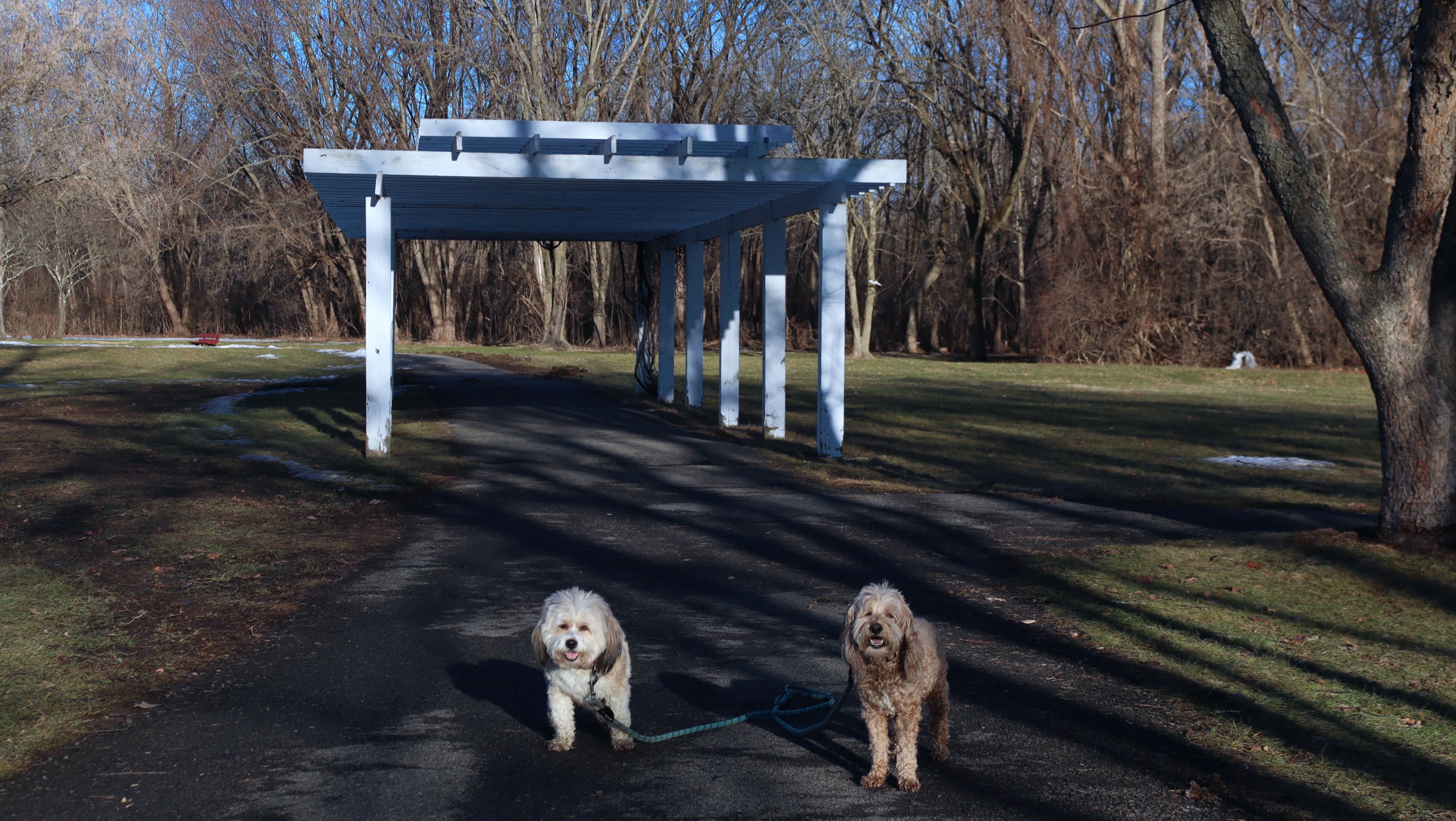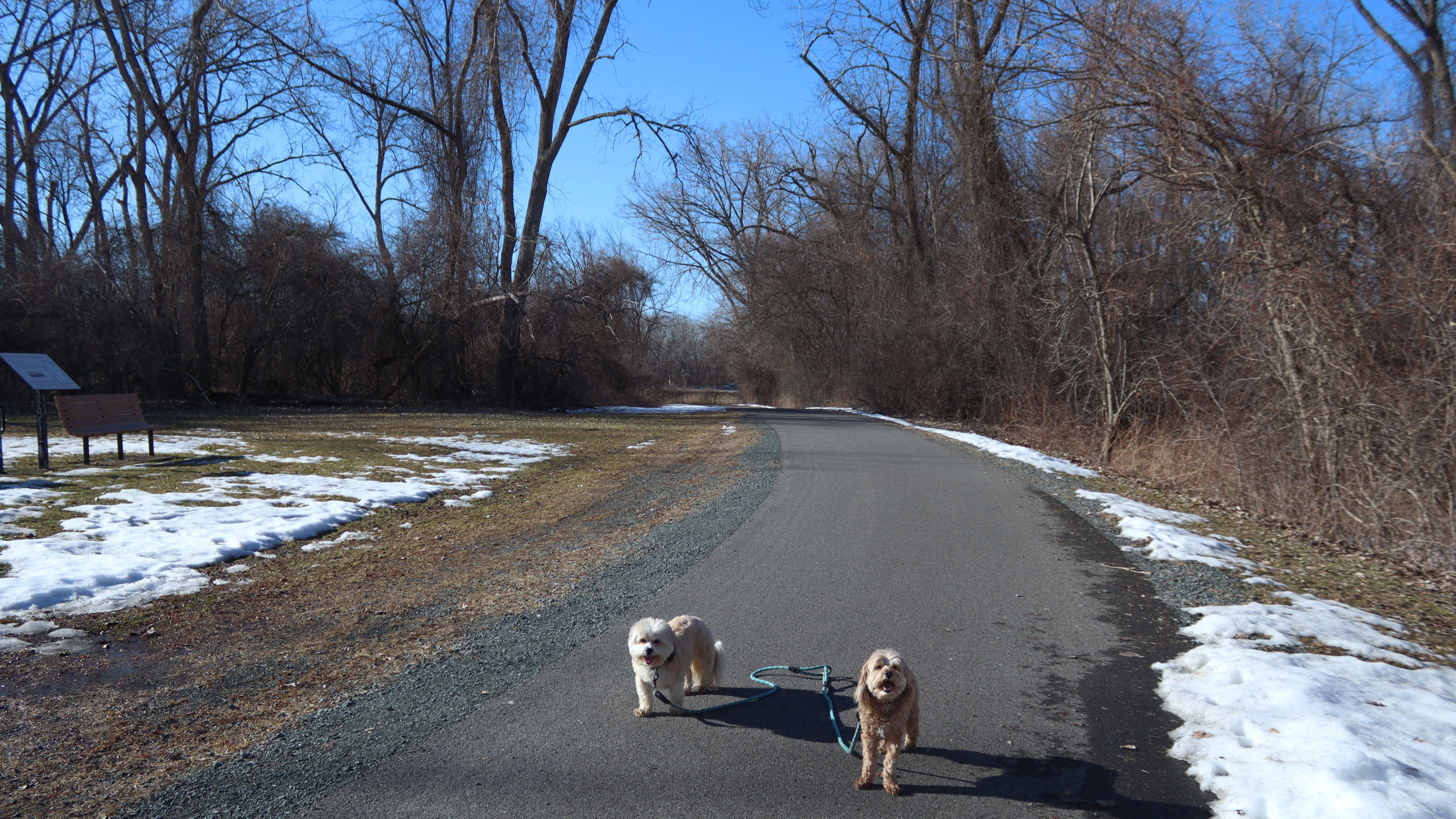 Looking at these pictures, it looks like we went to five different places. There are numerous varied landscapes here on these really interesting trails. We have some wide open fields, a busy stretch near a shopping area, a tree maze, a stretch that passes some farm land with cows grazing, and some wooded sections, along with a cool long bridge over some marsh land. The trails are mostly paved, and are very flat. We walked four miles here. My favorite part was when the trails passed by the small body of water that was named on my map, "The Lake". There is one picture of the dogs in front of the lake that featured ducks, geese, a turtle and even a visible fish in the water! We've been having a stretch of great weather lately, and this was no different. It was in the upper 70's here with low humidity. It is a good thing too, because with the lack of shade on much of these trails, this would have been a no-go if it was any warmer. This was a very fun visit on a beautiful day!
