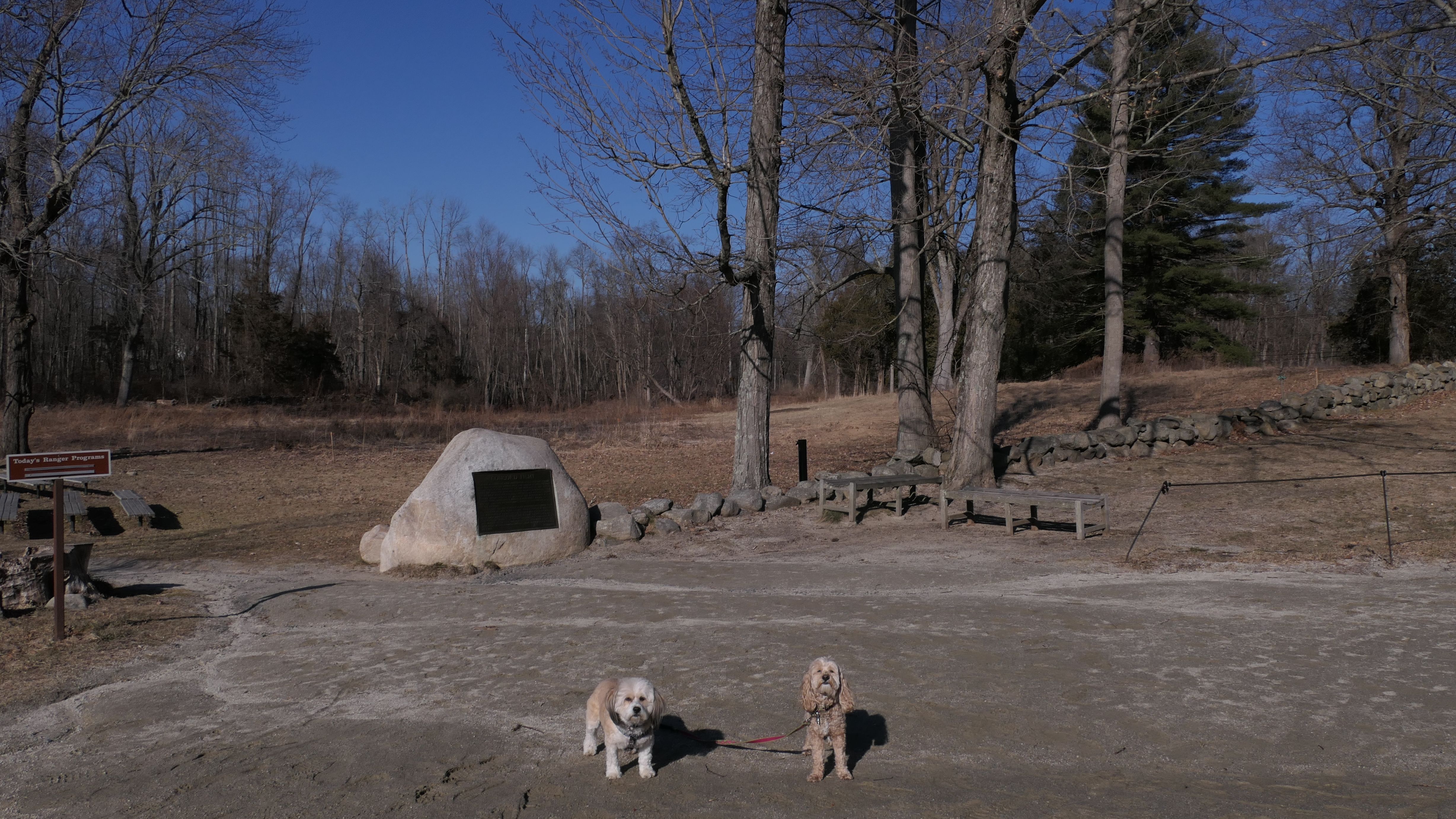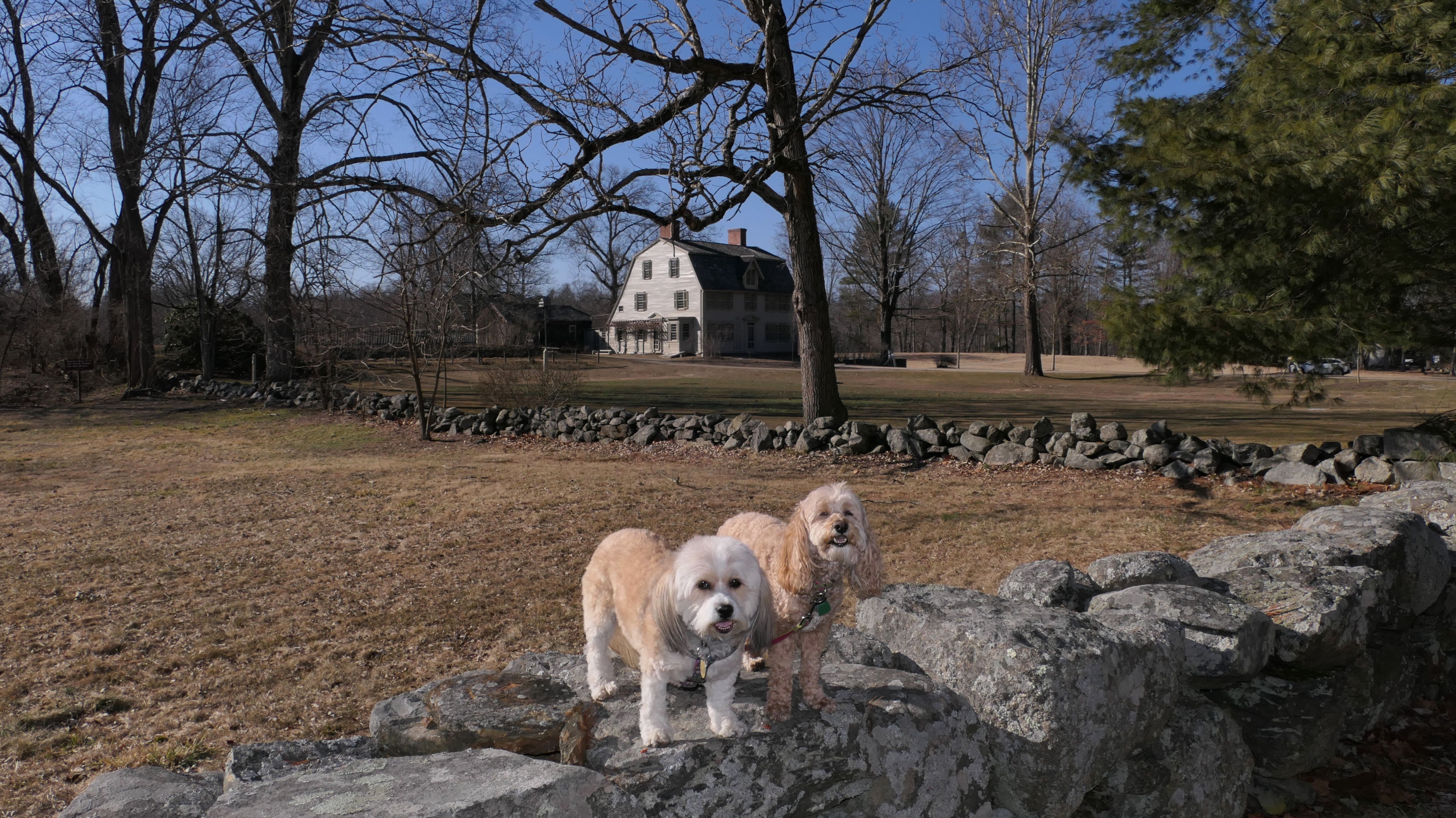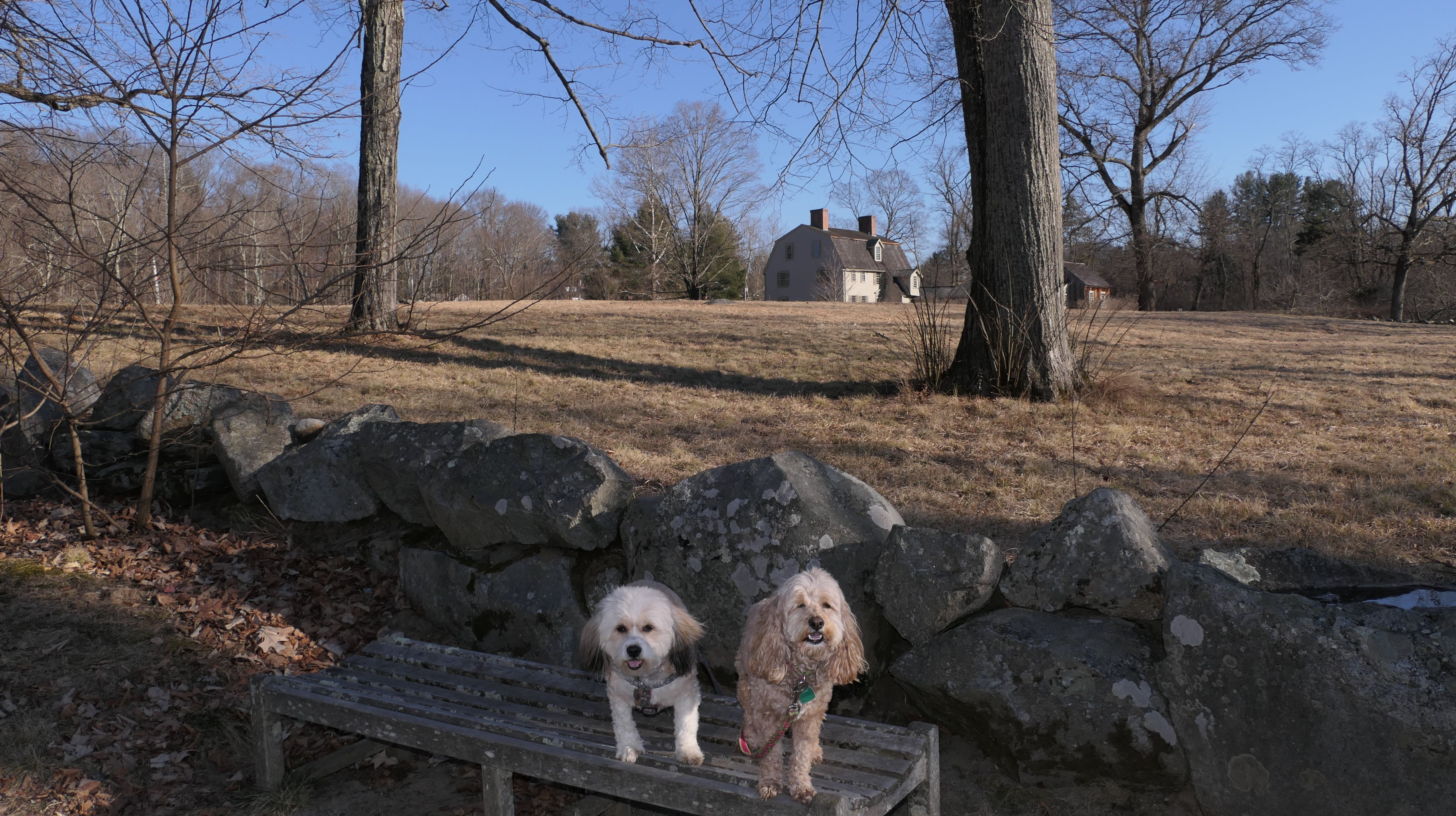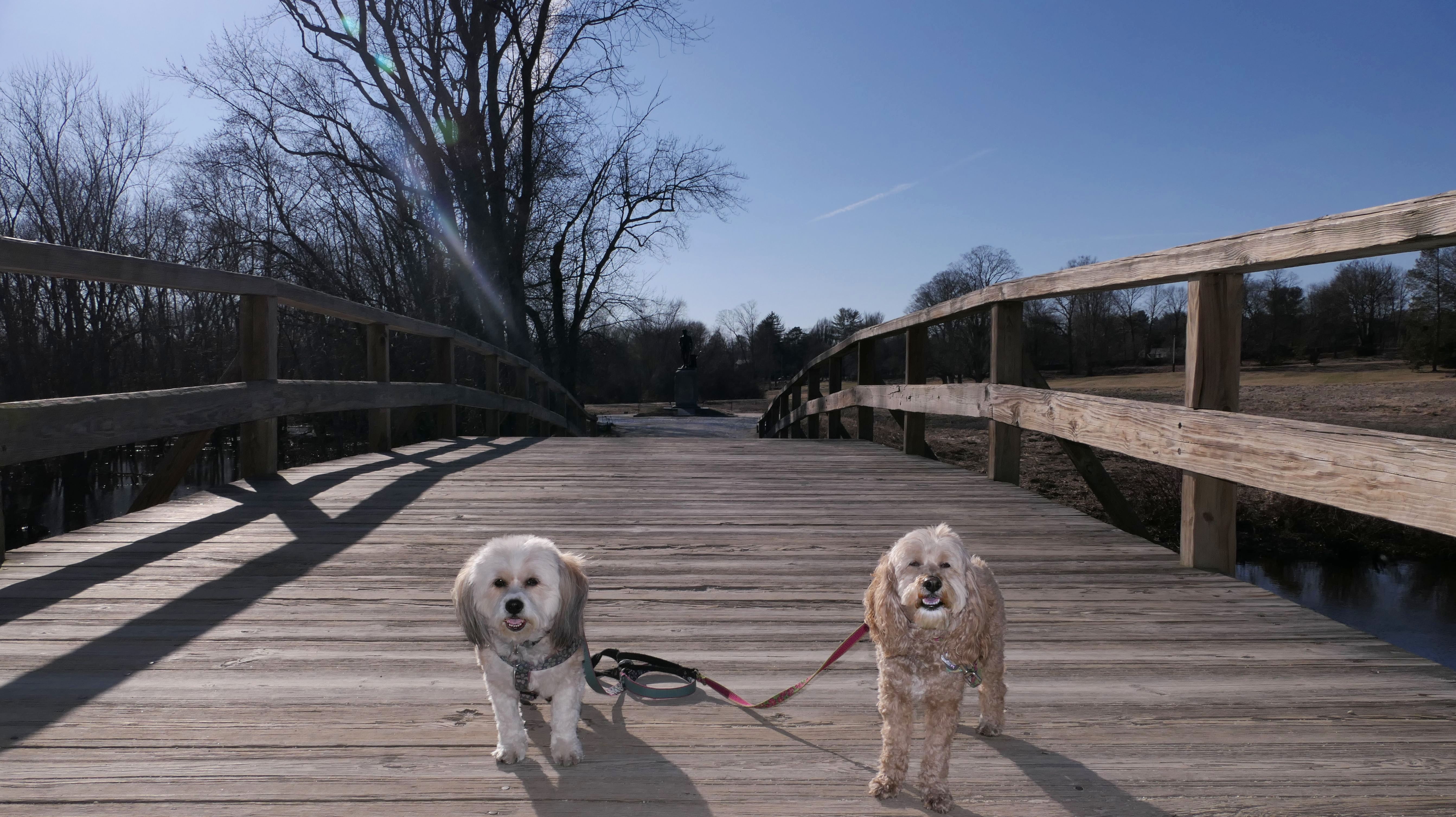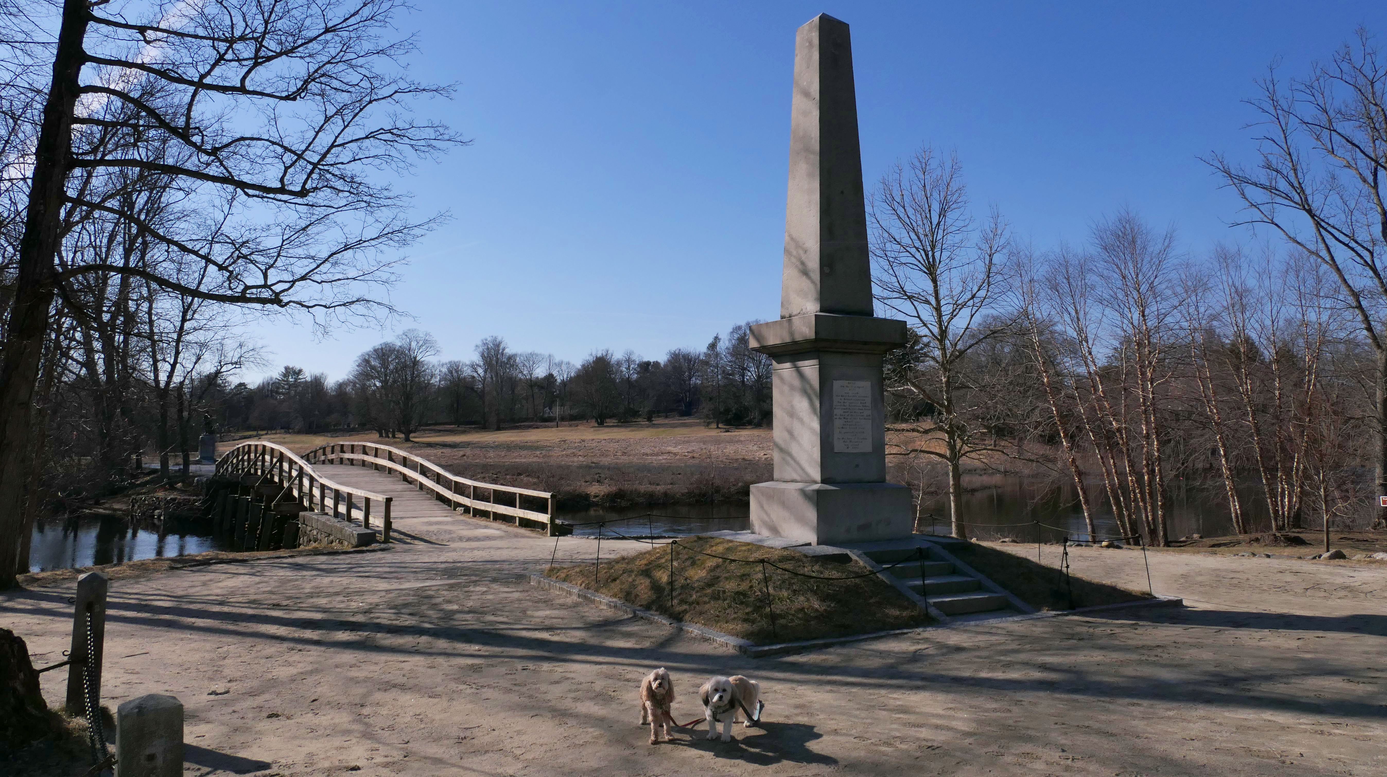 We walked here from Downtown Concord. The Minute Man National Historic Park is a large National Park with multiple sections. This is the section around the historic North Bridge. This is the site of one of the earliest battles of the Revolutionary War. The bridge is a replica of the original bridge, built in 1956. There's a stone dust trail that leads up a hill up to the visitor's center. The trail was quite muddy in places, and it was hard to get a picture of the dogs in front of the famous statue here. The sun was directly behind the statues, and it was too muddy to take it from a different angle.