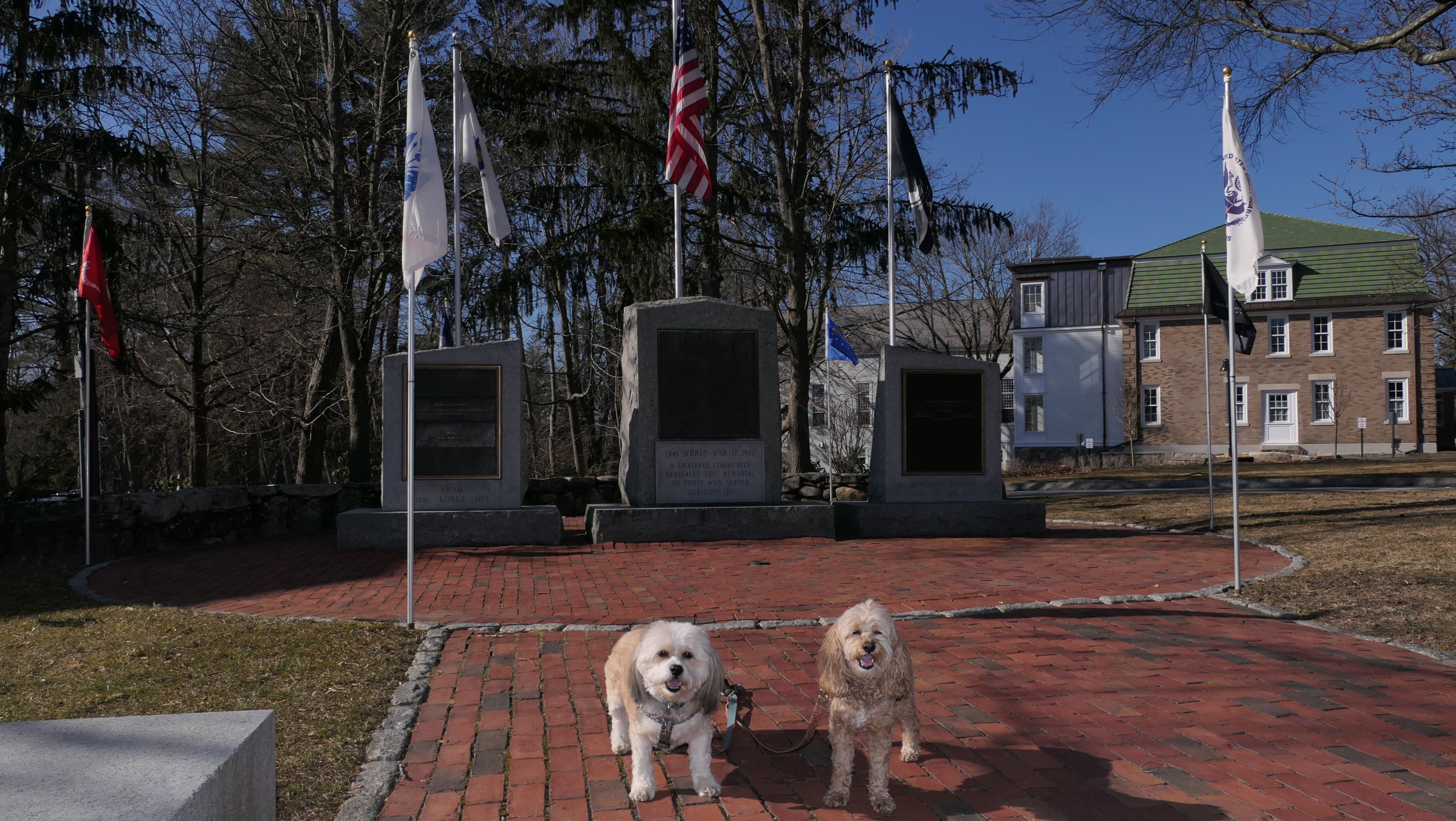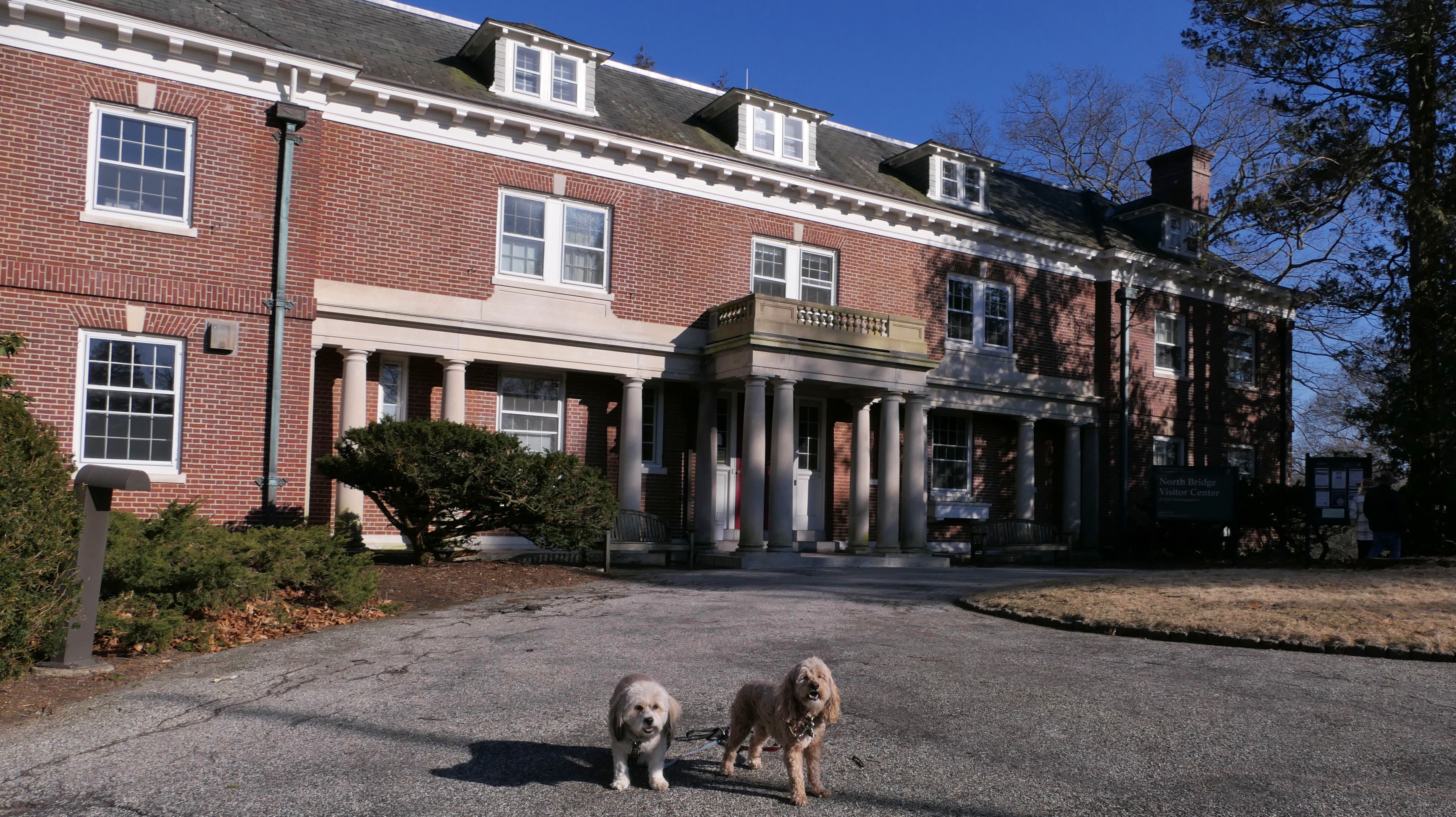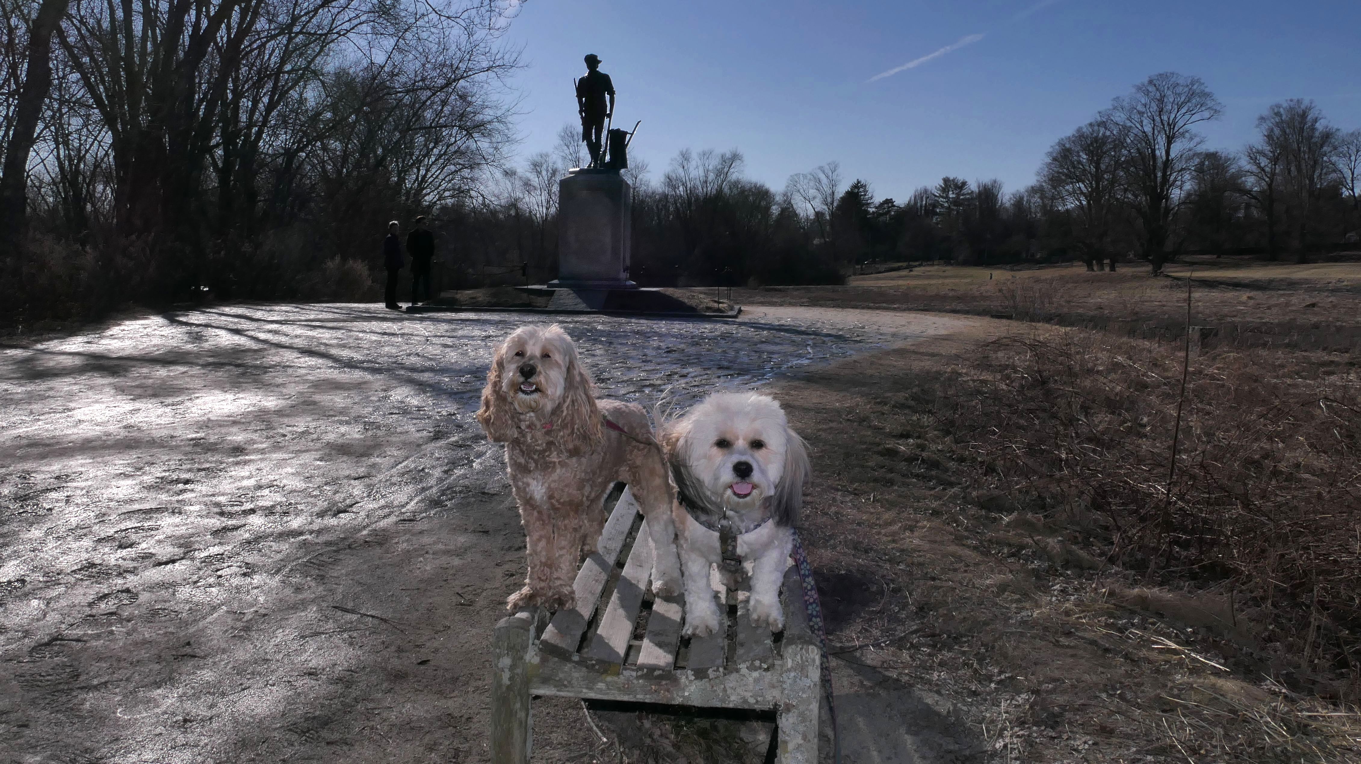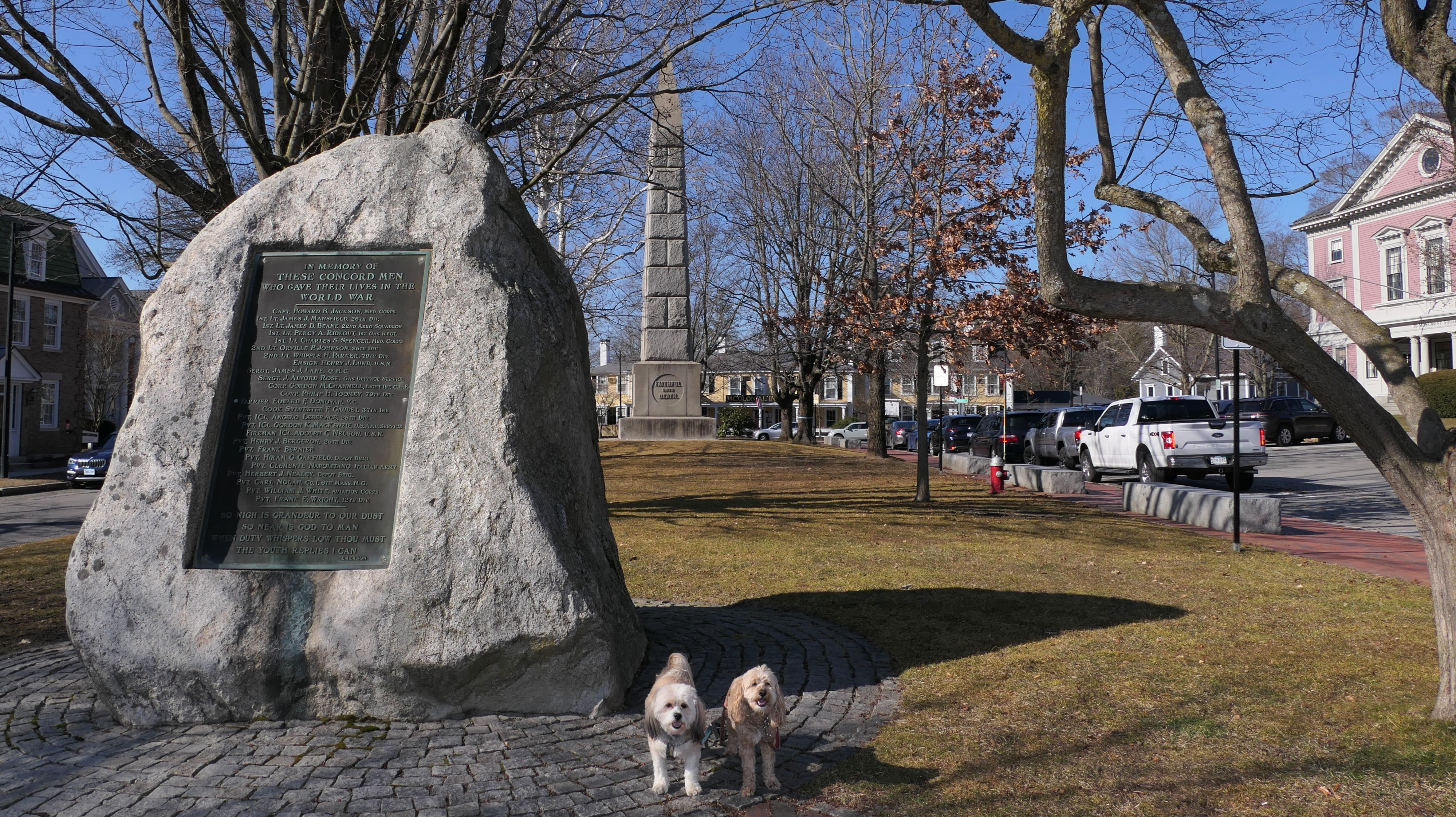 We walked here from Downtown Concord. The Minute Man National Historic Park is a large National Park with multiple sections. This is the section around the historic North Bridge. This is the site of one of the earliest battles of the Revolutionary War. The bridge is a replica of the original bridge, built in 1956. There's a stone dust trail that leads up a hill up to the visitor's center. The trail was quite muddy in places, and it was hard to get a picture of the dogs in front of the famous statue here. The sun was directly behind the statues, and it was too muddy to take it from a different angle.
