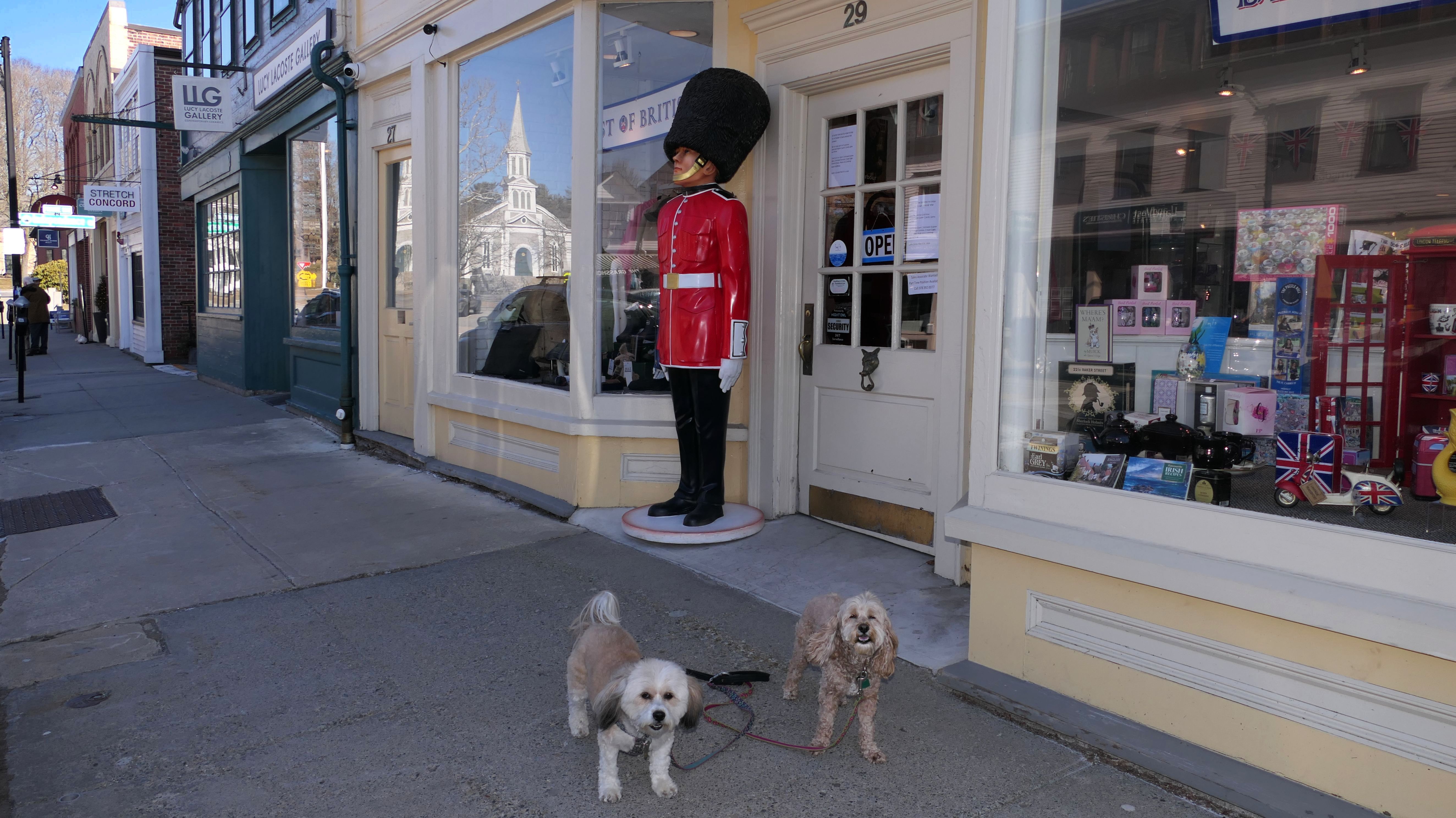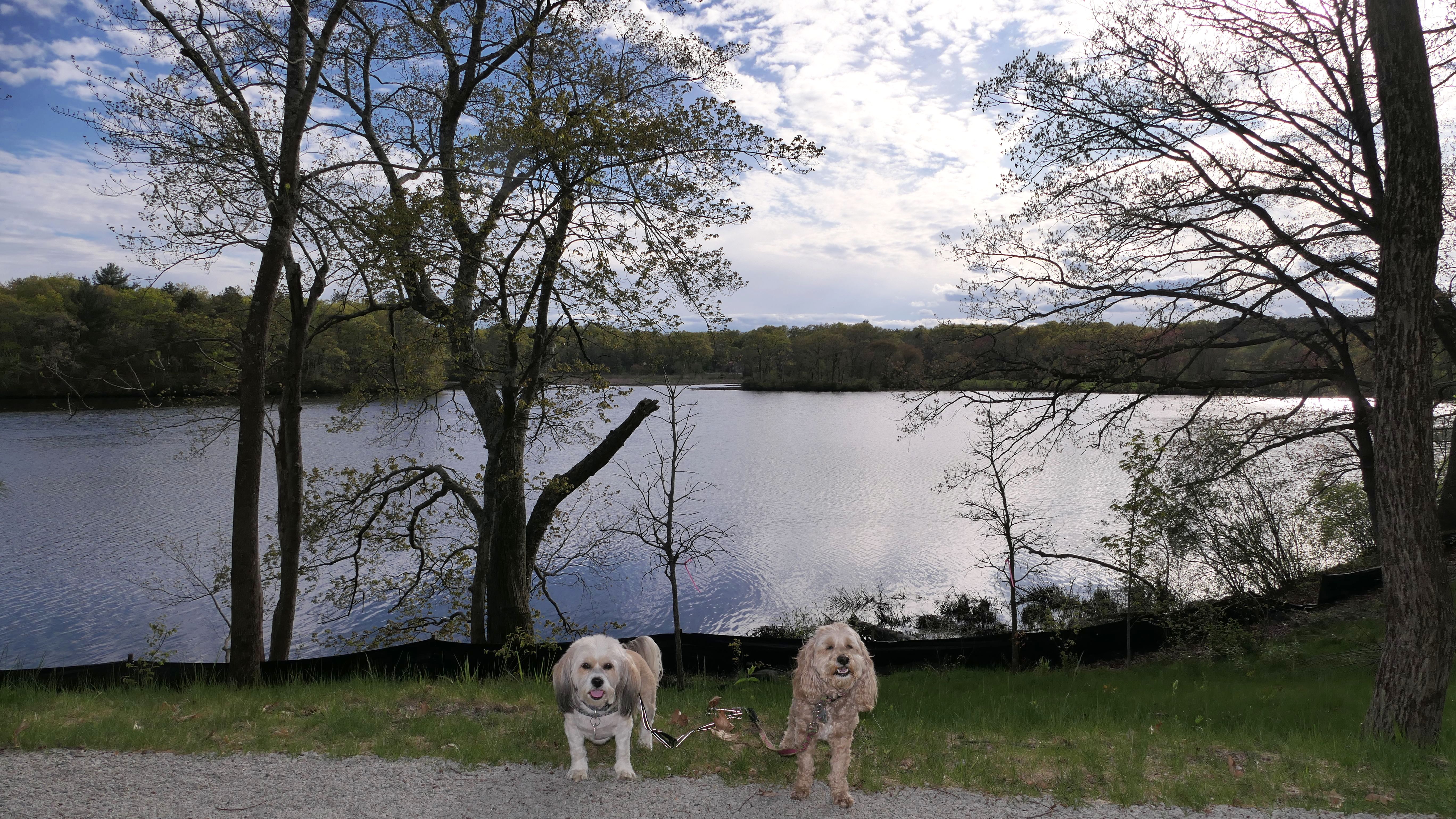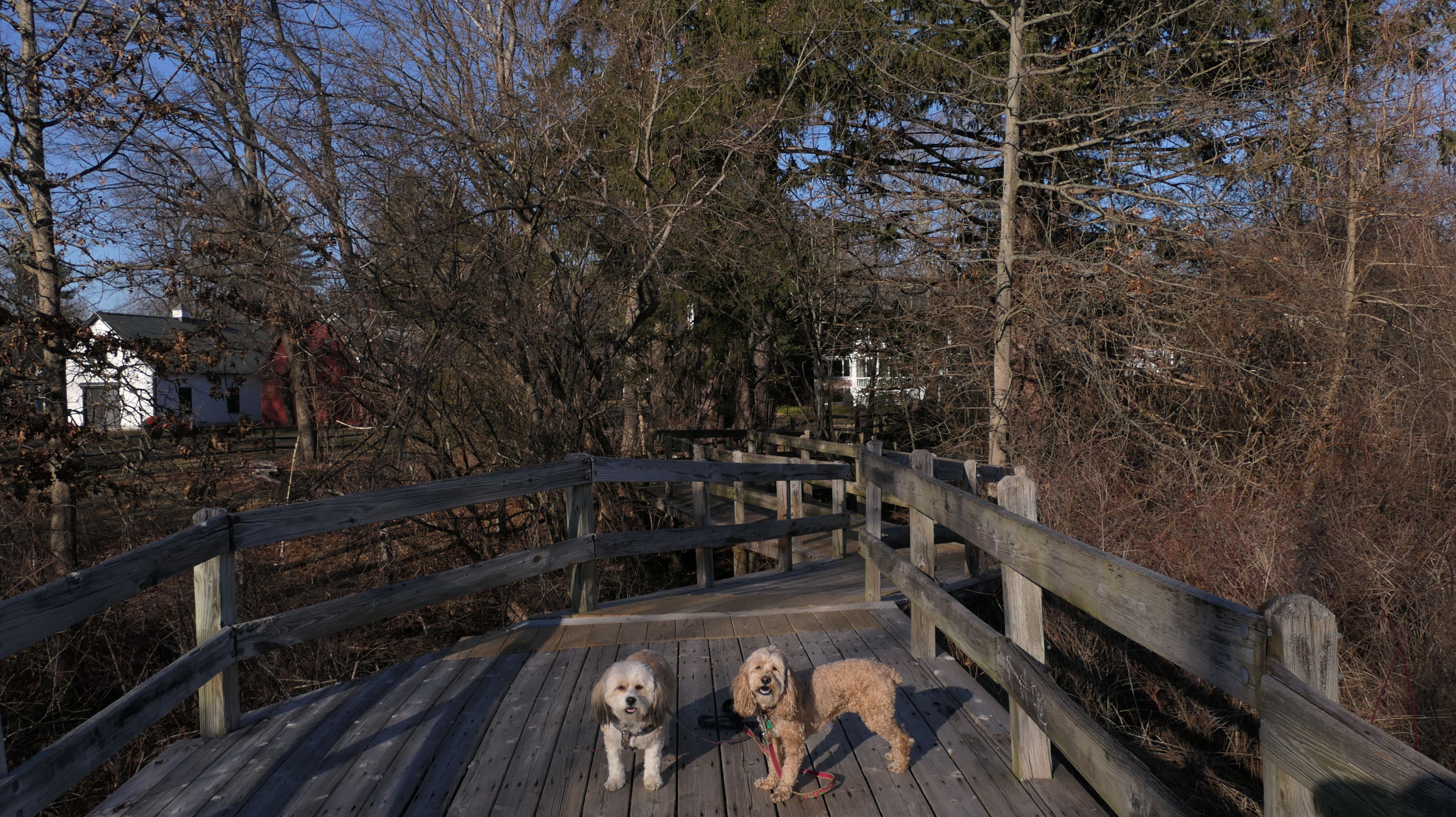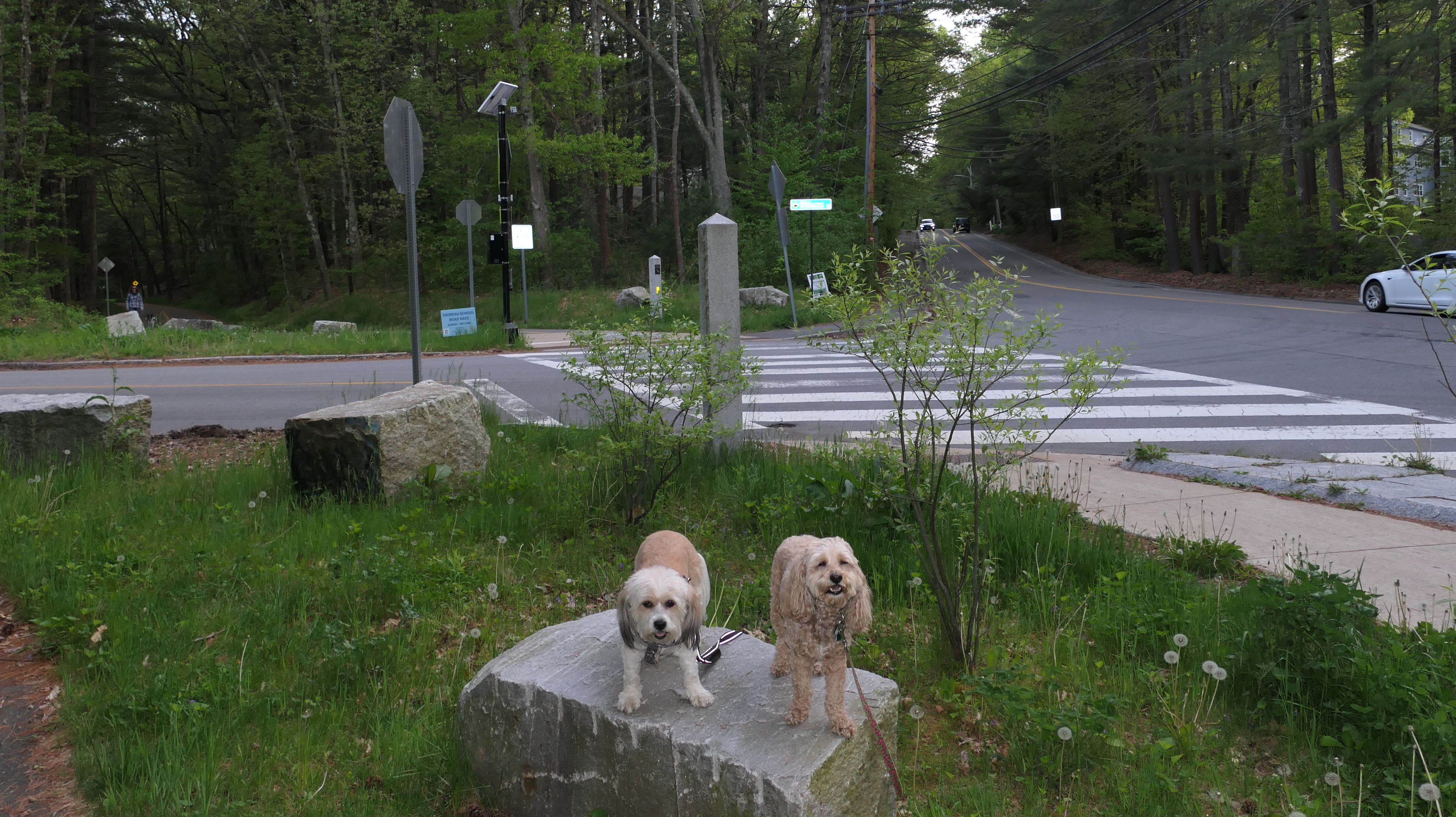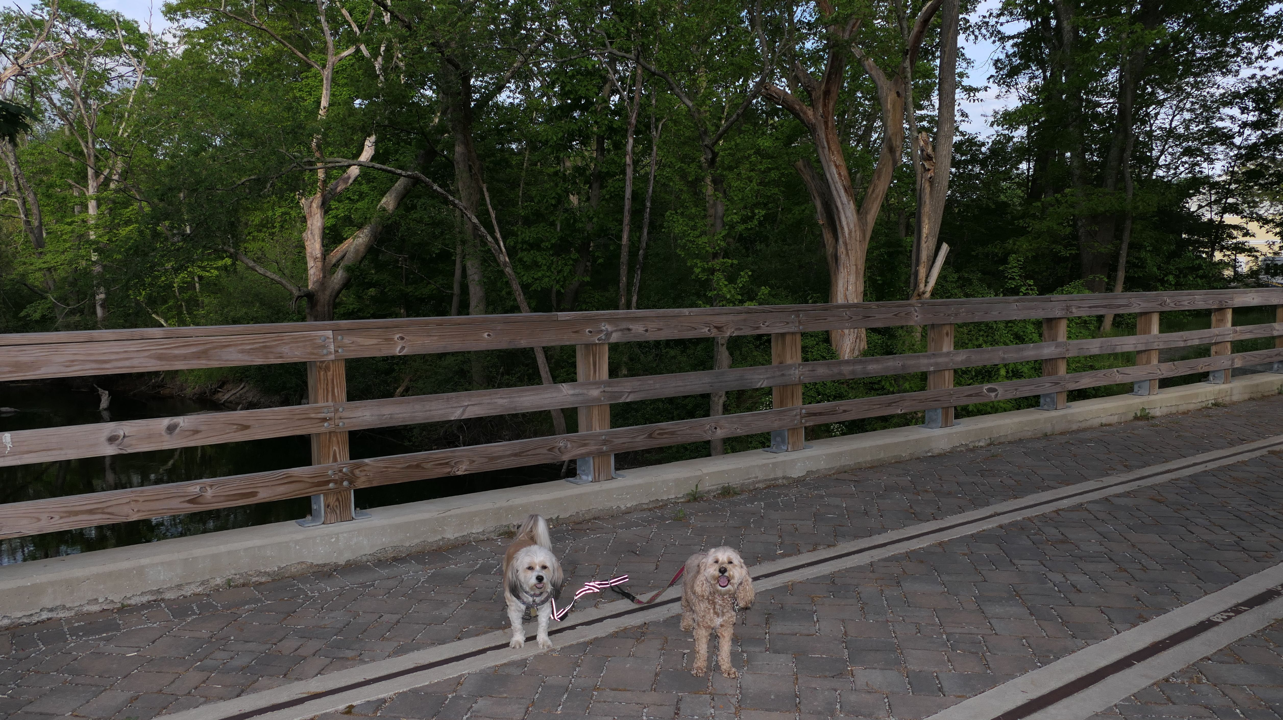 We walked here from Downtown Concord. The Minute Man National Historic Park is a large National Park with multiple sections. This is the section around the historic North Bridge. This is the site of one of the earliest battles of the Revolutionary War. The bridge is a replica of the original bridge, built in 1956. There's a stone dust trail that leads up a hill up to the visitor's center. The trail was quite muddy in places, and it was hard to get a picture of the dogs in front of the famous statue here. The sun was directly behind the statues, and it was too muddy to take it from a different angle.
