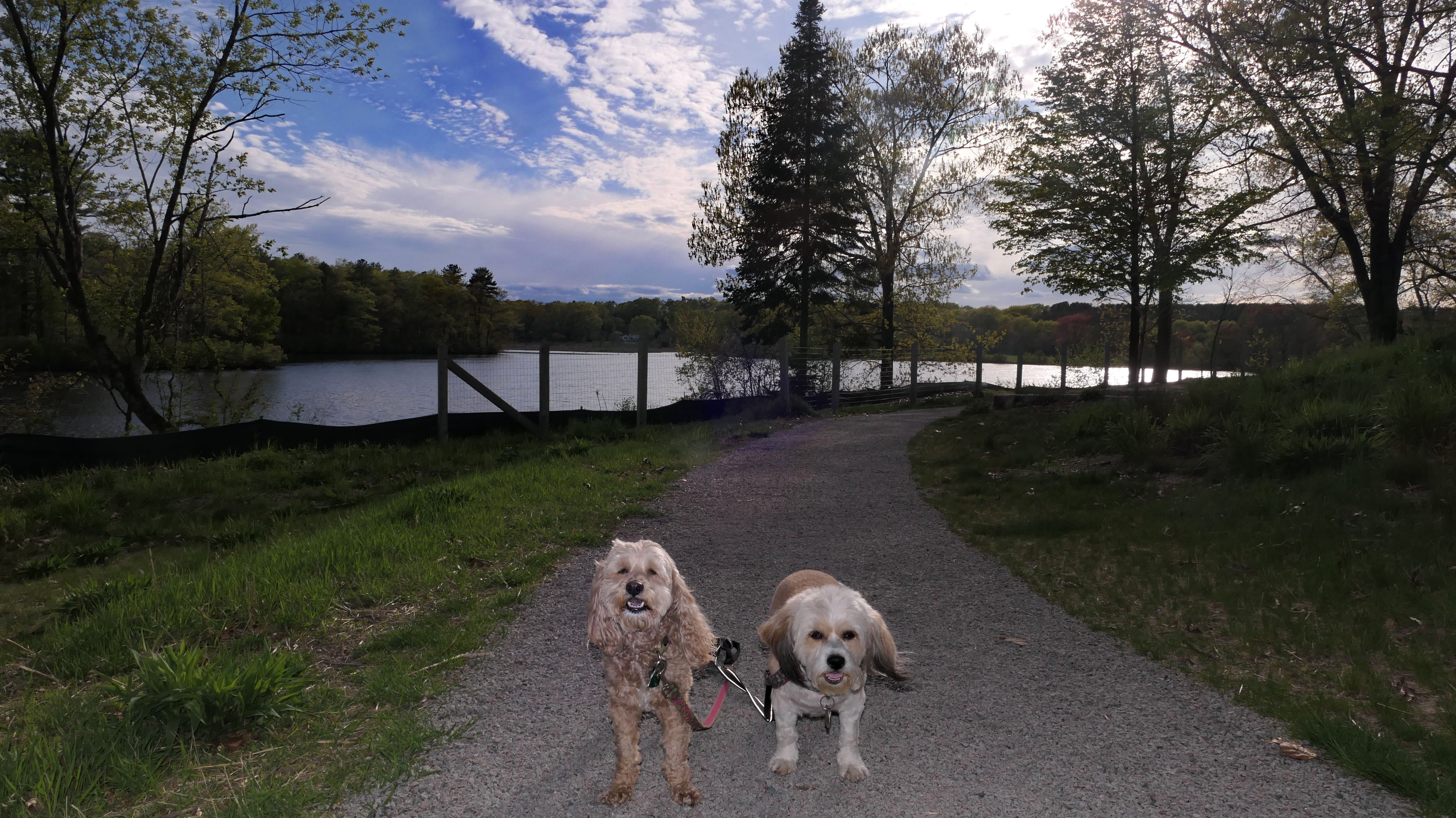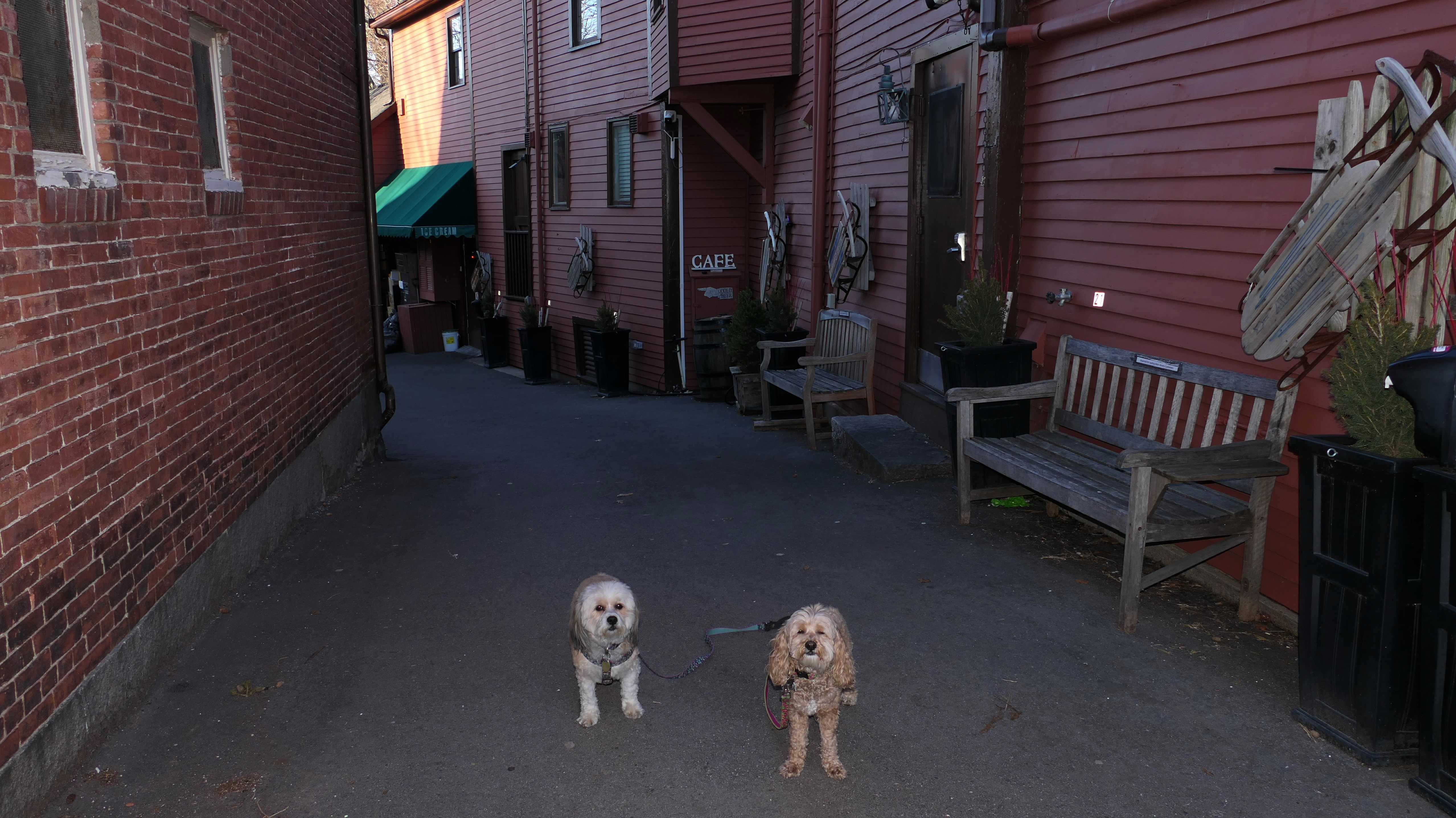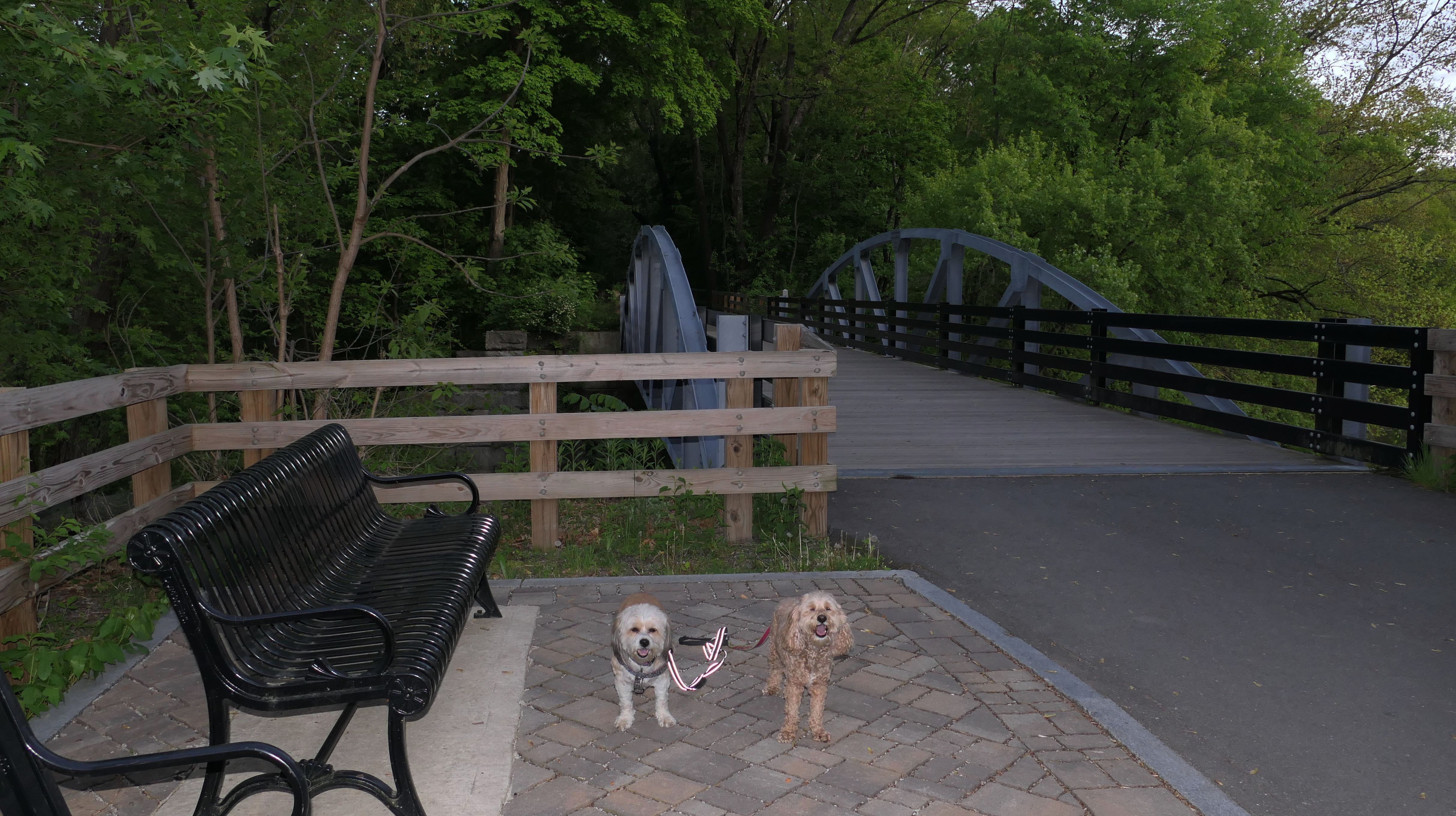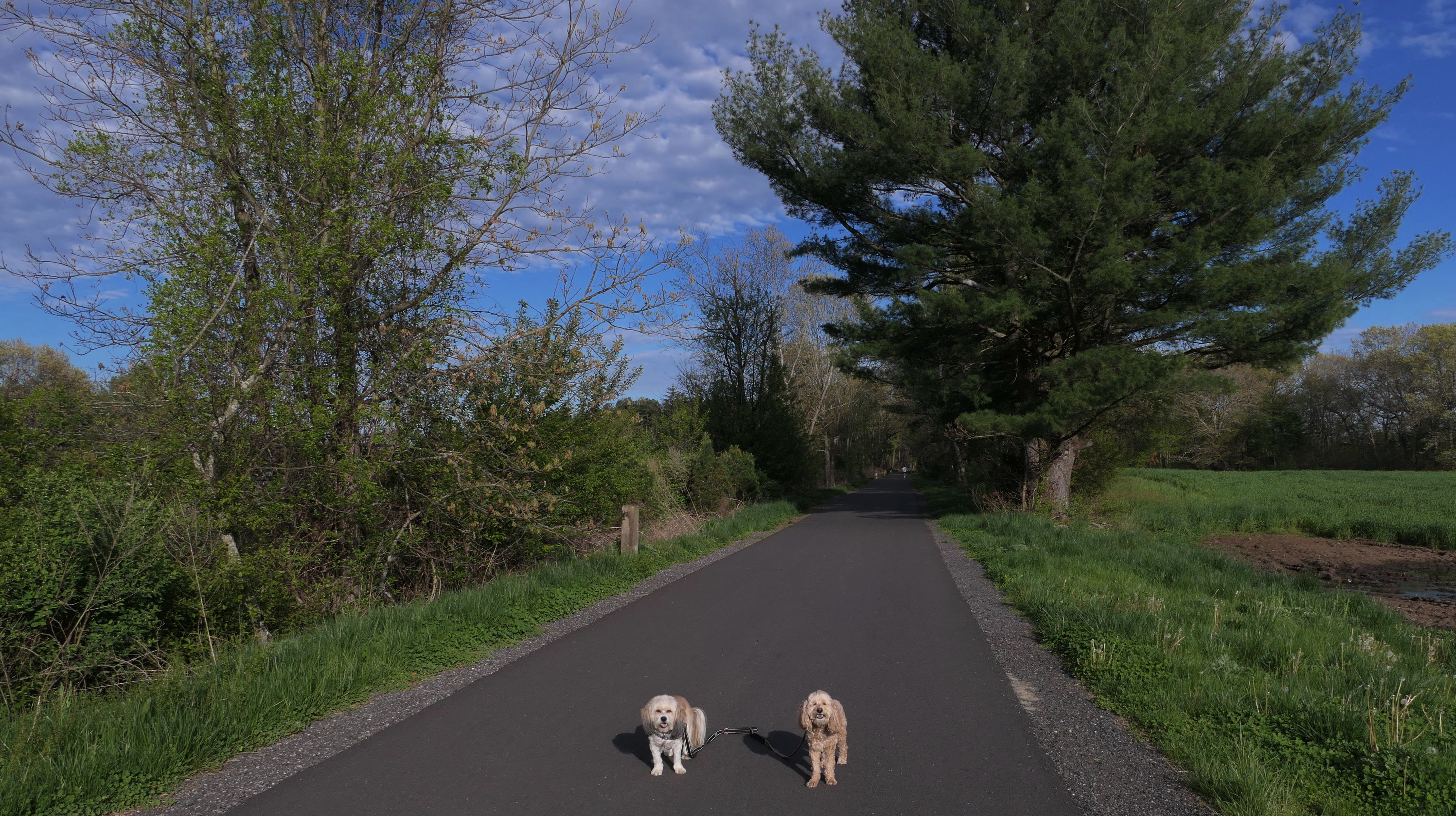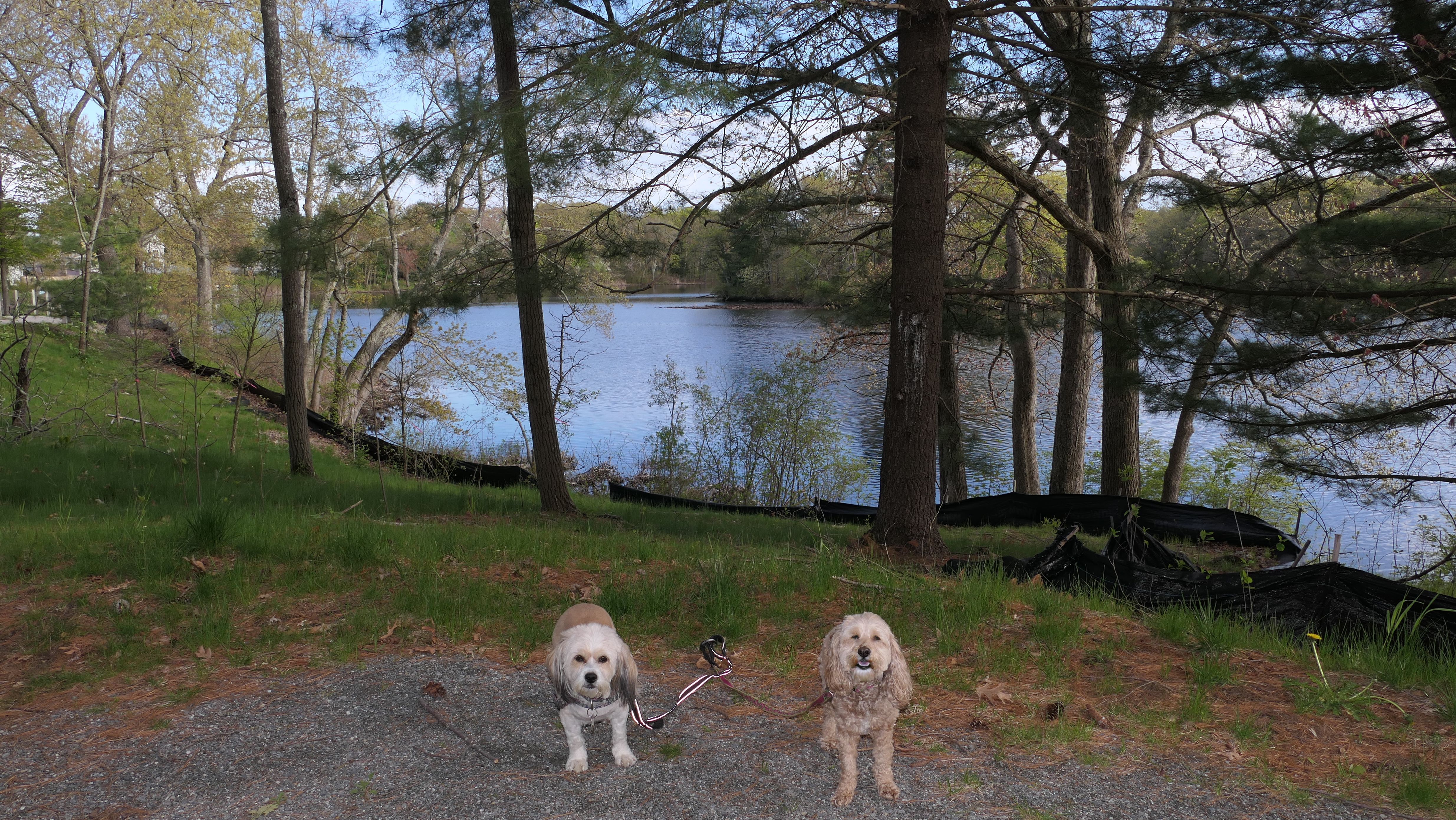 We walked here from Downtown Concord. The Minute Man National Historic Park is a large National Park with multiple sections. This is the section around the historic North Bridge. This is the site of one of the earliest battles of the Revolutionary War. The bridge is a replica of the original bridge, built in 1956. There's a stone dust trail that leads up a hill up to the visitor's center. The trail was quite muddy in places, and it was hard to get a picture of the dogs in front of the famous statue here. The sun was directly behind the statues, and it was too muddy to take it from a different angle.