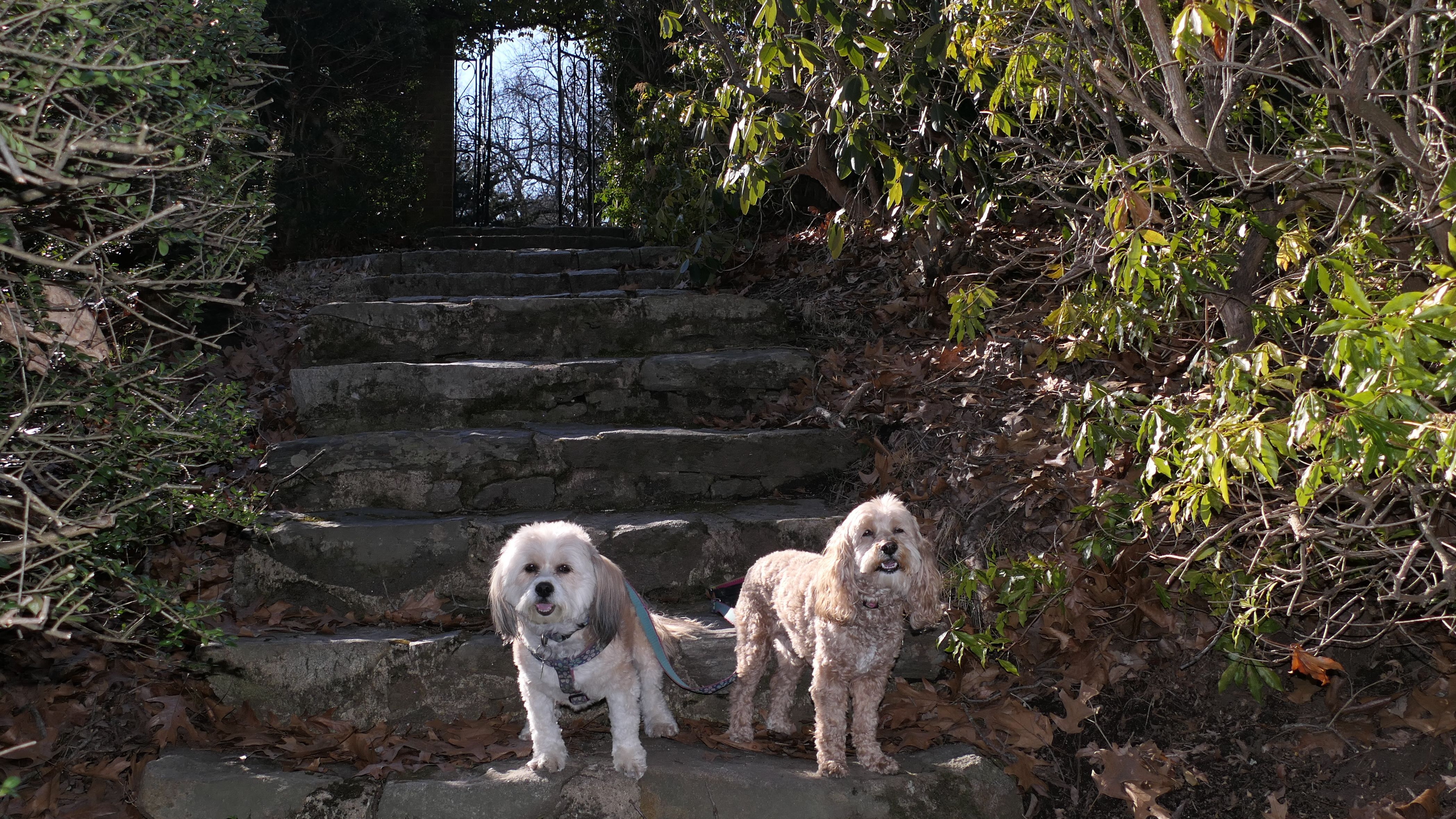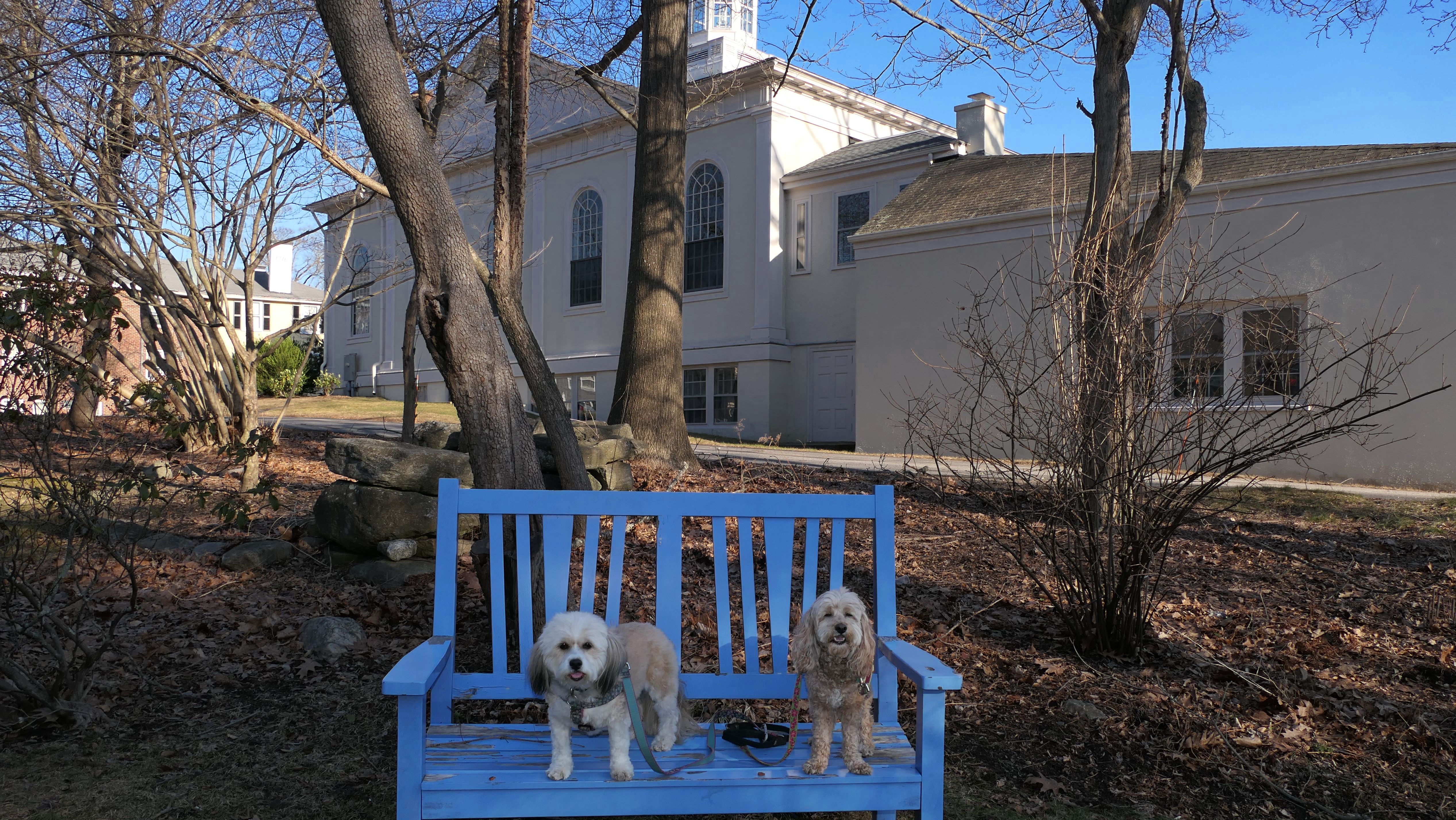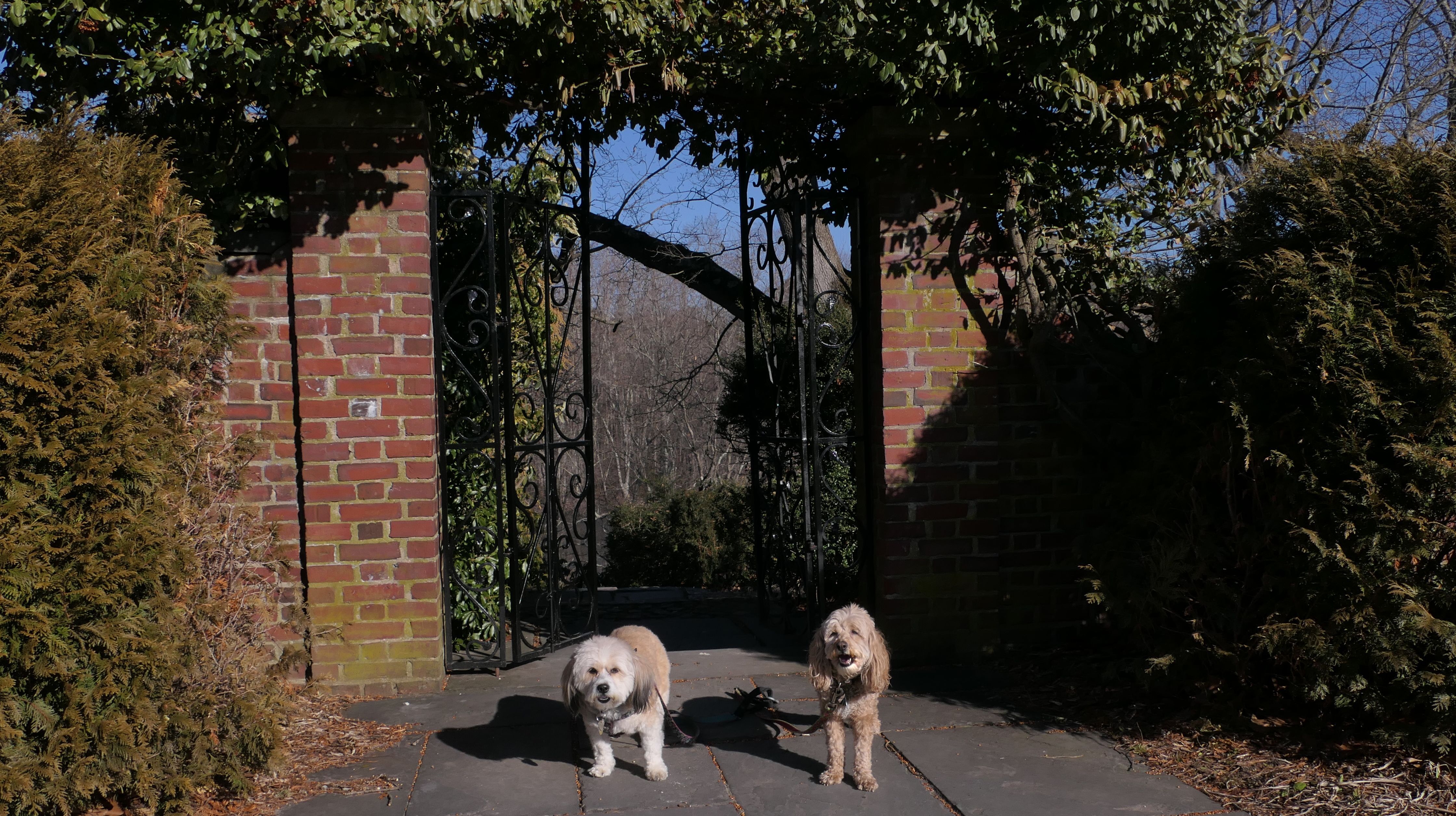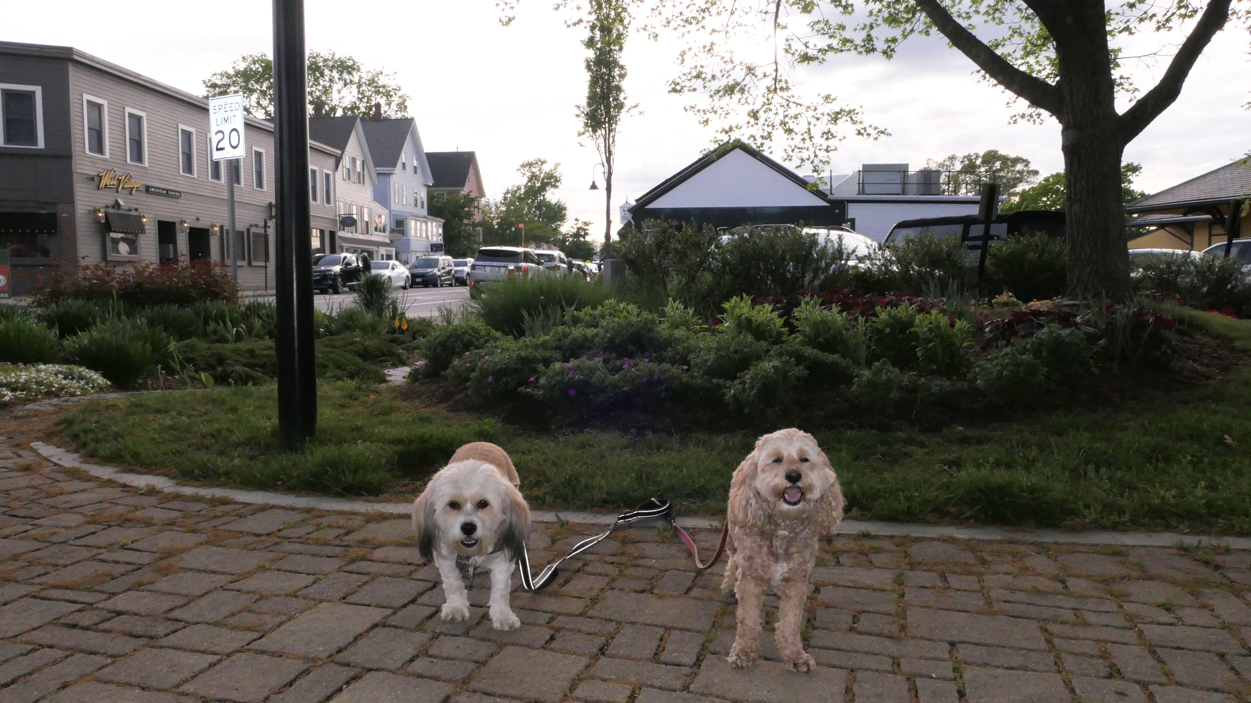 We walked here from Downtown Concord. The Minute Man National Historic Park is a large National Park with multiple sections. This is the section around the historic North Bridge. This is the site of one of the earliest battles of the Revolutionary War. The bridge is a replica of the original bridge, built in 1956. There's a stone dust trail that leads up a hill up to the visitor's center. The trail was quite muddy in places, and it was hard to get a picture of the dogs in front of the famous statue here. The sun was directly behind the statues, and it was too muddy to take it from a different angle.