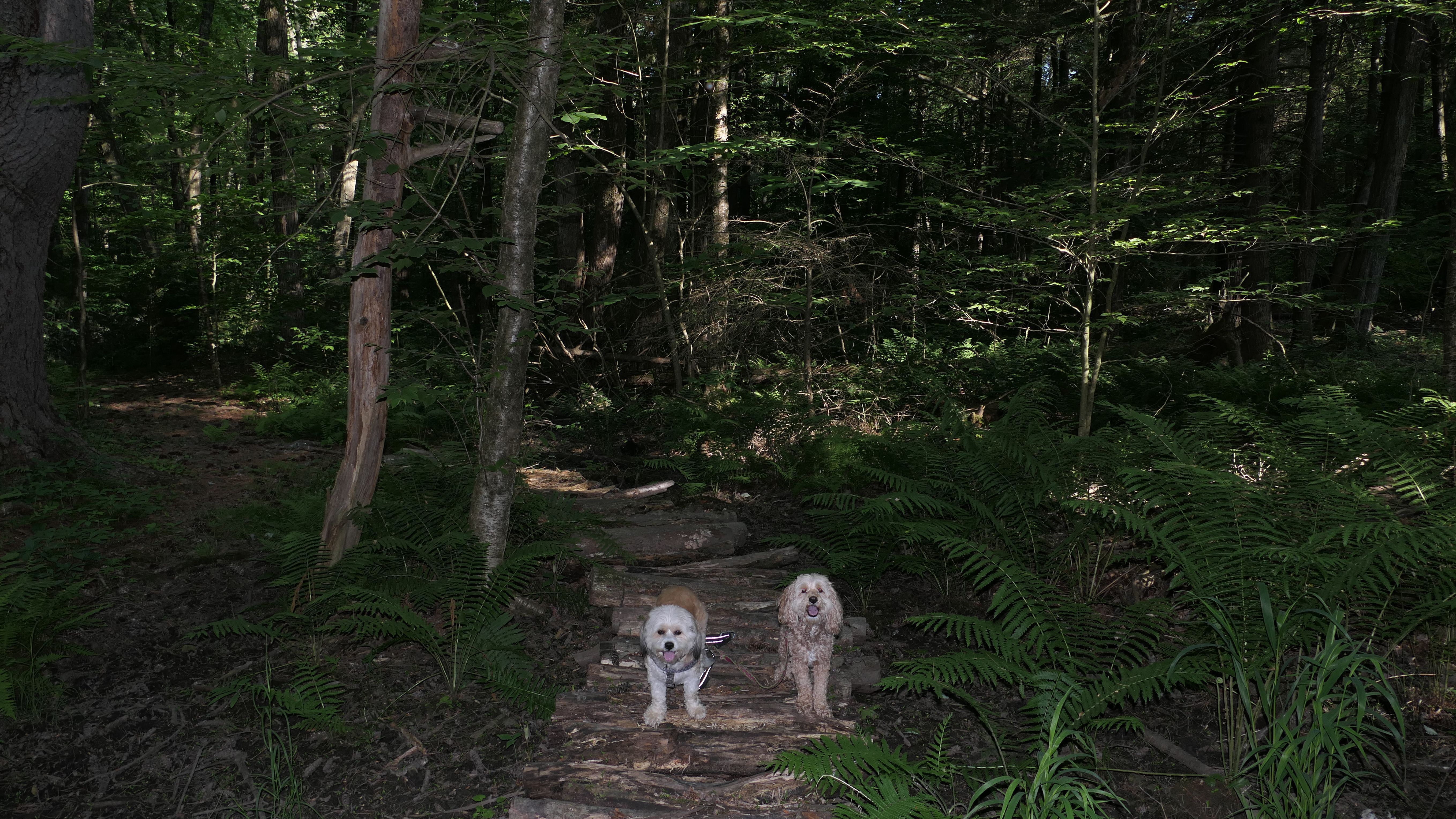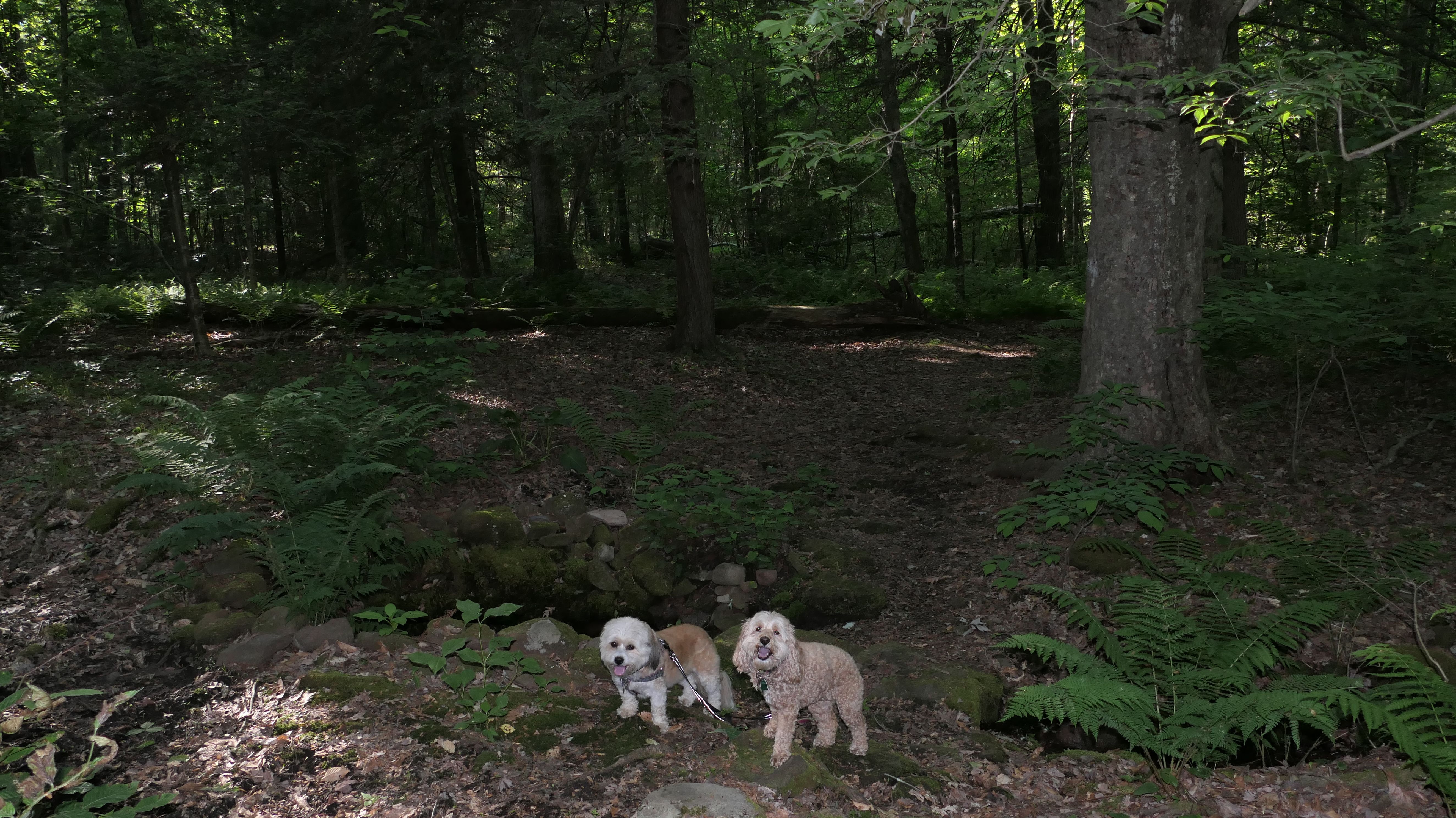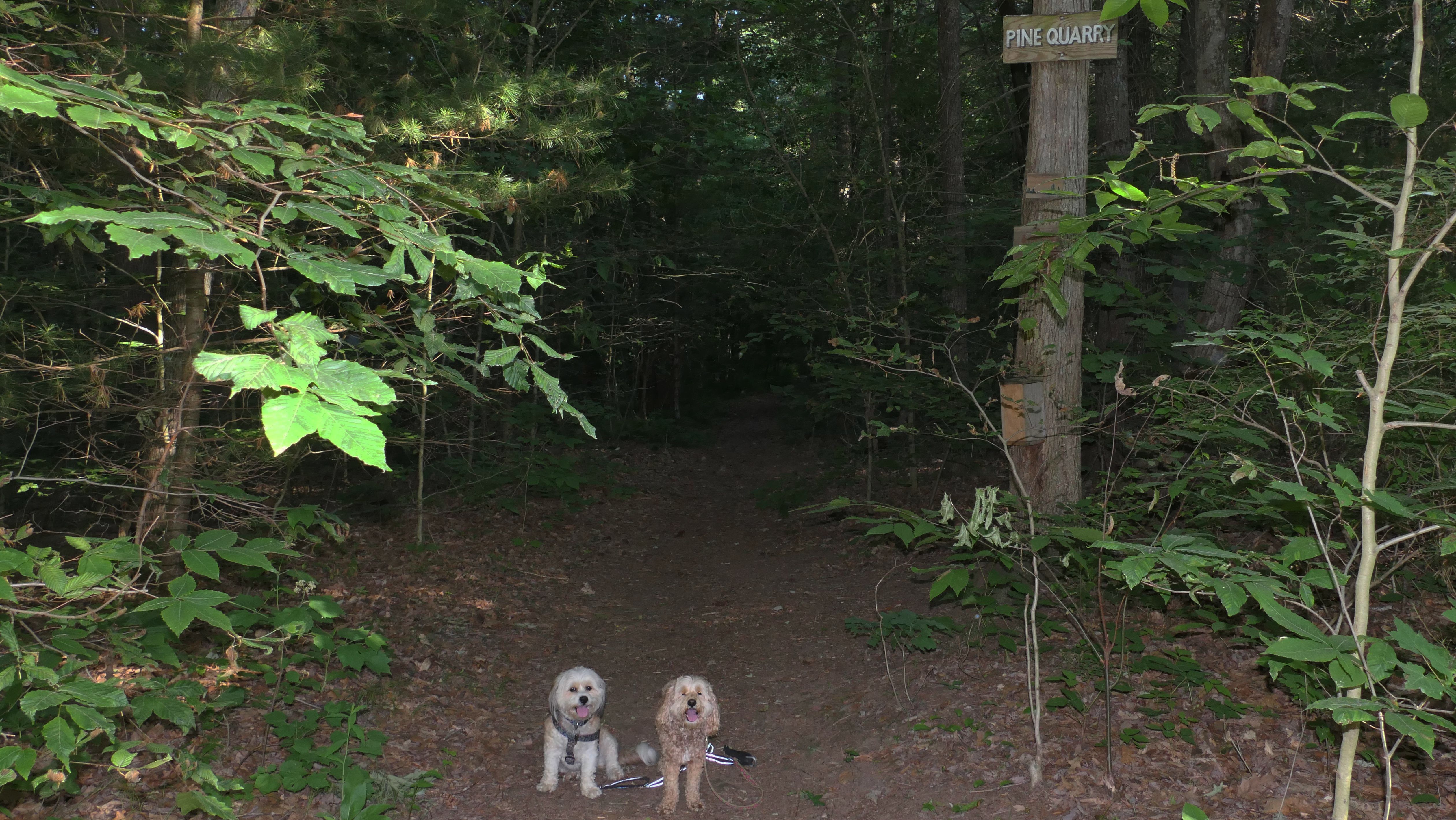 East Longmeadow was once home to over 100 stone quarries, and this conservation area is on the site of one of them. It must have been newly added to the All-Trails app, since I did not know about it before this day. The trail is accessed behind Chestnut Hill nursing home. The beginning of the trail is on a mowed path along a power line cut-out, until you reach the woods. At this point, there is a sign for the trail as it enters the woods. The trail is not blazed, and there are some confusing side trails, so it's a good idea to keep an on-line GPS enabled map handy. There are some log bridge stream crossings, and also a treat for the dogs about half way through. There is a jar of dog treats hanging from a tree that someone left. (We had our own treats, so we left them for others). Shortly after that, the trail reaches the site of the old quarry. There's a massive chasm that is filled with water. The pictures don't really show the enormity of it. There's a really sharp drop off at some points, so it's smart to stay away from the edge! The path of the trail on the All-Trails app was a little off, because if you followed the route exactly, you would need to fly to be able to cross the chasm! There is a trail around it though. This was definitely a more interesting adventure than I thought it would be, as I've been really bored with woodsy hikes of late. This one was worth doing!