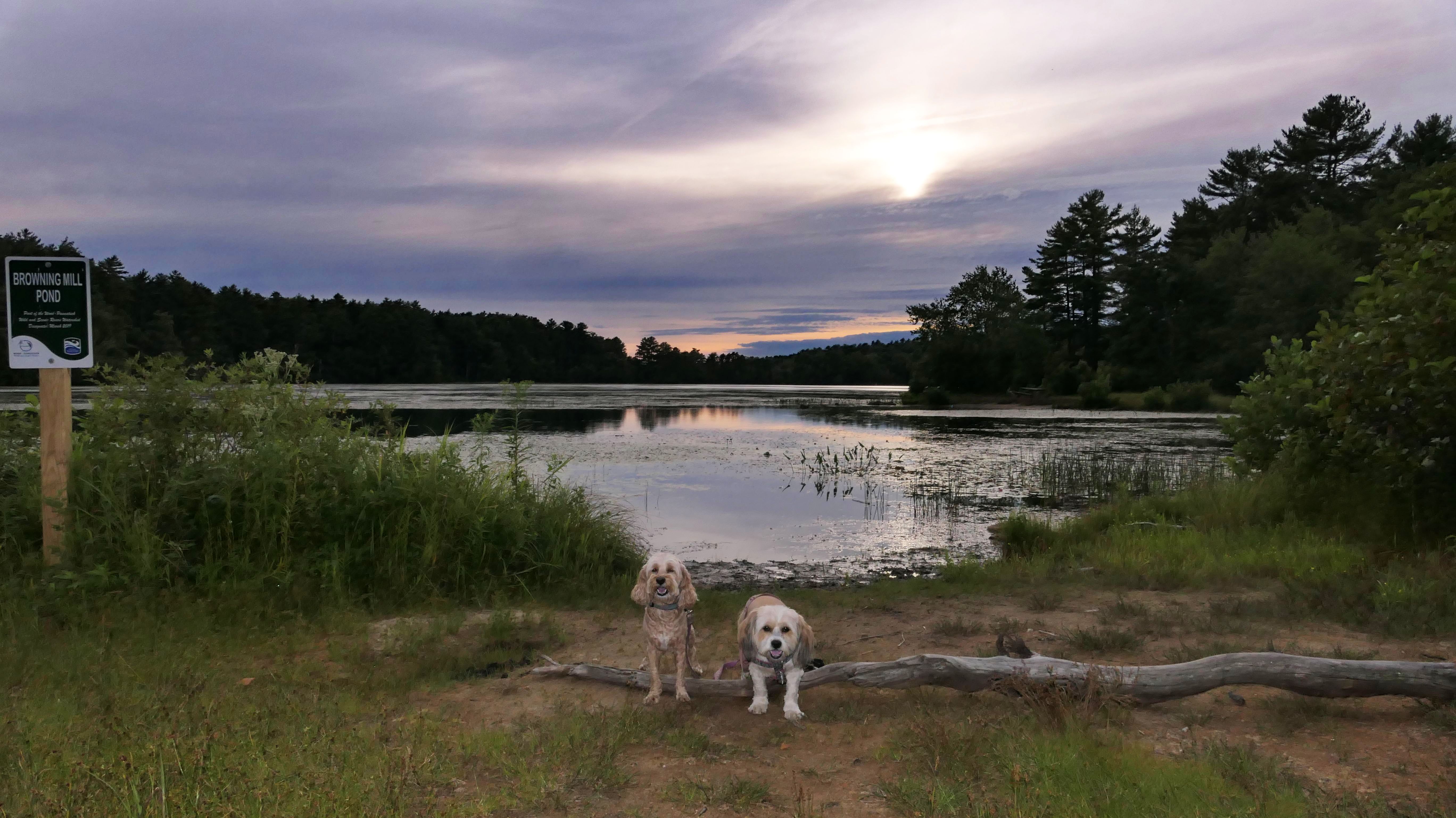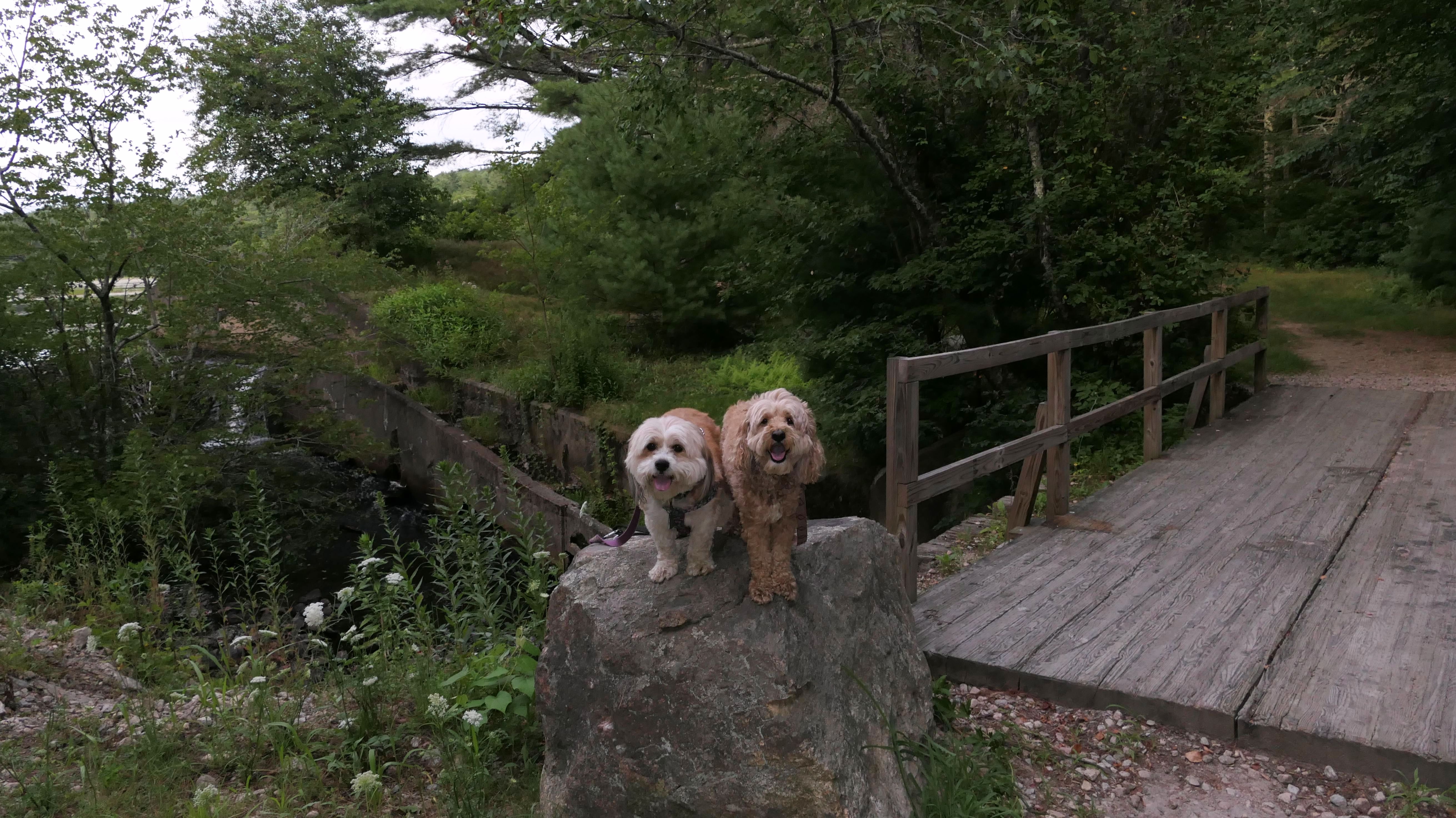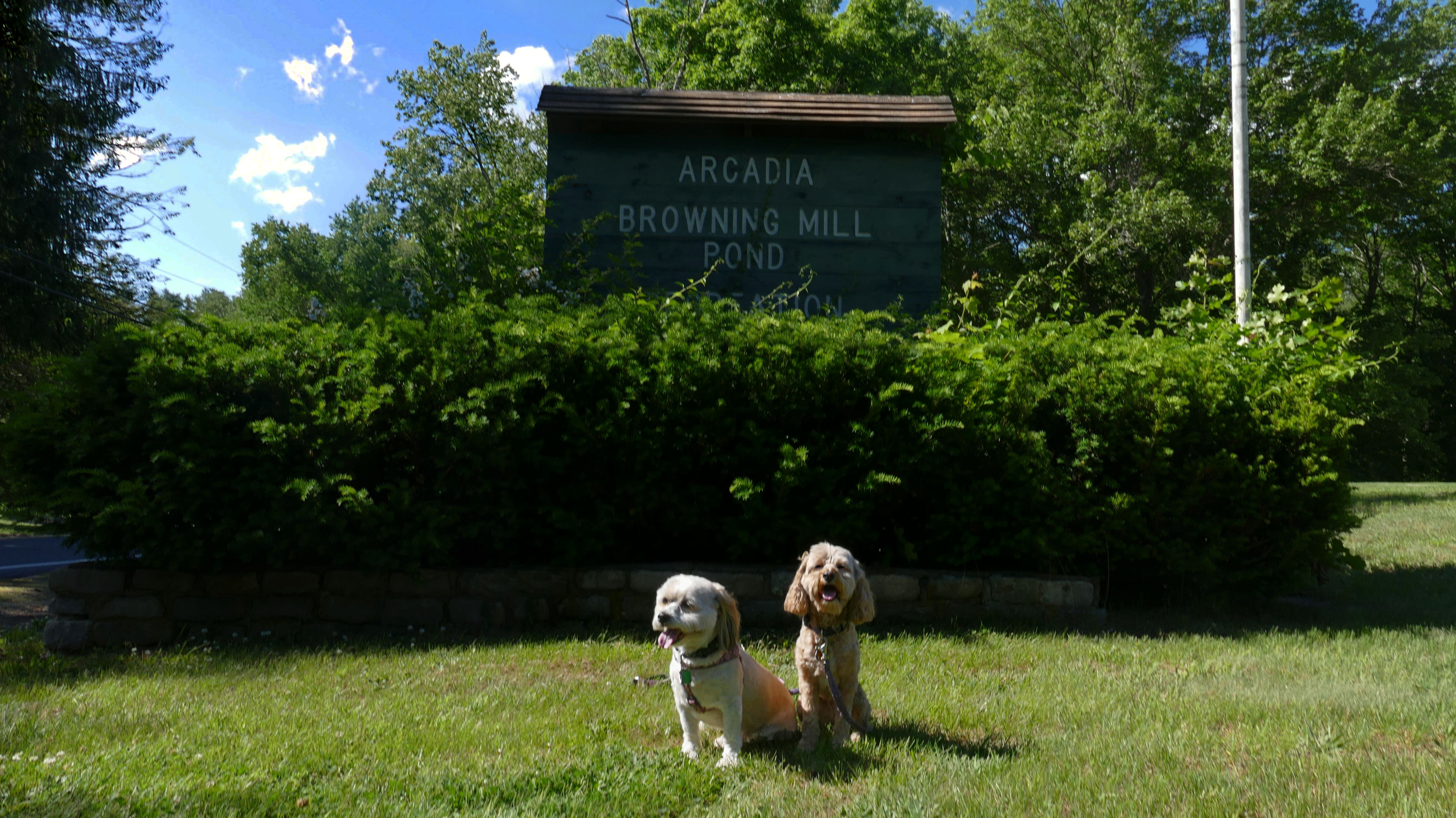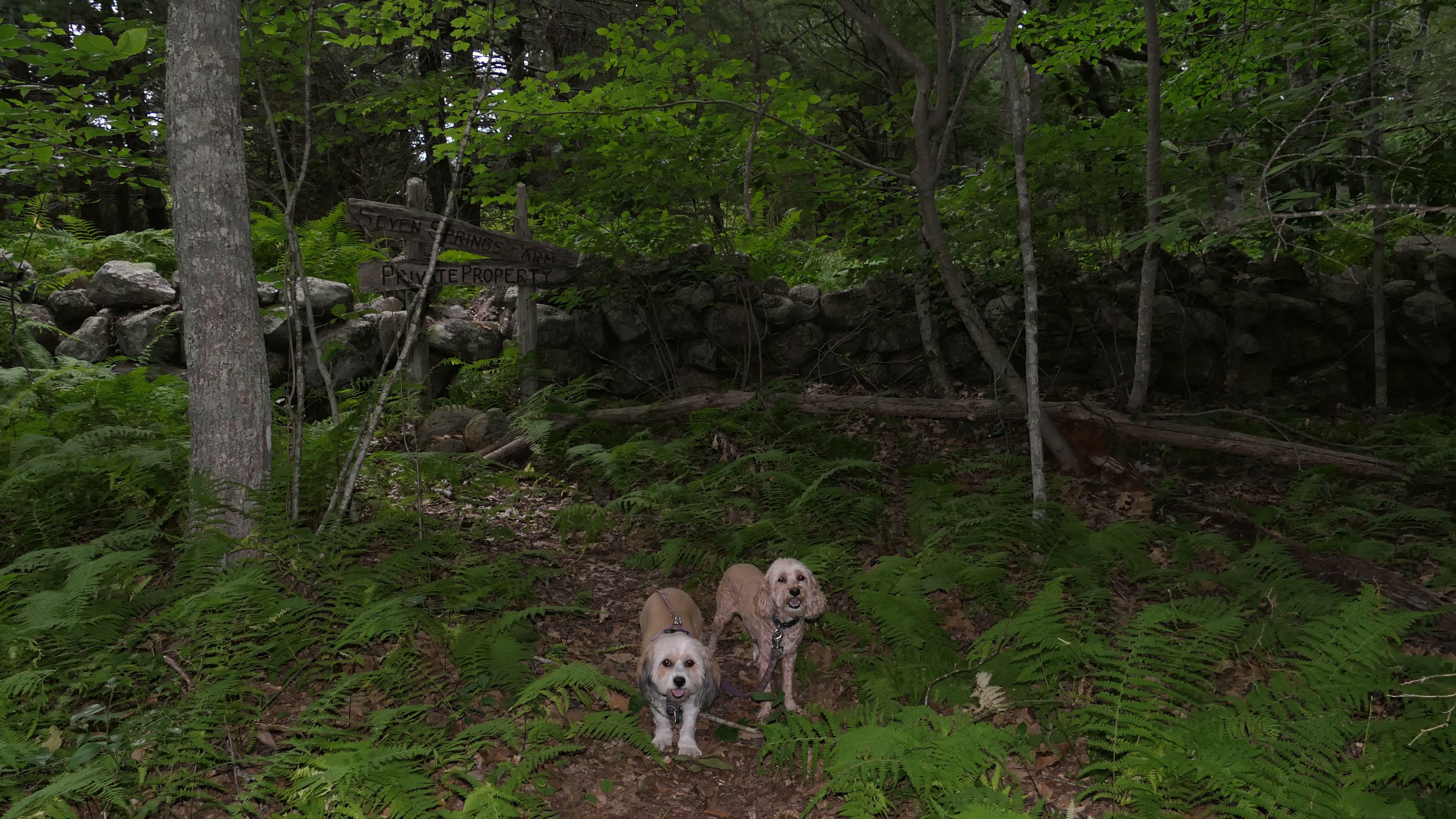 On our first visit here, I think I just pulled over to let the dogs out to do their business. We didn't actually hike around the pond, but did take pictures in front of the sign. Over 50 months later, we returned and hiked the nearly two mile loop around the pond. The trail is actually quite nice, and is very well maintained. There are a bunch of spots that provide access to the pond, as well as some ruins of the old mill. The trail actually dips into Richmond. There are a few other pictures on that page. After we were done, I crossed the street and took the same picture in front of the sign. This time the dogs were looking, but the giant rock in front of the sign wasn't there two years ago.
