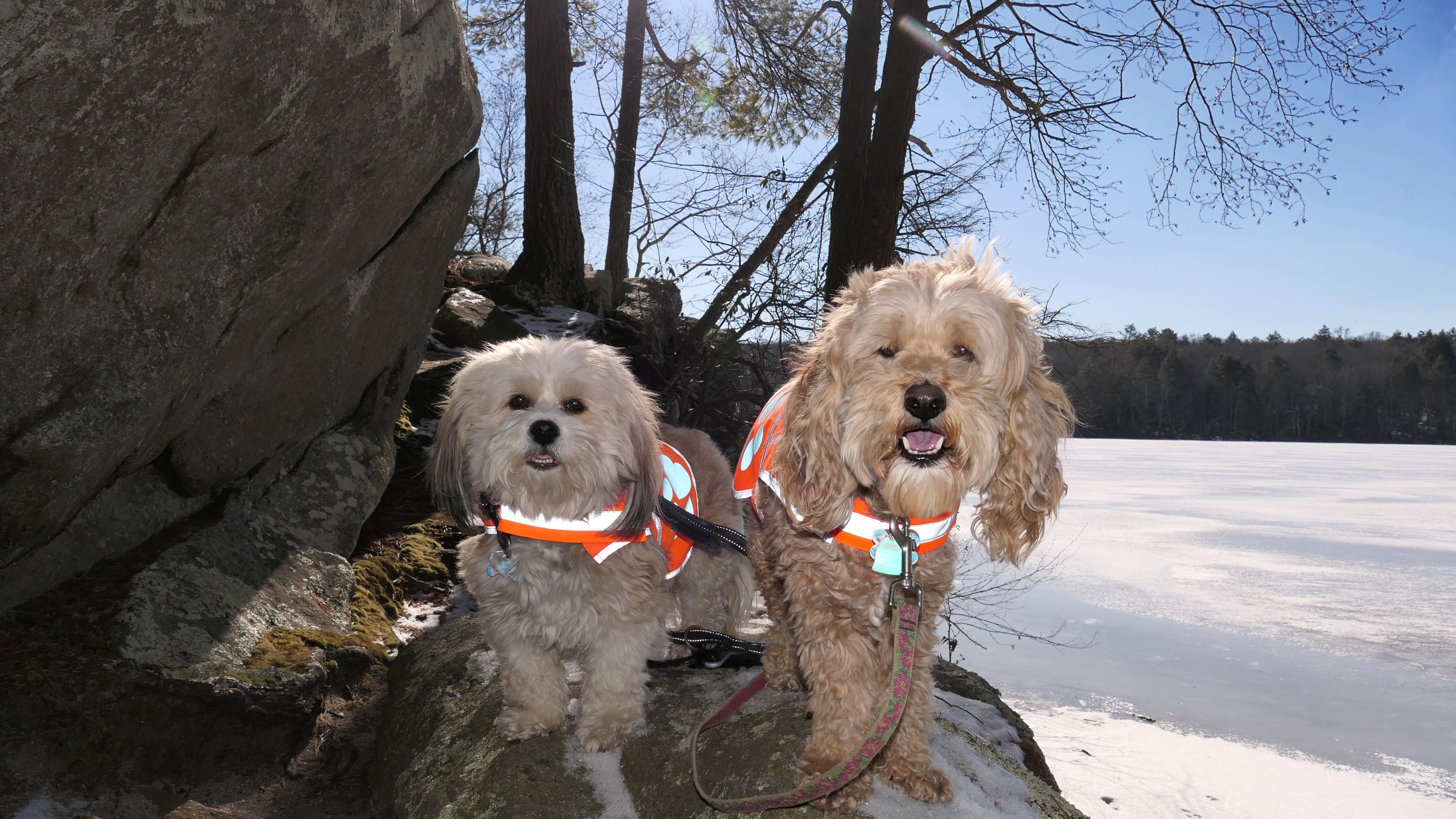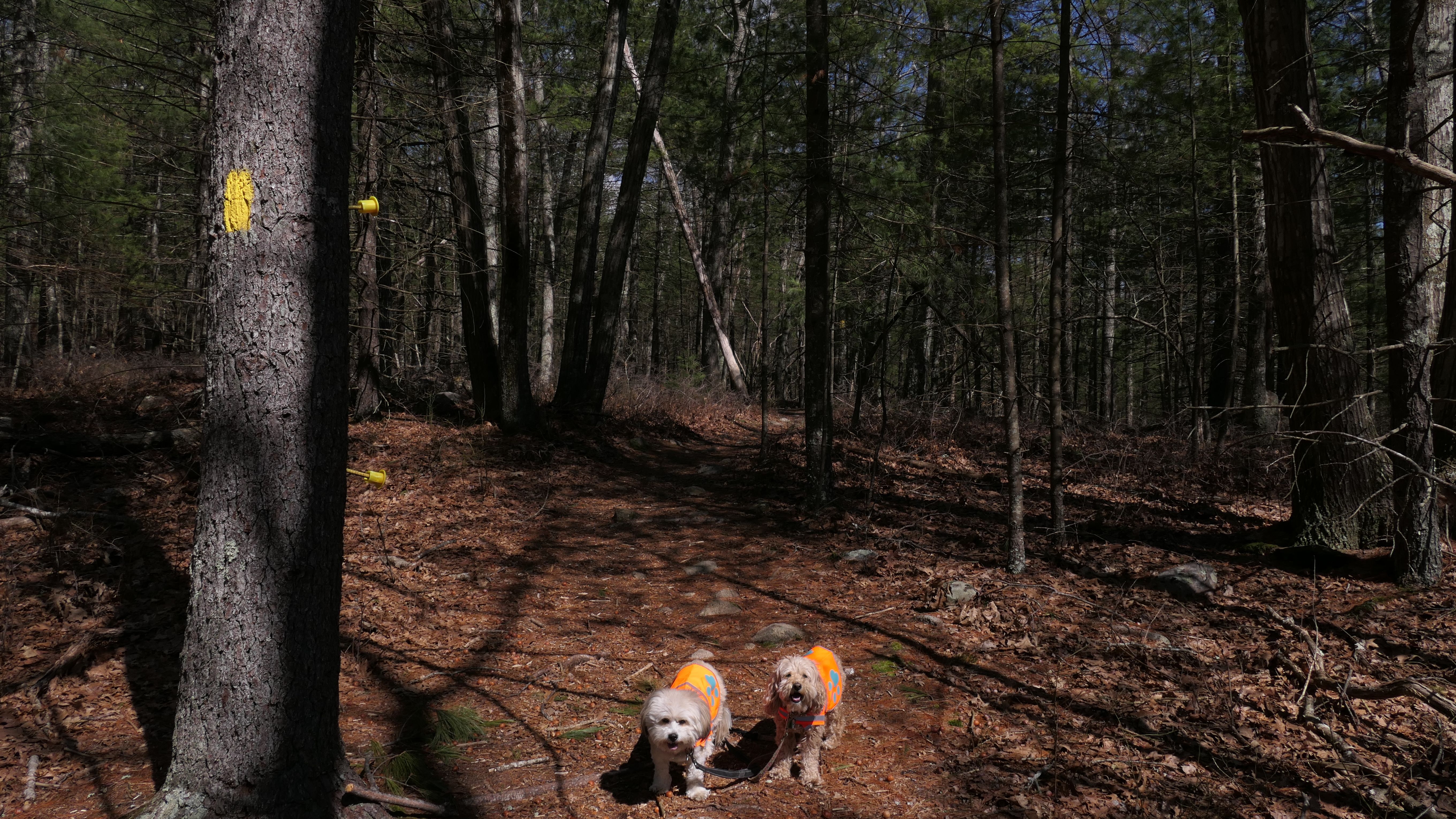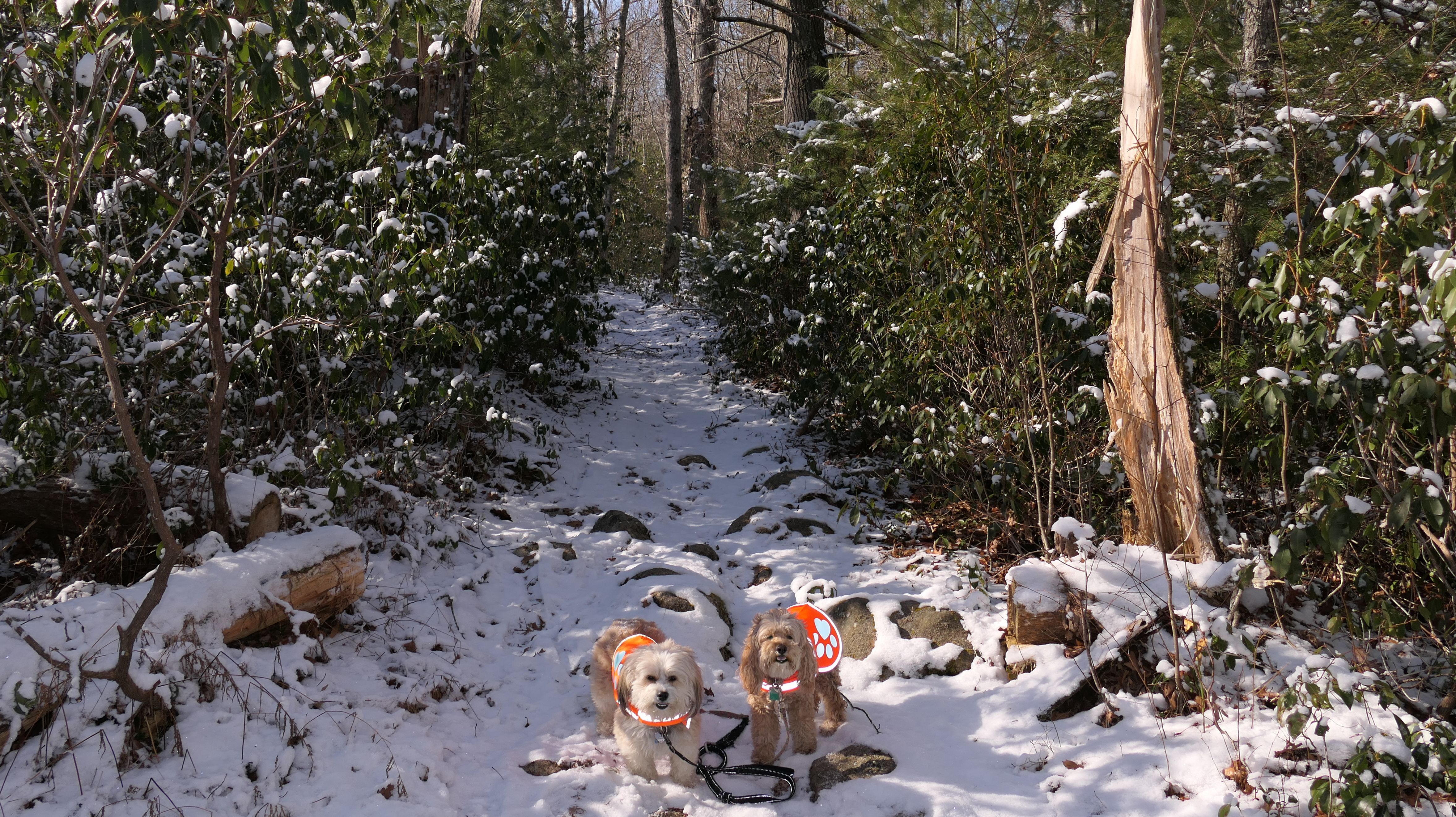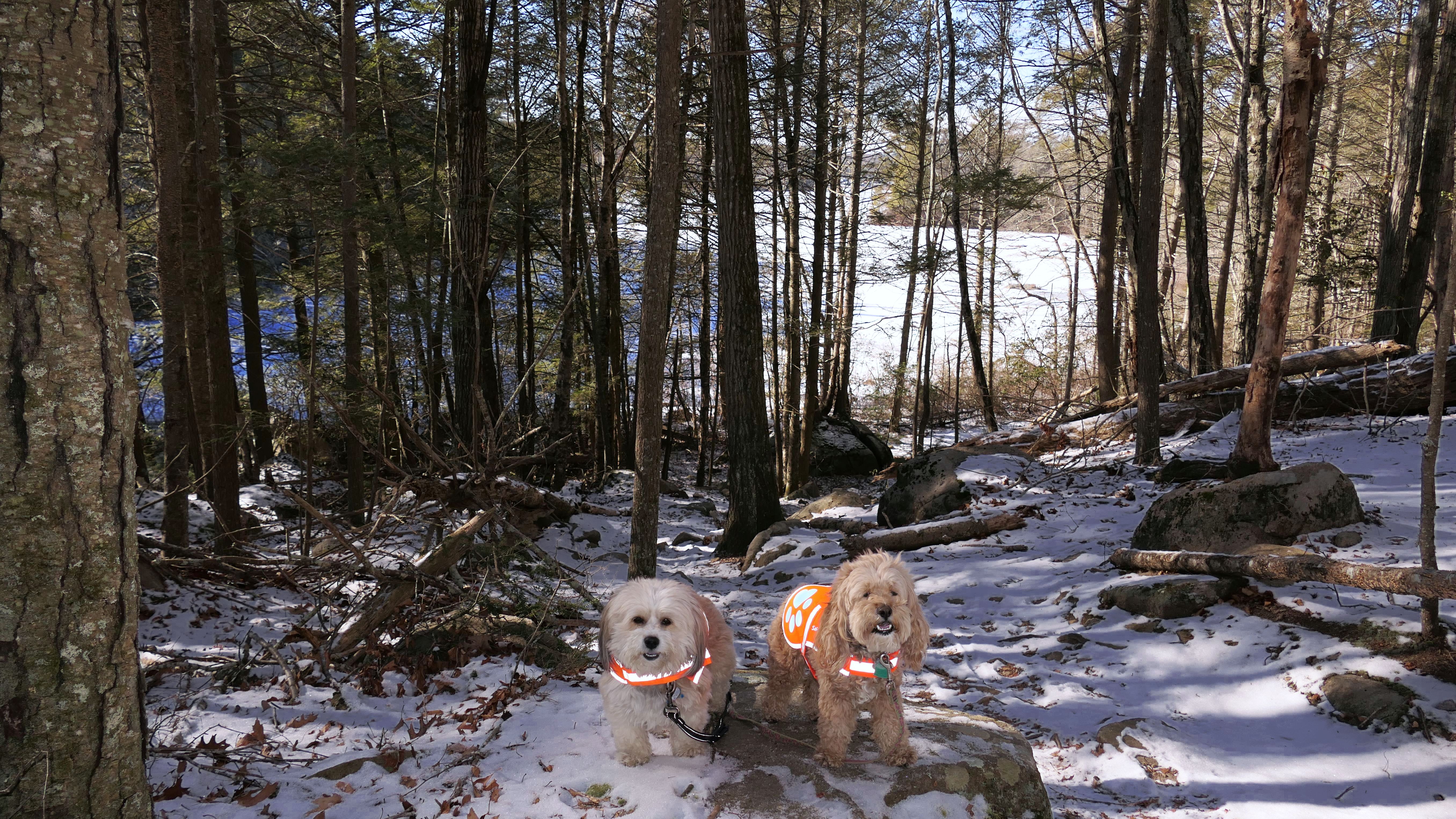 I think we've probably gone on more "snow hikes" this week than we did in the past two winters combined! This is another great winter adventure. I've been bored with hikes through the woods lately, but a pine forest with a coating of snow is about as good as it gets in the winter! We must have driven by this place about 100 times. It's on one of our major routes to Rhode Island, but we never hiked this spot before. Now that we have our orange vests, we were ready to give this trail a go! We hiked what the All-Trails app called the "Beach Pond South Loop". It's mostly the yellow blazed Tippecansett trail, but then the "Deep Pond Trail" and "Hemlock Ledges Trail" are used to complete a loop. The terrain was mostly easy, but challenging in parts. There are rocky areas and some inclines, but nothing we haven't tackled before. The whole hike was exactly three miles, and a lot of fun!