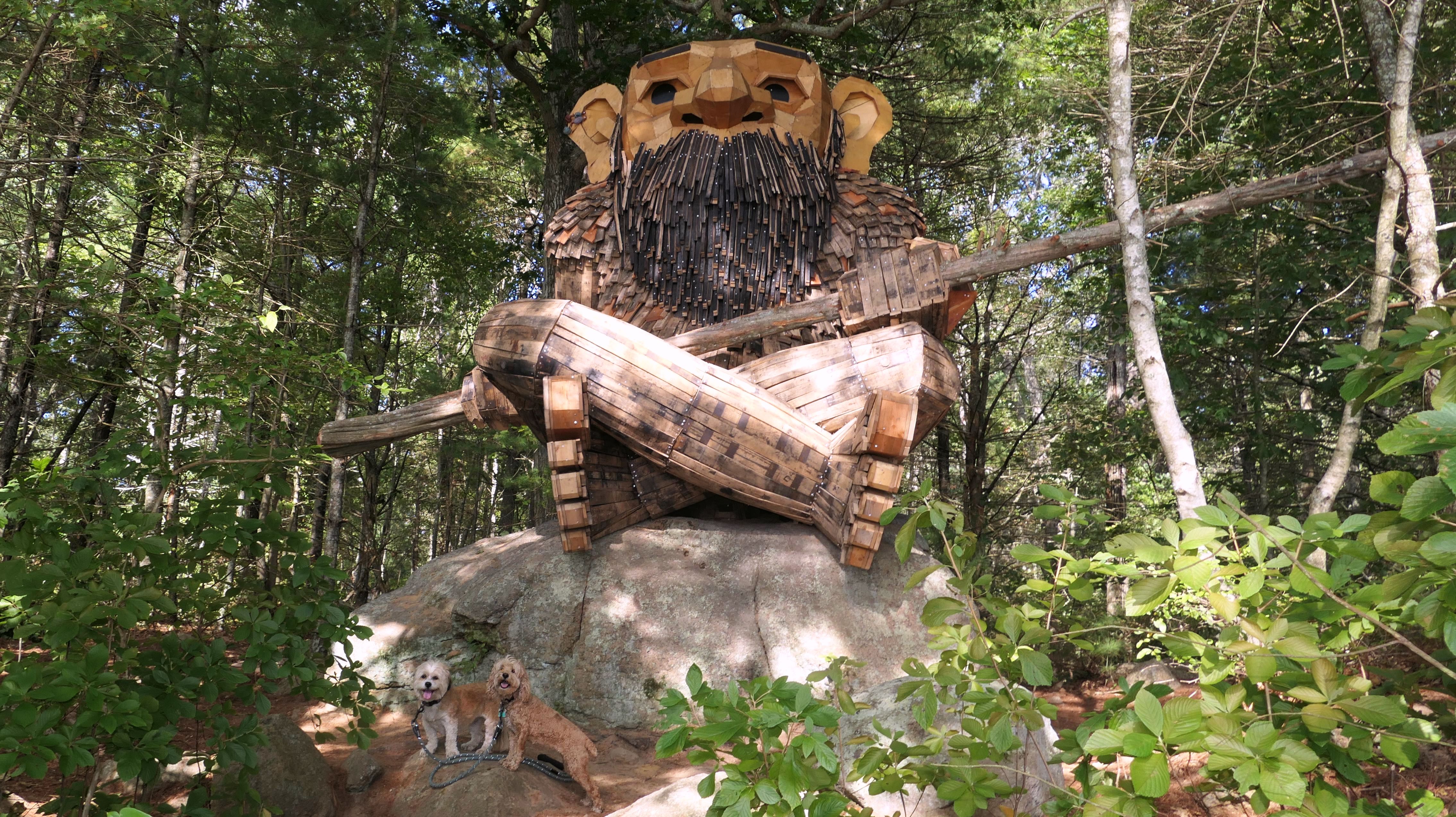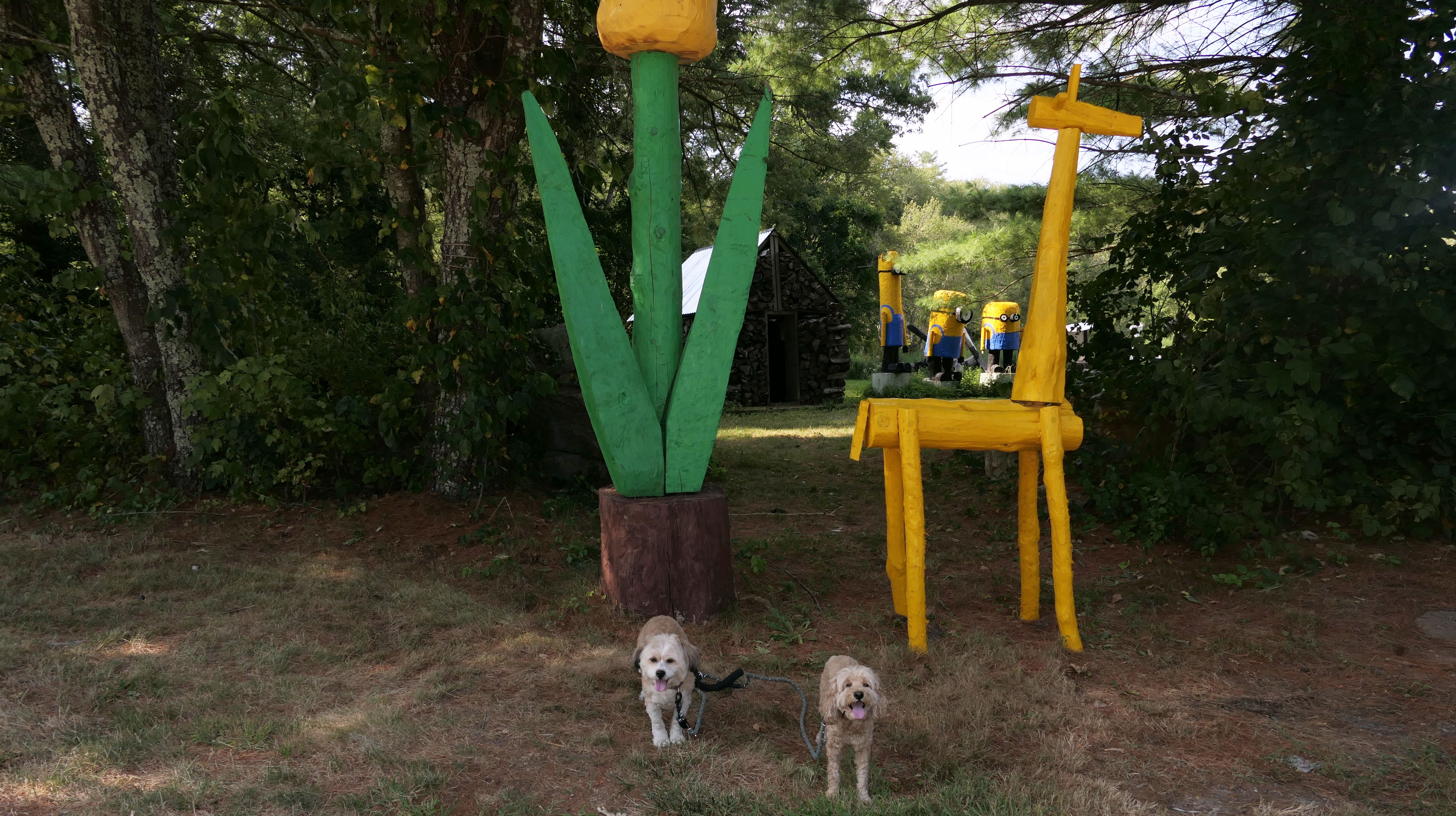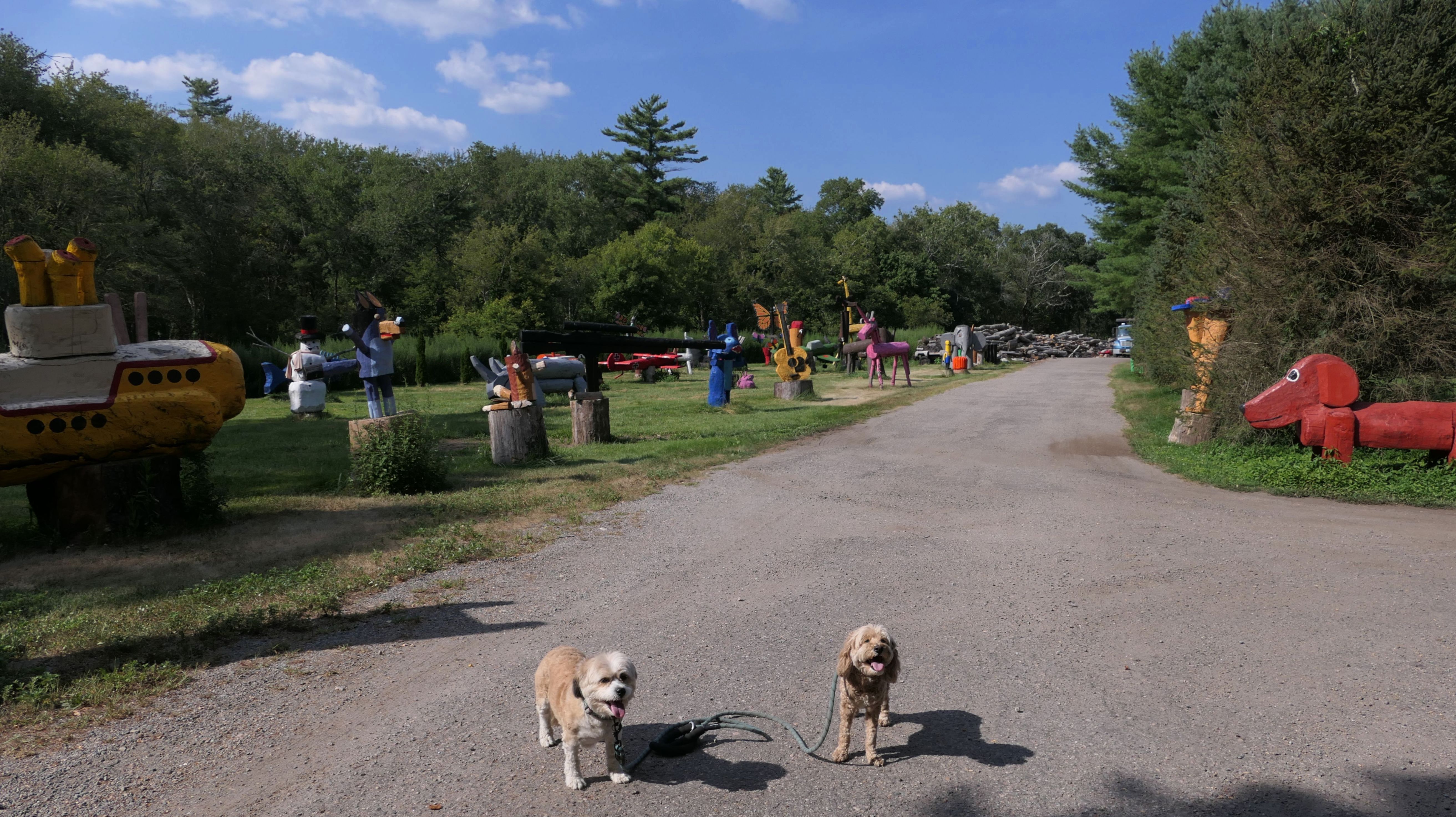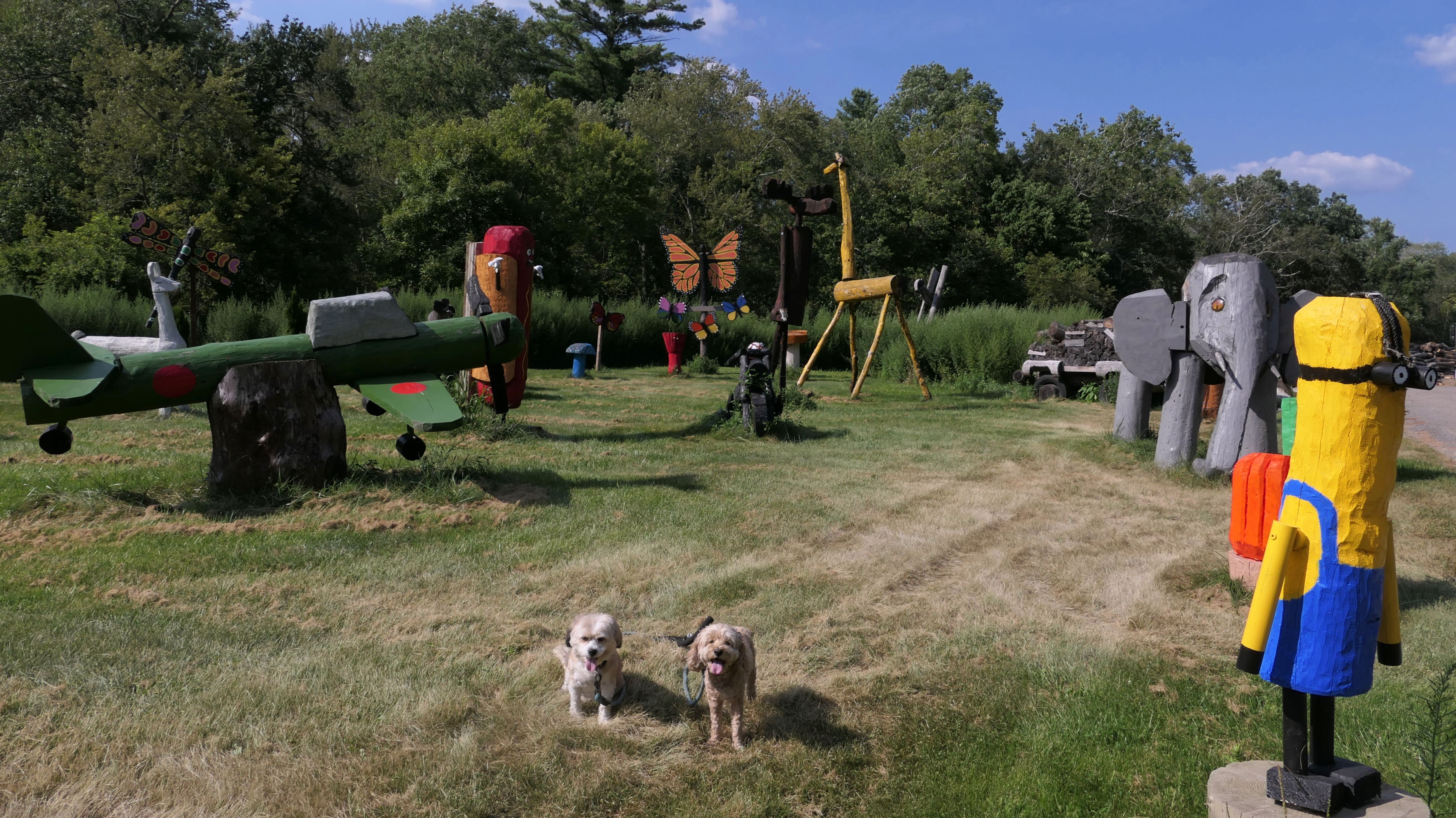We've driven past this spot countless times on our way to adventures in Rhode Island. From the road, I'd catch glimpses of intriguing wood carvings, and on one recent trip, I even spotted a man walking his dog there out of the corner of my eye. That was enough to convince me—it was time to stop and check it out for ourselves. A quick internet search turned up plenty of reviews for the company's firewood business, but nothing about the carvings. So, we parked down the road and walked over. The gate was open, and with no “No Trespassing” signs in sight, I figured the public was welcome. After all, why put such great work on display if you don't want people to enjoy it? The carvings, all made from wood, mostly feature pop culture figures, and I thought they were fantastic. The display area itself is small, so there's not much walking to do here—but it's right in the middle of the Arcadia Management Area, so there's plenty of space nearby for more exploring with the dogs.