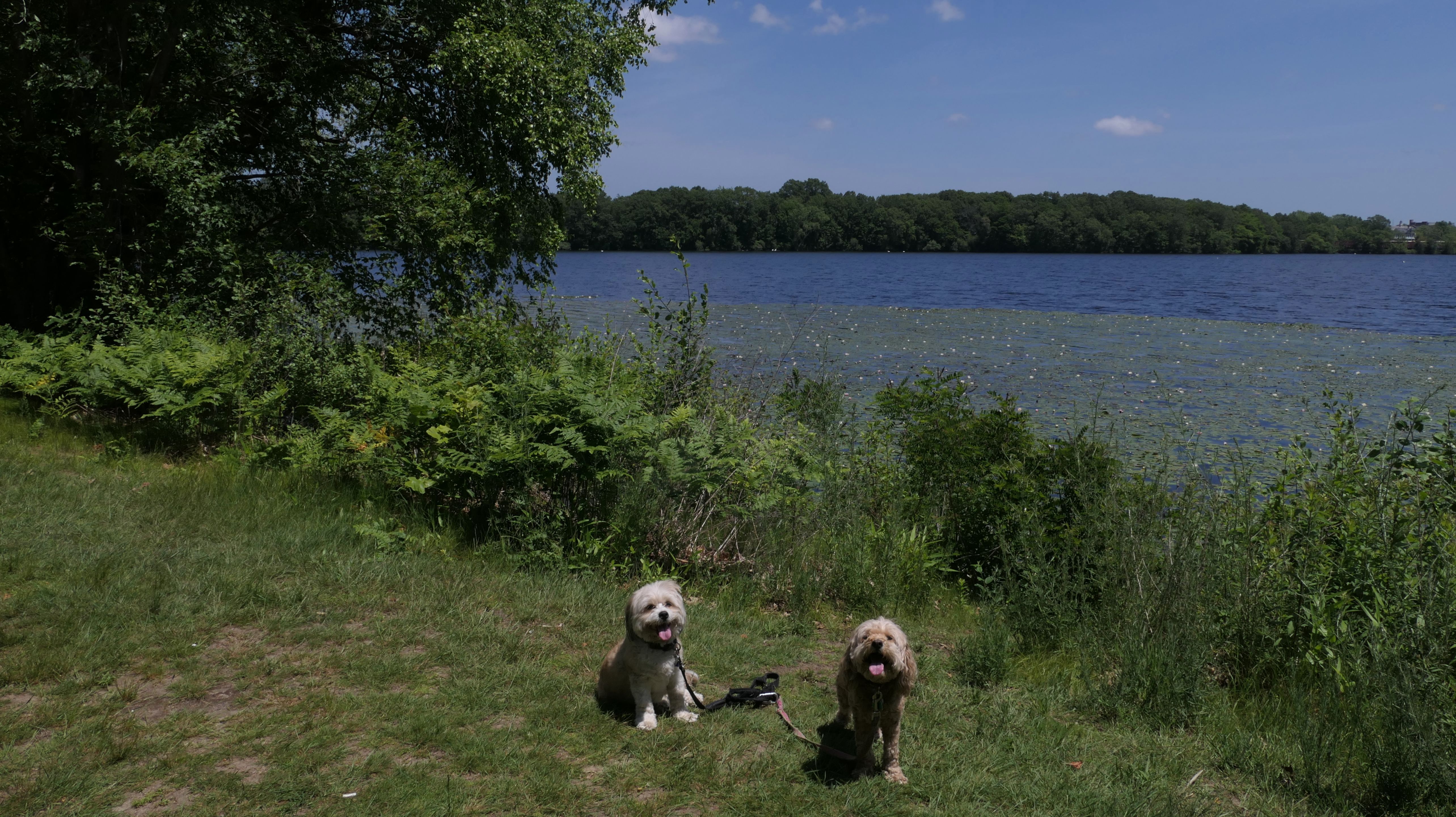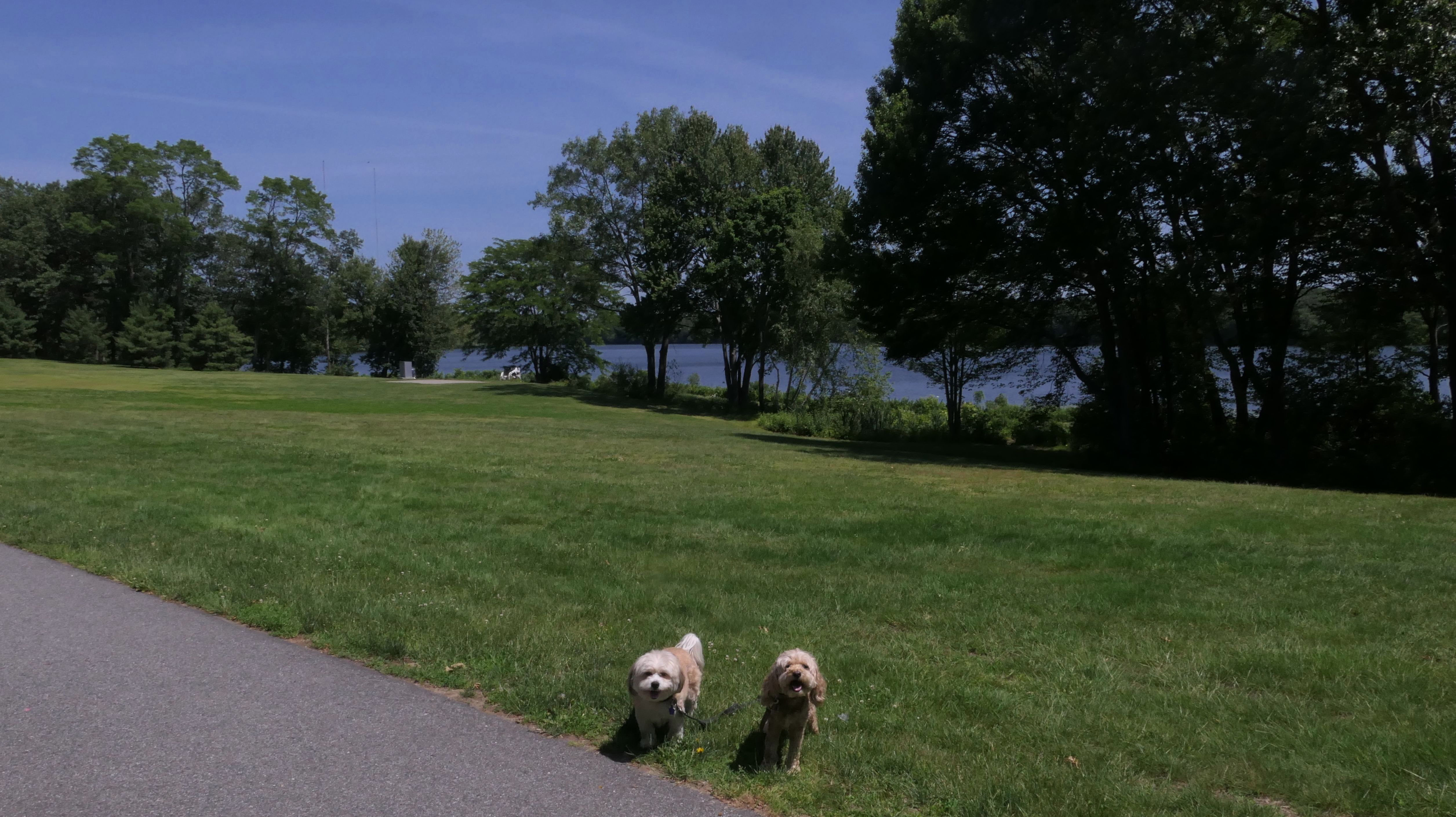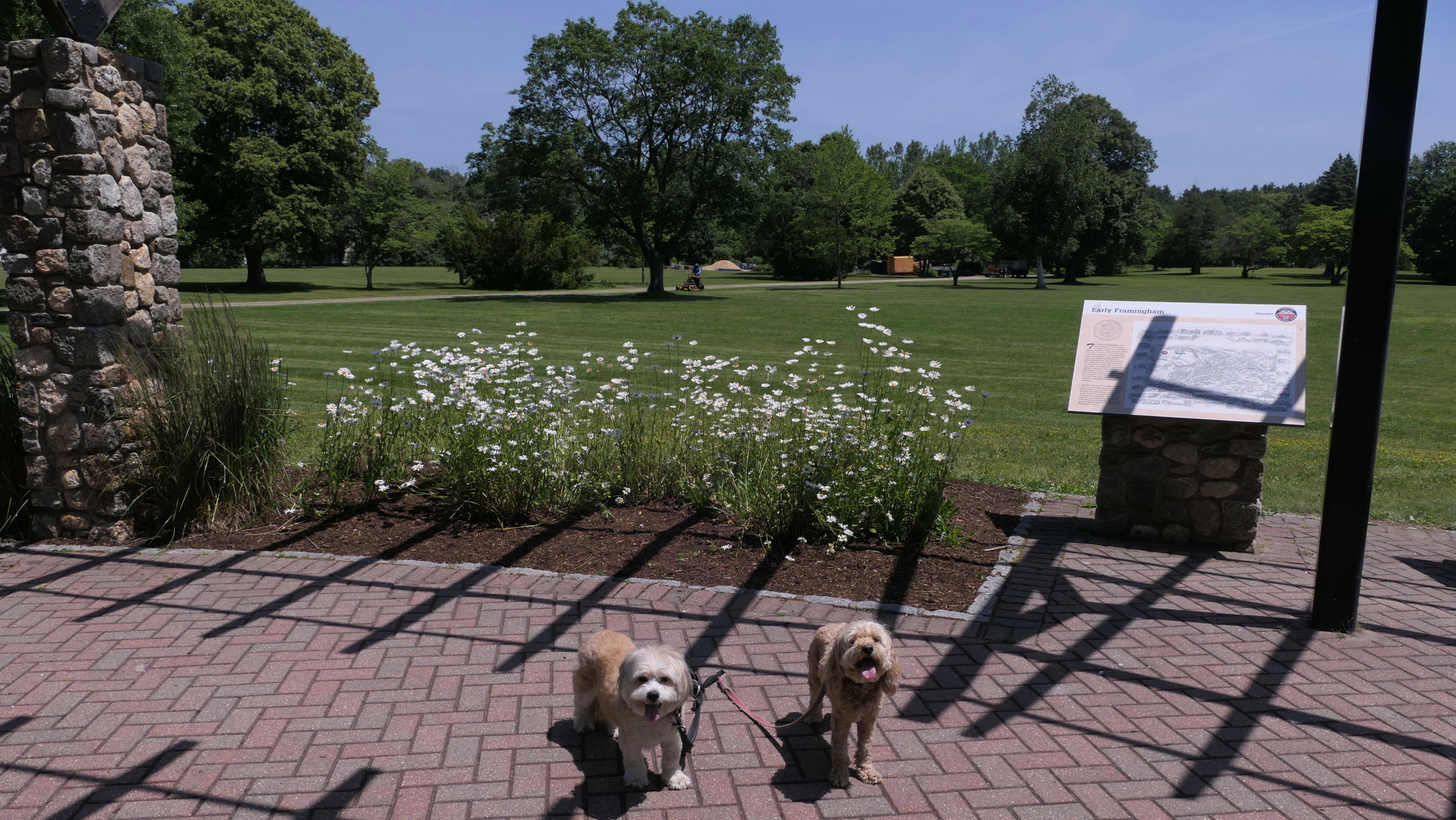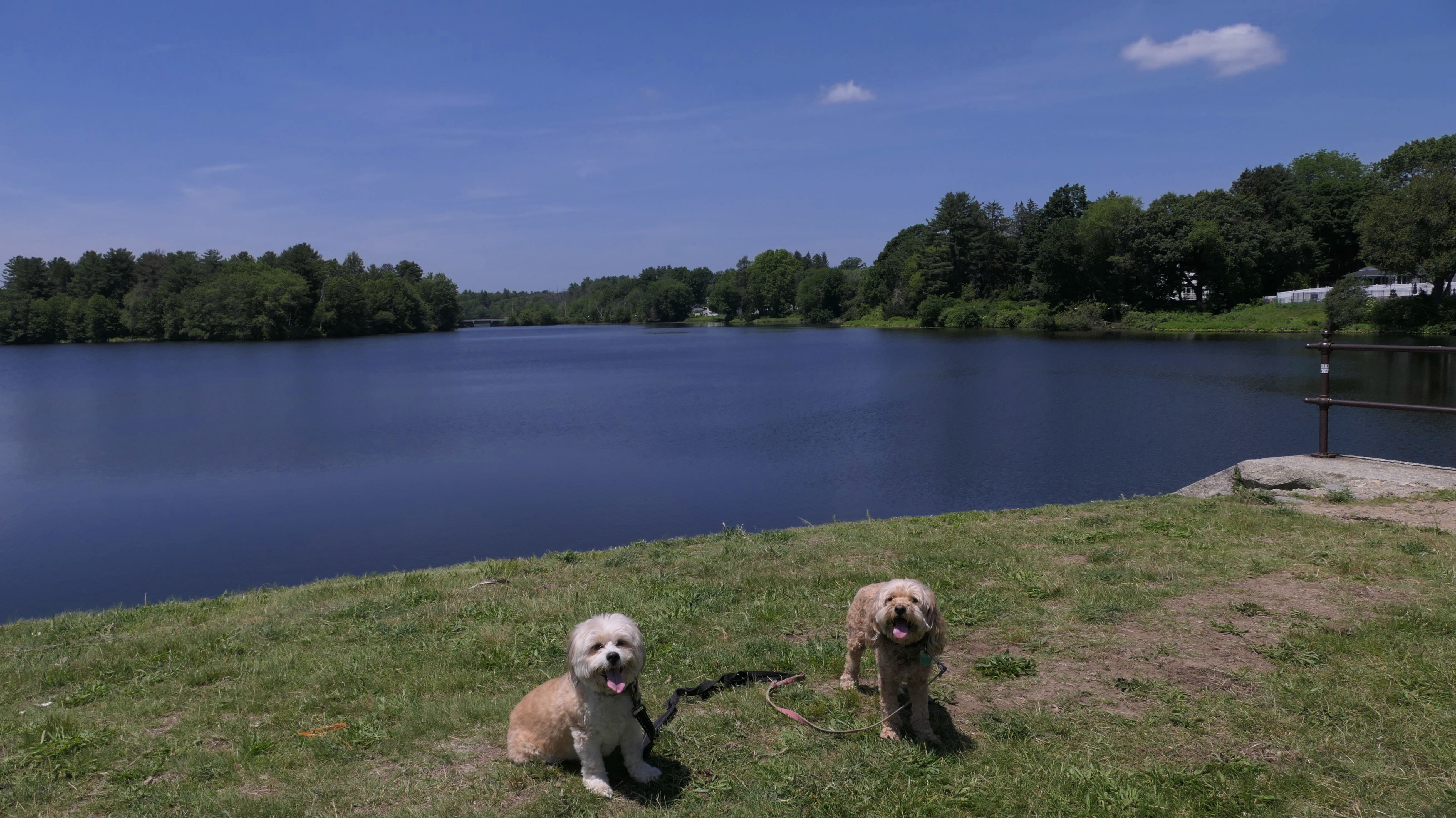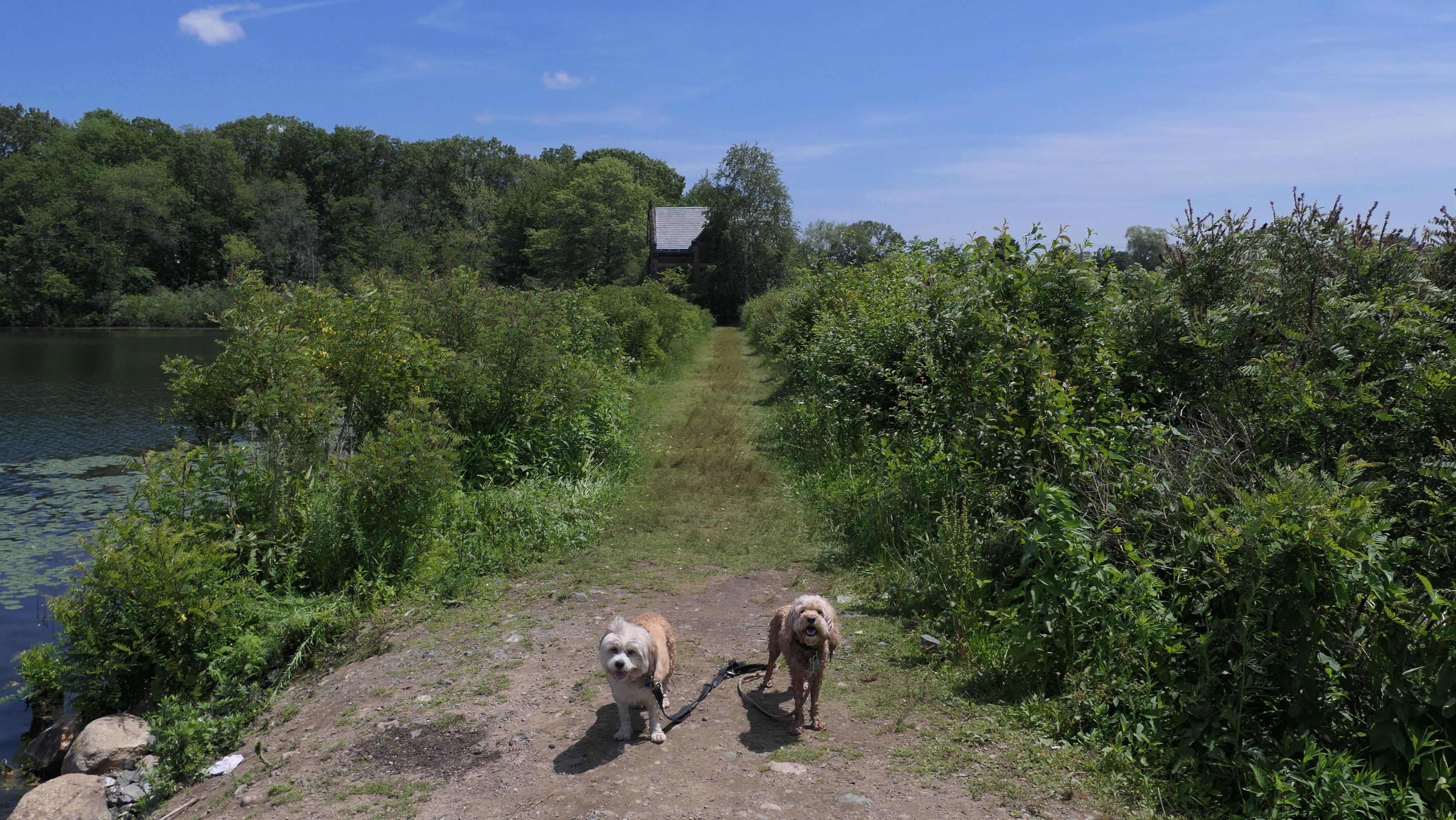 We started our five mile walk around Framingham parks here. We parked near the playground, and after walking a bit down a paved path, we quickly crossed the street over to Cushing Memorial Park and the Sudbury Aqueduct Trail, but returned here to finish our loop. The uniqueness of this park is the trail across the land bridge that goes right through the middle of the pond. There's a building of some sort at the end of the trail, but it's fenced off. Swans and ducks populate the pond, and there are some great views. Mandy and Lexi got to cool off a bit as there was a couple of spots where the pond was accessible and not too mucky. This was a pretty place to take the dogs for a walk.