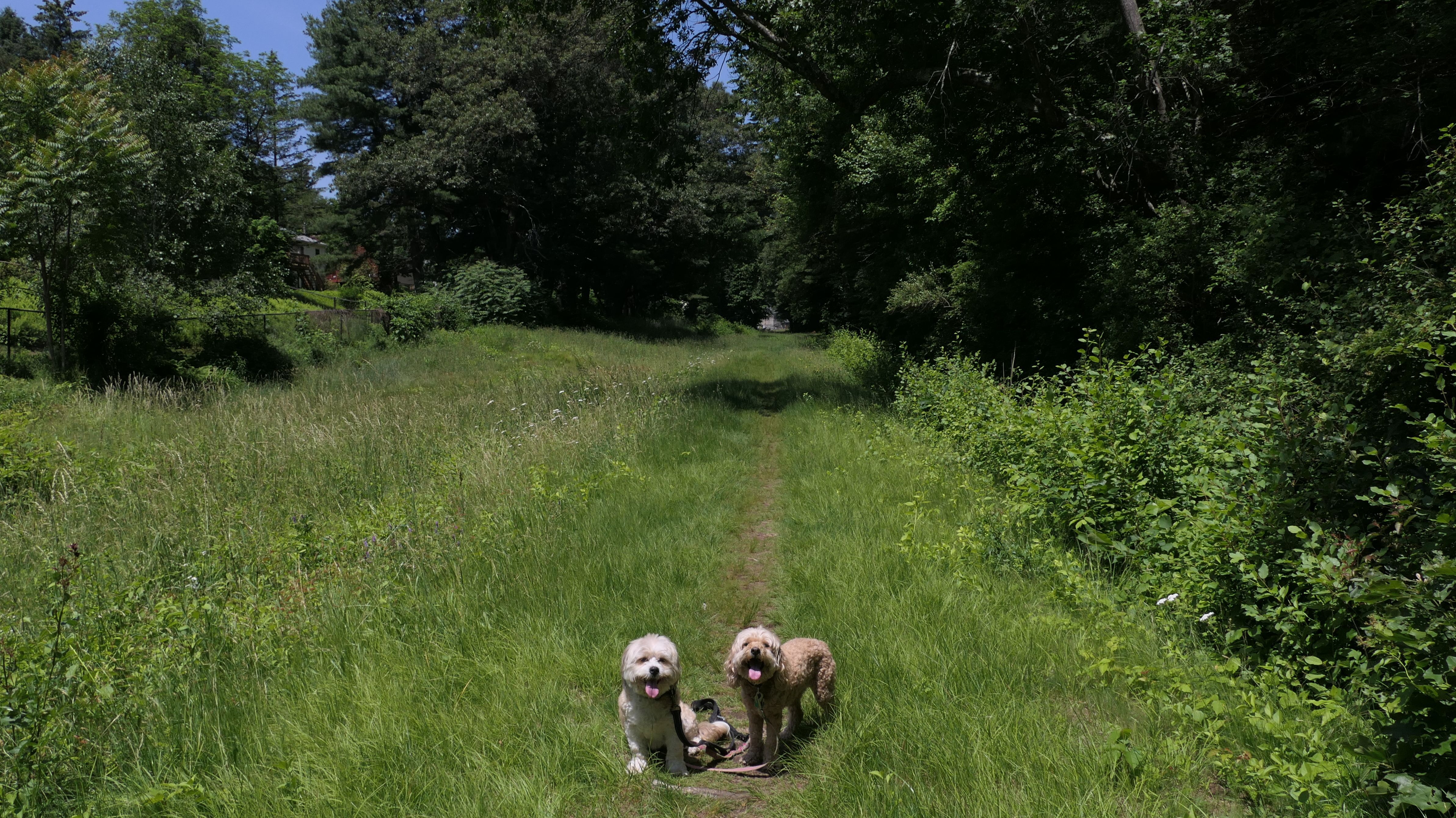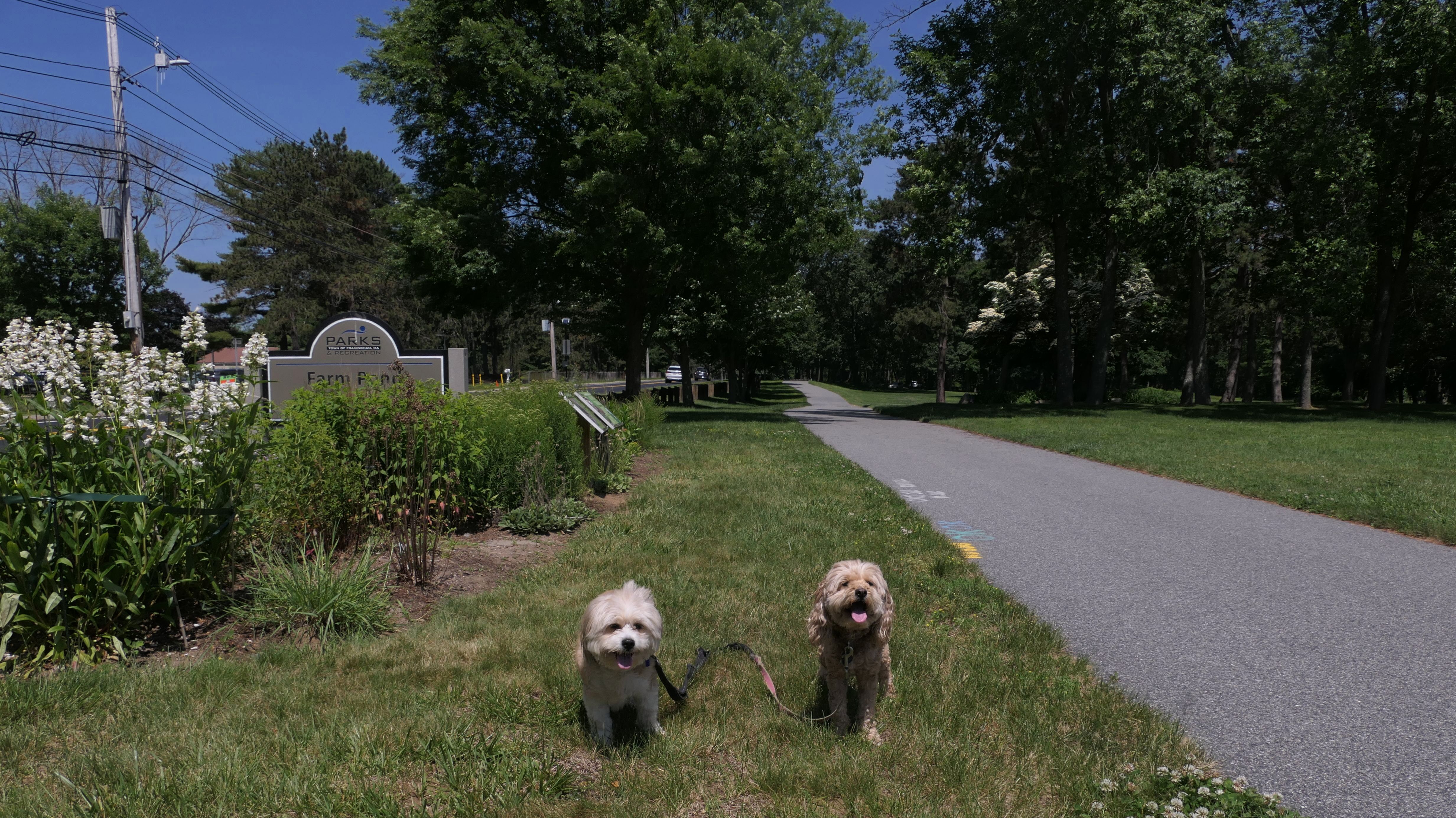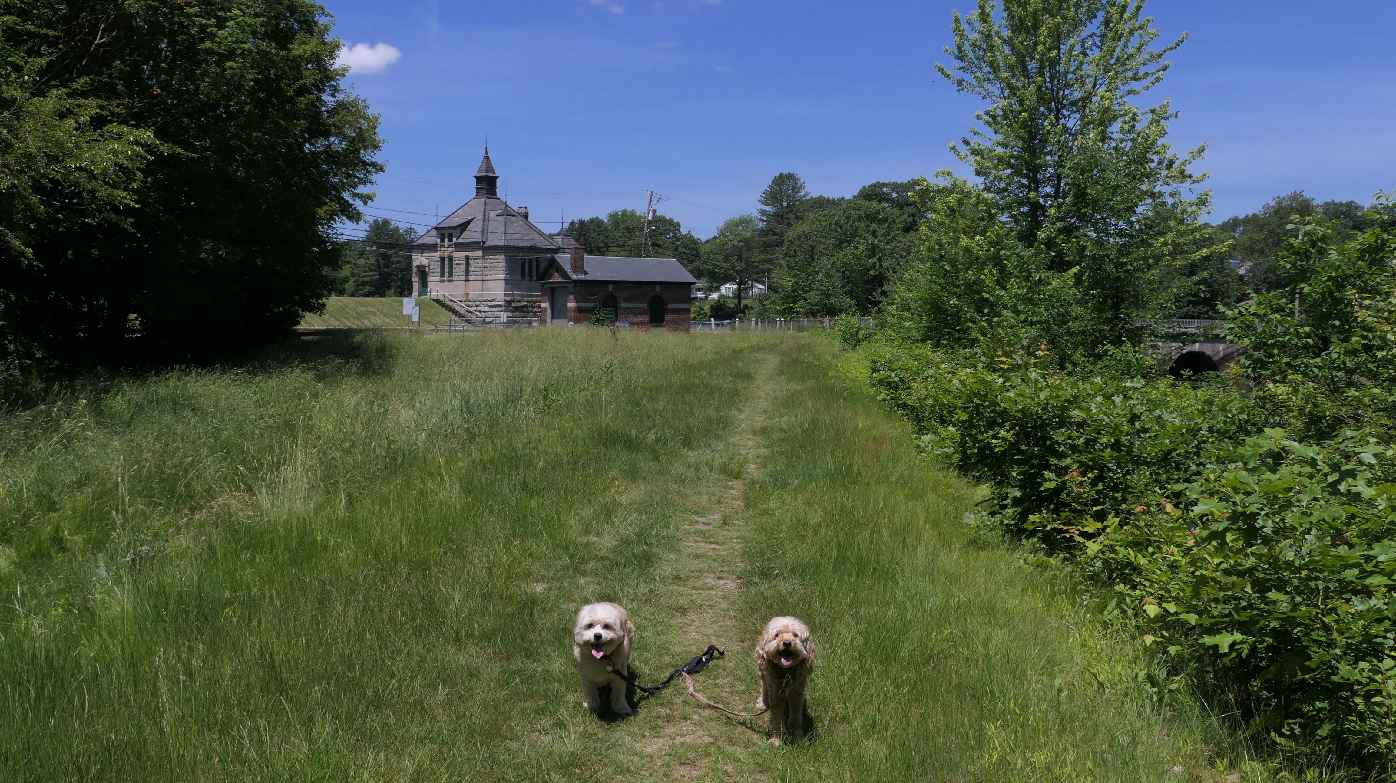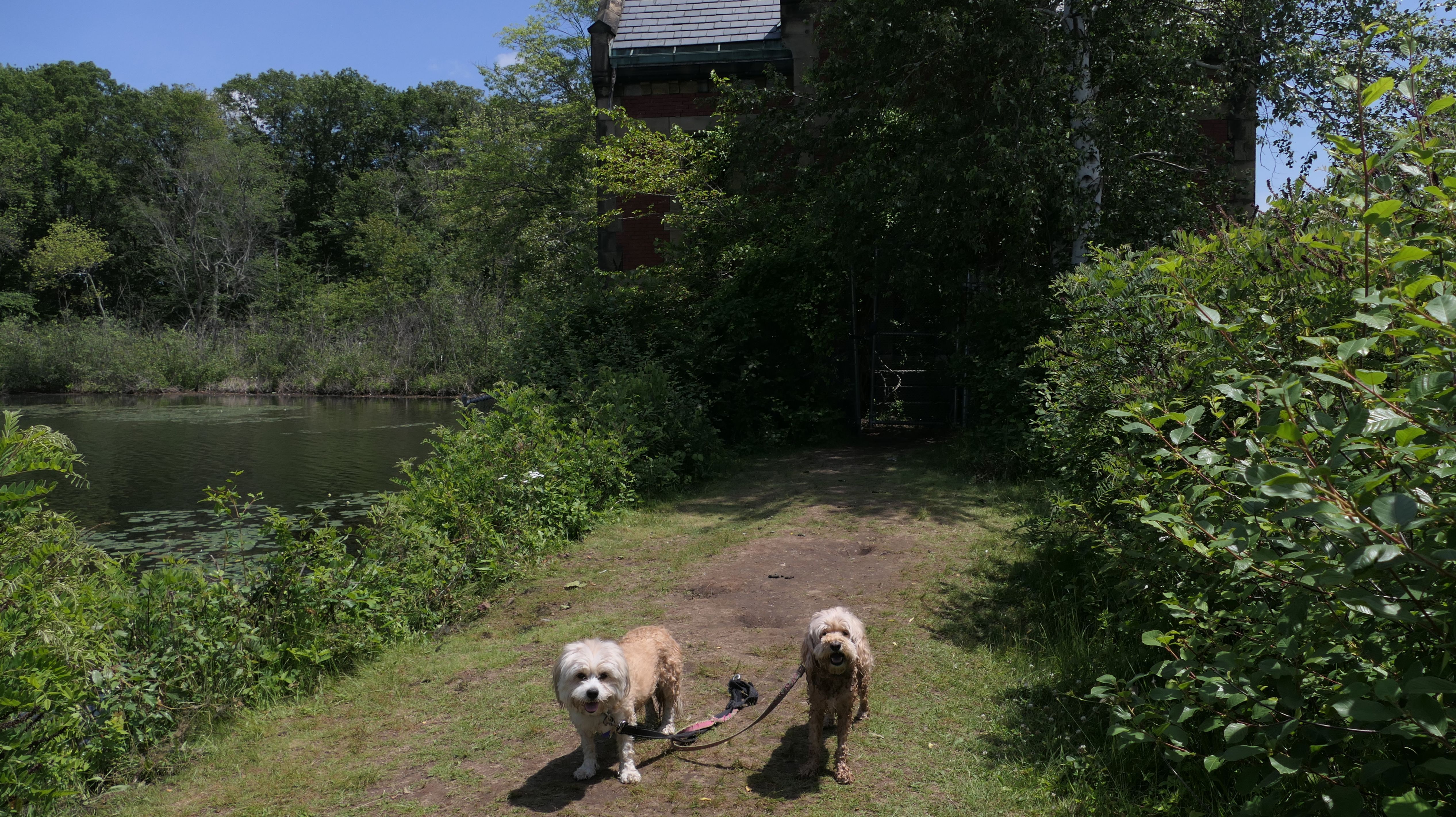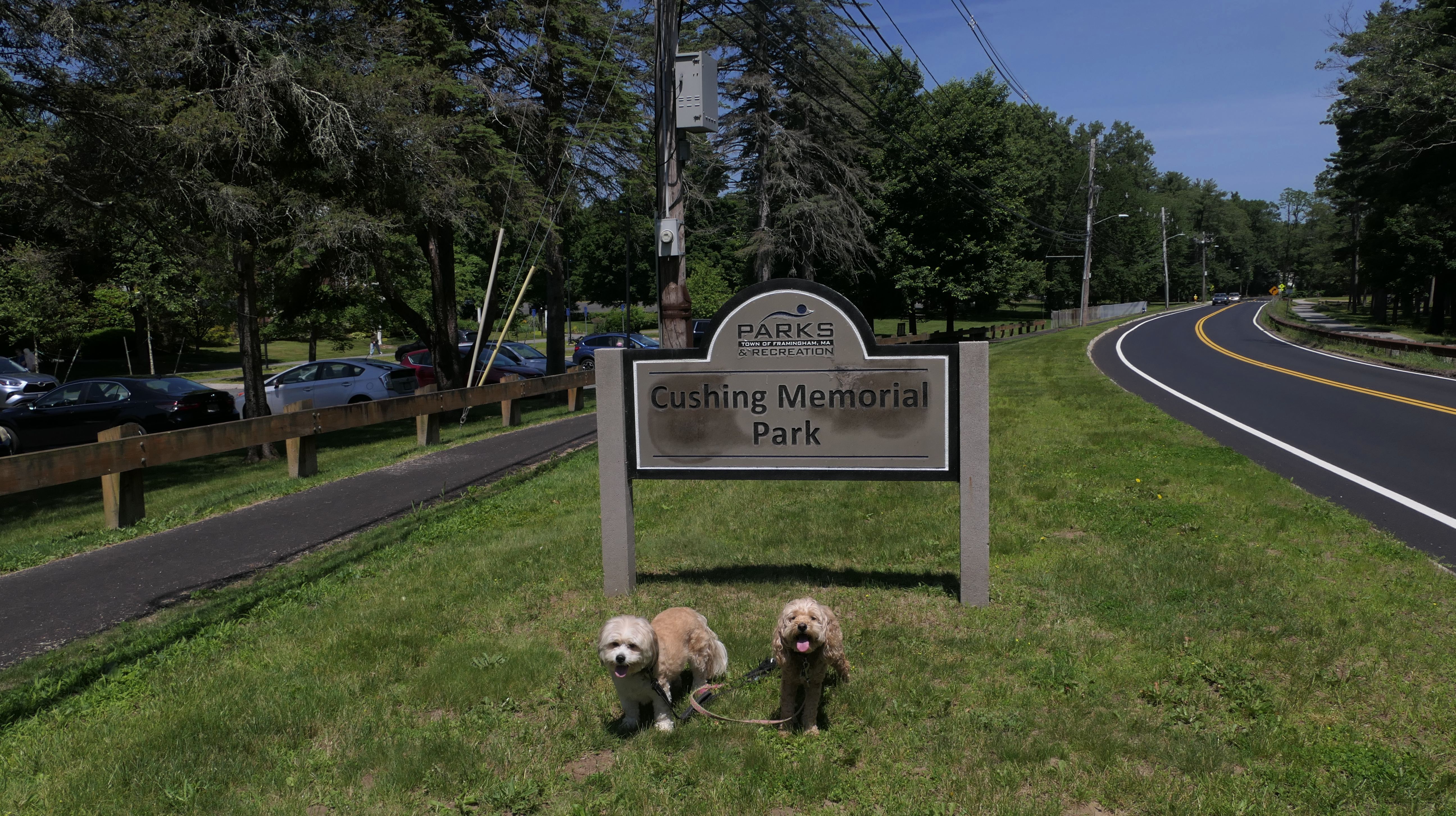 We started our five mile walk around Framingham parks here. We parked near the playground, and after walking a bit down a paved path, we quickly crossed the street over to Cushing Memorial Park and the Sudbury Aqueduct Trail, but returned here to finish our loop. The uniqueness of this park is the trail across the land bridge that goes right through the middle of the pond. There's a building of some sort at the end of the trail, but it's fenced off. Swans and ducks populate the pond, and there are some great views. Mandy and Lexi got to cool off a bit as there was a couple of spots where the pond was accessible and not too mucky. This was a pretty place to take the dogs for a walk.
