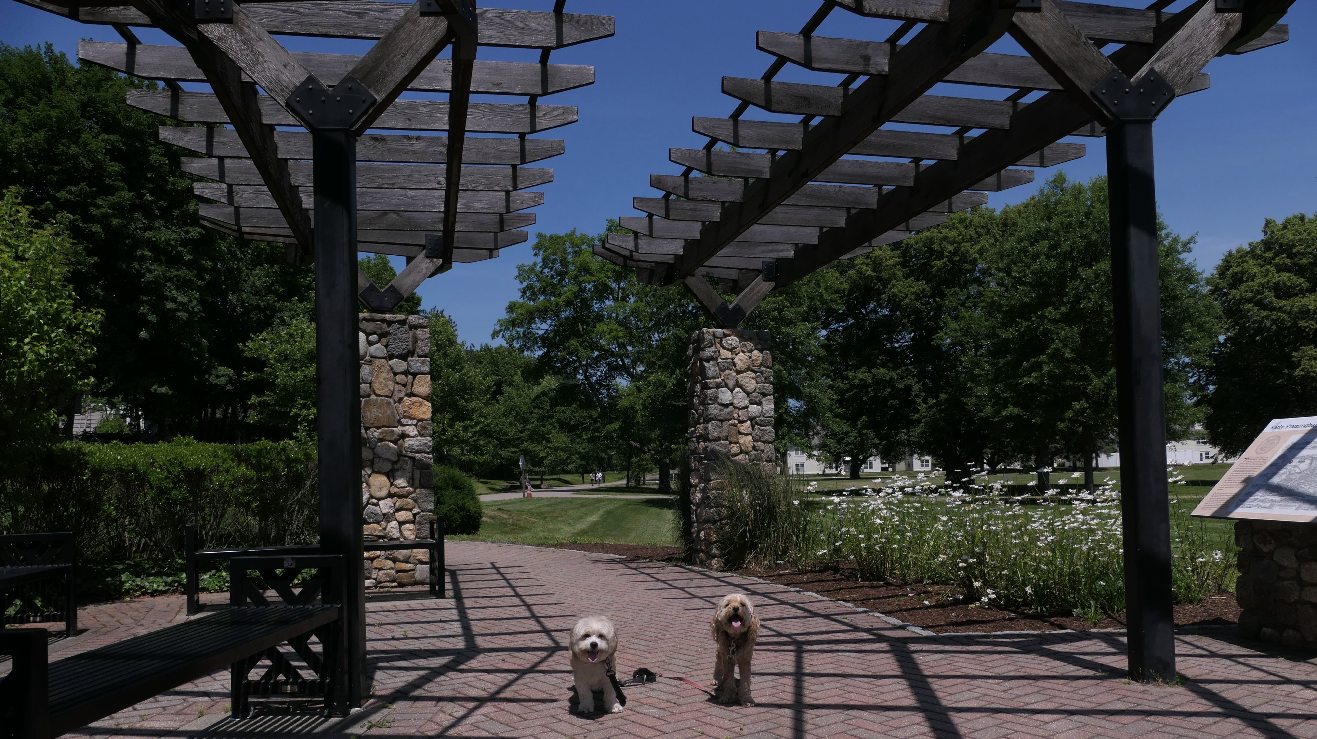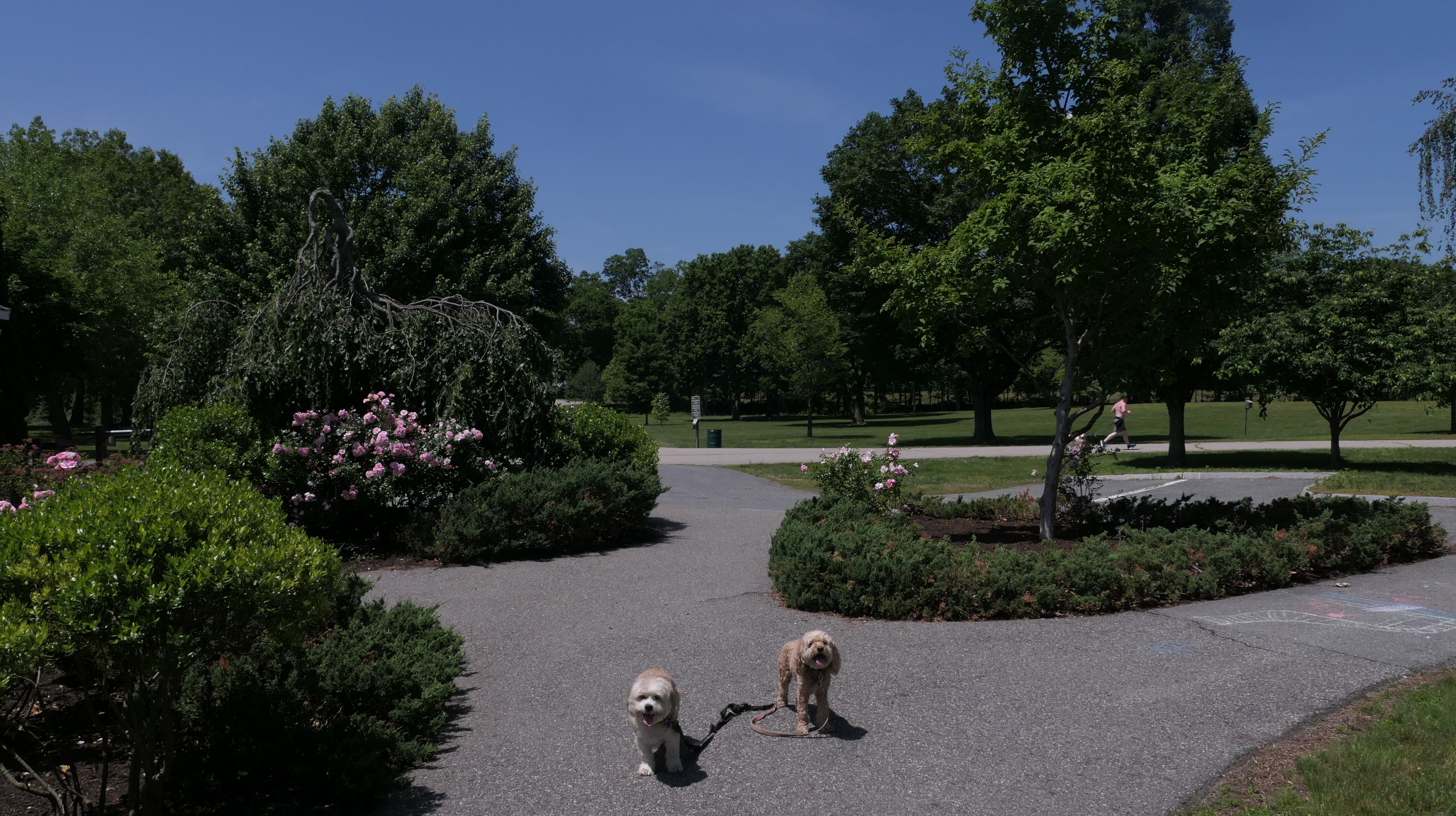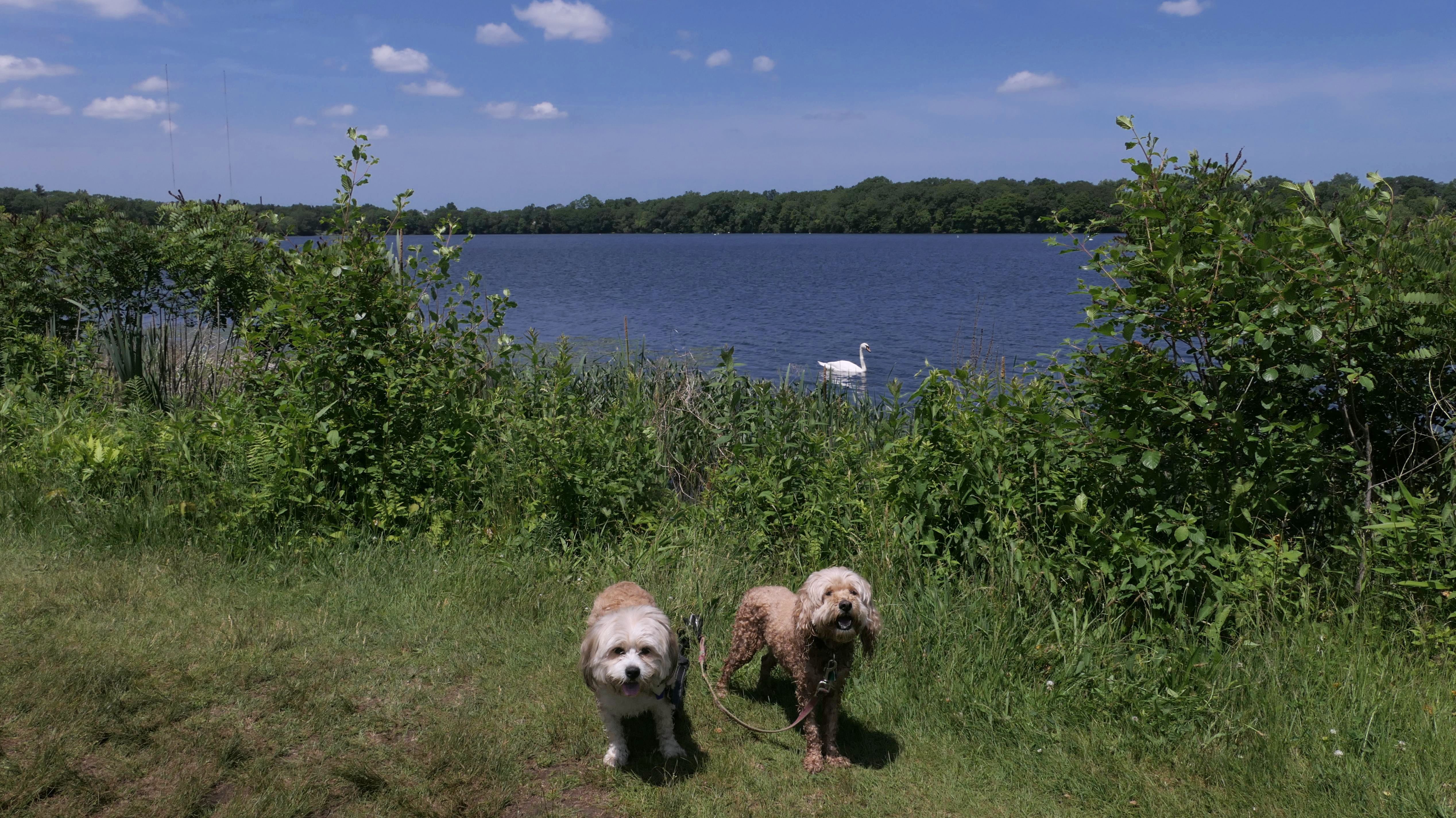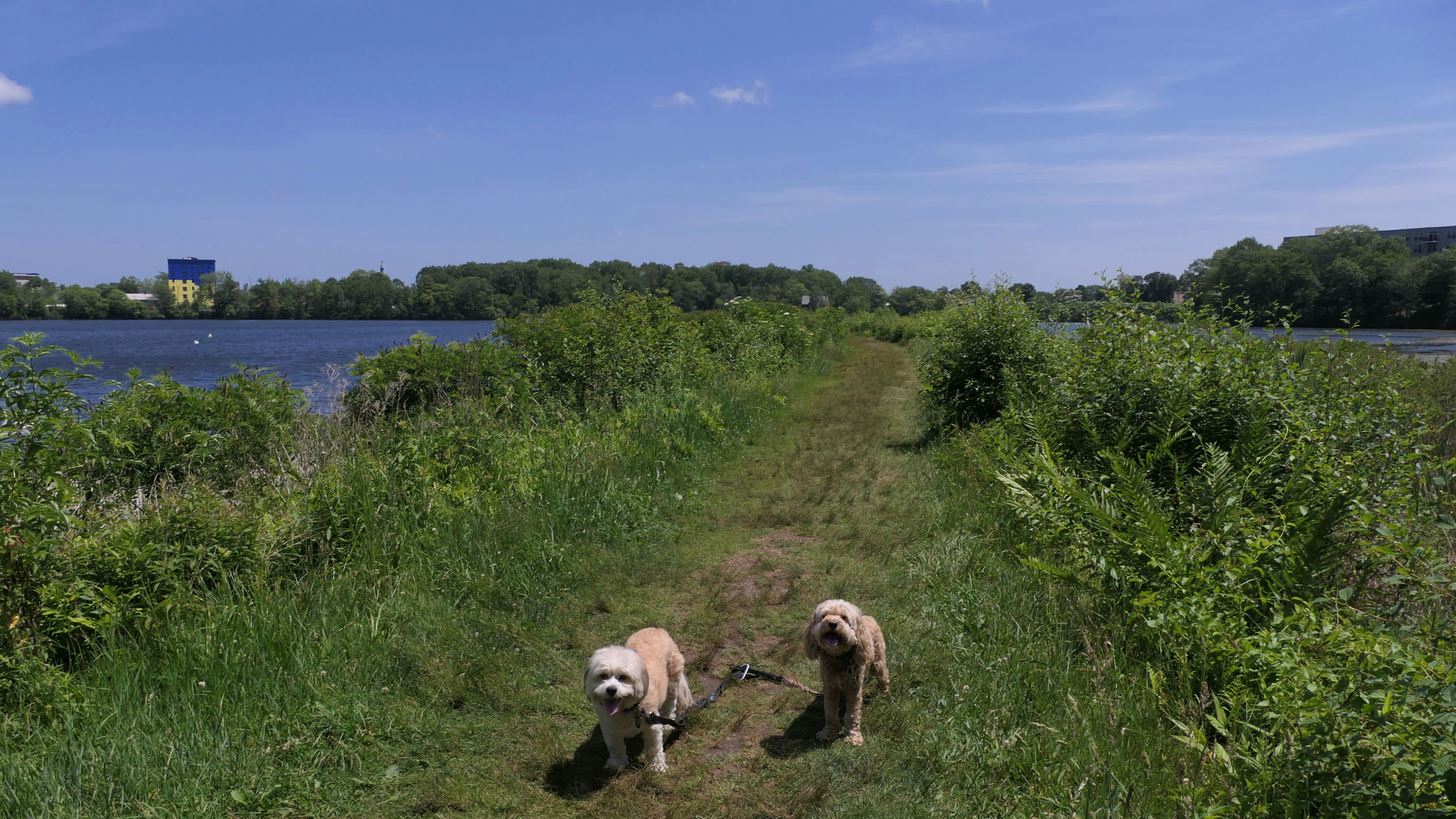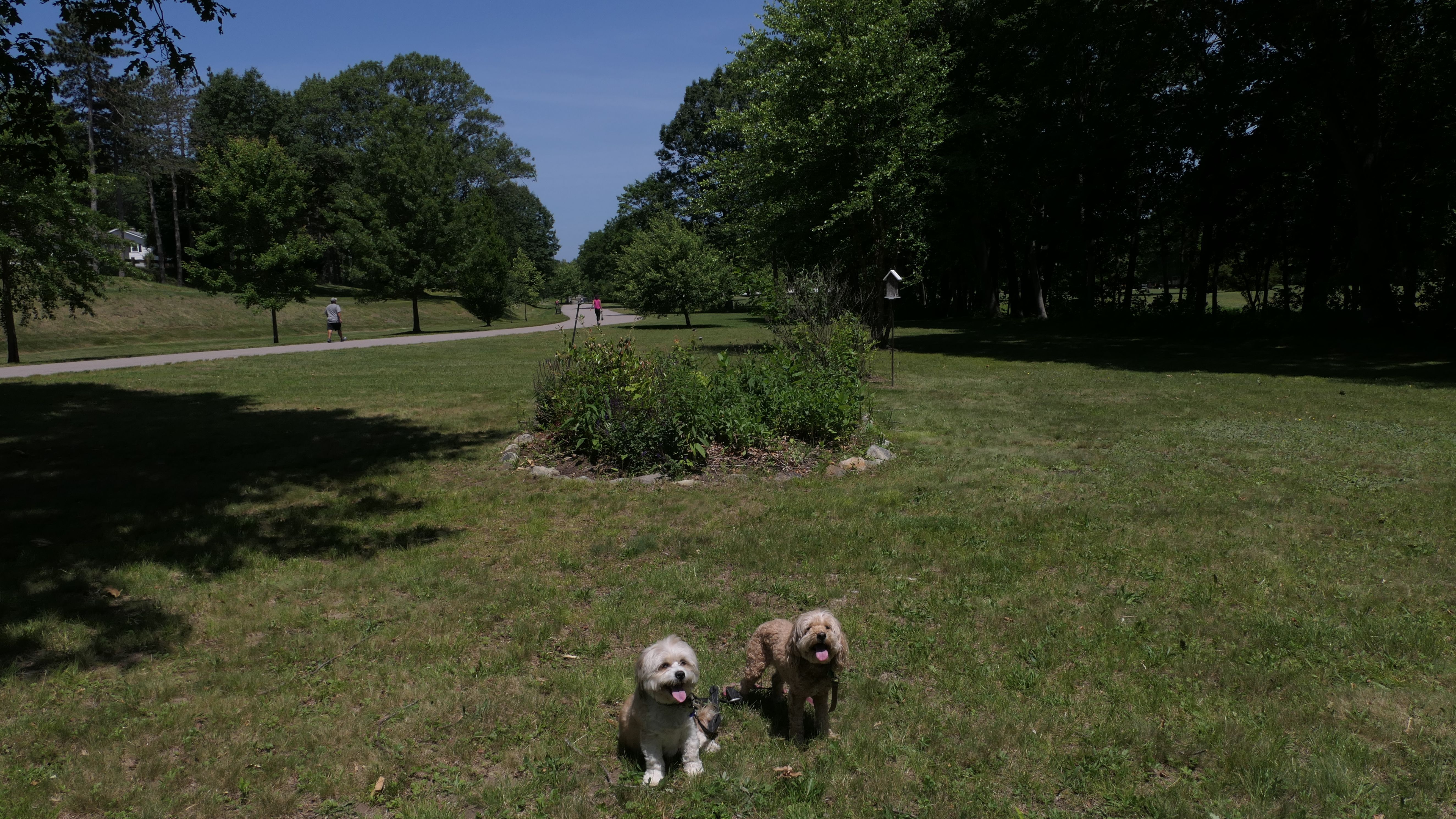 We started our five mile walk around Framingham parks here. We parked near the playground, and after walking a bit down a paved path, we quickly crossed the street over to Cushing Memorial Park and the Sudbury Aqueduct Trail, but returned here to finish our loop. The uniqueness of this park is the trail across the land bridge that goes right through the middle of the pond. There's a building of some sort at the end of the trail, but it's fenced off. Swans and ducks populate the pond, and there are some great views. Mandy and Lexi got to cool off a bit as there was a couple of spots where the pond was accessible and not too mucky. This was a pretty place to take the dogs for a walk.