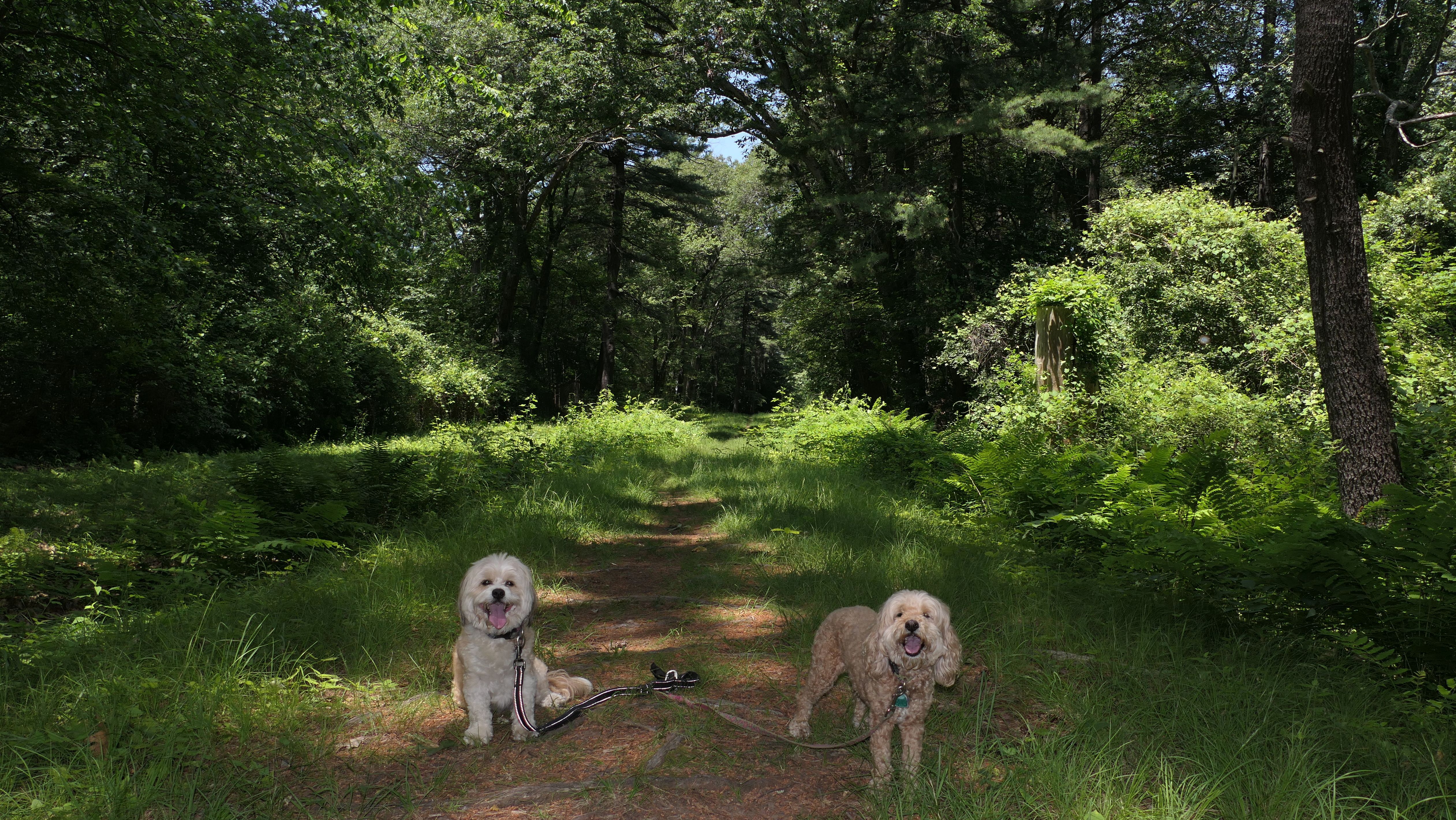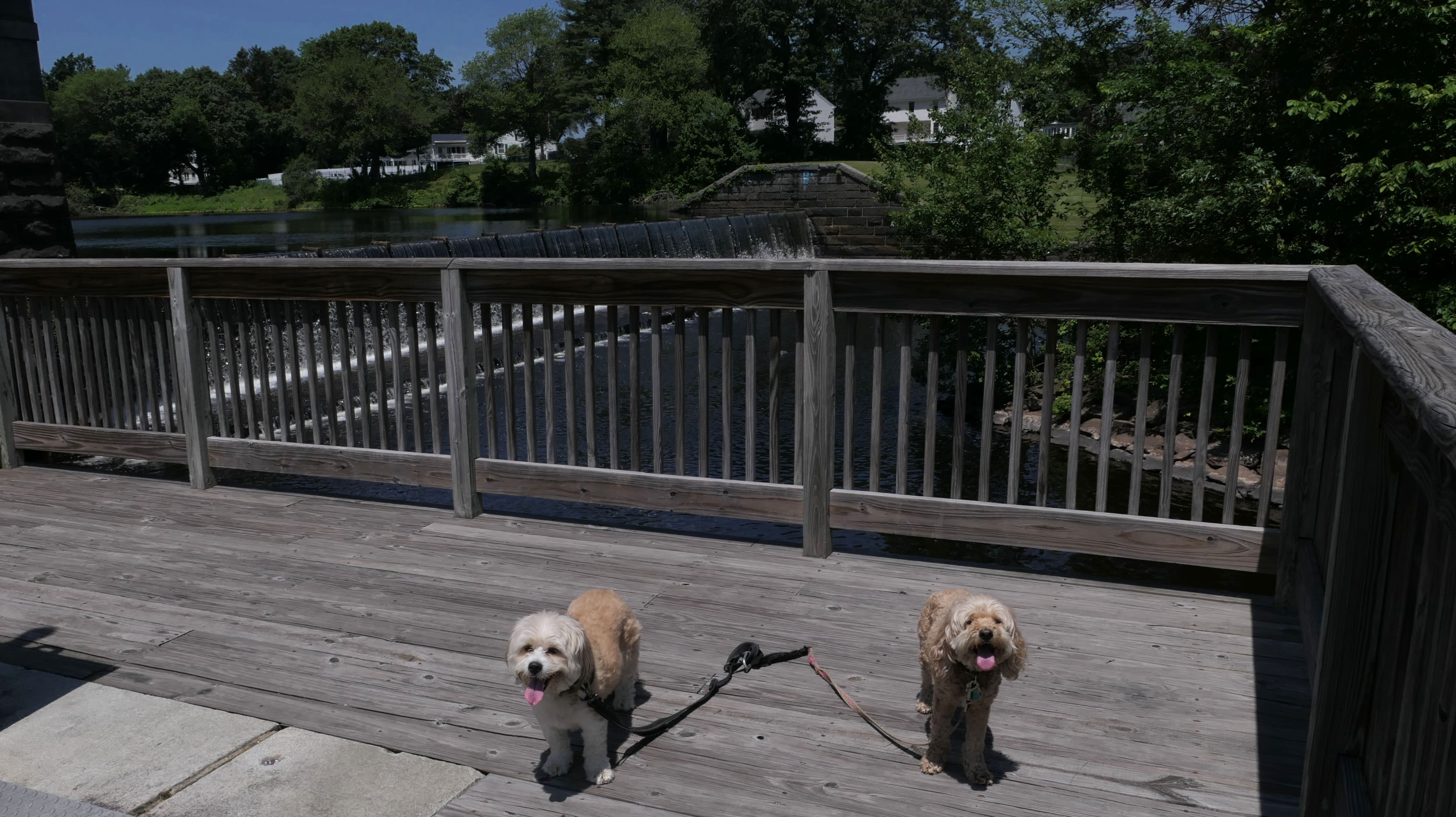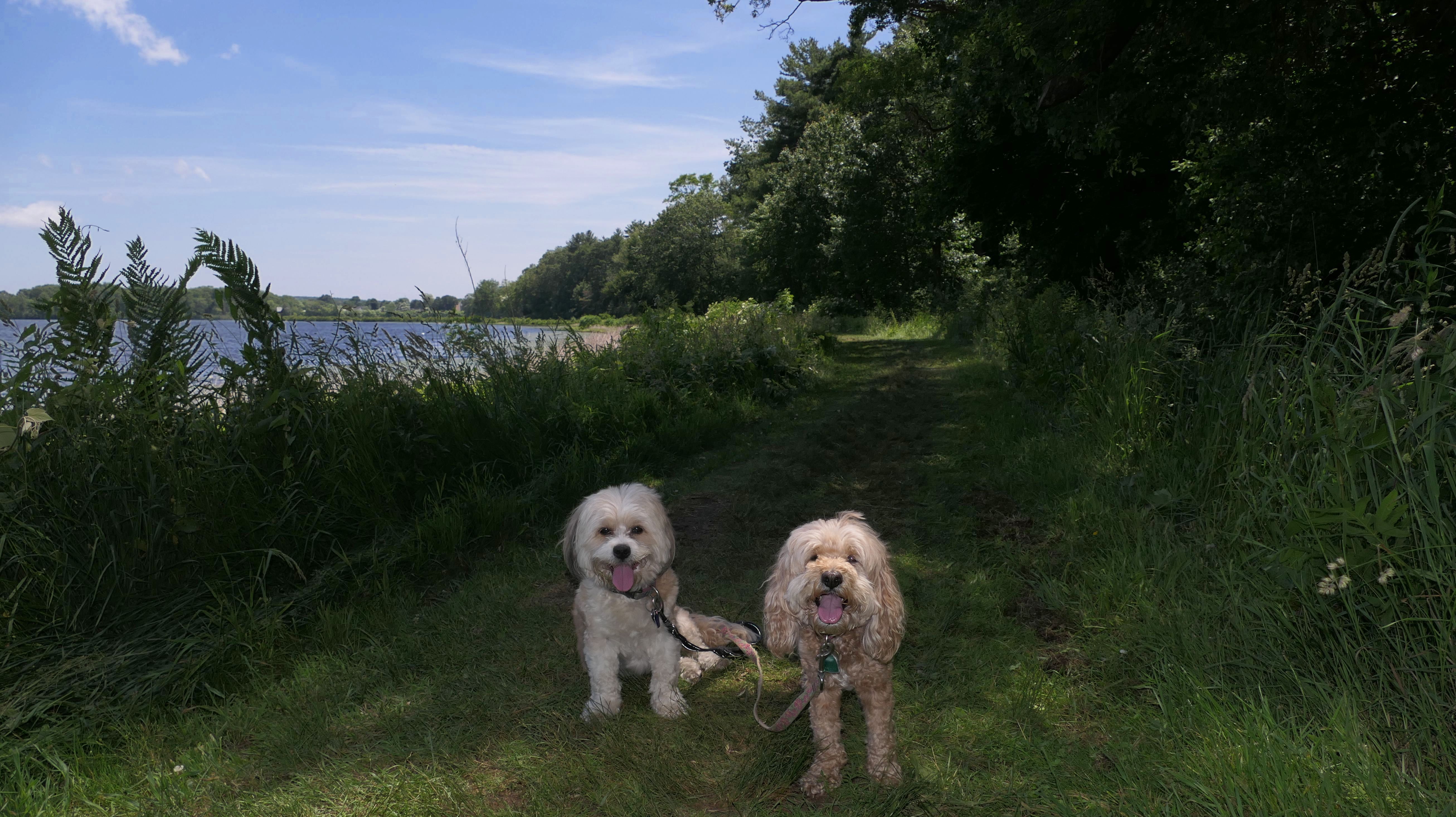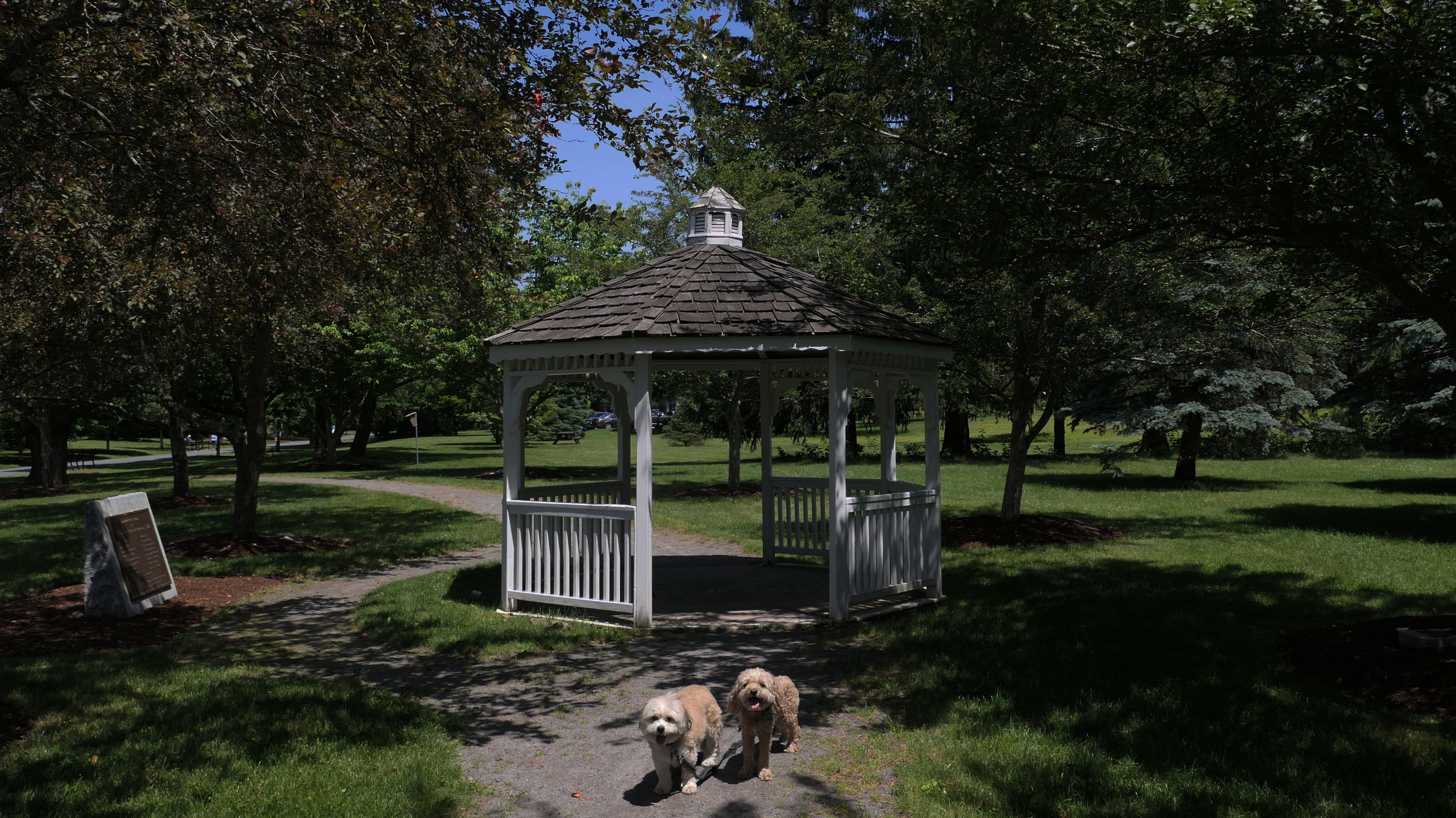 We started our five mile walk around Framingham parks here. We parked near the playground, and after walking a bit down a paved path, we quickly crossed the street over to Cushing Memorial Park and the Sudbury Aqueduct Trail, but returned here to finish our loop. The uniqueness of this park is the trail across the land bridge that goes right through the middle of the pond. There's a building of some sort at the end of the trail, but it's fenced off. Swans and ducks populate the pond, and there are some great views. Mandy and Lexi got to cool off a bit as there was a couple of spots where the pond was accessible and not too mucky. This was a pretty place to take the dogs for a walk.