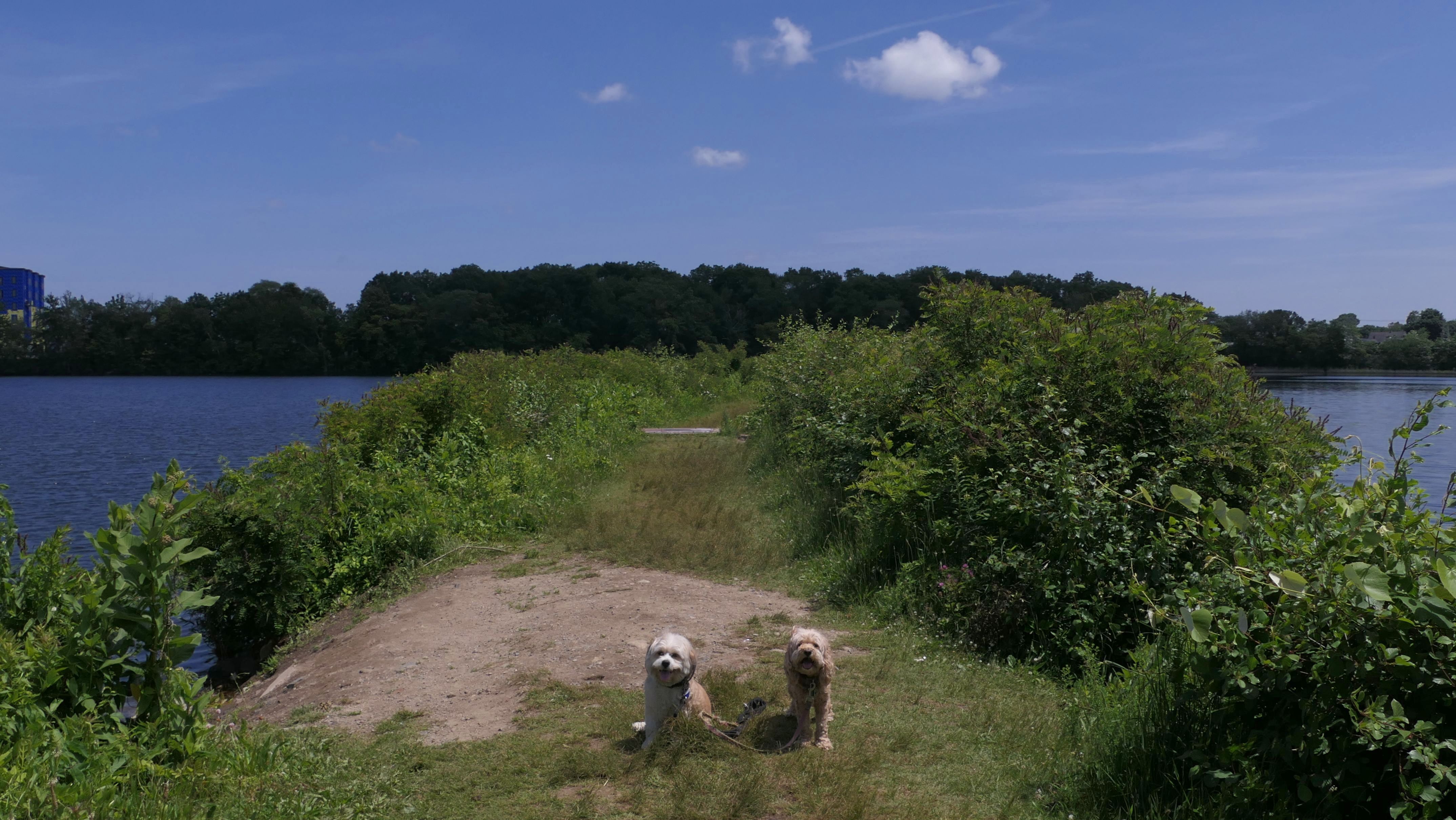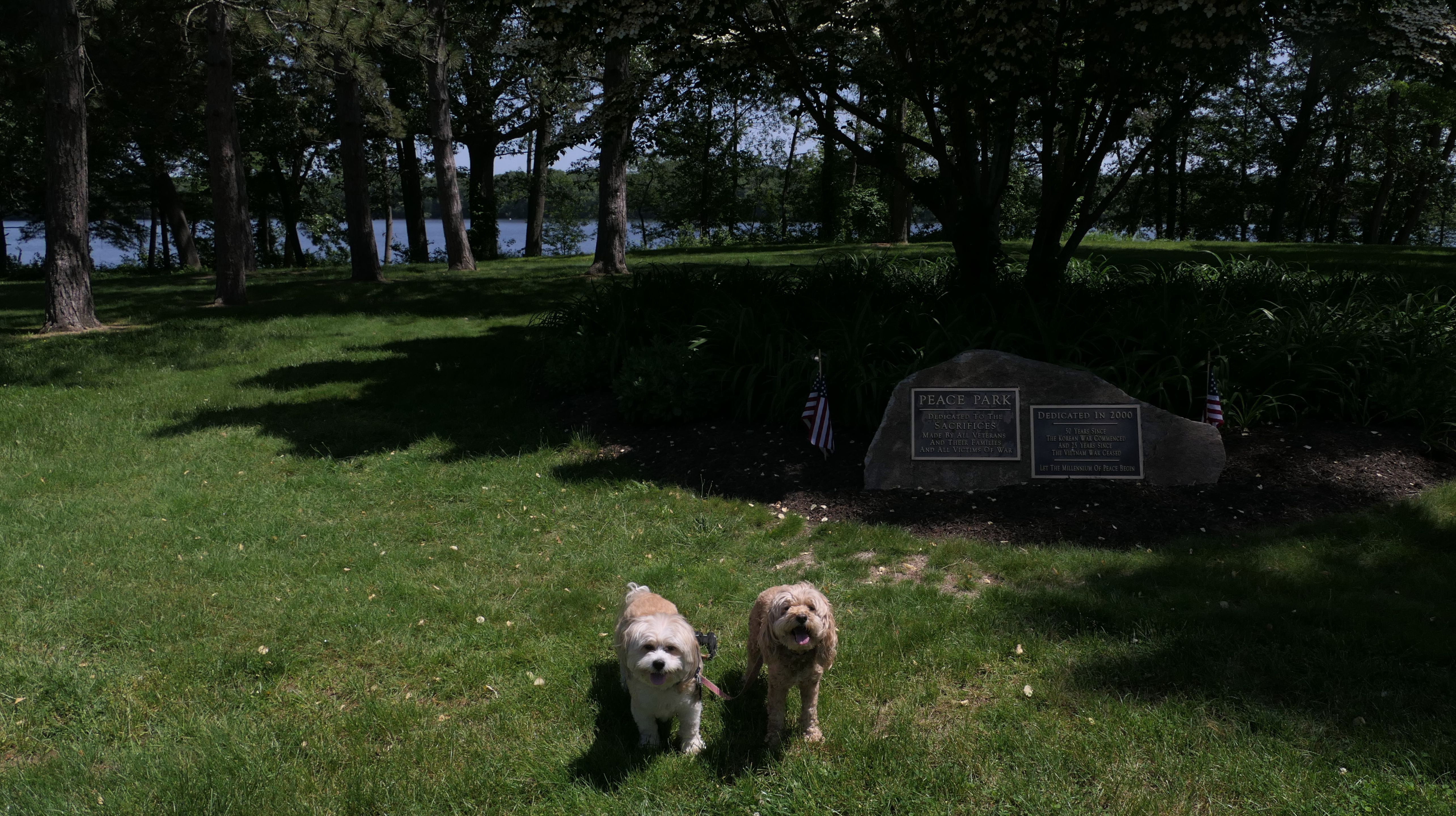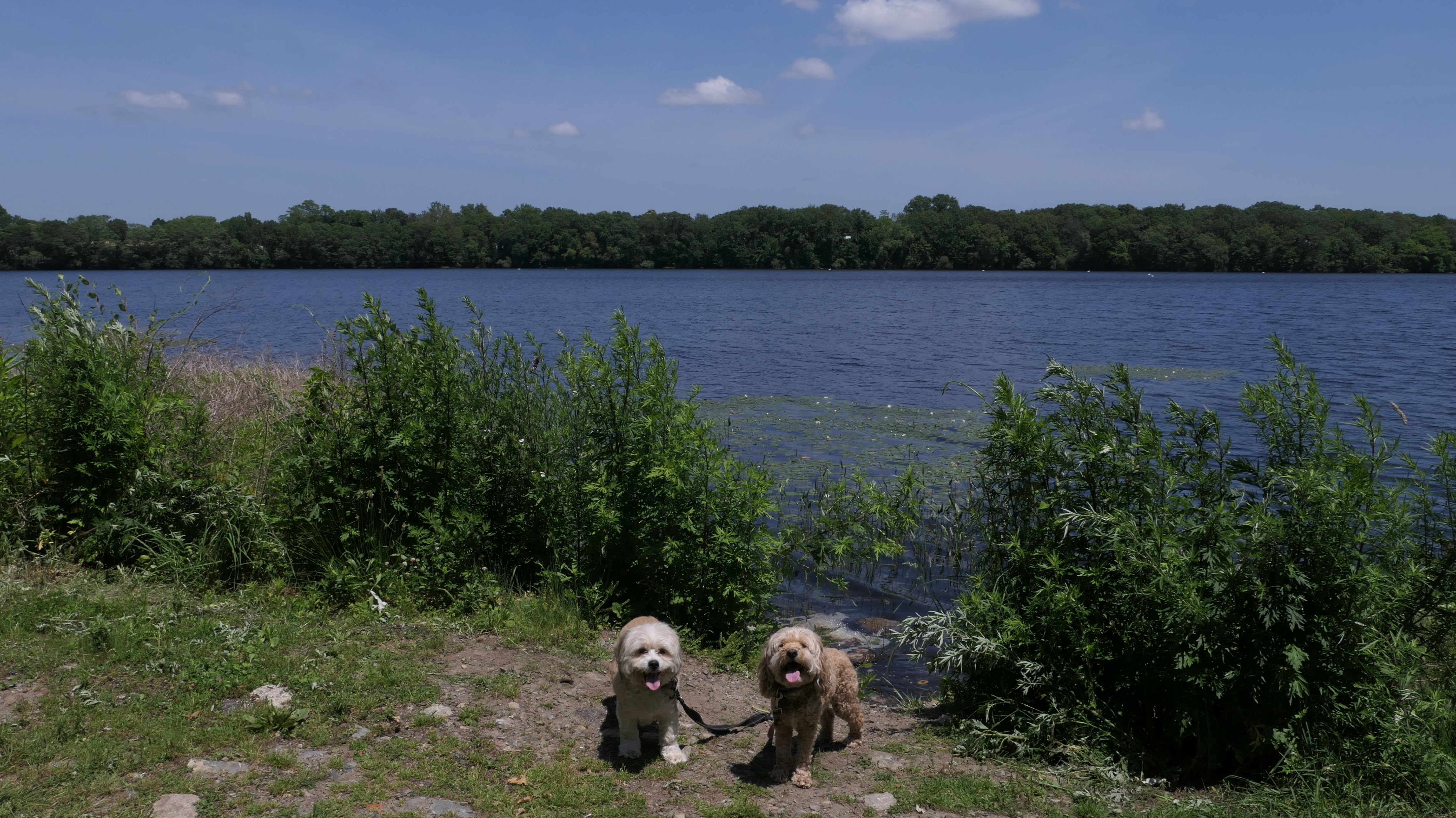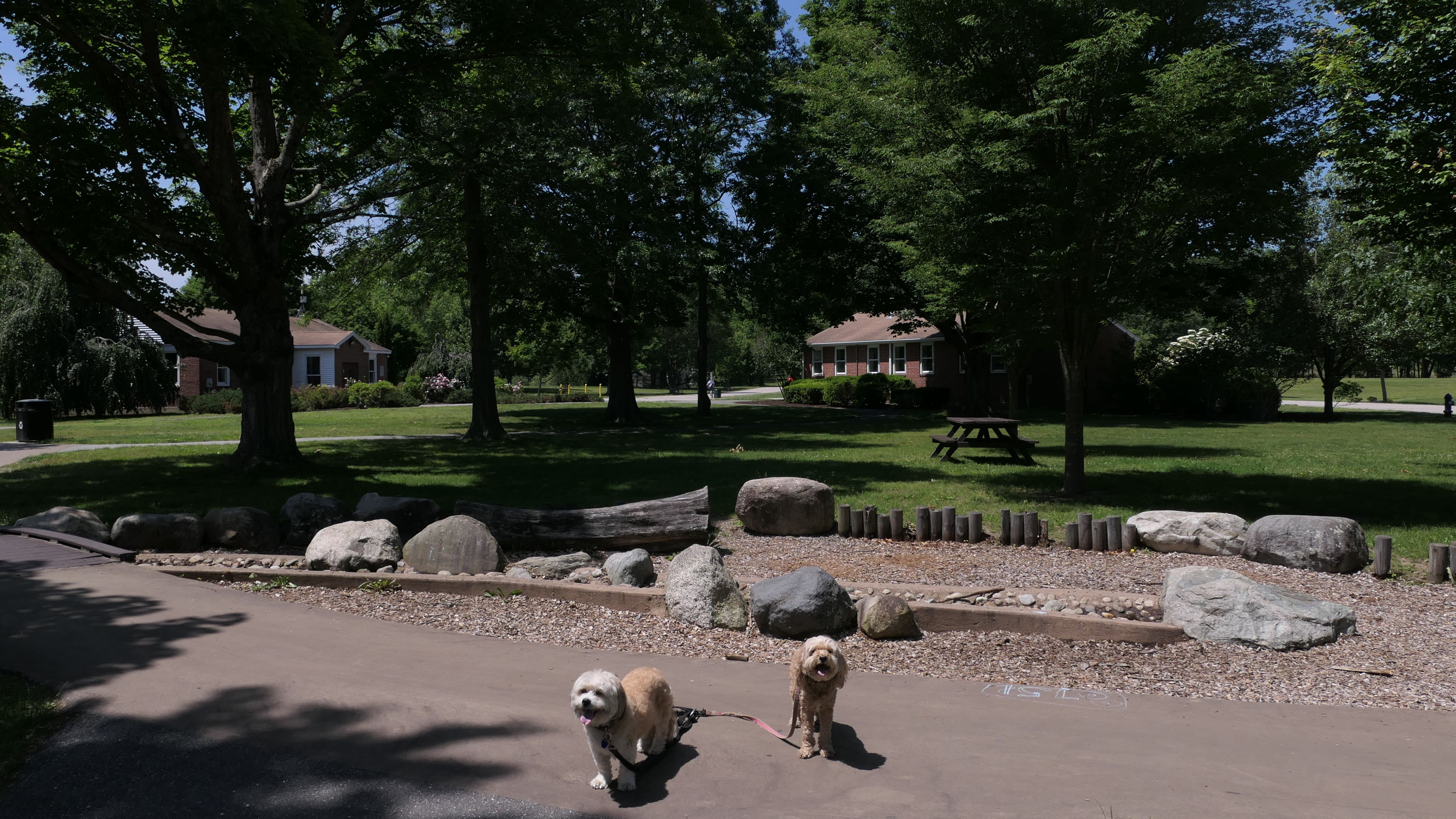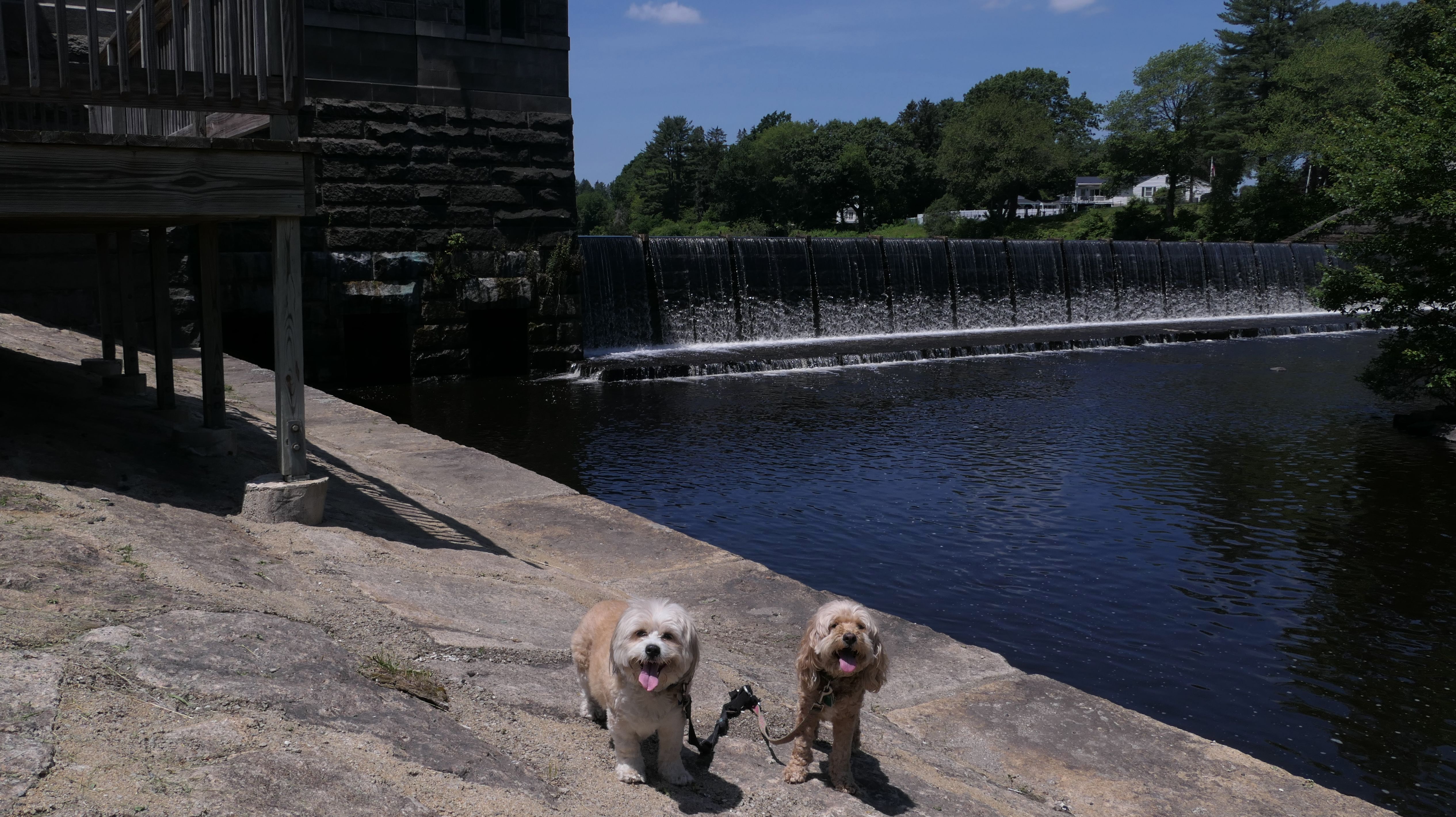 We started our five mile walk around Framingham parks here. We parked near the playground, and after walking a bit down a paved path, we quickly crossed the street over to Cushing Memorial Park and the Sudbury Aqueduct Trail, but returned here to finish our loop. The uniqueness of this park is the trail across the land bridge that goes right through the middle of the pond. There's a building of some sort at the end of the trail, but it's fenced off. Swans and ducks populate the pond, and there are some great views. Mandy and Lexi got to cool off a bit as there was a couple of spots where the pond was accessible and not too mucky. This was a pretty place to take the dogs for a walk.
