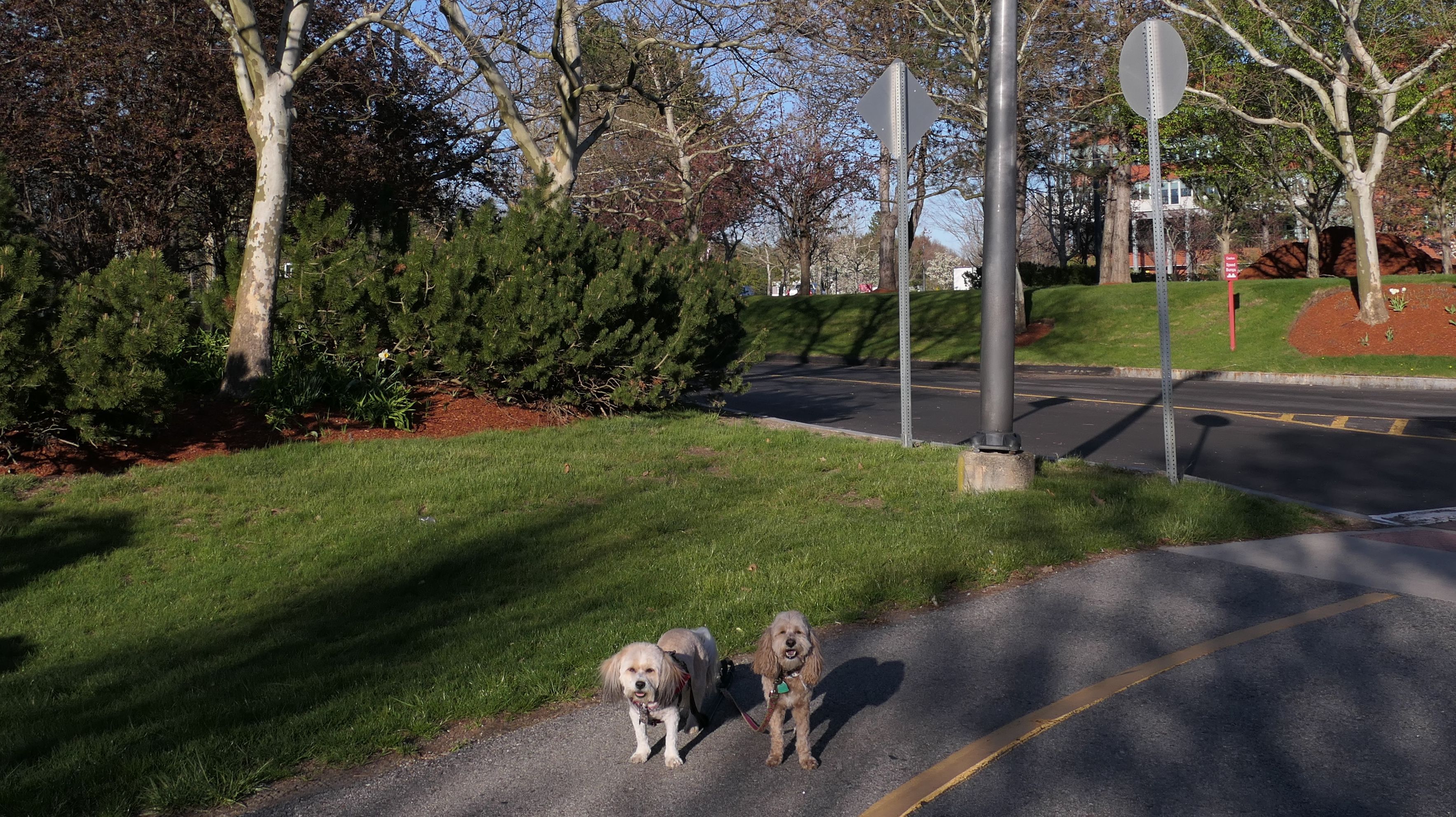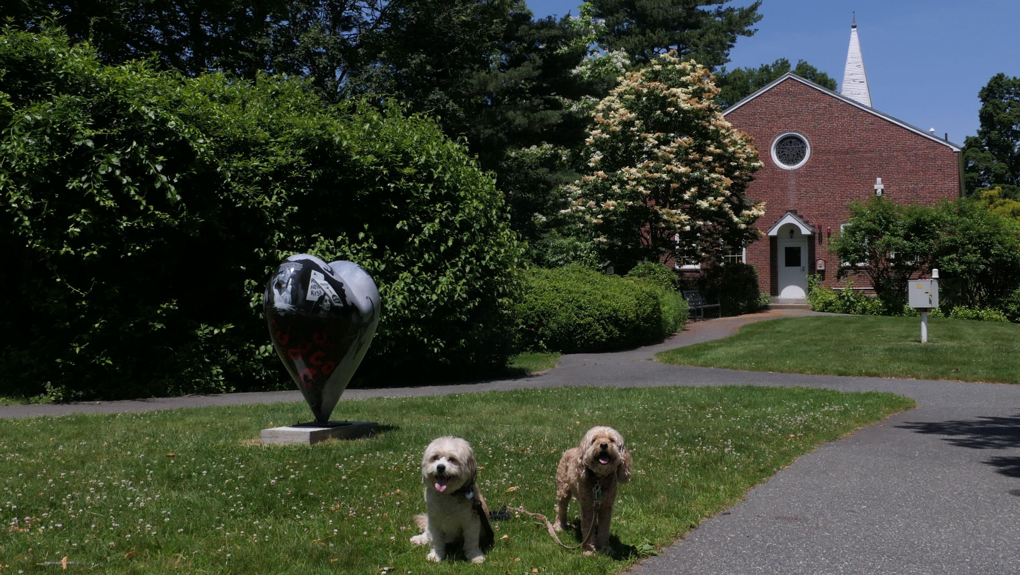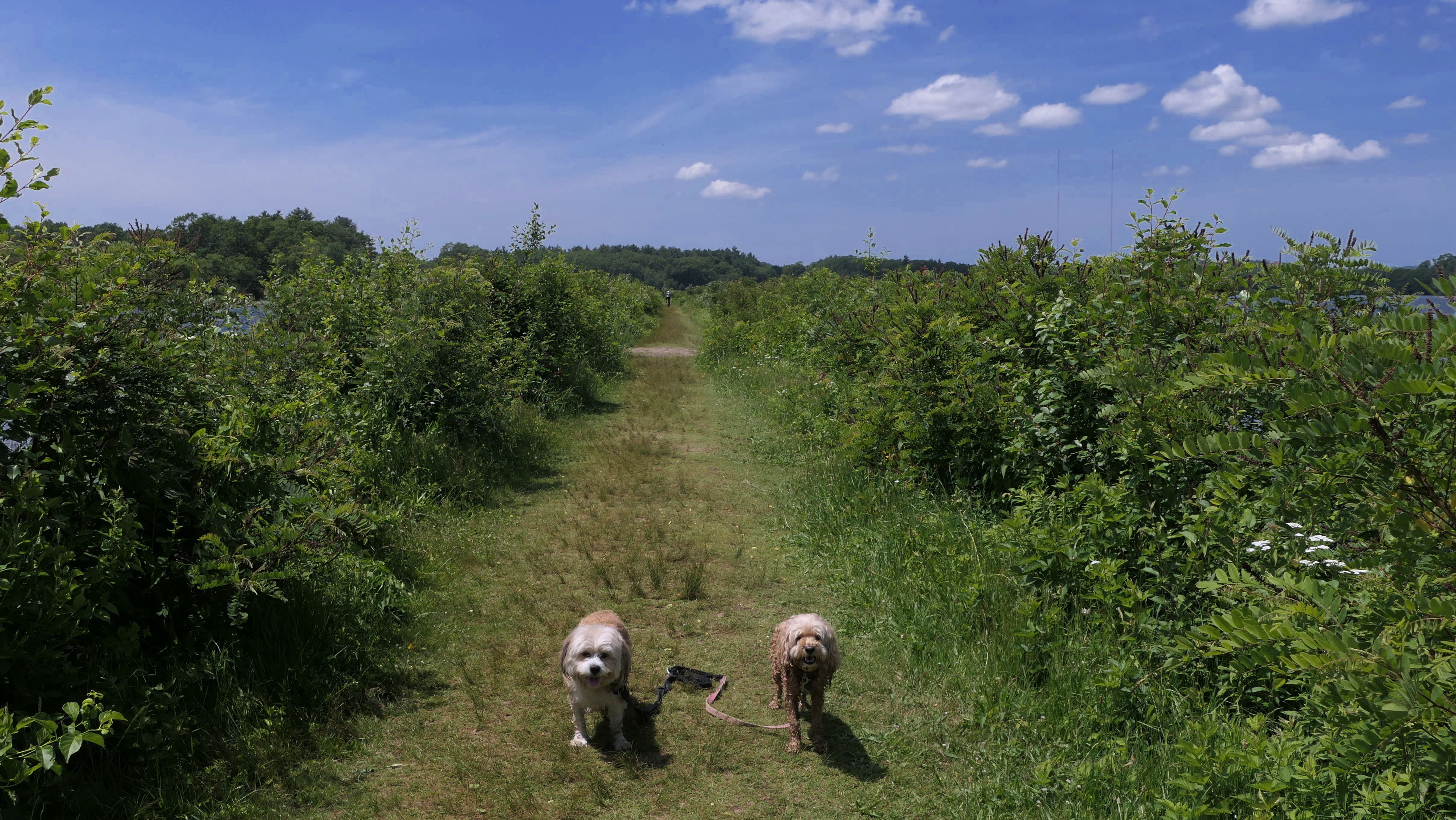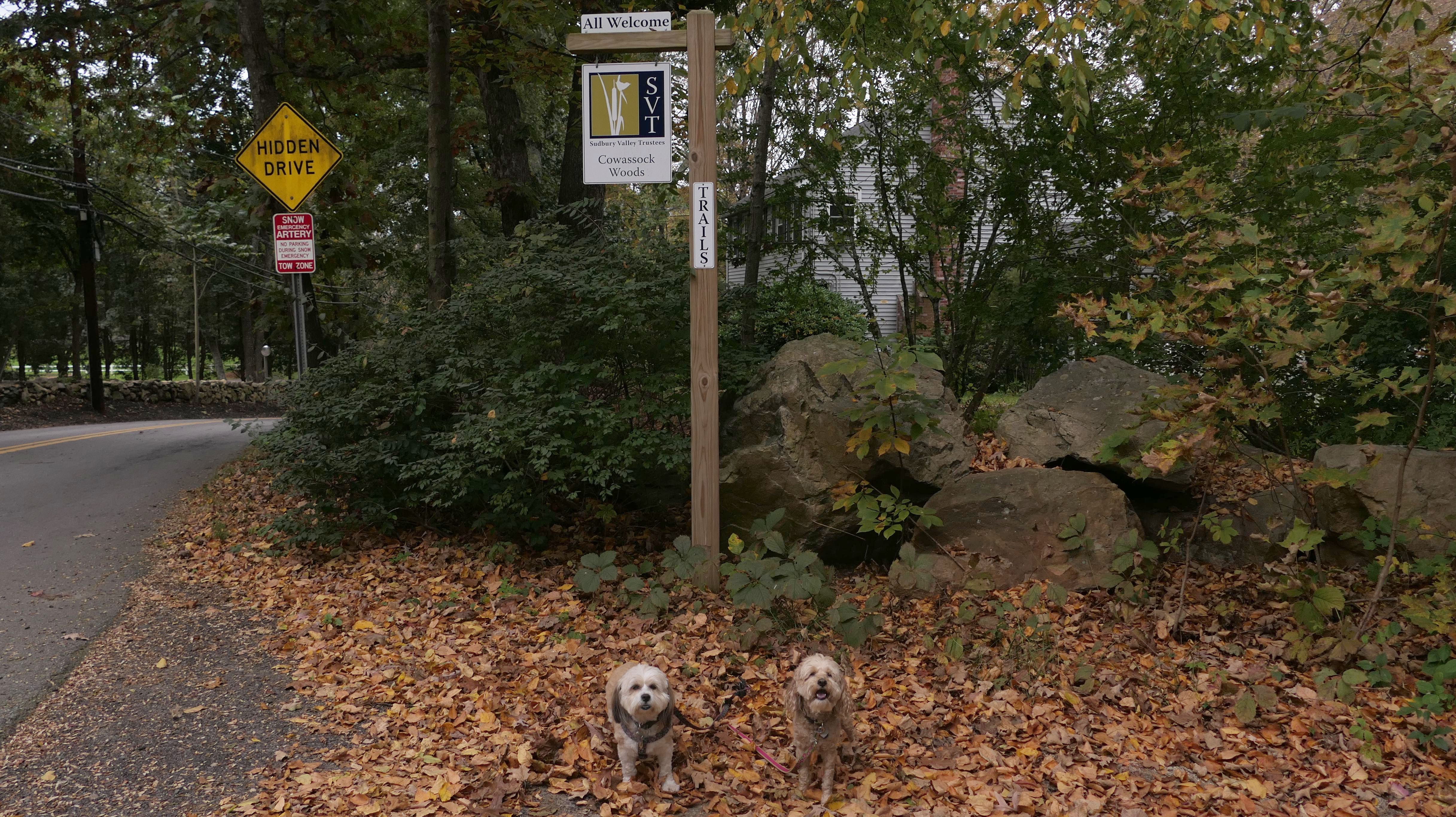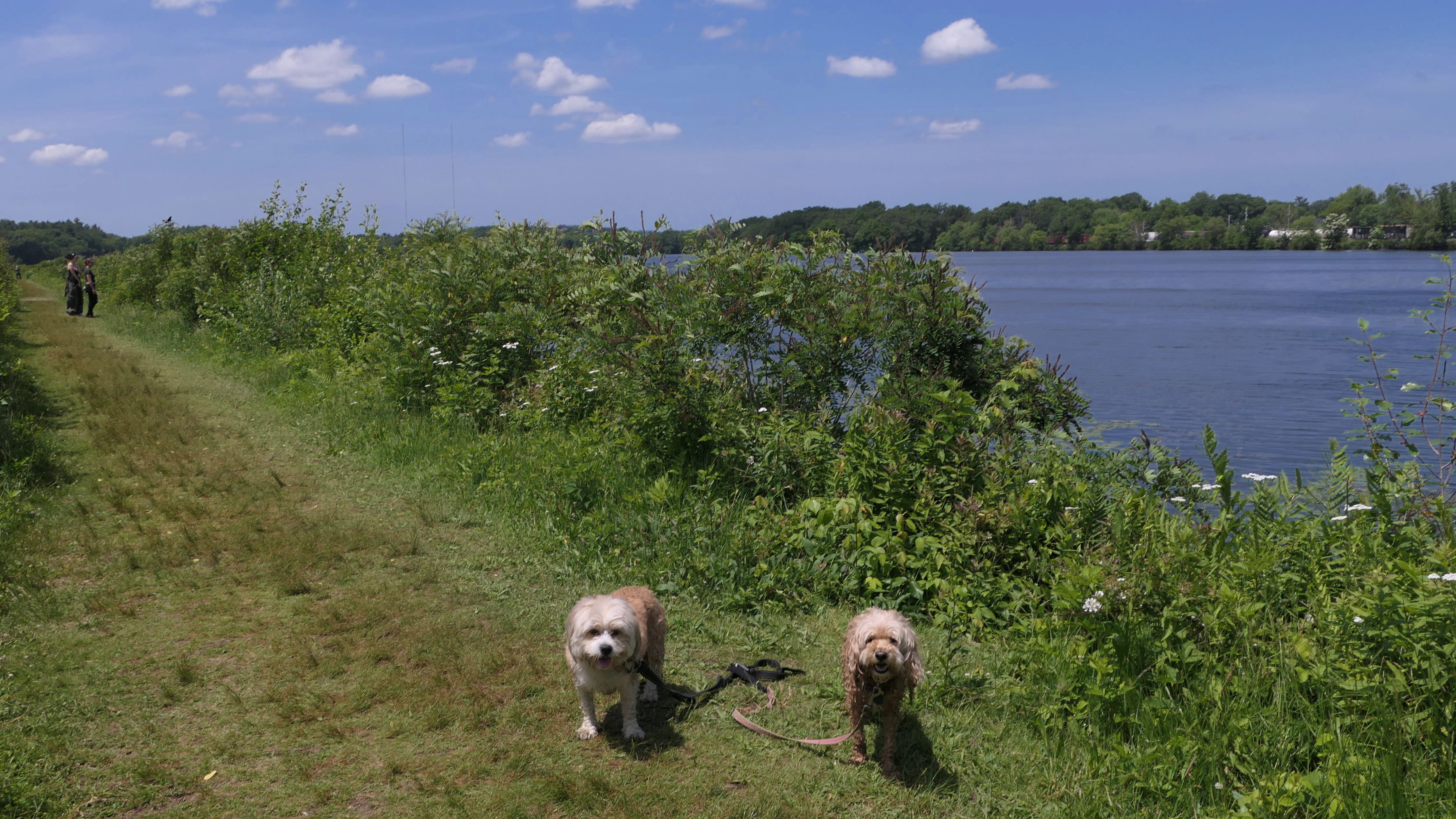We started our five mile walk around Framingham parks here. We parked near the playground, and after walking a bit down a paved path, we quickly crossed the street over to Cushing Memorial Park and the Sudbury Aqueduct Trail, but returned here to finish our loop. The uniqueness of this park is the trail across the land bridge that goes right through the middle of the pond. There's a building of some sort at the end of the trail, but it's fenced off. Swans and ducks populate the pond, and there are some great views. Mandy and Lexi got to cool off a bit as there was a couple of spots where the pond was accessible and not too mucky. This was a pretty place to take the dogs for a walk.