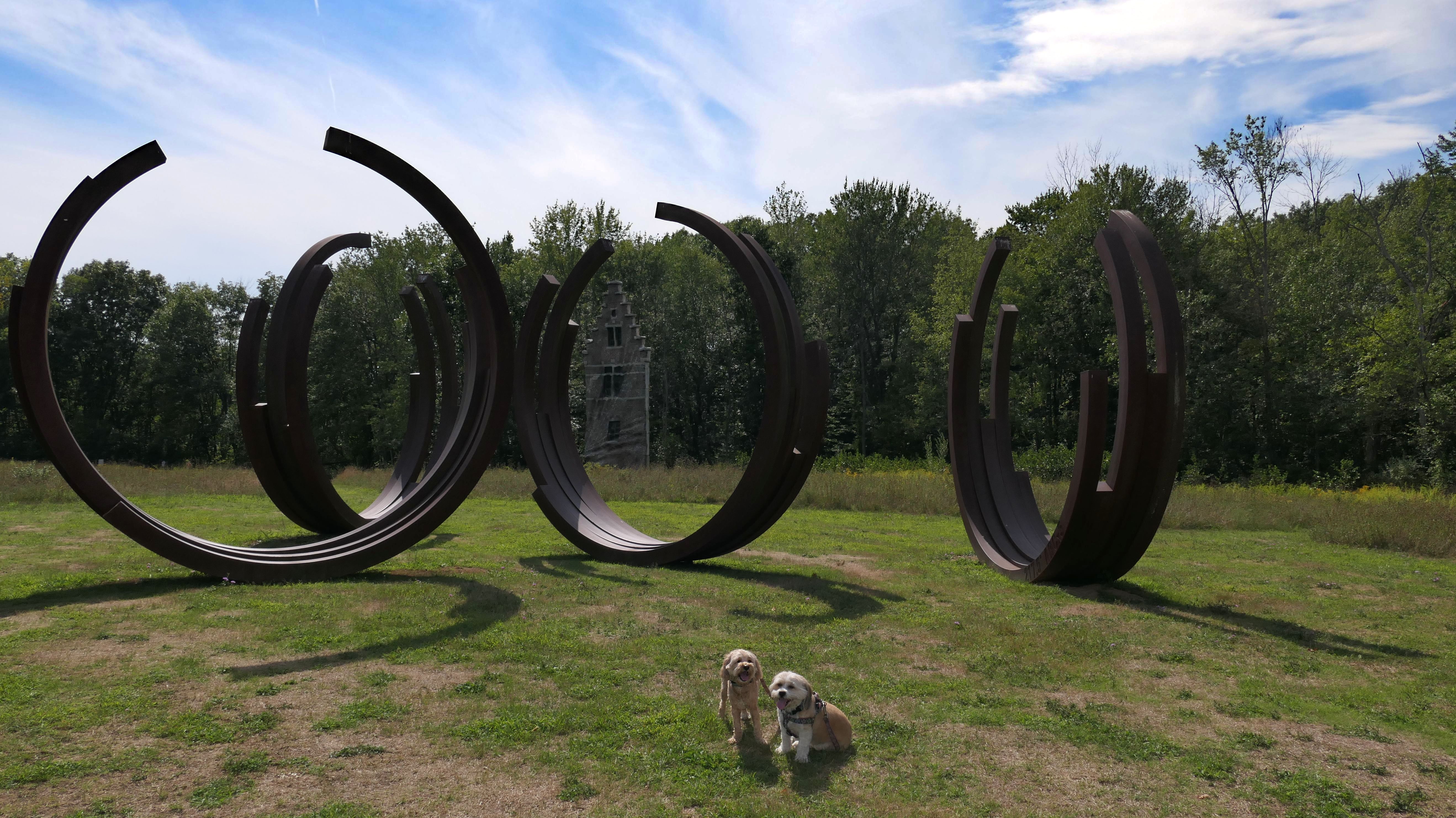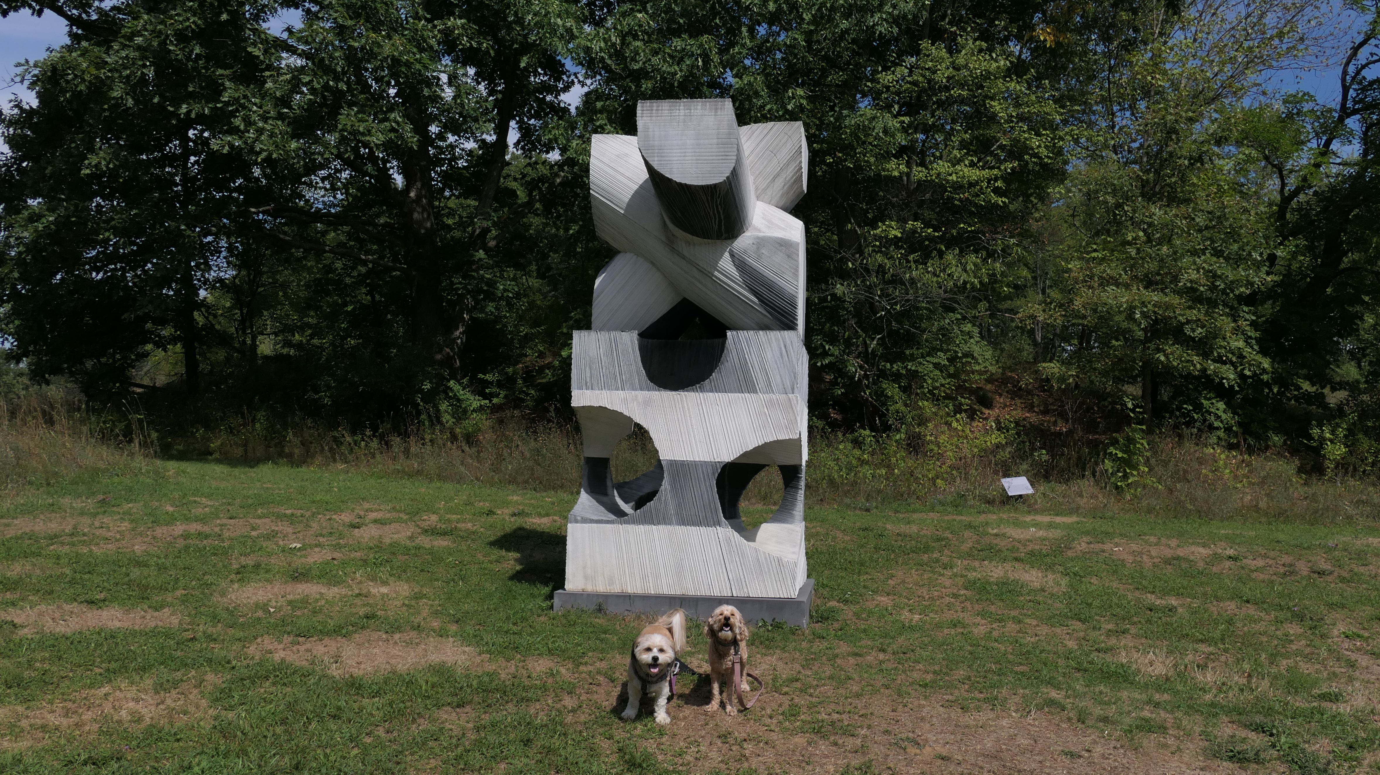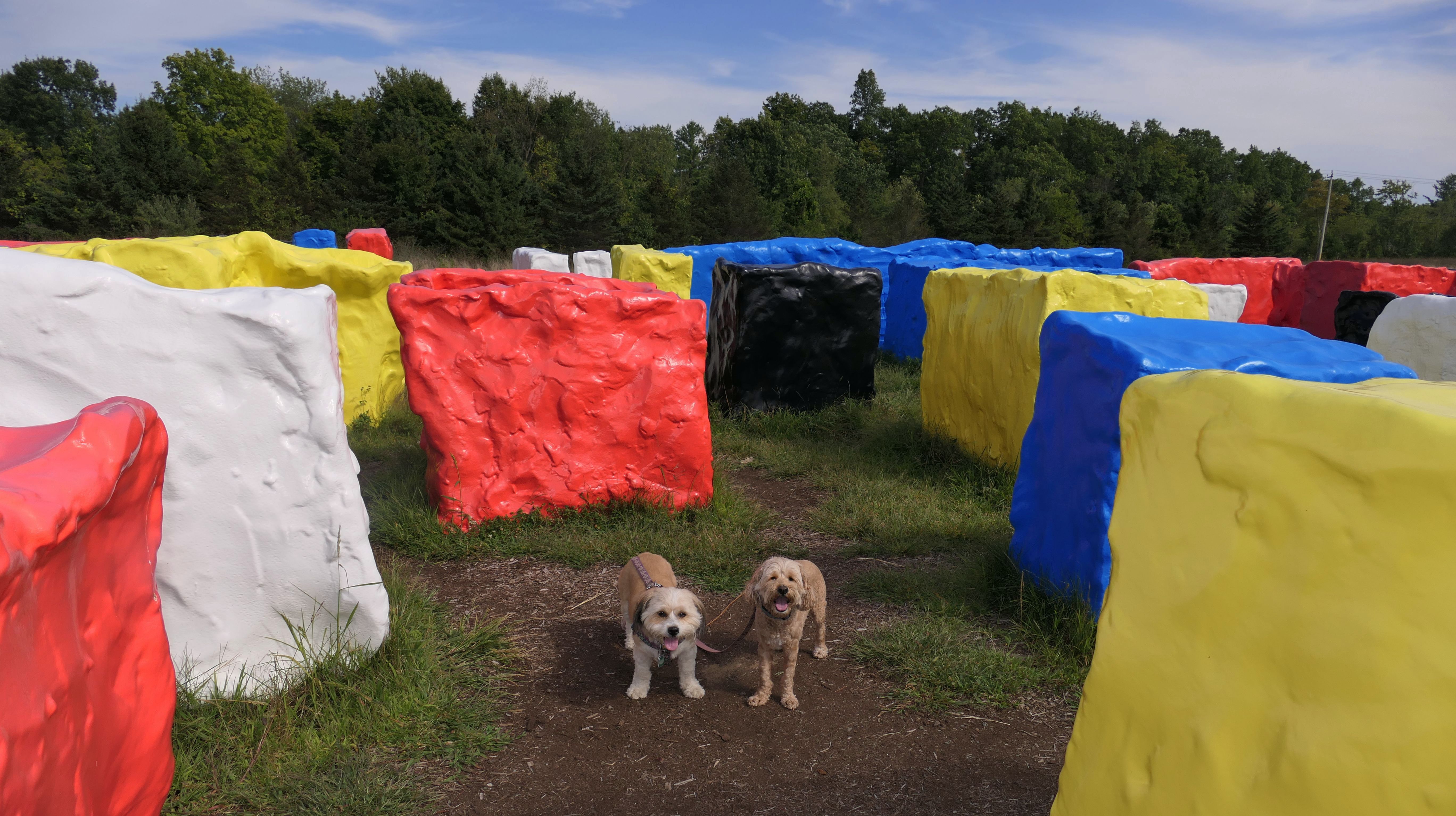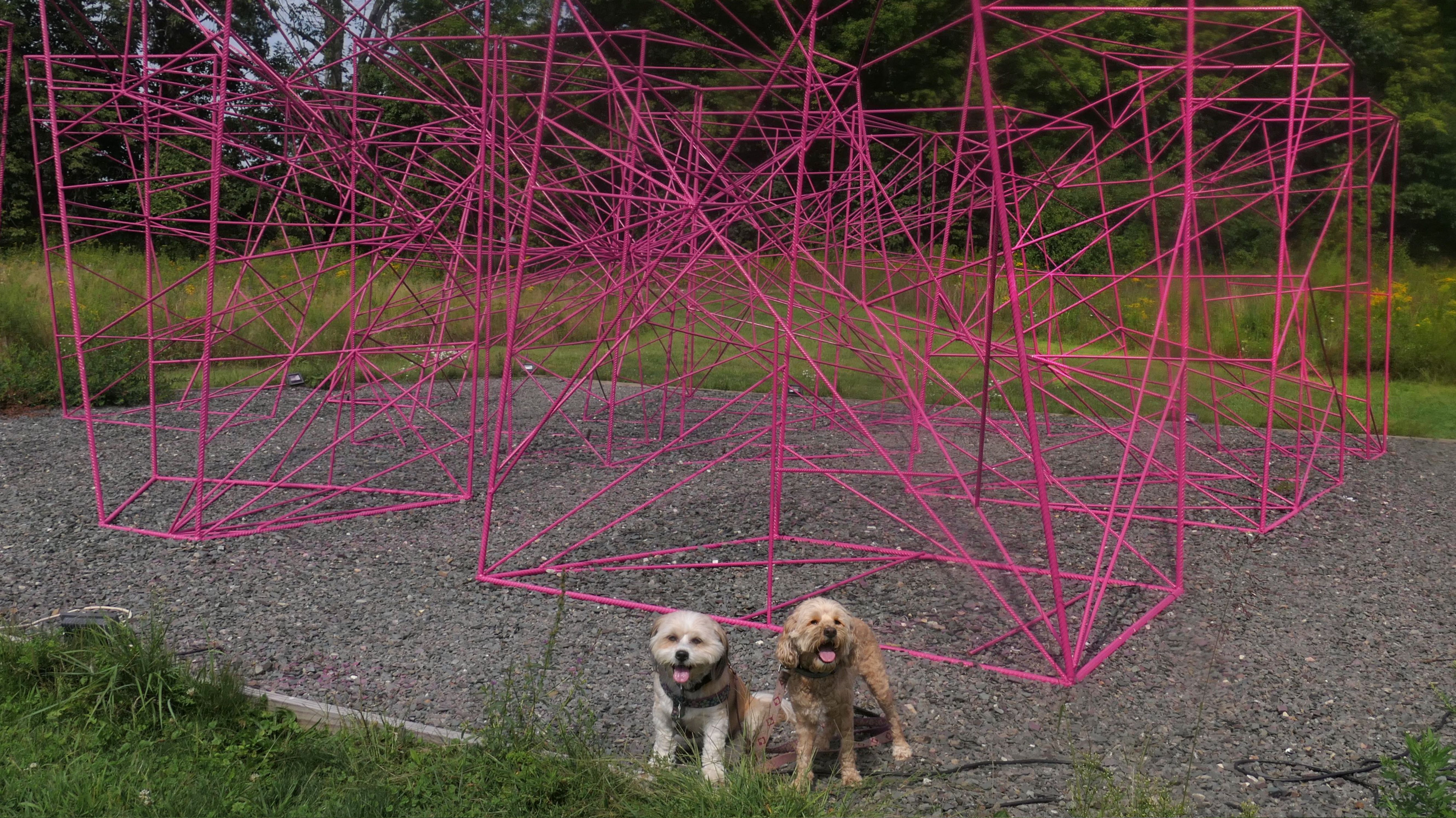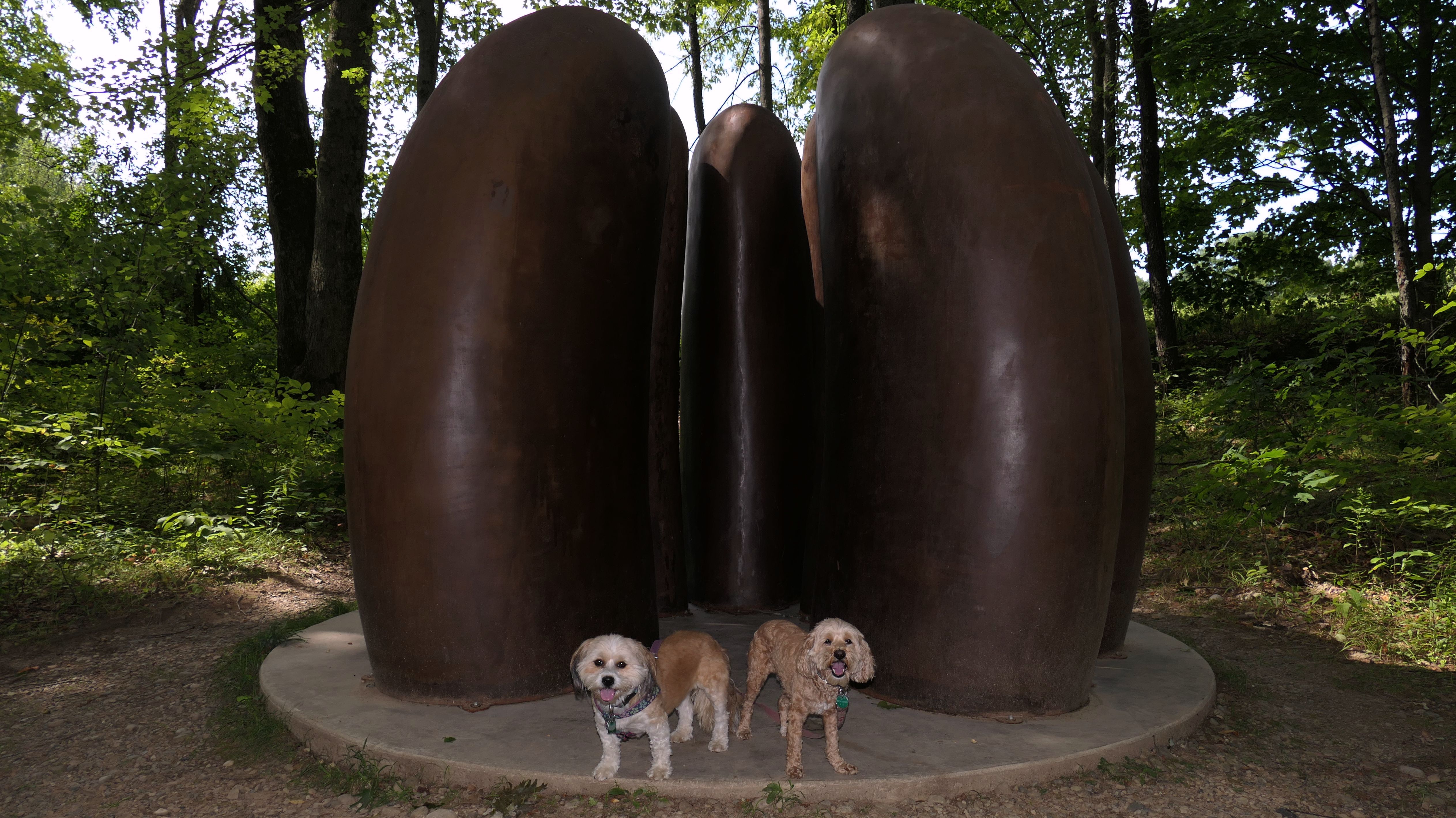 This was a completely different trip than we usually go on, and a lot of fun! This is a trail that runs through an outdoor art gallery. There are 120 acres here, filled with all sorts of "modern art". I've been to sculpture trails before in Putnam, CT and South Kingstown, RI previously, but they pale in comparison to this one! You are encouraged to pre-resgister before visiting, especially on the weekends or holidays, because the place can get busy. Admission is free, but they do suggest a $10 donation. We tried to get to most of the exhibits, but we may have missed a few because the dogs were getting tired. We wound up walking over 3 miles here, with a lot of posing for pictures! My favorite exhibit was the big concrete and marble structure with the pipes that you can look through. I can't believe I got Mandy and Lexi to cooperate and stay while I took pictures of them through the shiny reflective pipe on the other side. There's also a small indoor art gallery here as well with a few exhibits. The best part of the place is that is dog friendly (they must remain leashed of course!) This place is worth checking out if you are looking for something different. You can book your reservation on the Art Omi website, and read more about the originization.