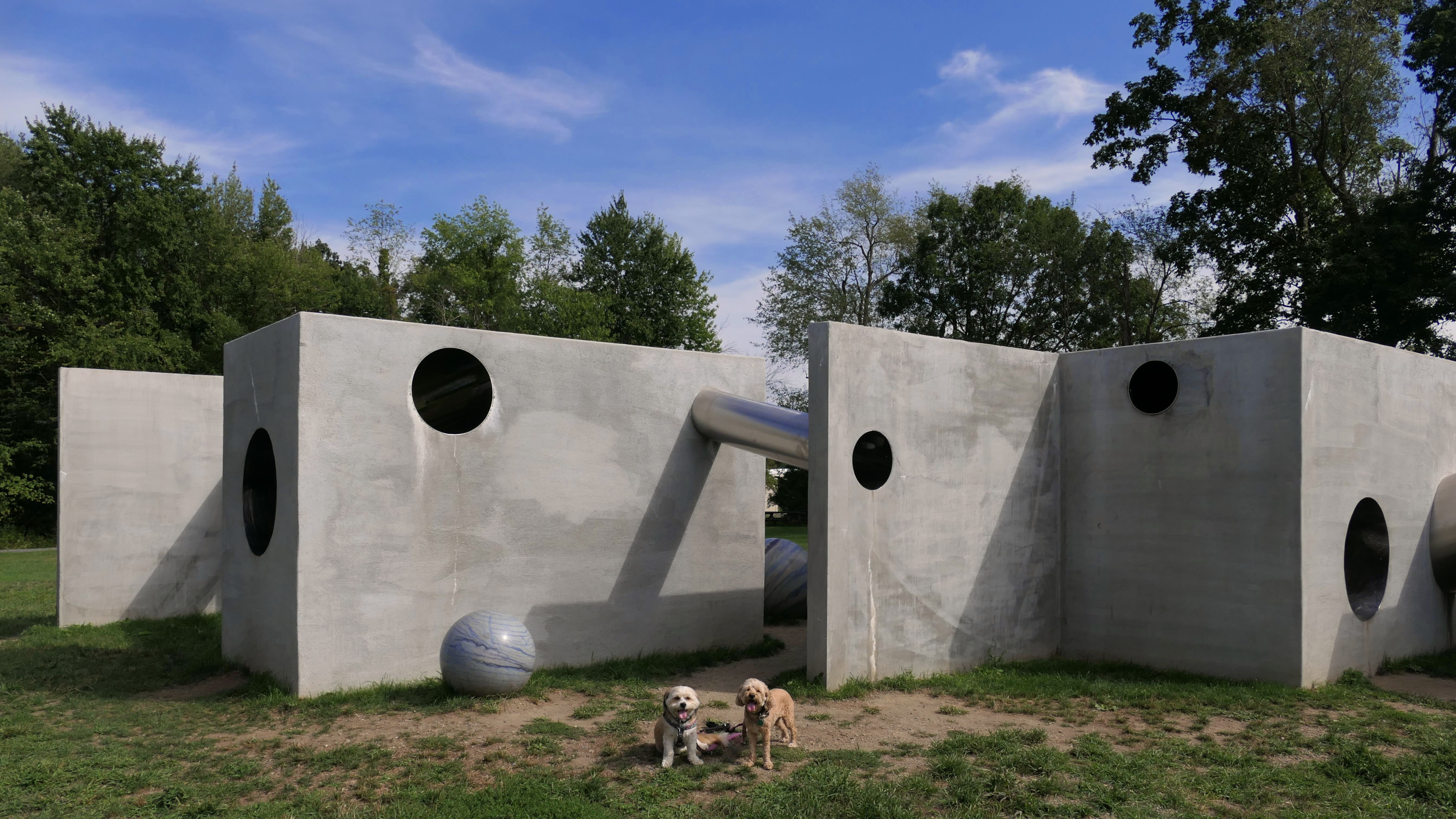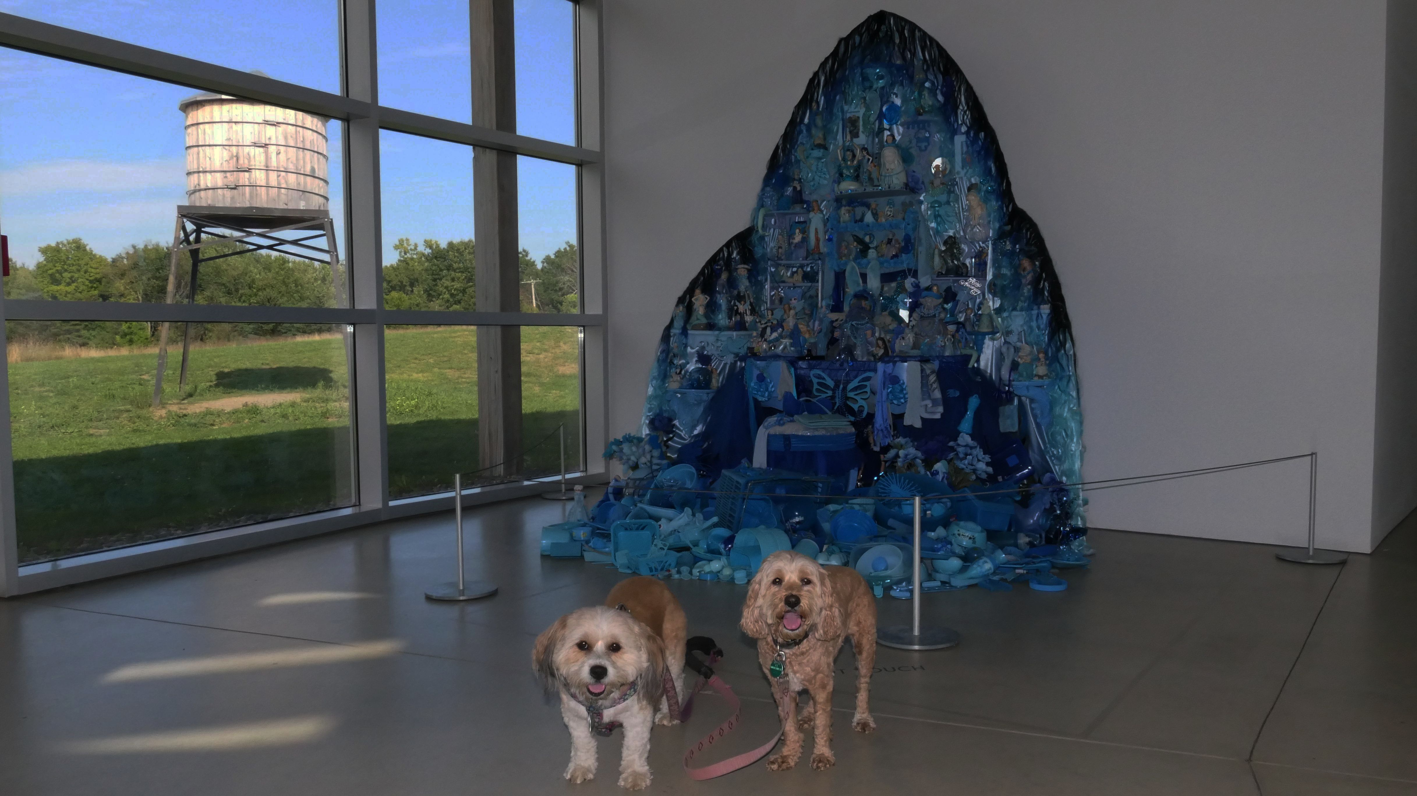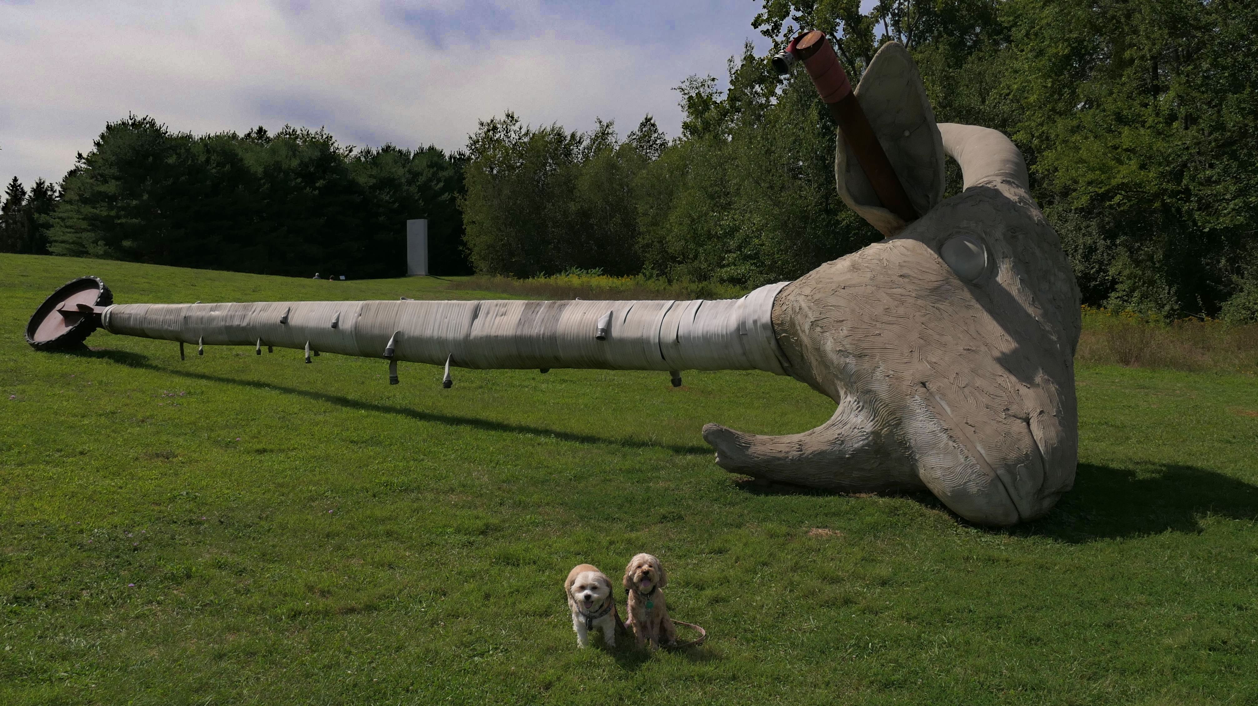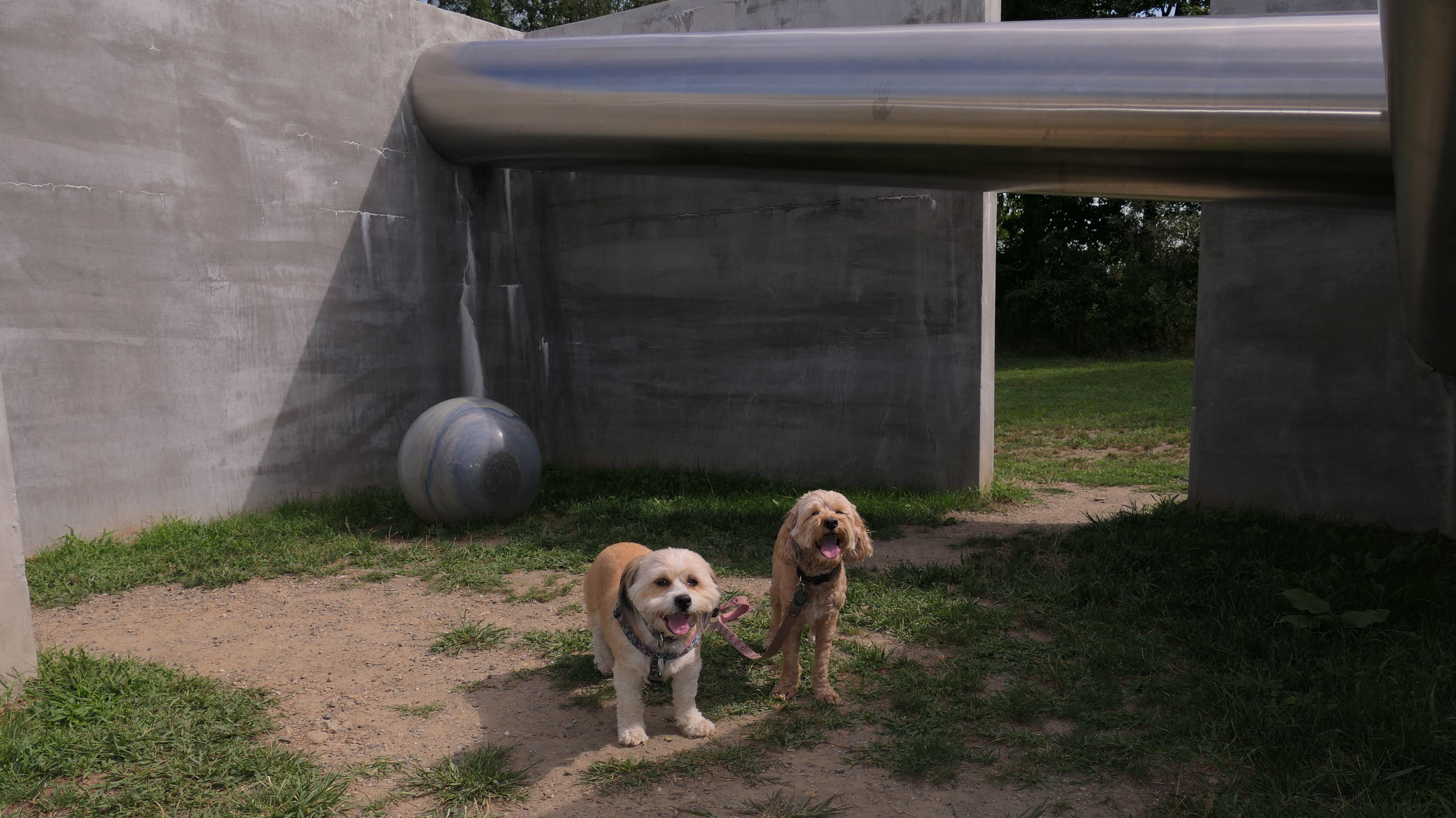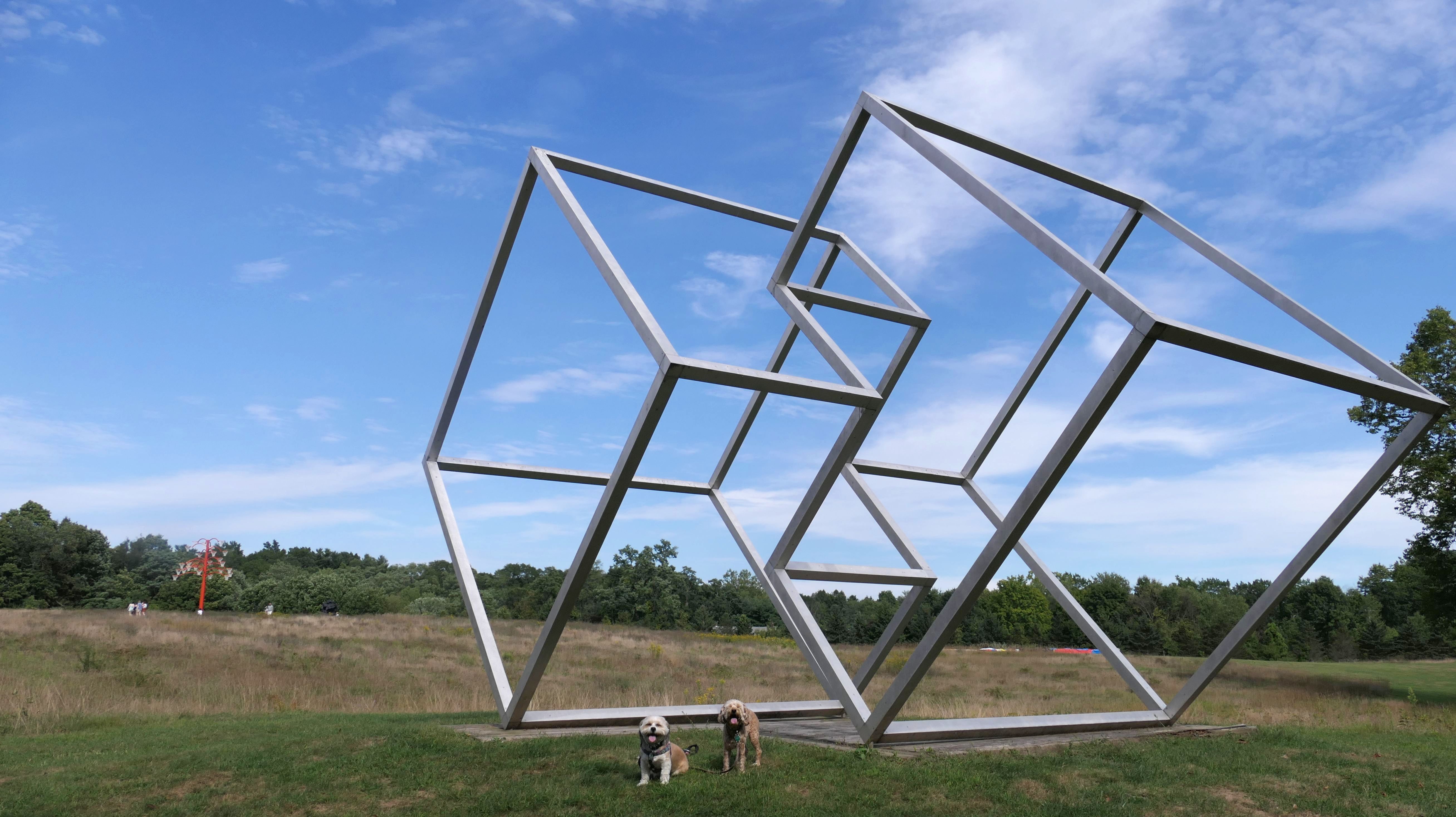 This was a completely different trip than we usually go on, and a lot of fun! This is a trail that runs through an outdoor art gallery. There are 120 acres here, filled with all sorts of "modern art". I've been to sculpture trails before in Putnam, CT and South Kingstown, RI previously, but they pale in comparison to this one! You are encouraged to pre-resgister before visiting, especially on the weekends or holidays, because the place can get busy. Admission is free, but they do suggest a $10 donation. We tried to get to most of the exhibits, but we may have missed a few because the dogs were getting tired. We wound up walking over 3 miles here, with a lot of posing for pictures! My favorite exhibit was the big concrete and marble structure with the pipes that you can look through. I can't believe I got Mandy and Lexi to cooperate and stay while I took pictures of them through the shiny reflective pipe on the other side. There's also a small indoor art gallery here as well with a few exhibits. The best part of the place is that is dog friendly (they must remain leashed of course!) This place is worth checking out if you are looking for something different. You can book your reservation on the Art Omi website, and read more about the originization.