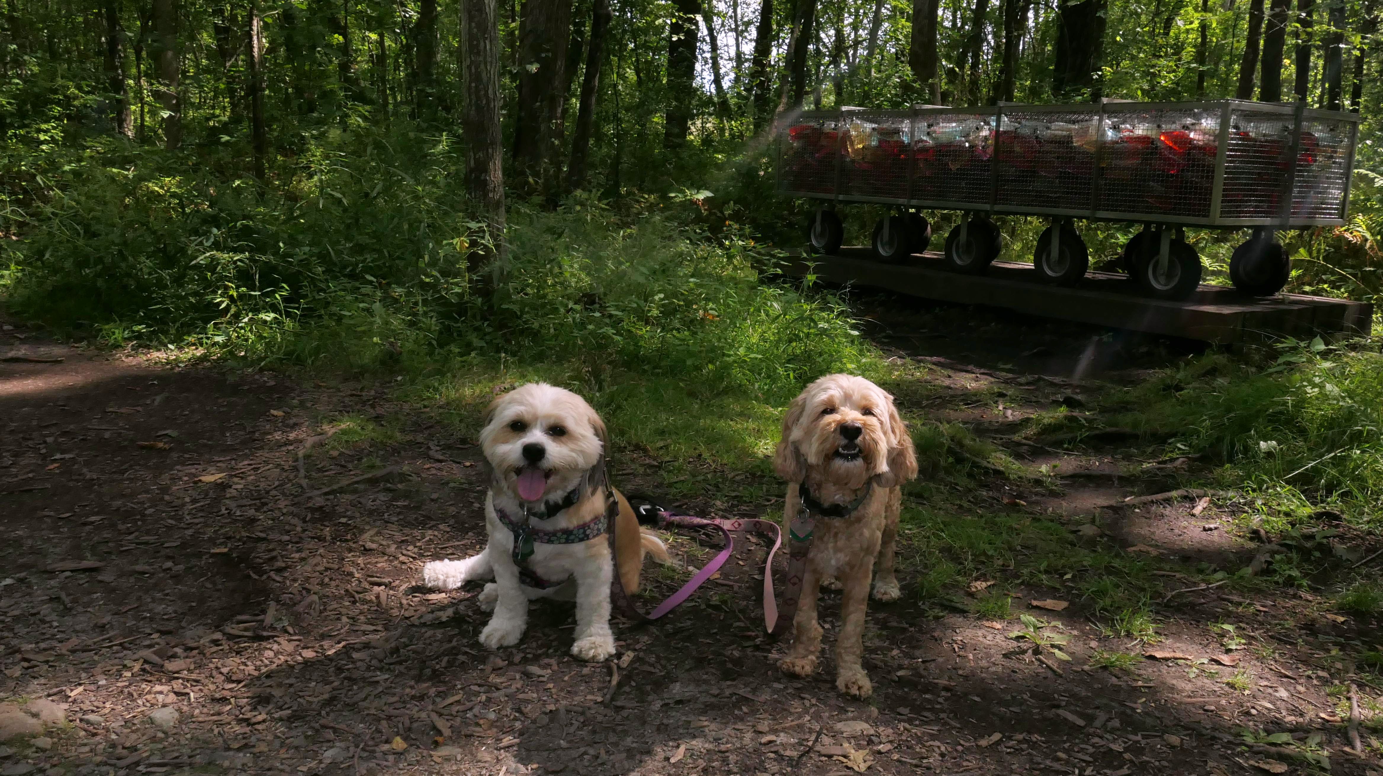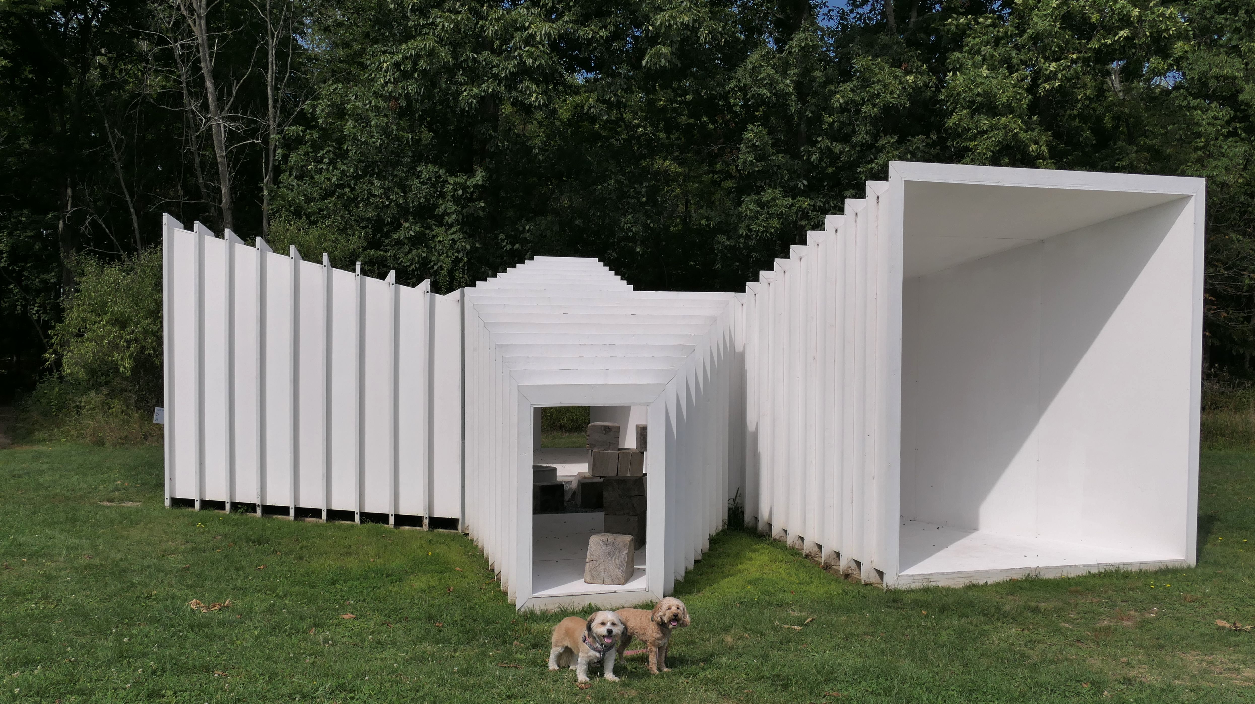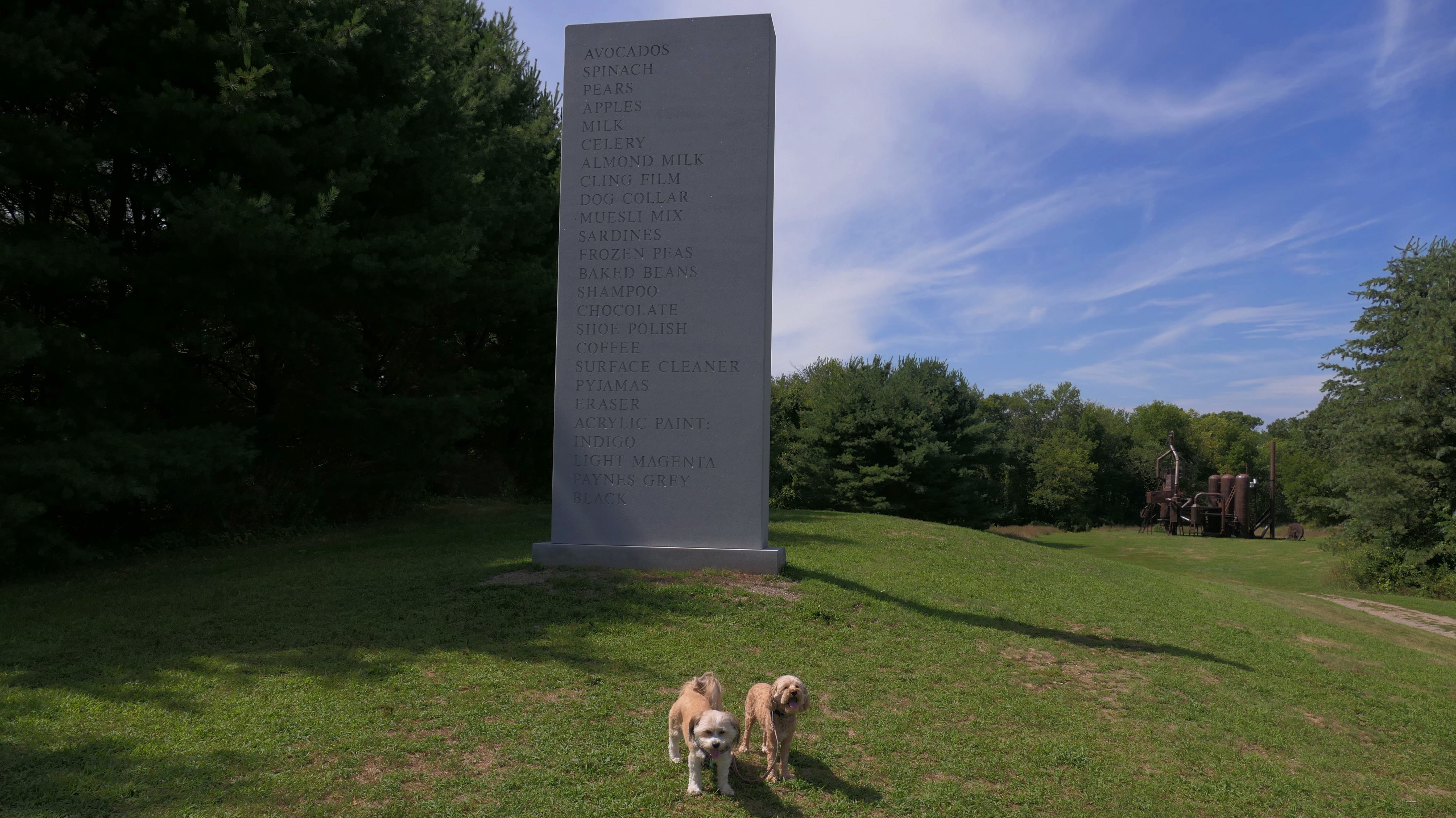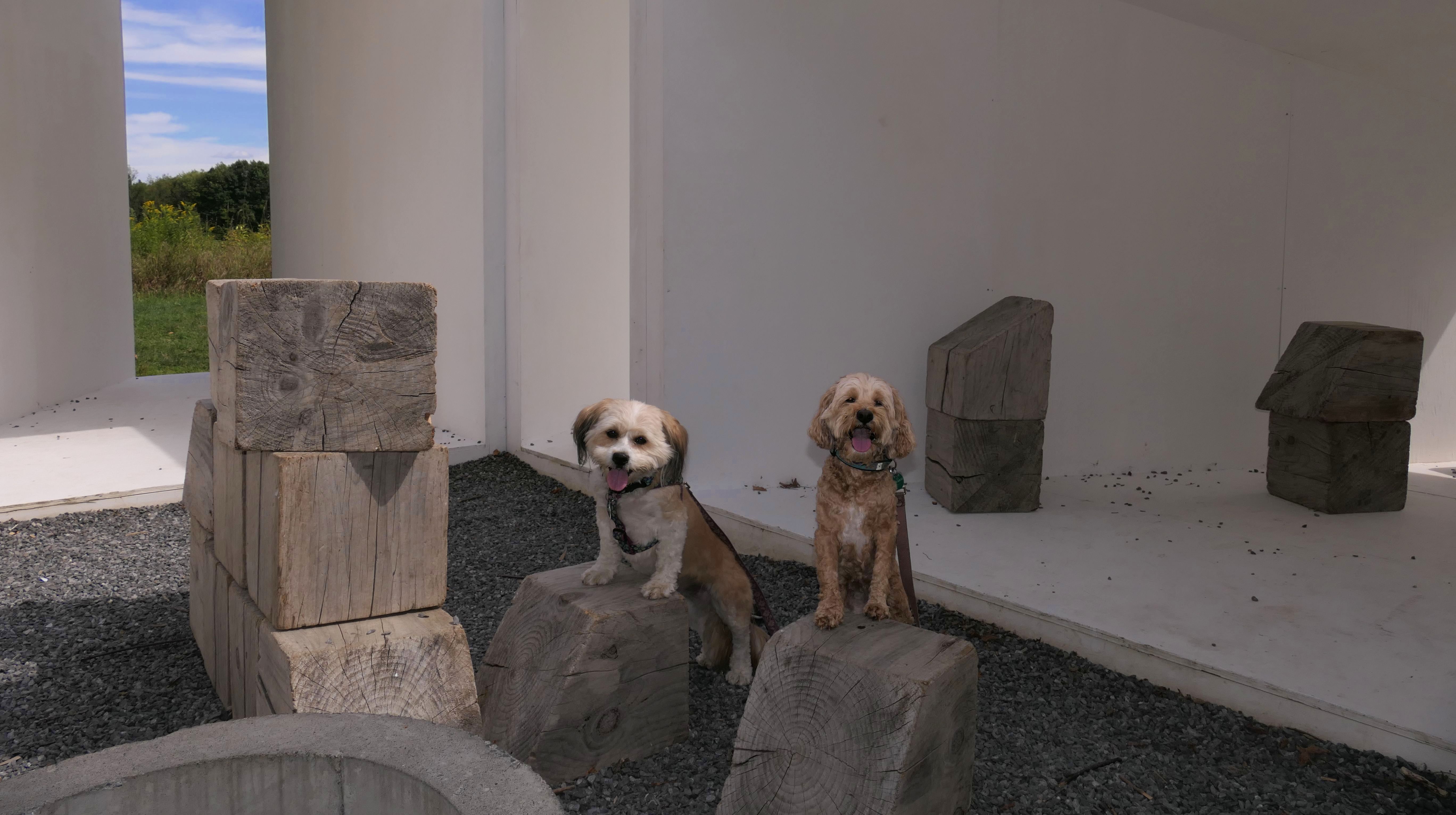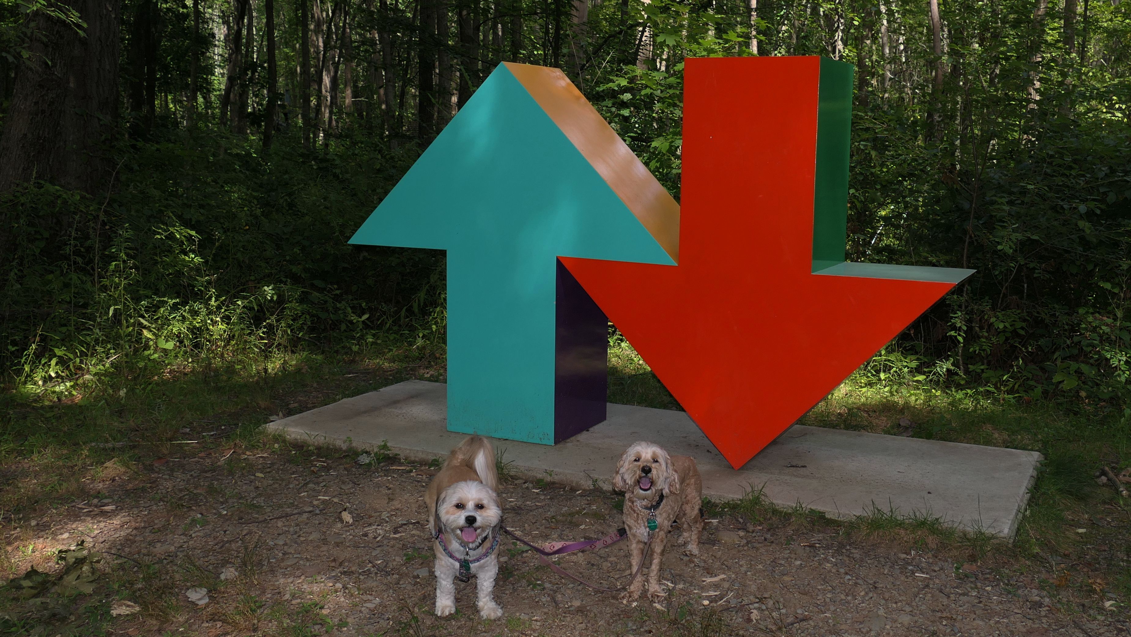 This was a completely different trip than we usually go on, and a lot of fun! This is a trail that runs through an outdoor art gallery. There are 120 acres here, filled with all sorts of "modern art". I've been to sculpture trails before in Putnam, CT and South Kingstown, RI previously, but they pale in comparison to this one! You are encouraged to pre-resgister before visiting, especially on the weekends or holidays, because the place can get busy. Admission is free, but they do suggest a $10 donation. We tried to get to most of the exhibits, but we may have missed a few because the dogs were getting tired. We wound up walking over 3 miles here, with a lot of posing for pictures! My favorite exhibit was the big concrete and marble structure with the pipes that you can look through. I can't believe I got Mandy and Lexi to cooperate and stay while I took pictures of them through the shiny reflective pipe on the other side. There's also a small indoor art gallery here as well with a few exhibits. The best part of the place is that is dog friendly (they must remain leashed of course!) This place is worth checking out if you are looking for something different. You can book your reservation on the Art Omi website, and read more about the originization.
